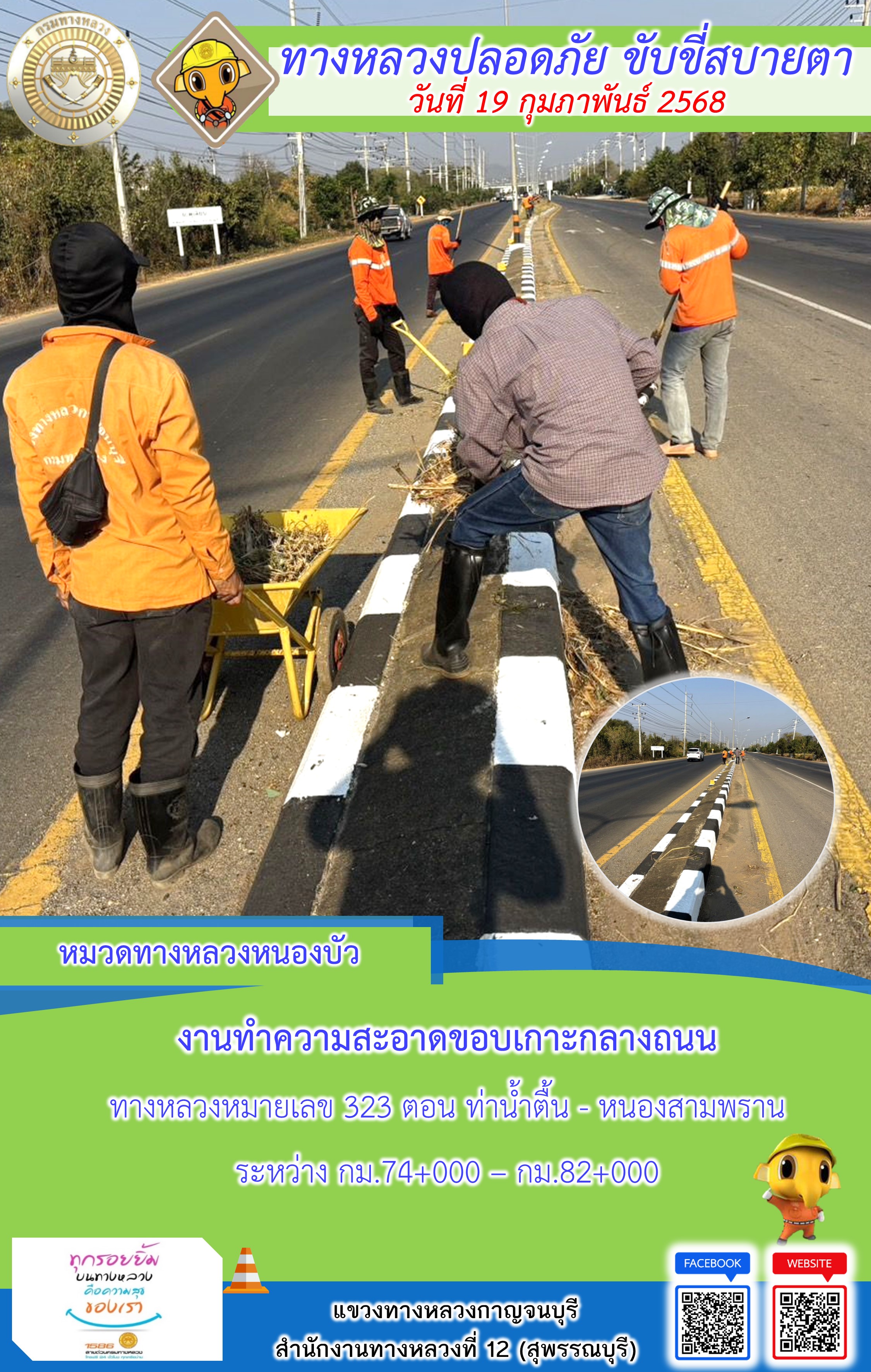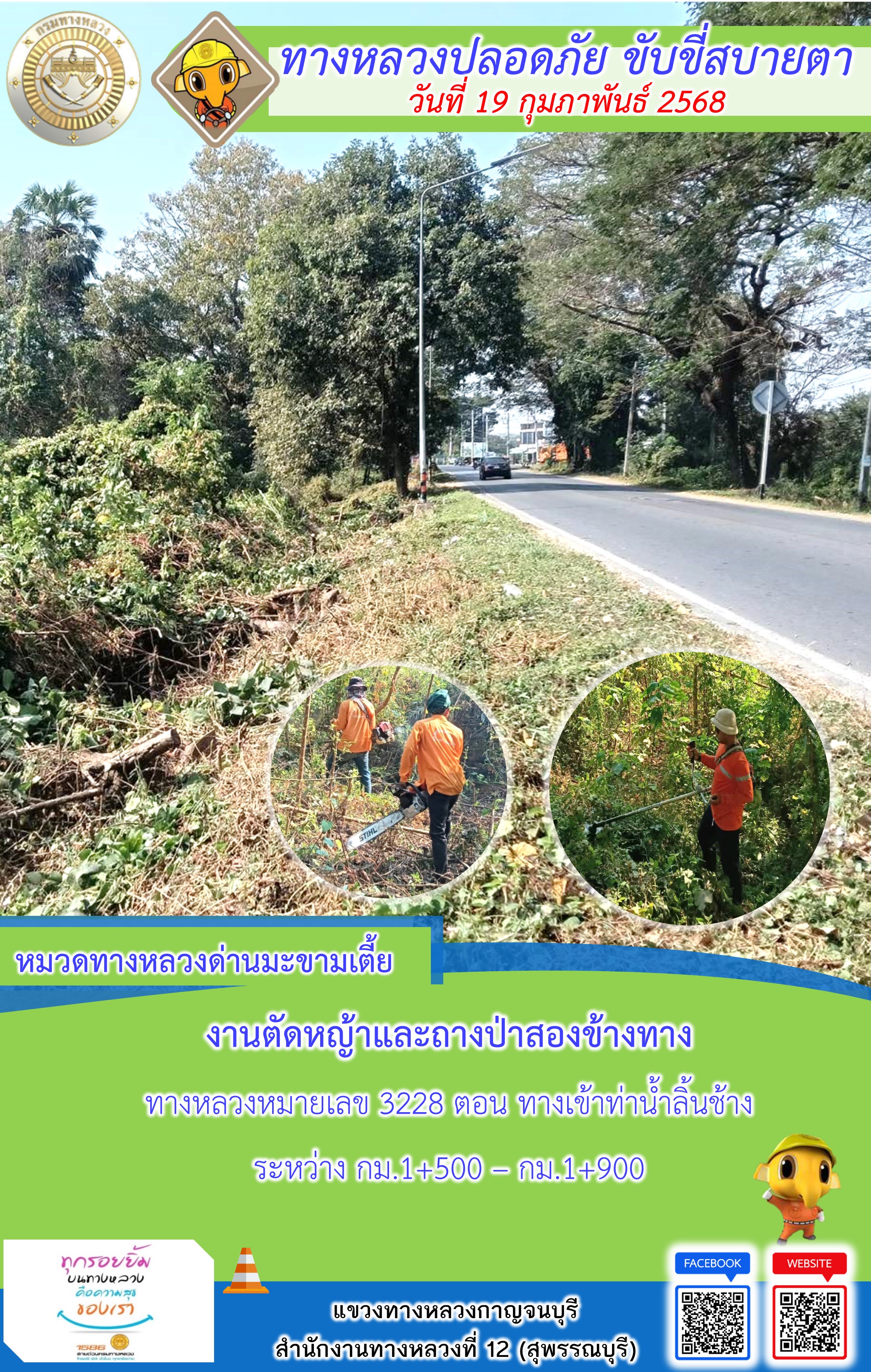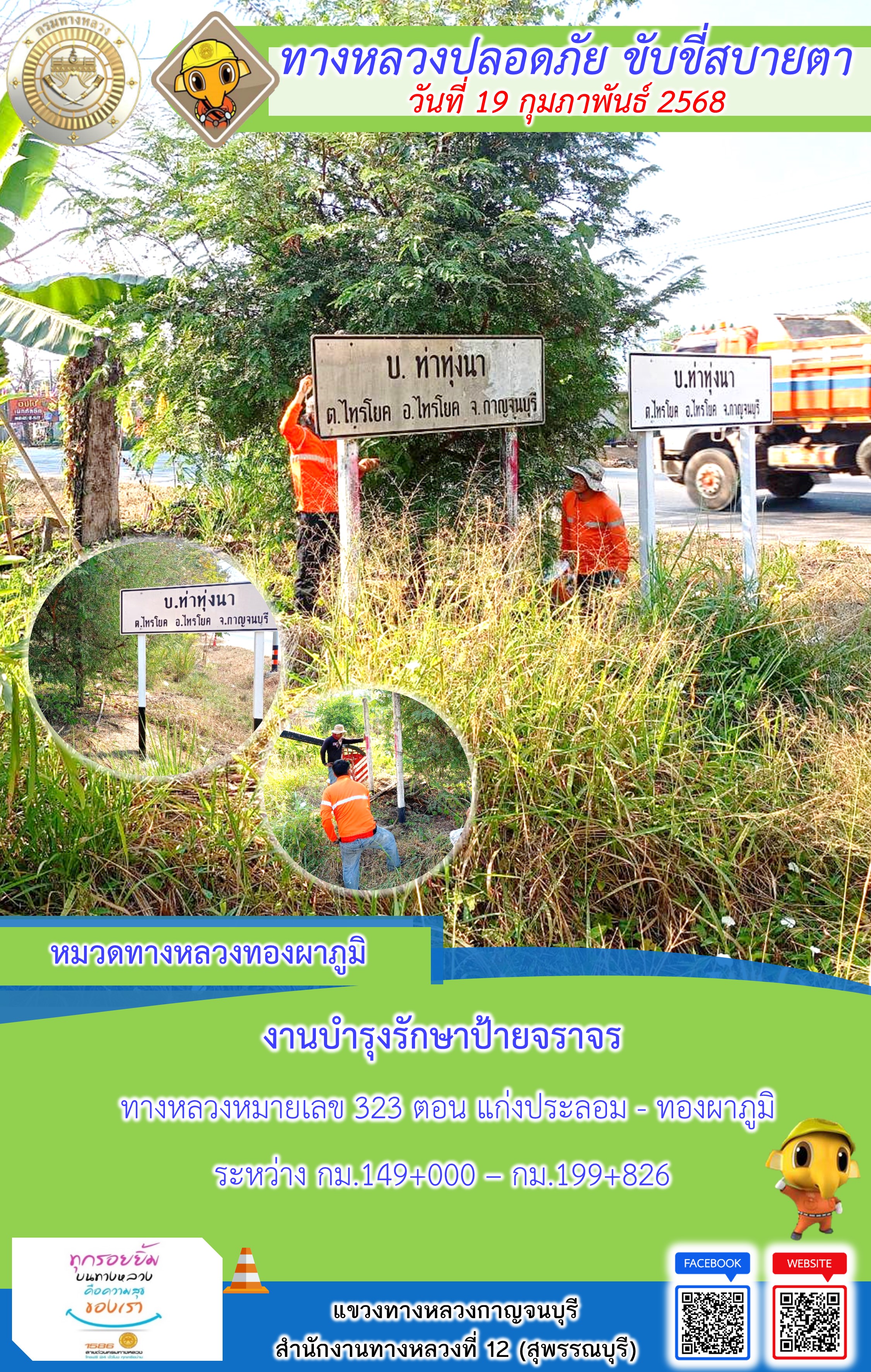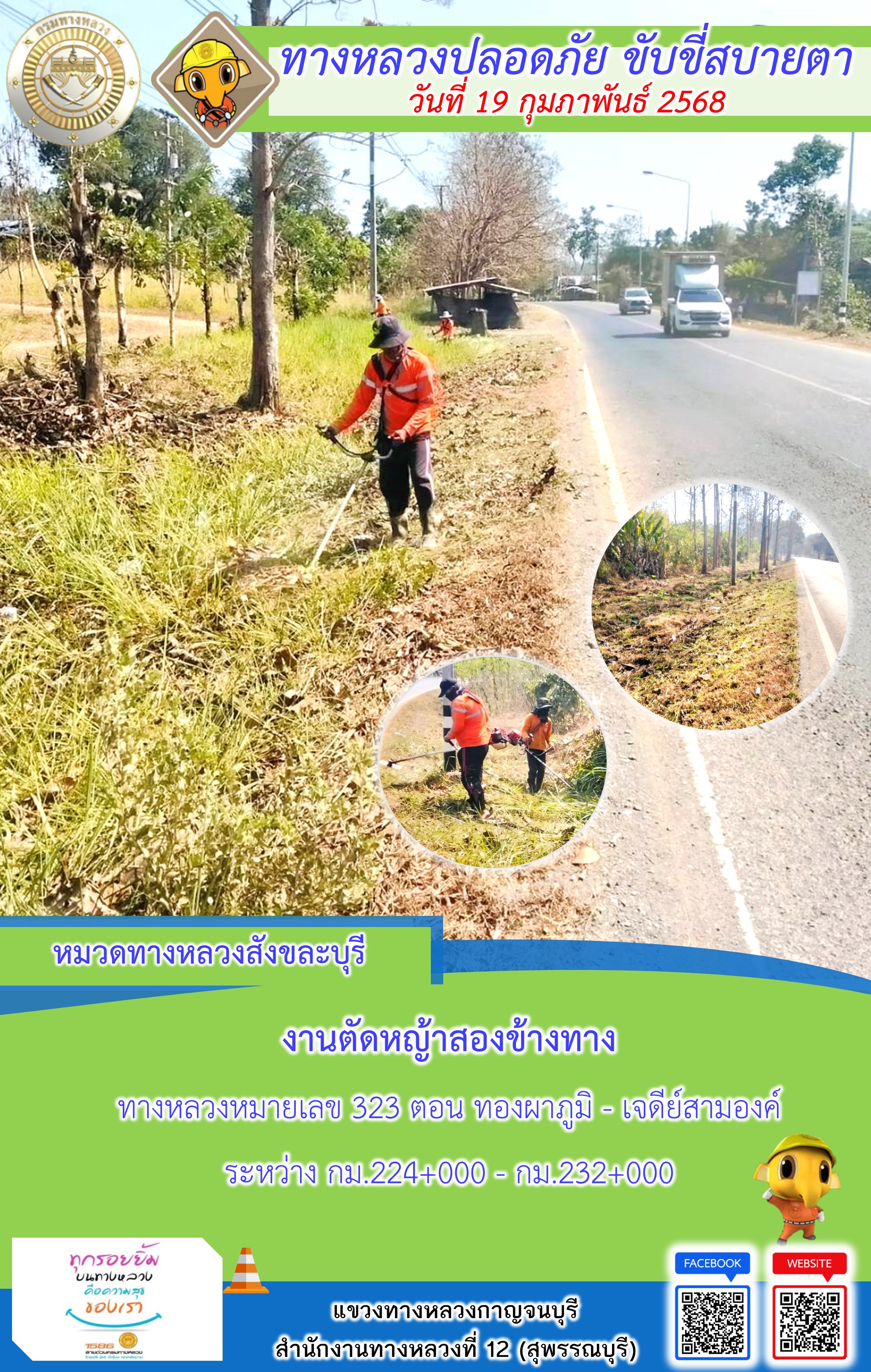 ข้อมูลภาพกิจกรรม : แขวงทางหลวงกาญจนบุรี โดยหมวดทางหลวงในสังกัด และงานอำนวยความปลอดภัยปฏิบัติงาน ประจำวันที่ 19 ก.พ. 68