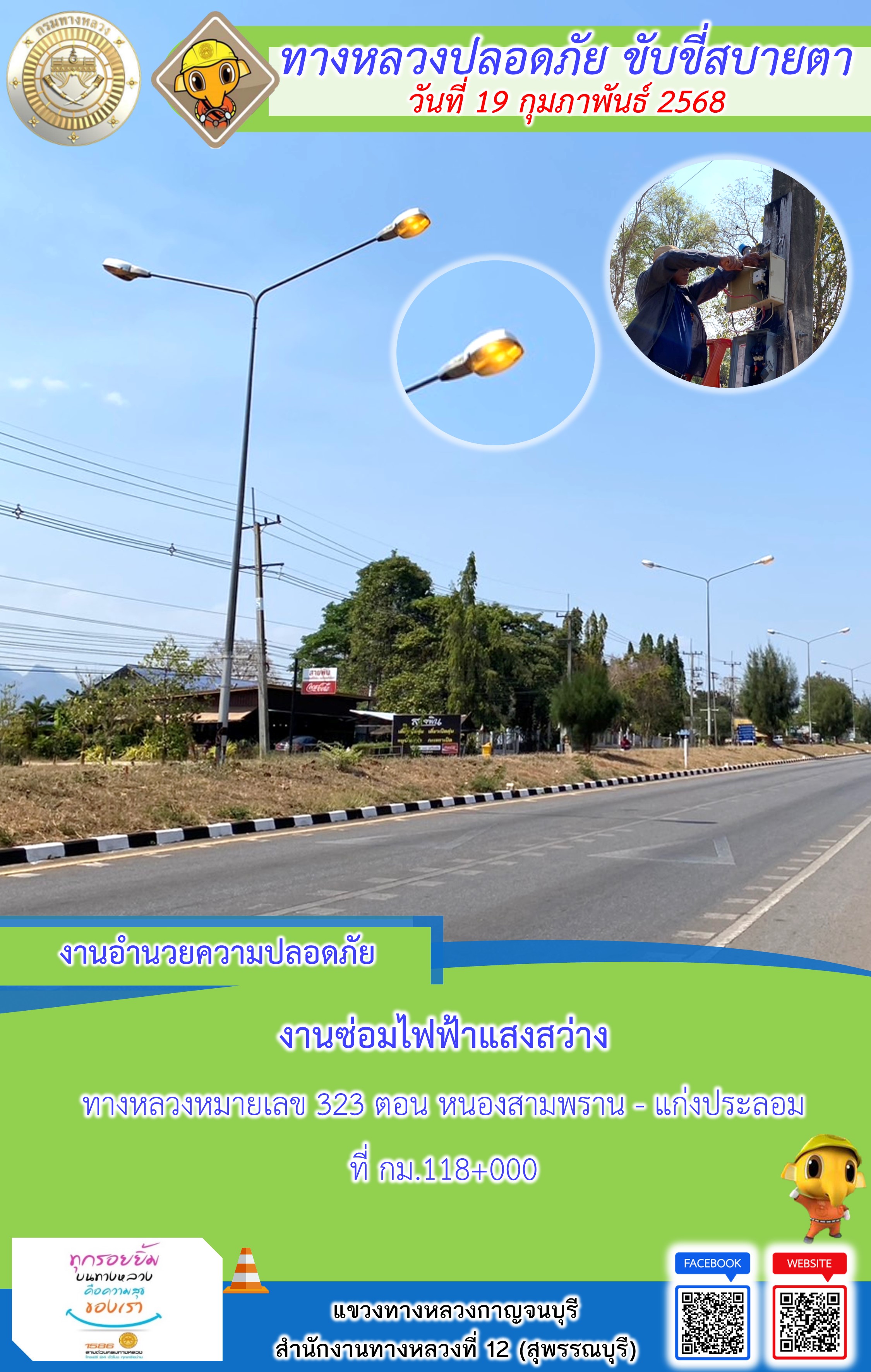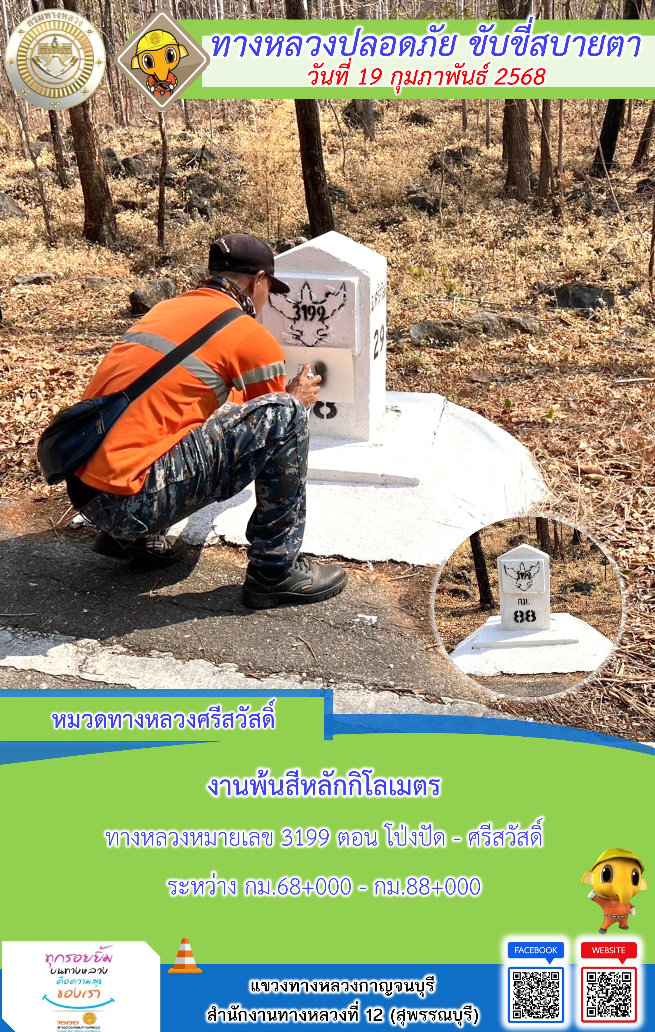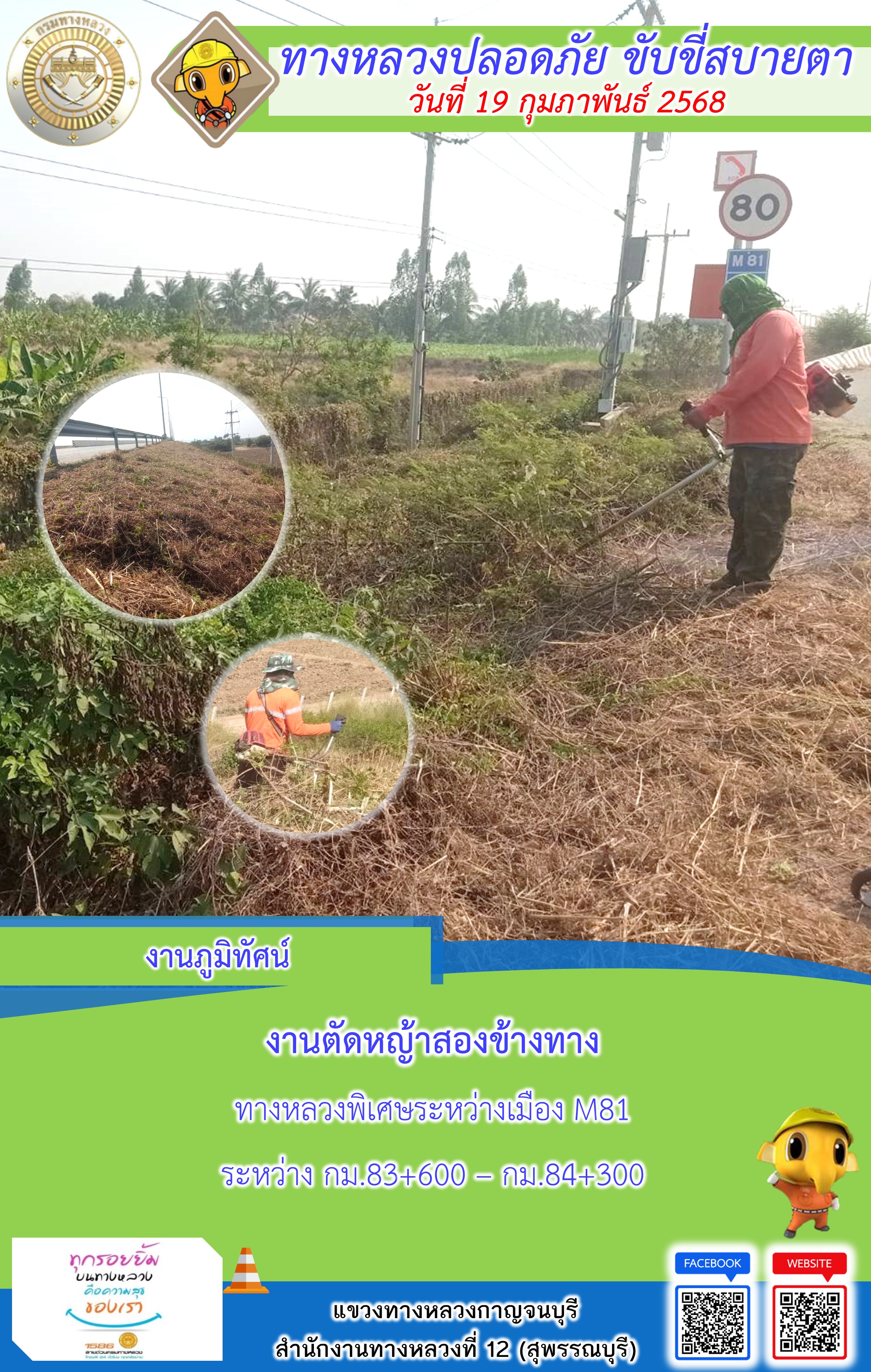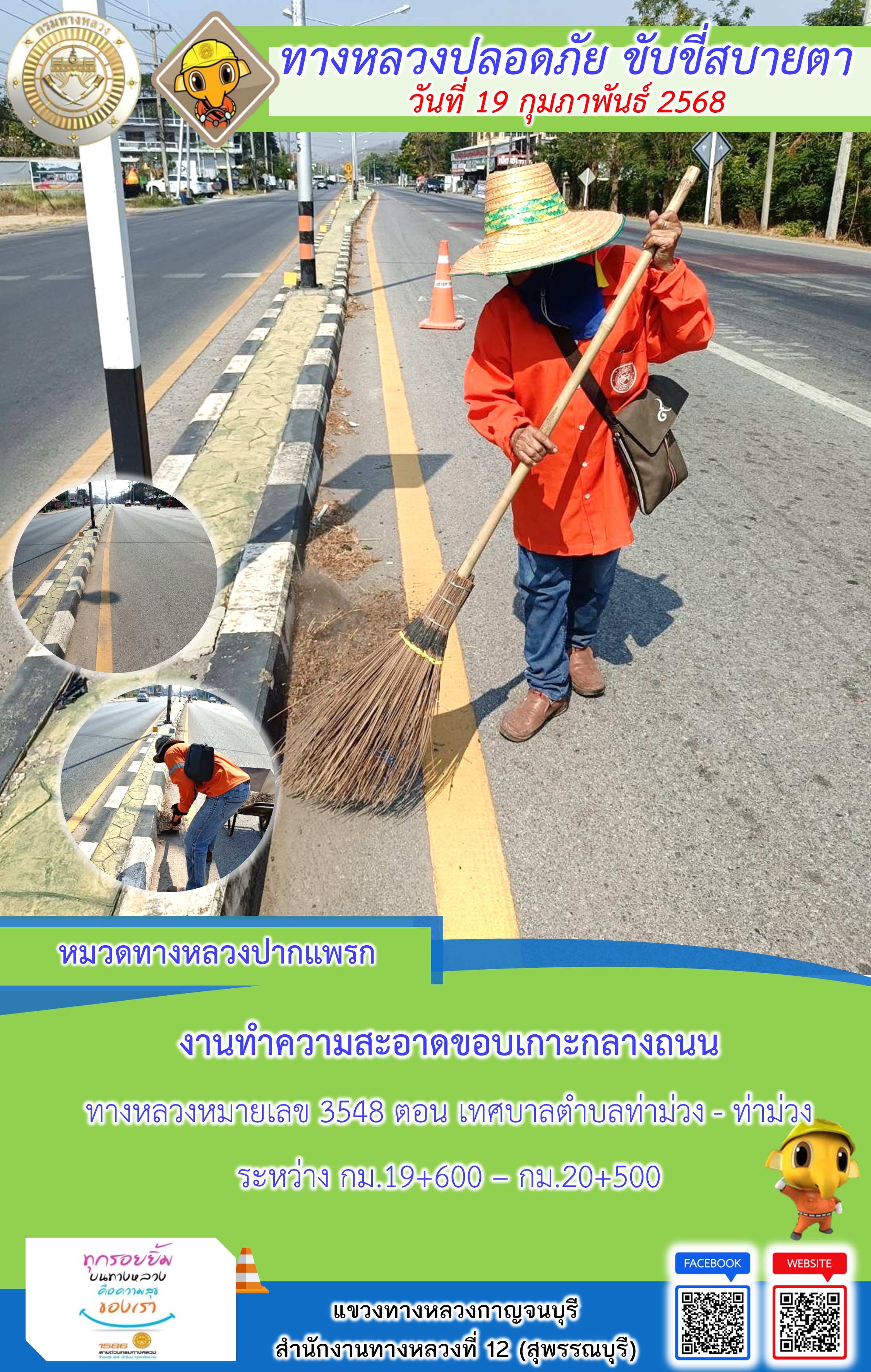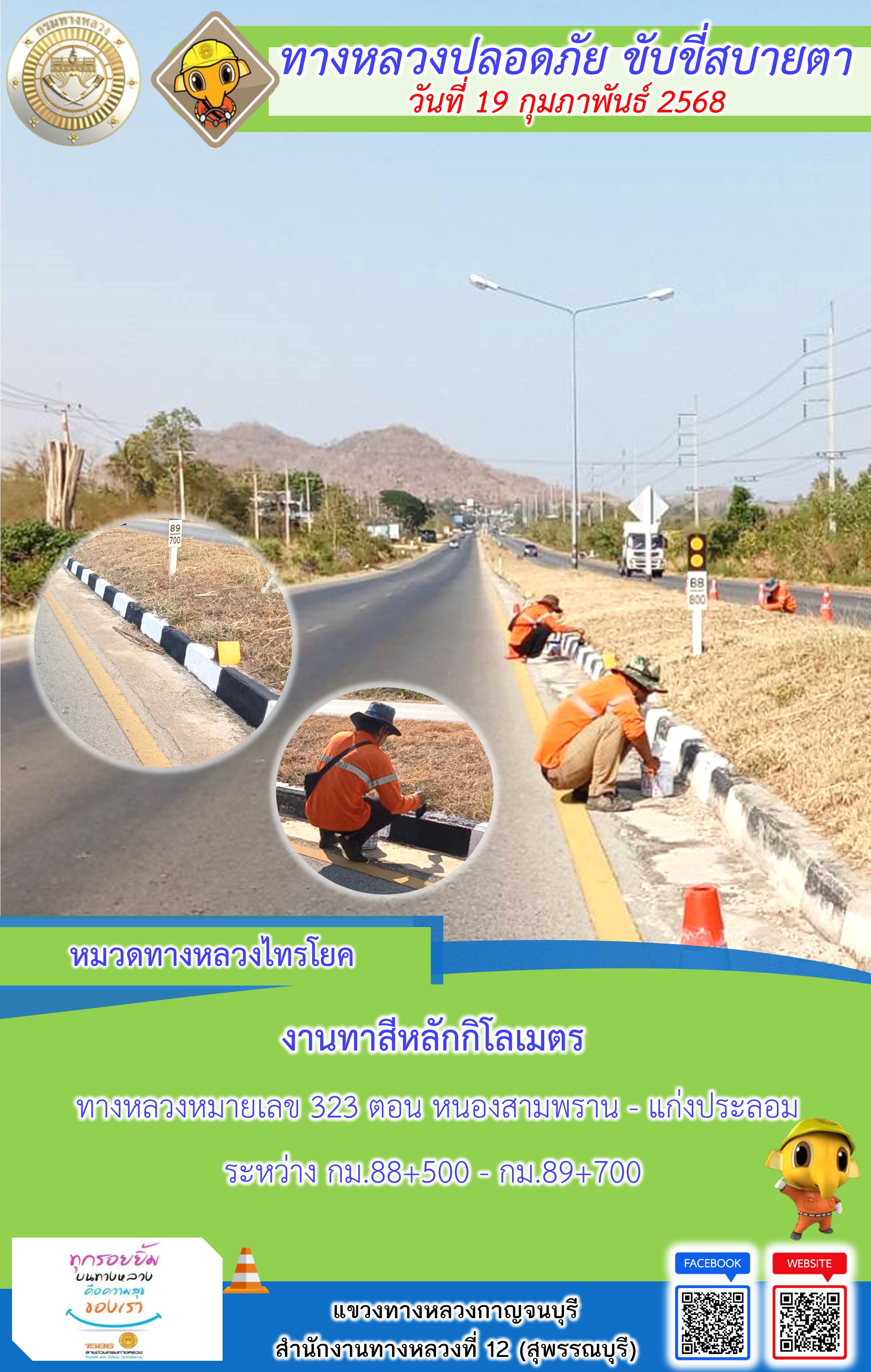 ข้อมูลภาพกิจกรรม : แขวงทางหลวงกาญจนบุรี โดยหมวดทางหลวงในสังกัด และงานอำนวยความปลอดภัยปฏิบัติงาน ประจำวันที่ 19 ก.พ. 68