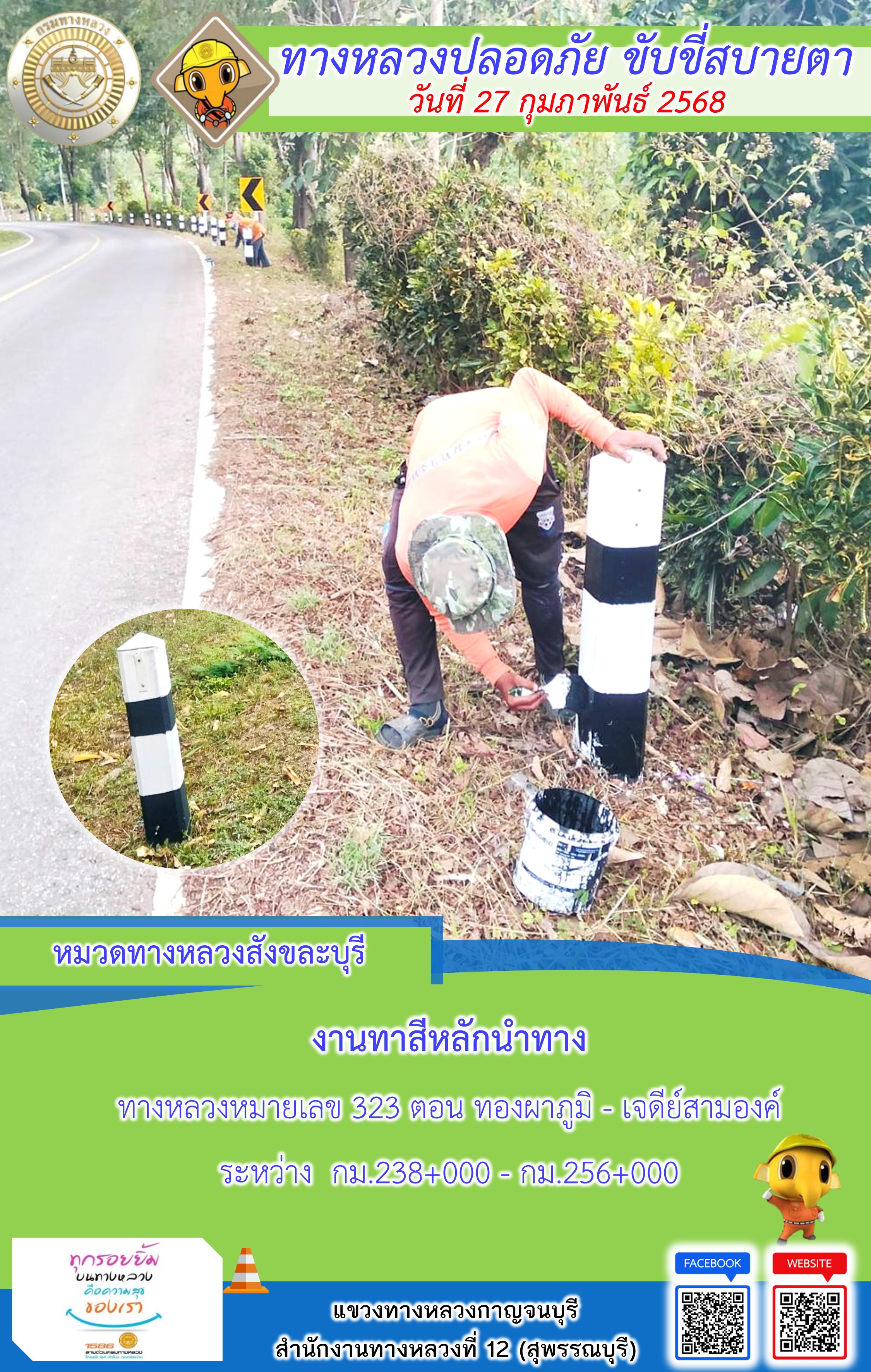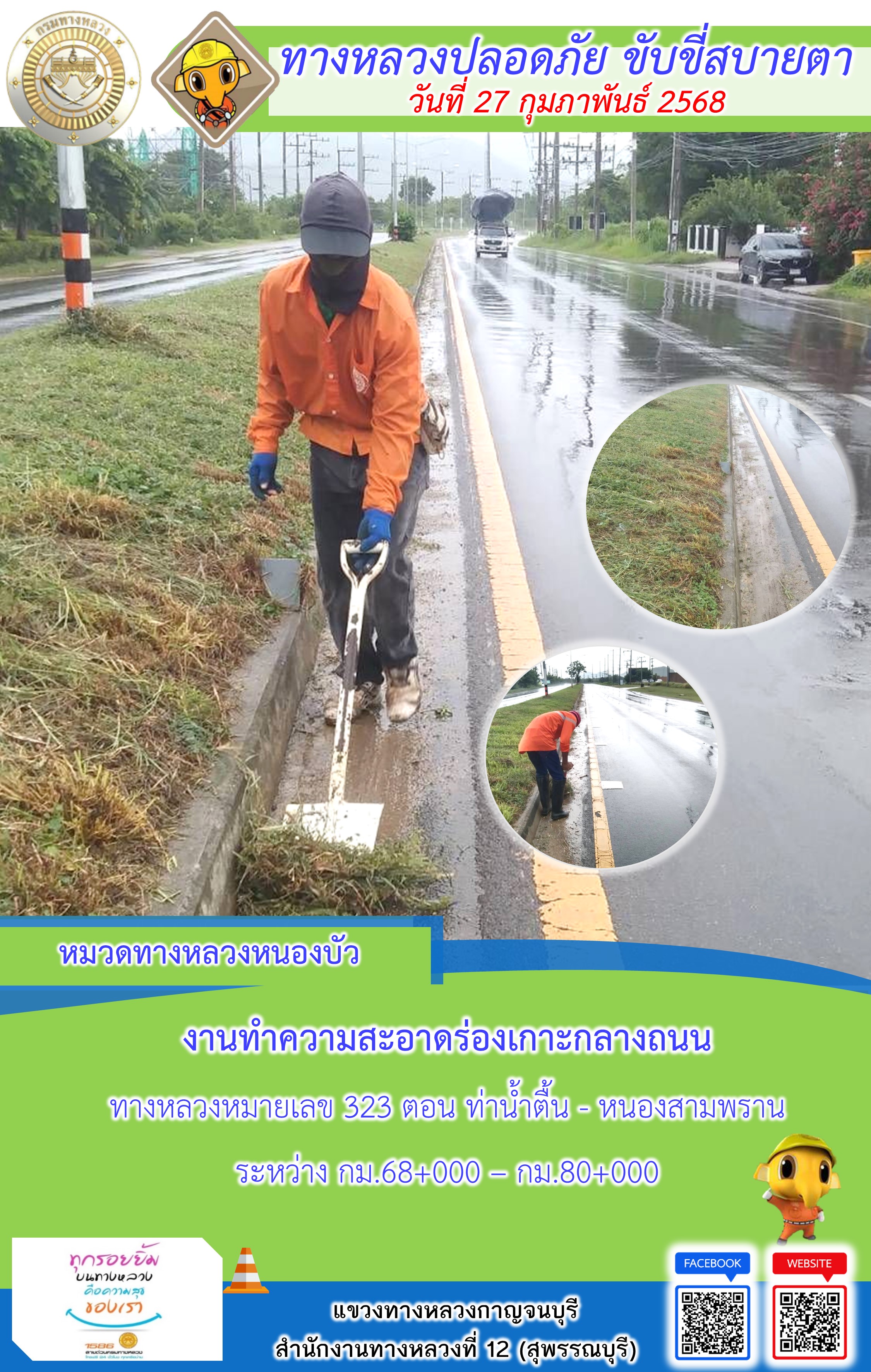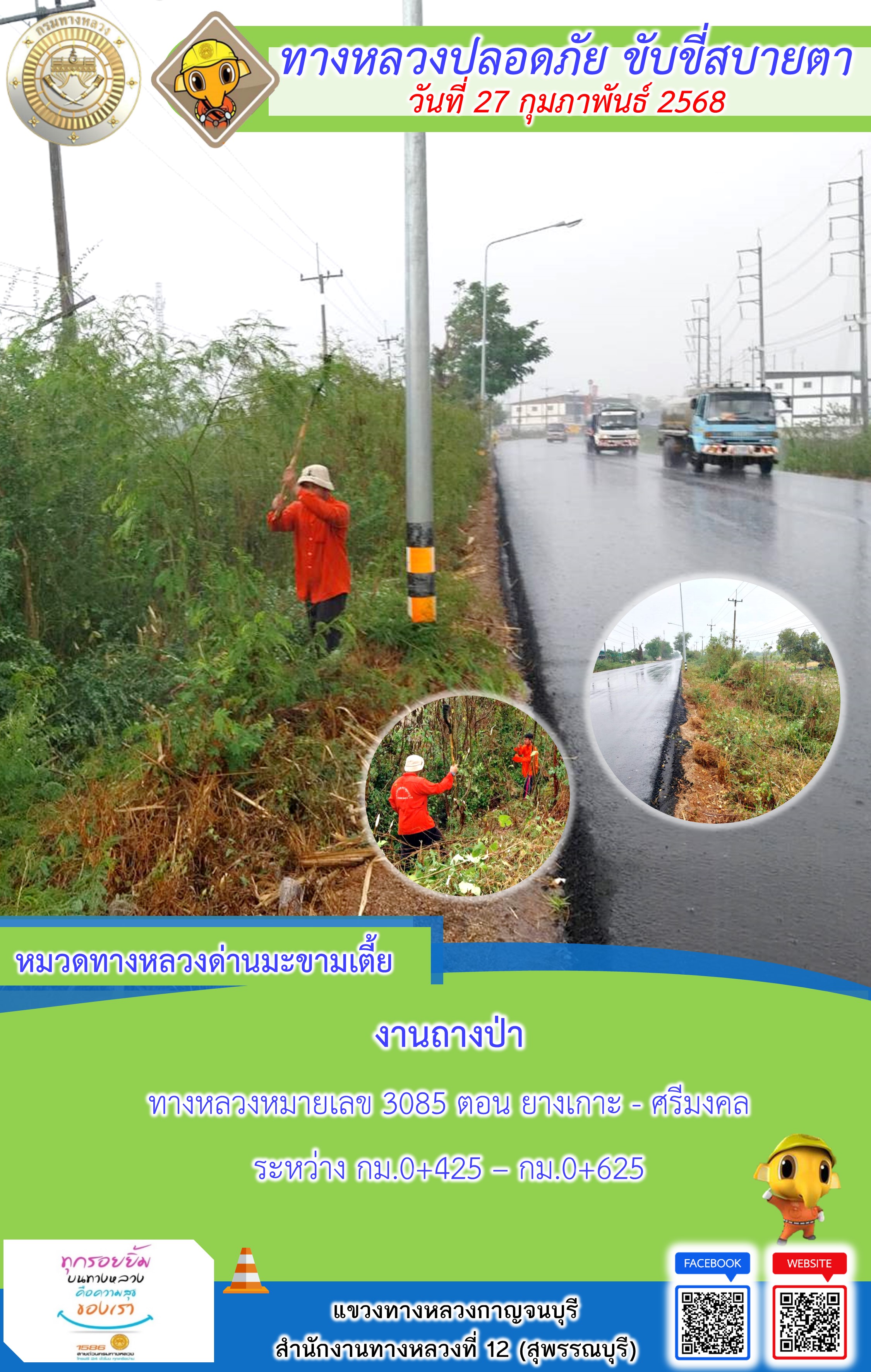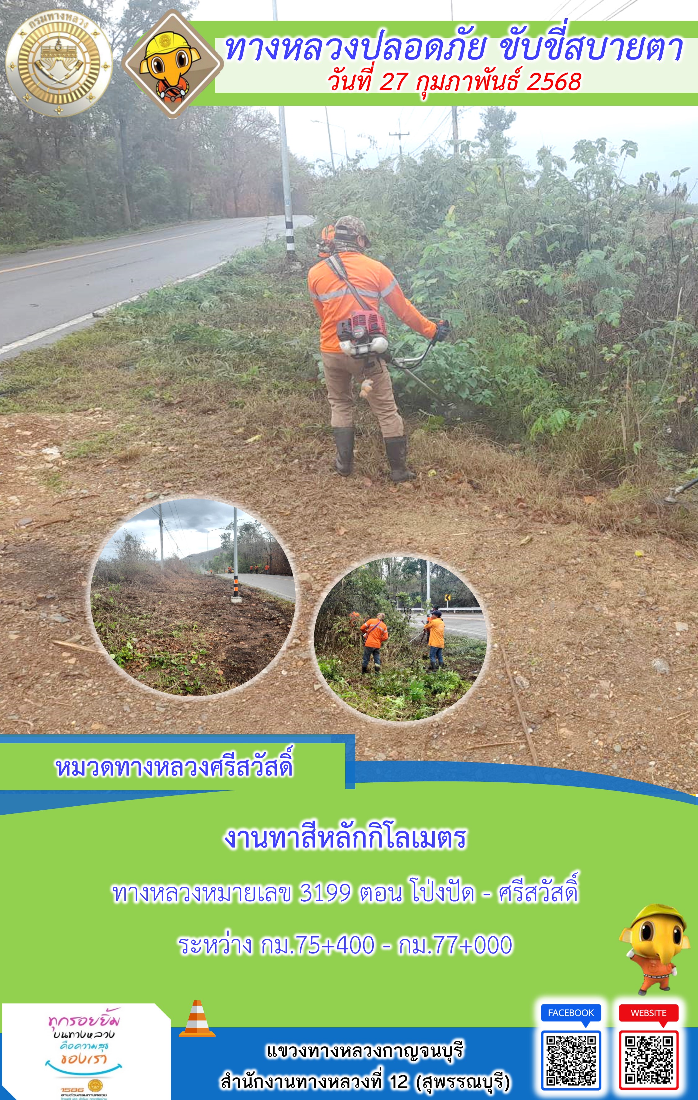 ข้อมูลภาพกิจกรรม : แขวงทางหลวงกาญจนบุรี โดยหมวดทางหลวงในสังกัด และงานอำนวยความปลอดภัยปฏิบัติงาน ประจำวันที่ 27 ก.พ. 68