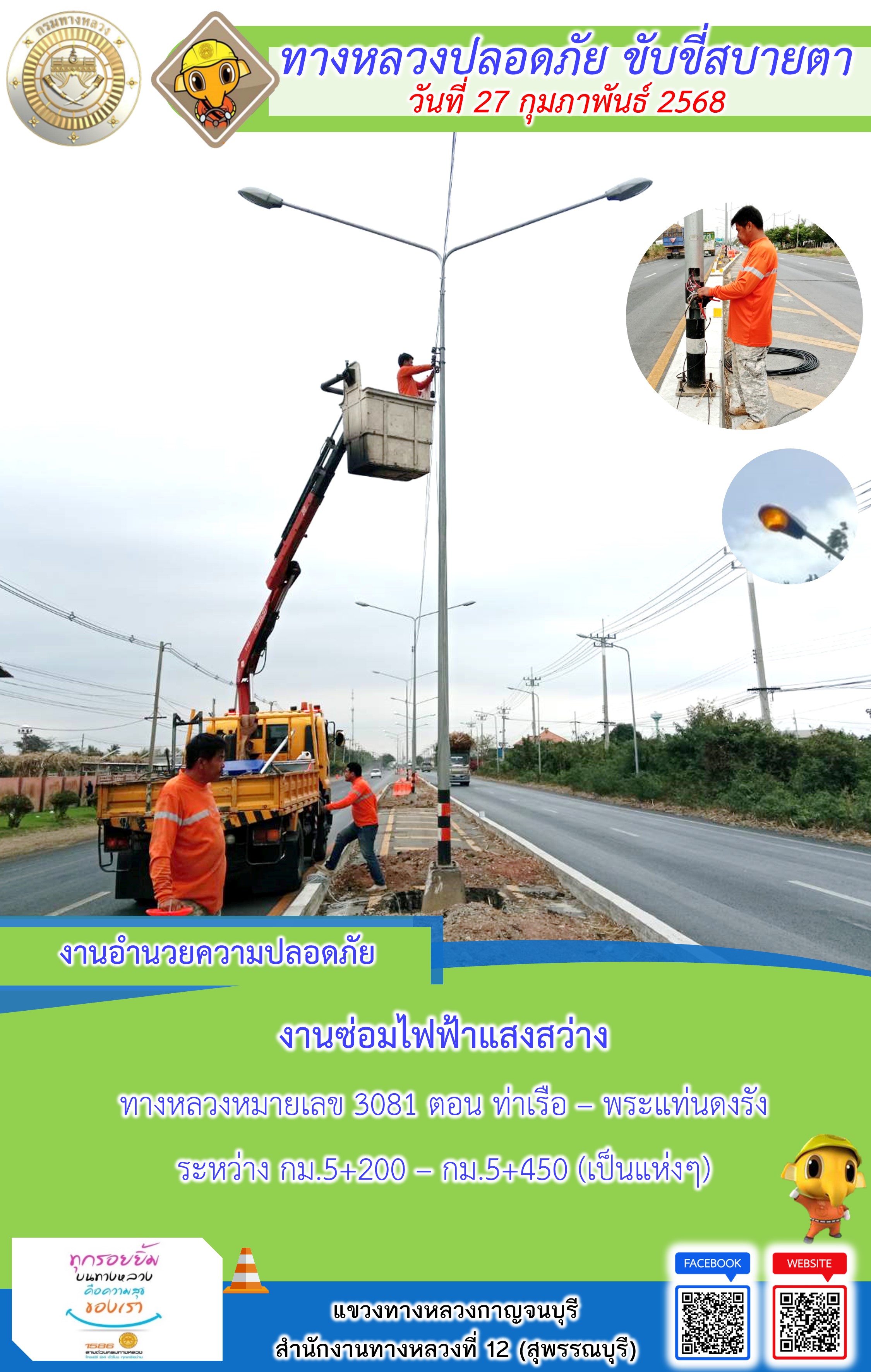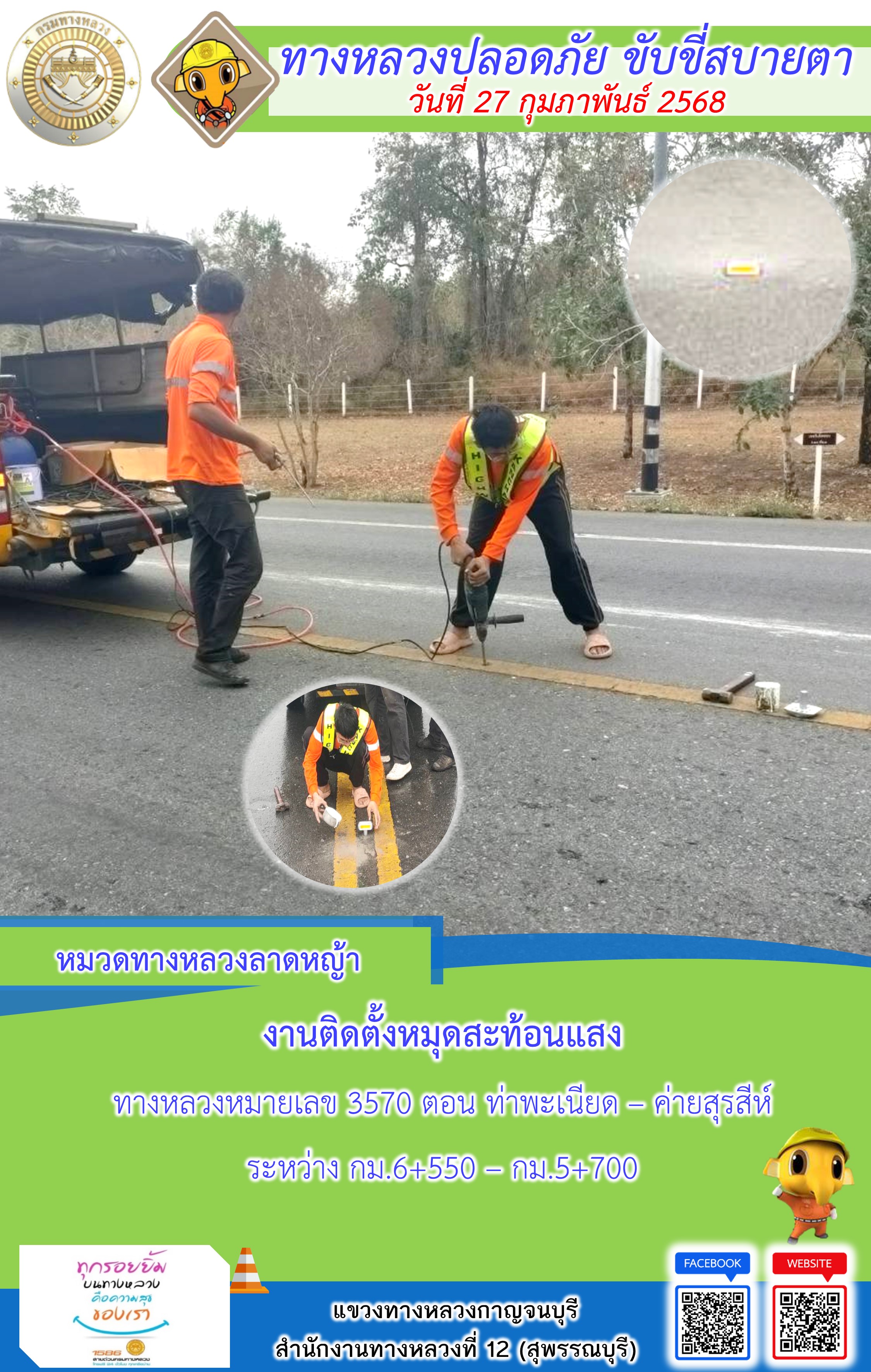 แขวงทางหลวงกาญจนบุรี โดยหมวดทางหลวงในสังกัด และงานอำนวยความปลอดภัยปฏิบัติงาน ประจำวันที่ 27 ก.พ. 68