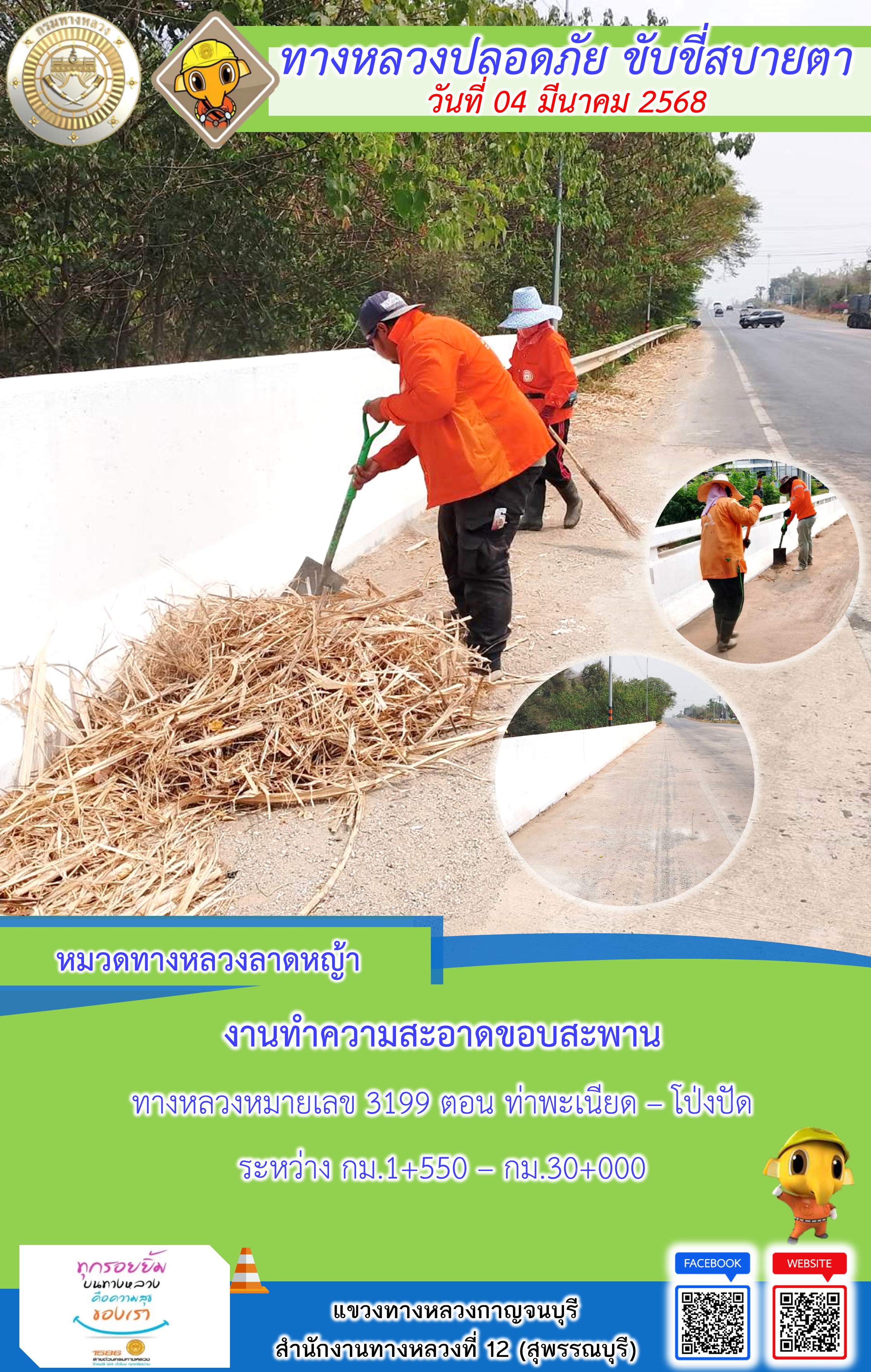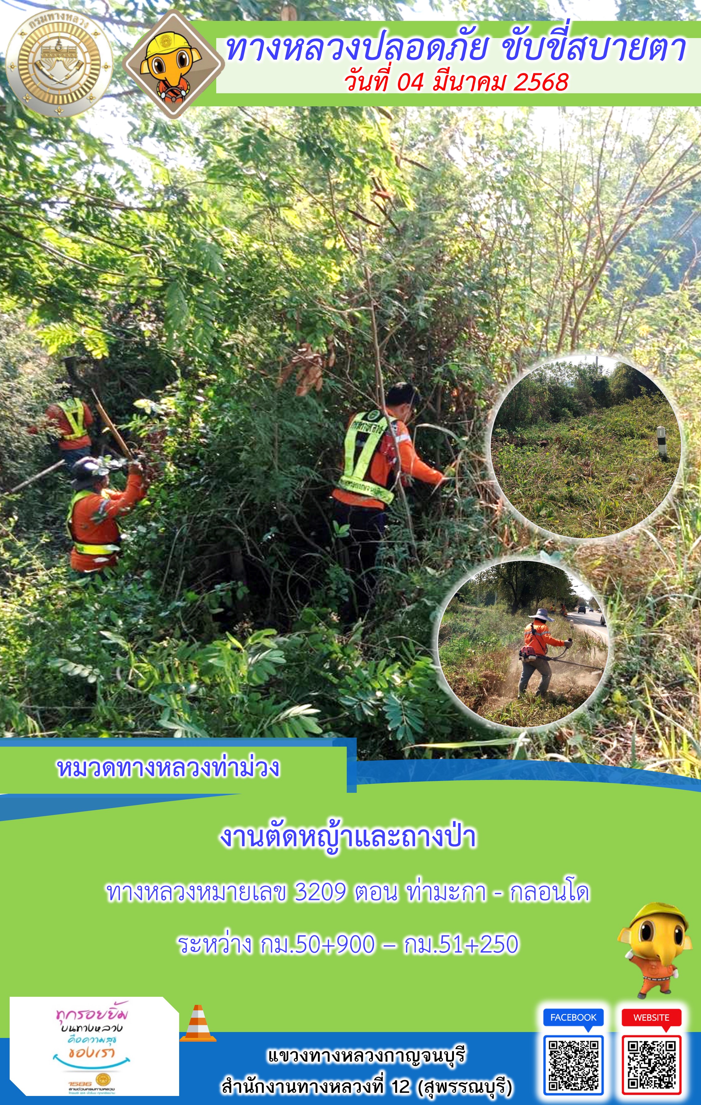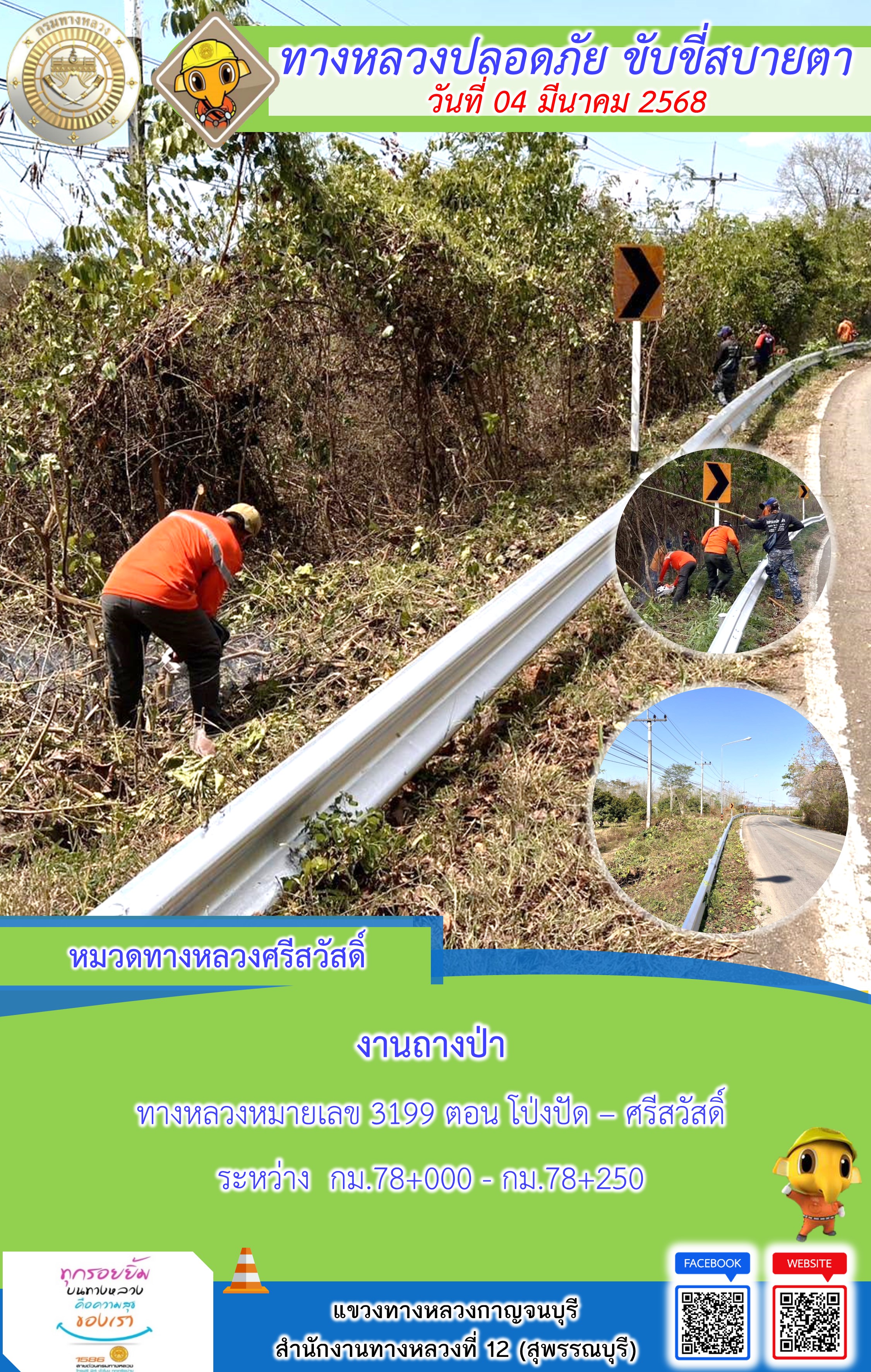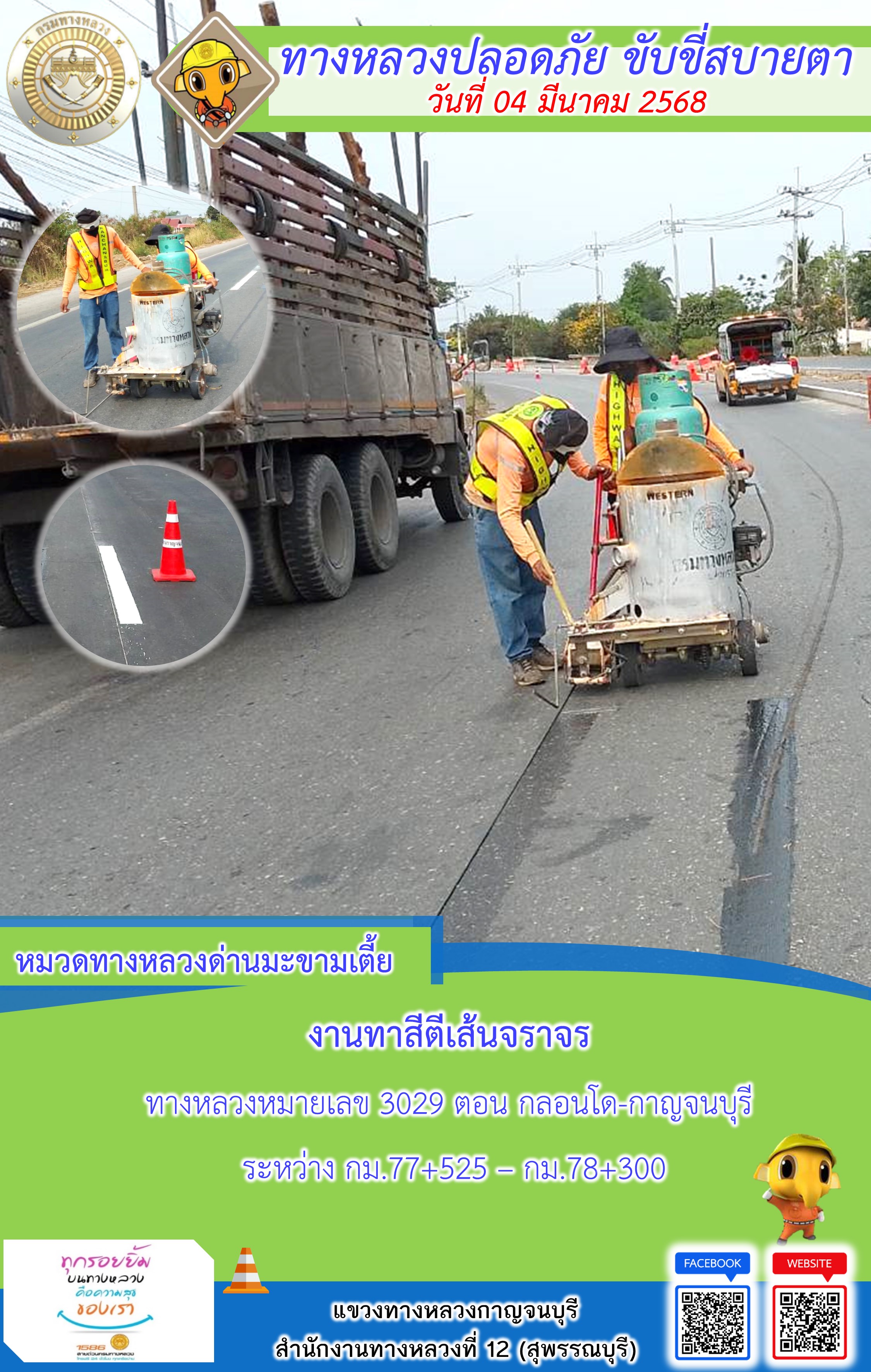 แขวงทางหลวงกาญจนบุรี โดยหมวดทางหลวงในสังกัด และงานอำนวยความปลอดภัยปฏิบัติงาน ประจำวันที่ 4 มี.ค. 68
