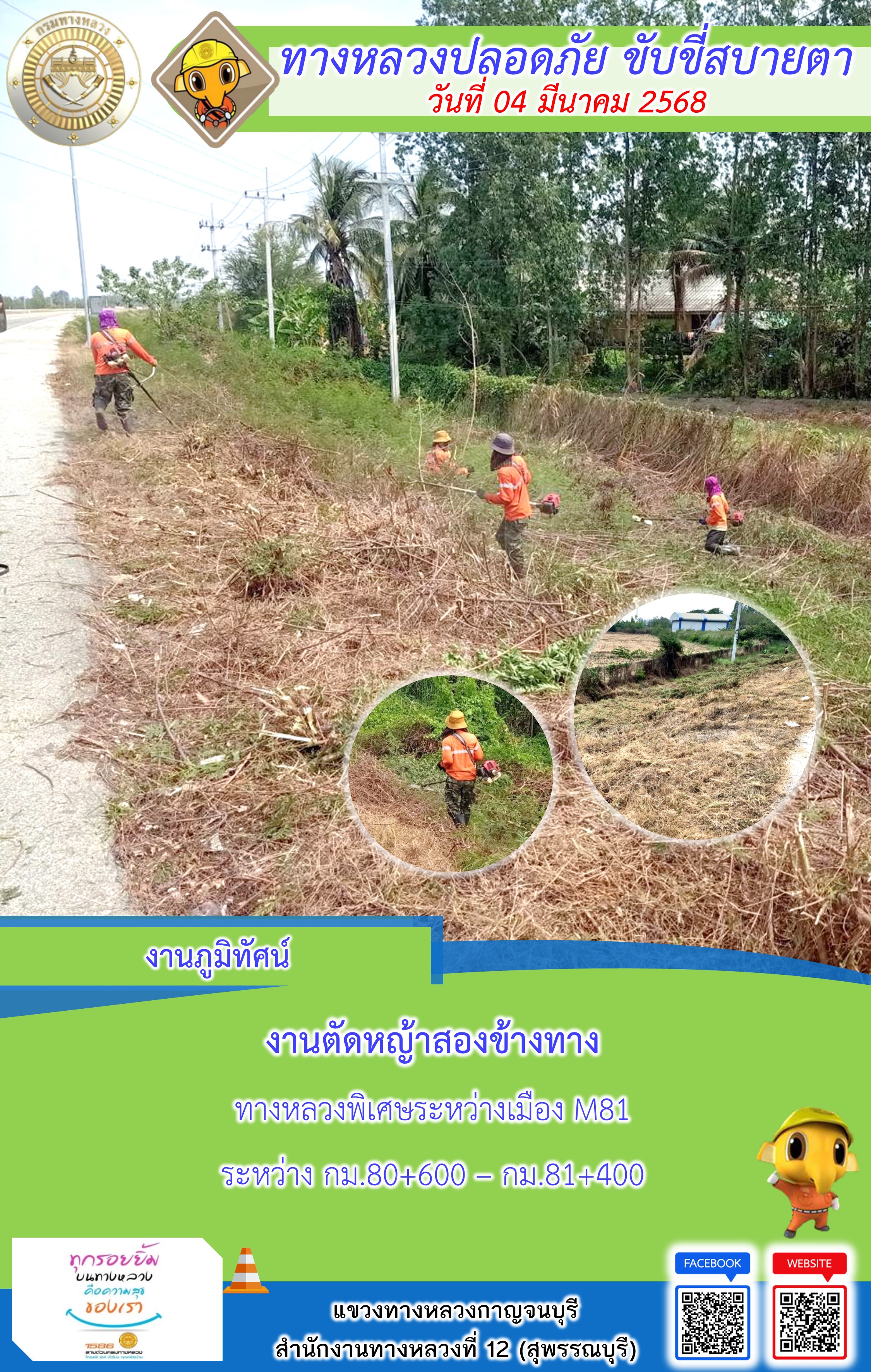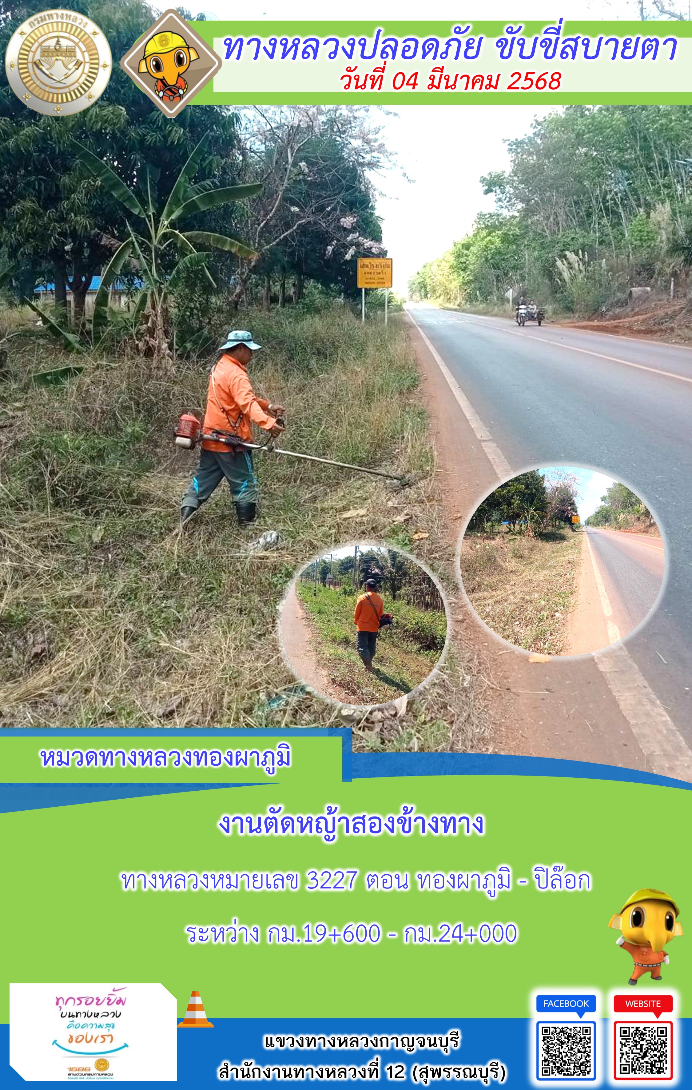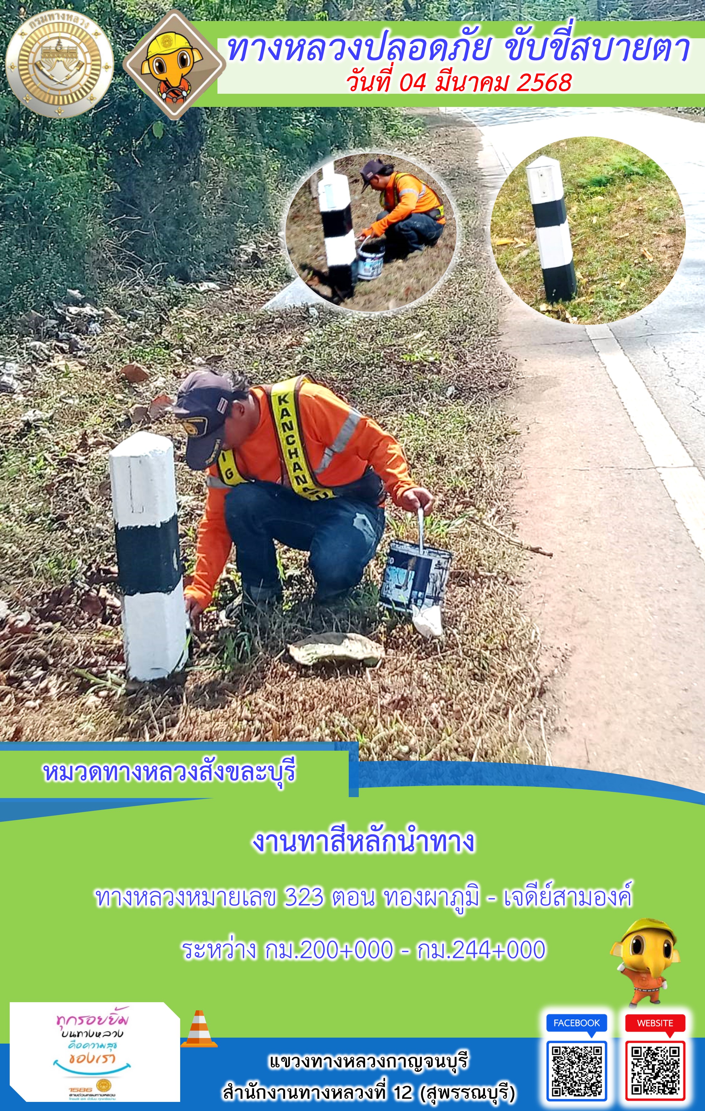 ข้อมูลภาพกิจกรรม : แขวงทางหลวงกาญจนบุรี โดยหมวดทางหลวงในสังกัด และงานอำนวยความปลอดภัยปฏิบัติงาน ประจำวันที่ 4 มี.ค. 68