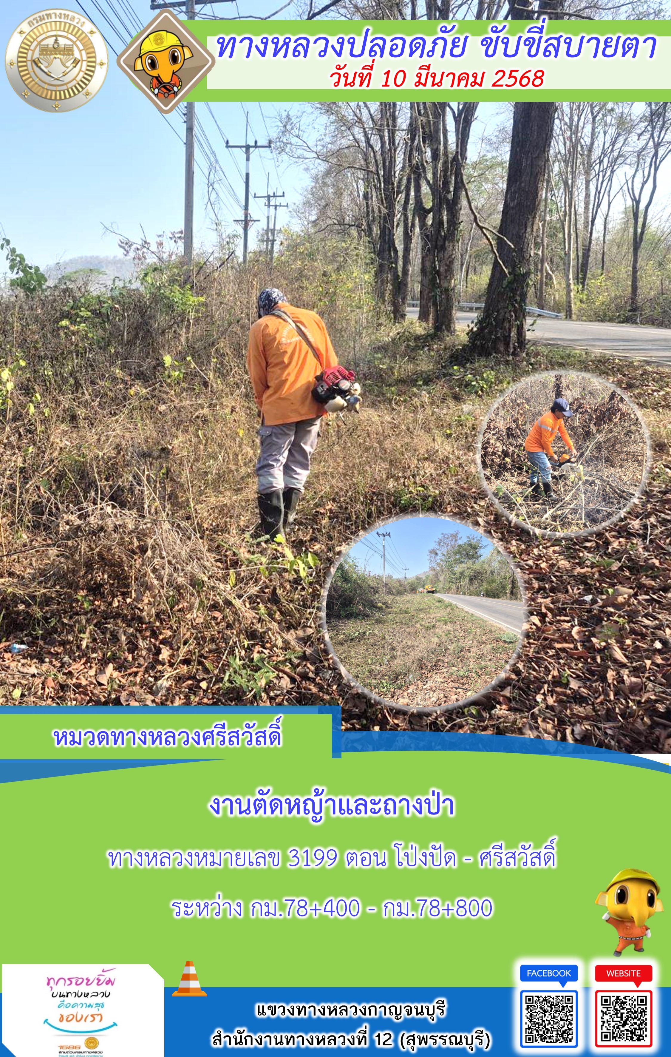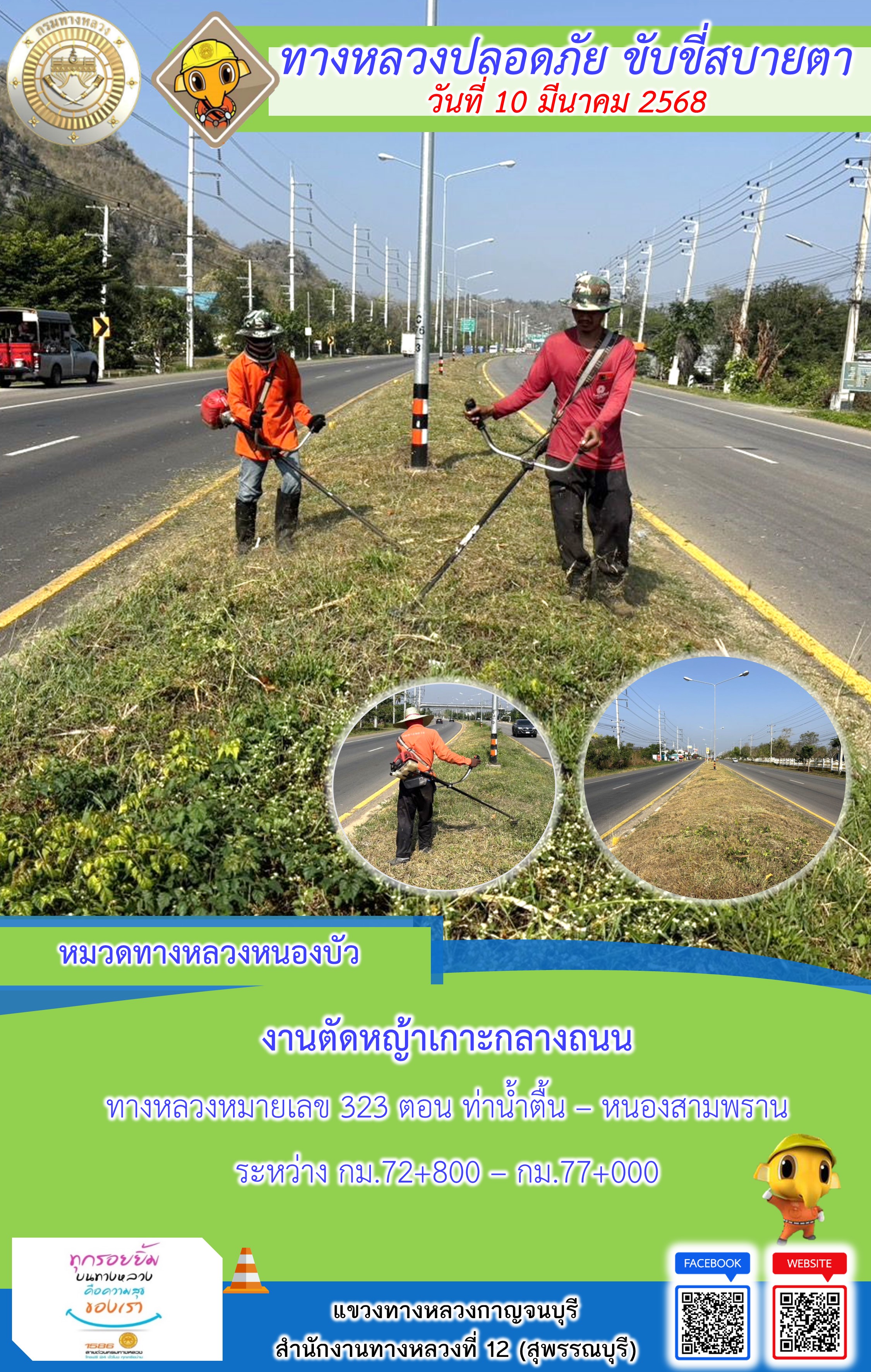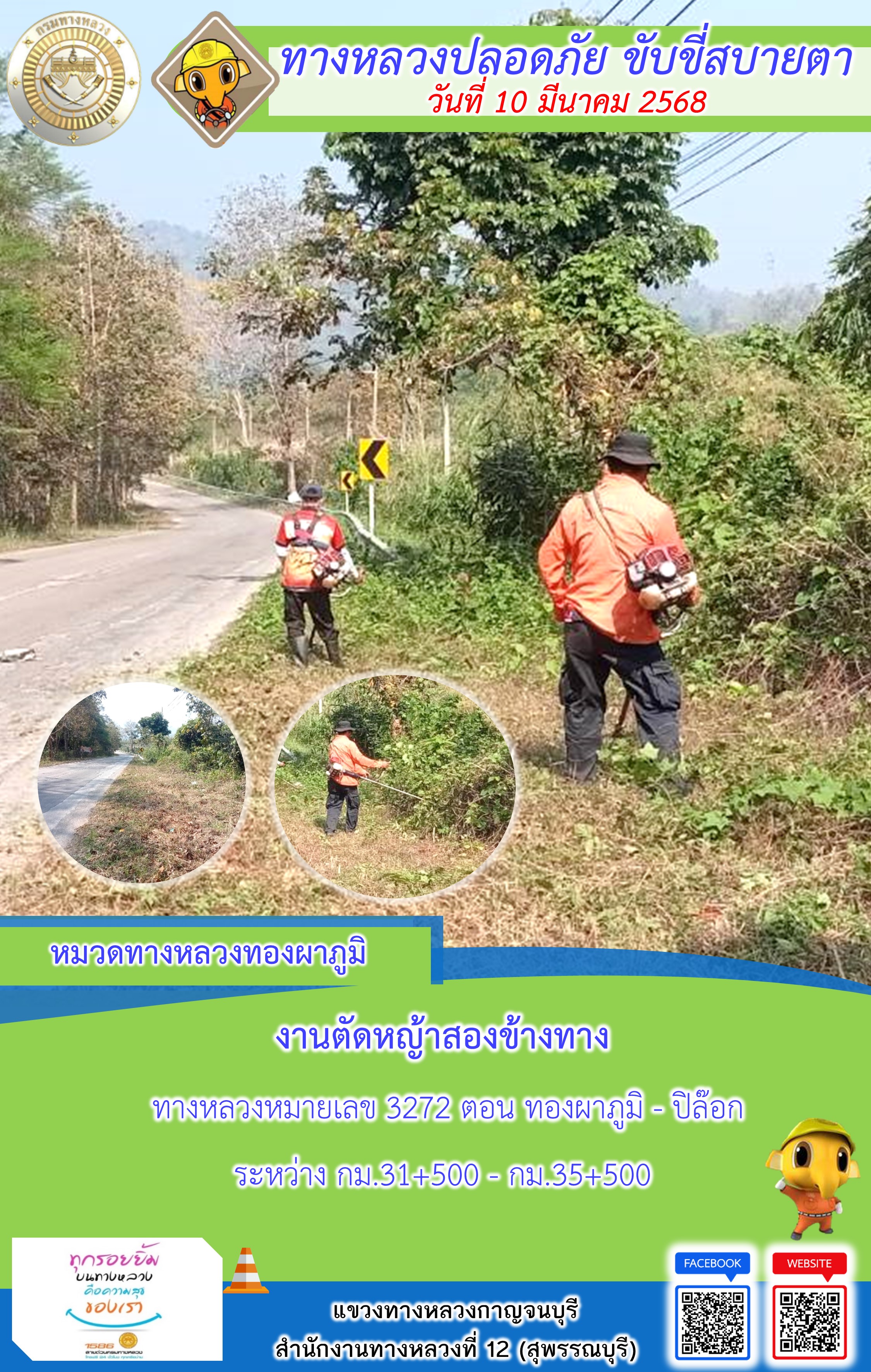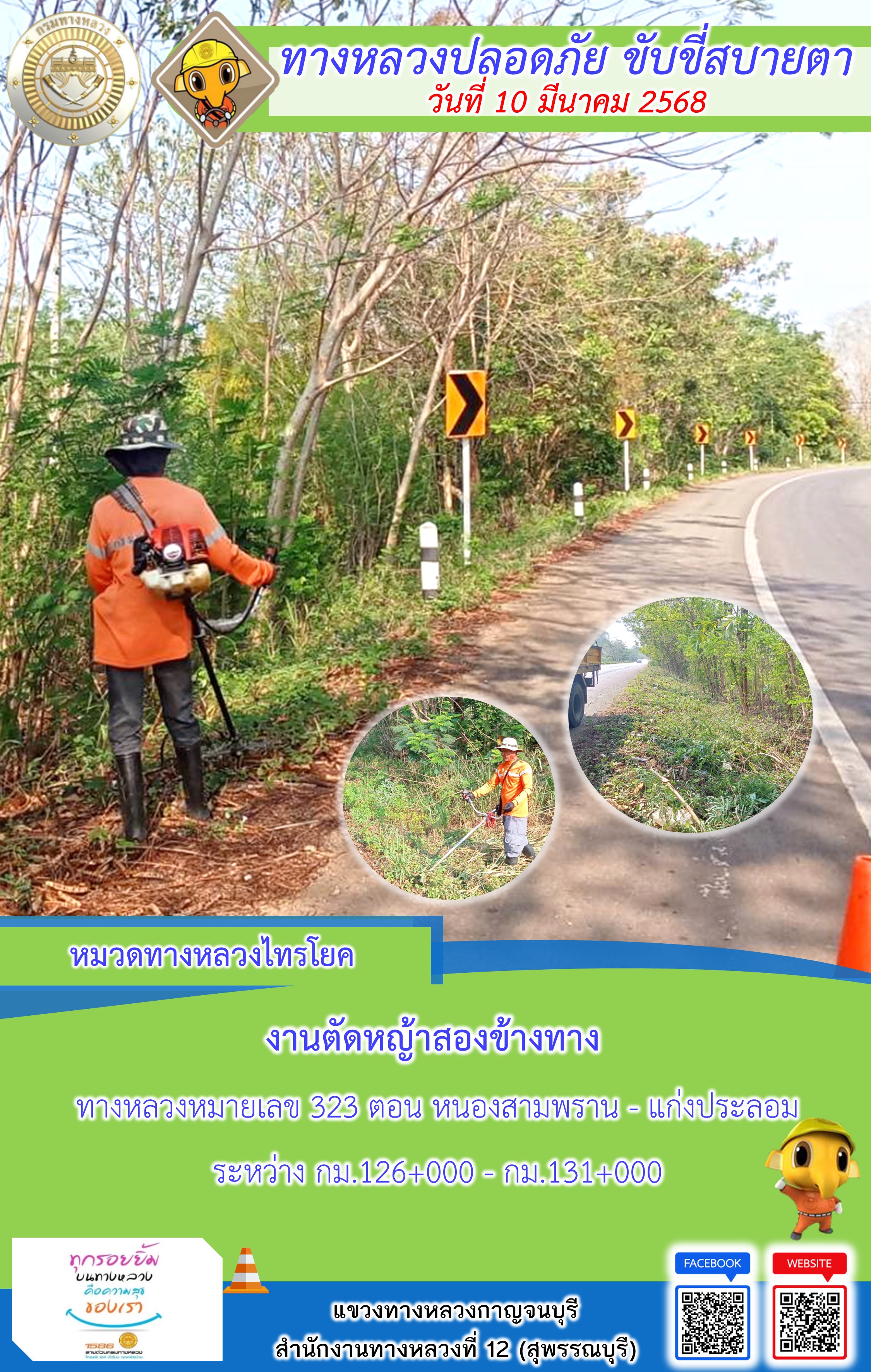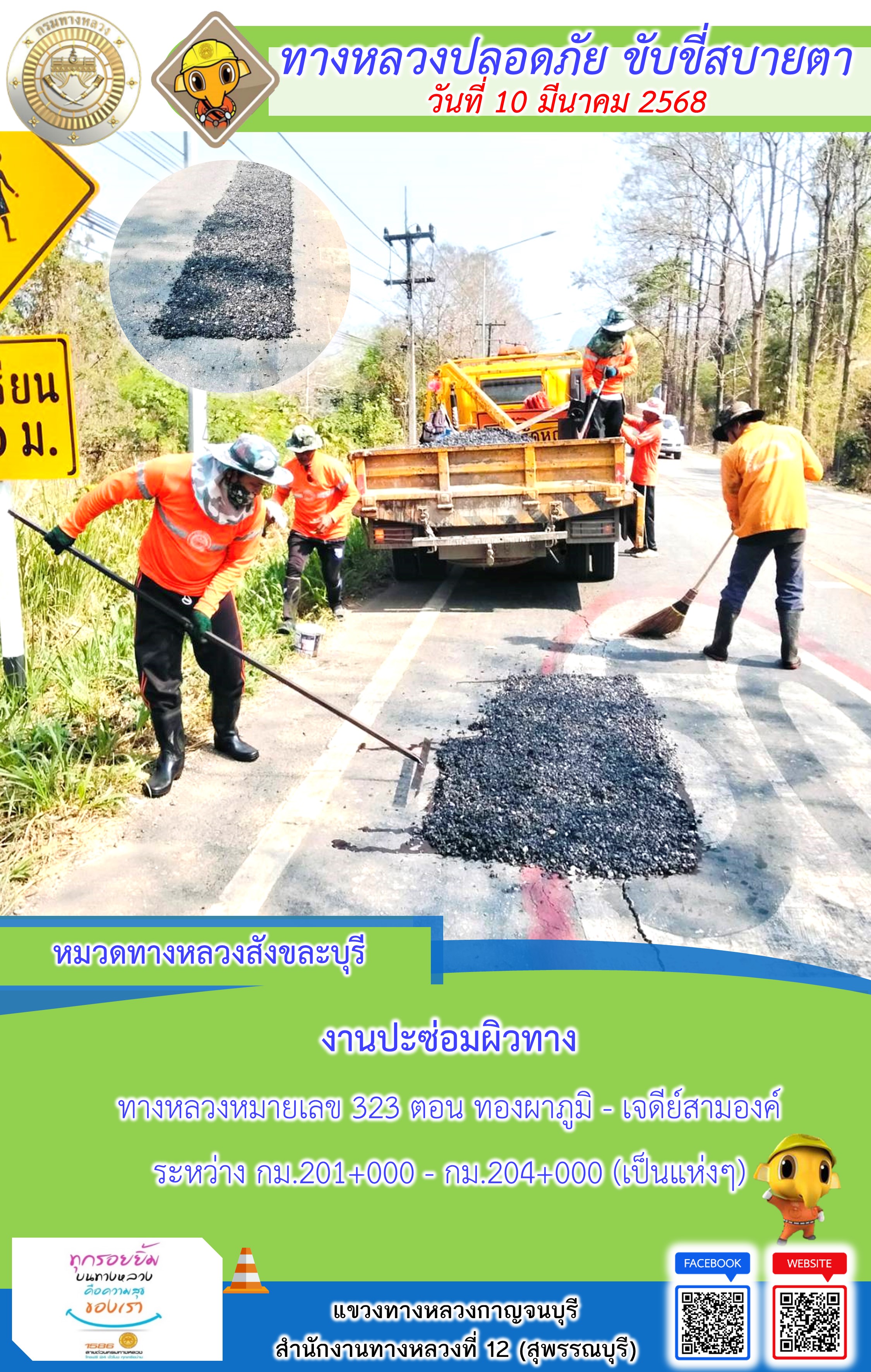 ข้อมูลภาพกิจกรรม : แขวงทางหลวงกาญจนบุรี โดยหมวดทางหลวงในสังกัด และงานอำนวยความปลอดภัยปฏิบัติงาน ประจำวันที่ 10 มี.ค. 68