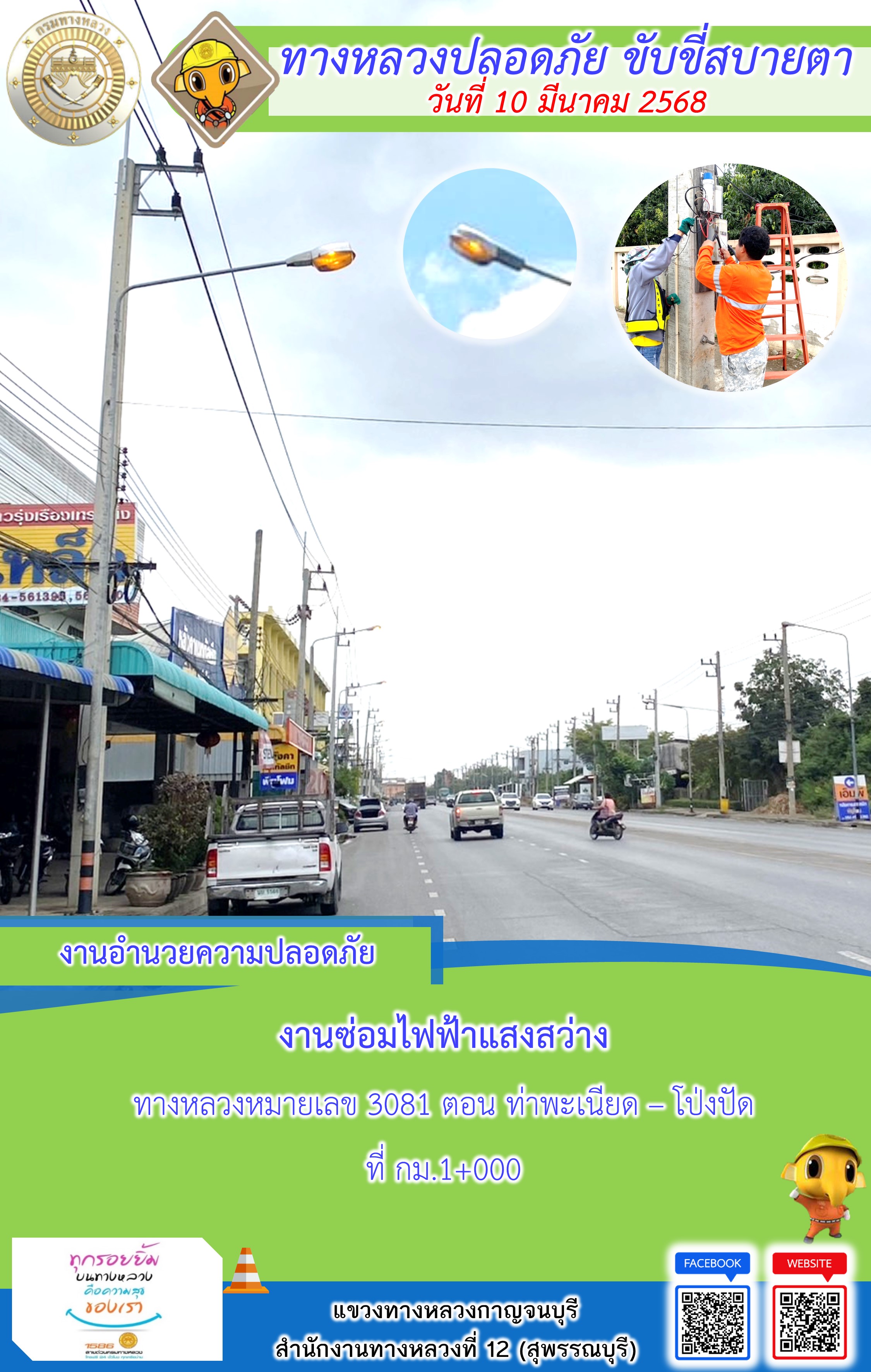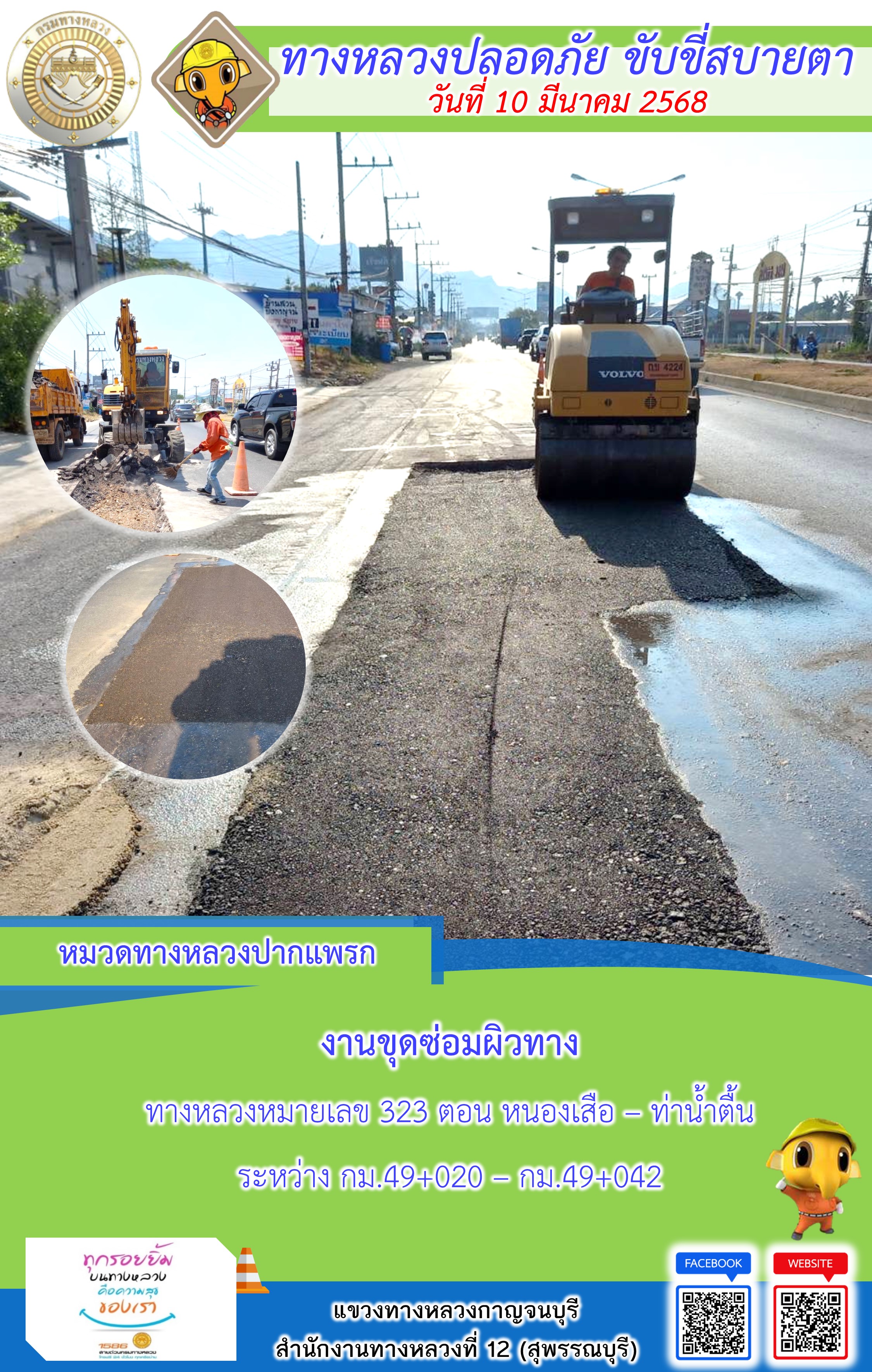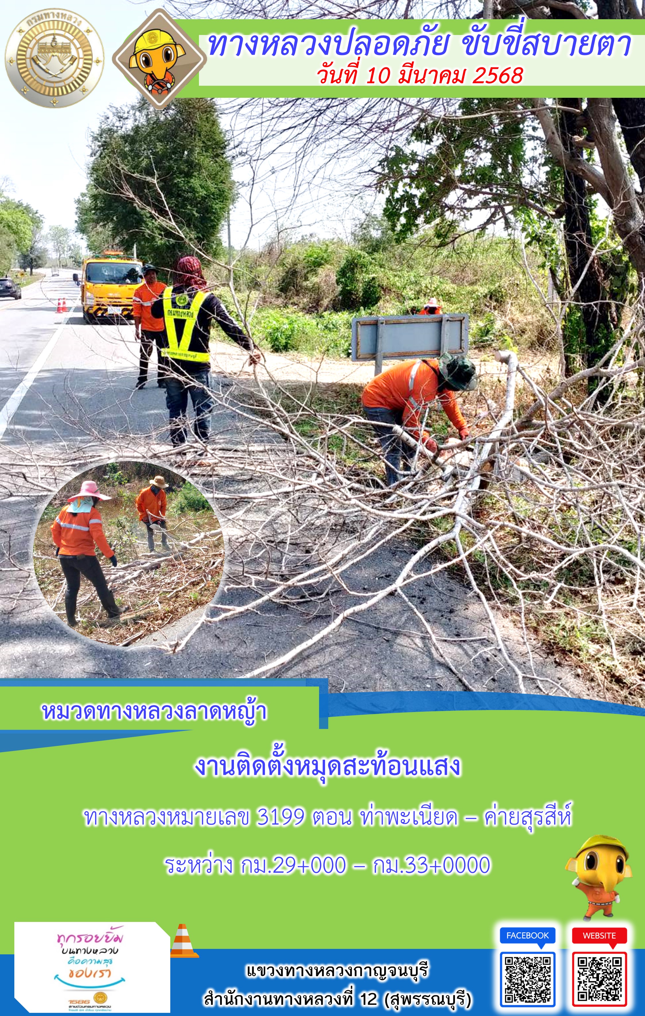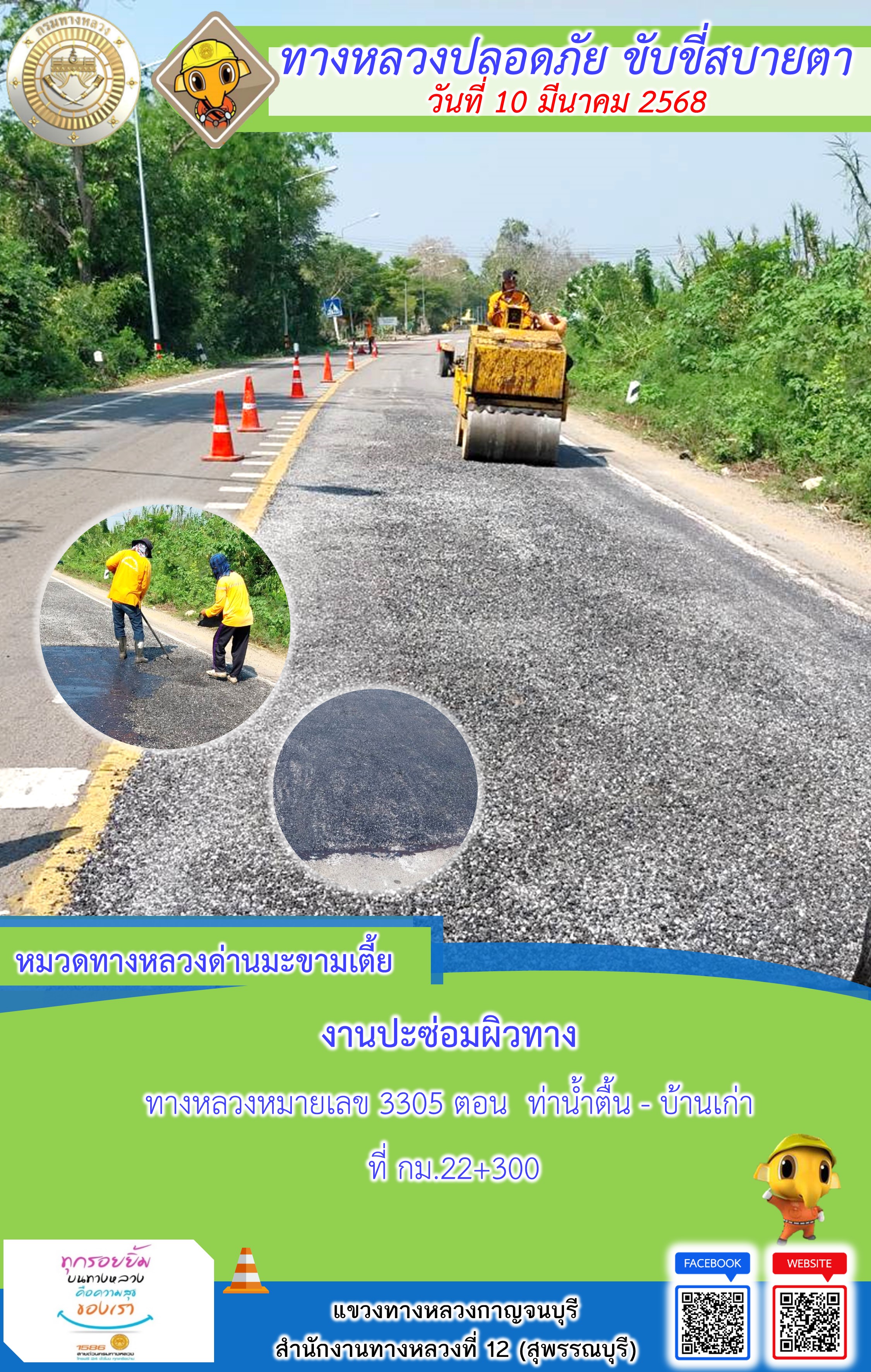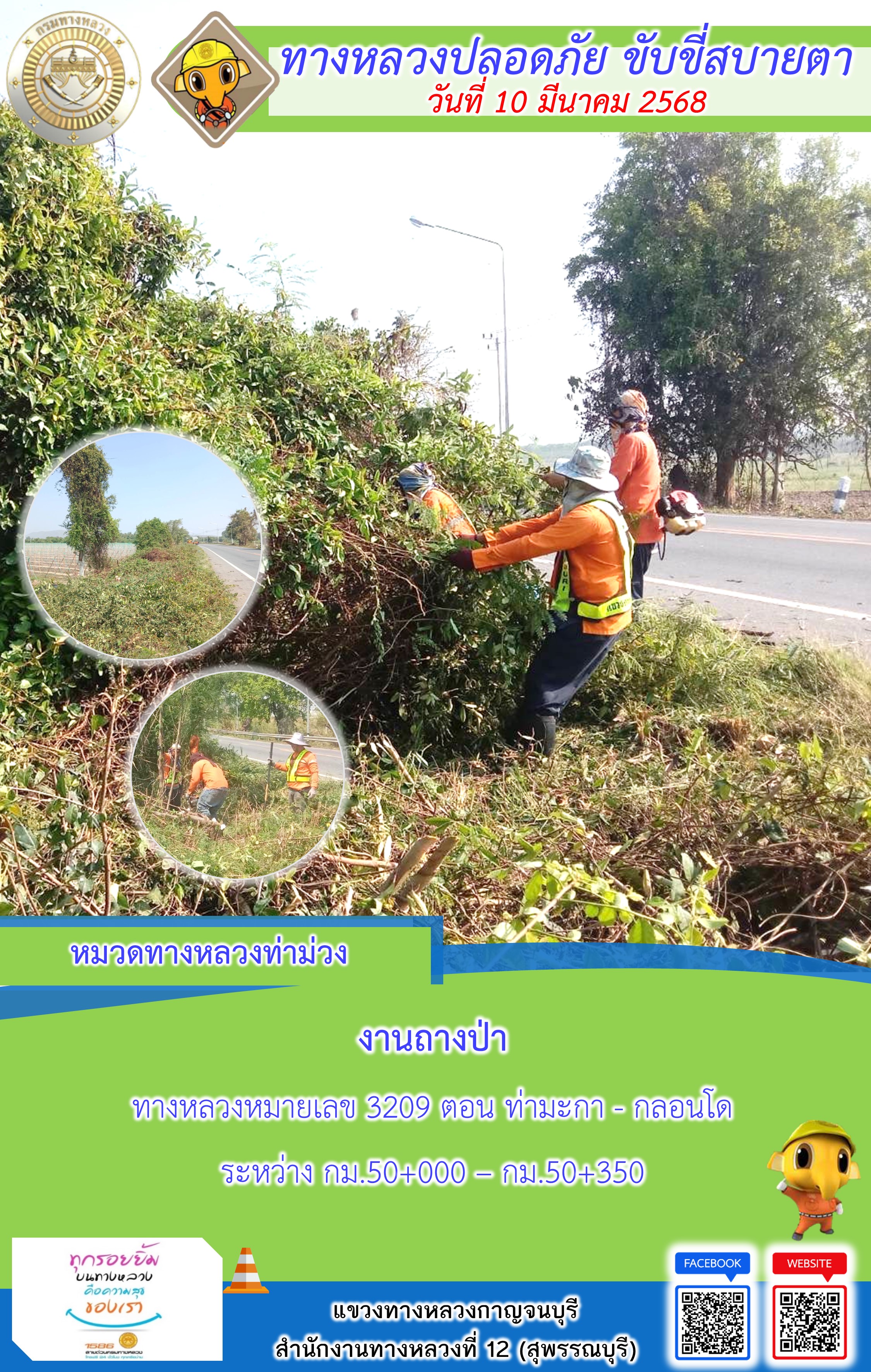 ข้อมูลภาพกิจกรรม : แขวงทางหลวงกาญจนบุรี โดยหมวดทางหลวงในสังกัด และงานอำนวยความปลอดภัยปฏิบัติงาน ประจำวันที่ 10 มี.ค. 68