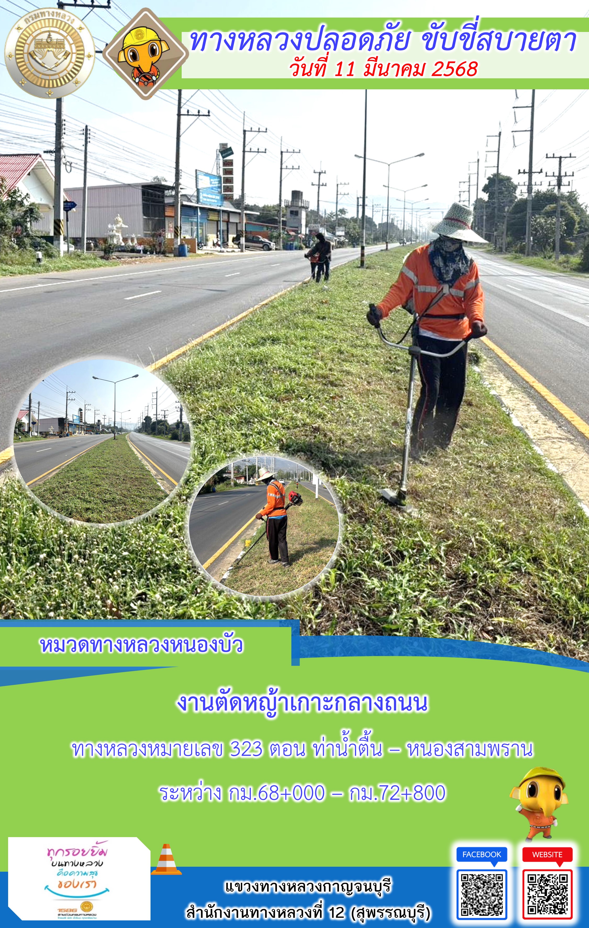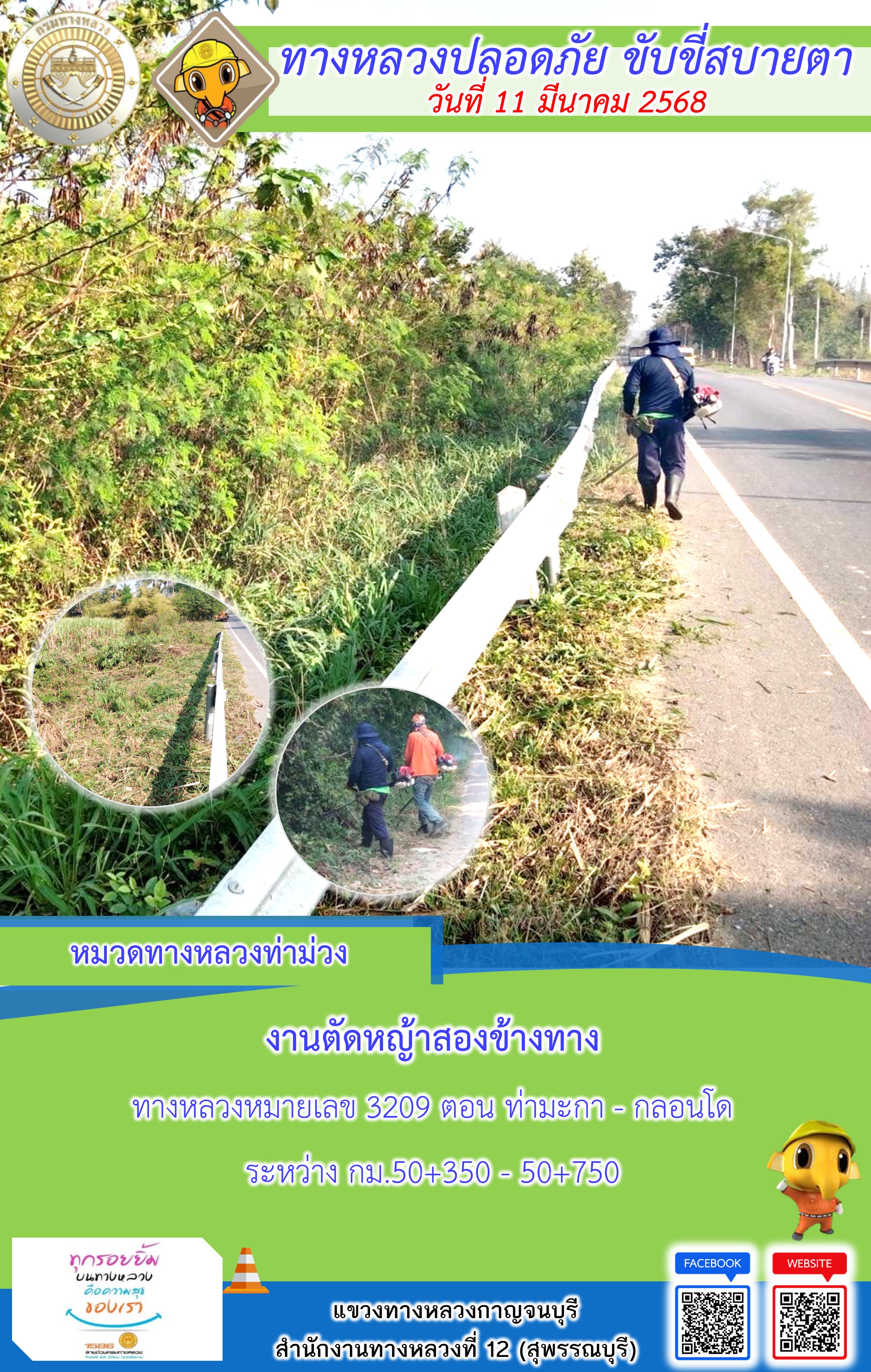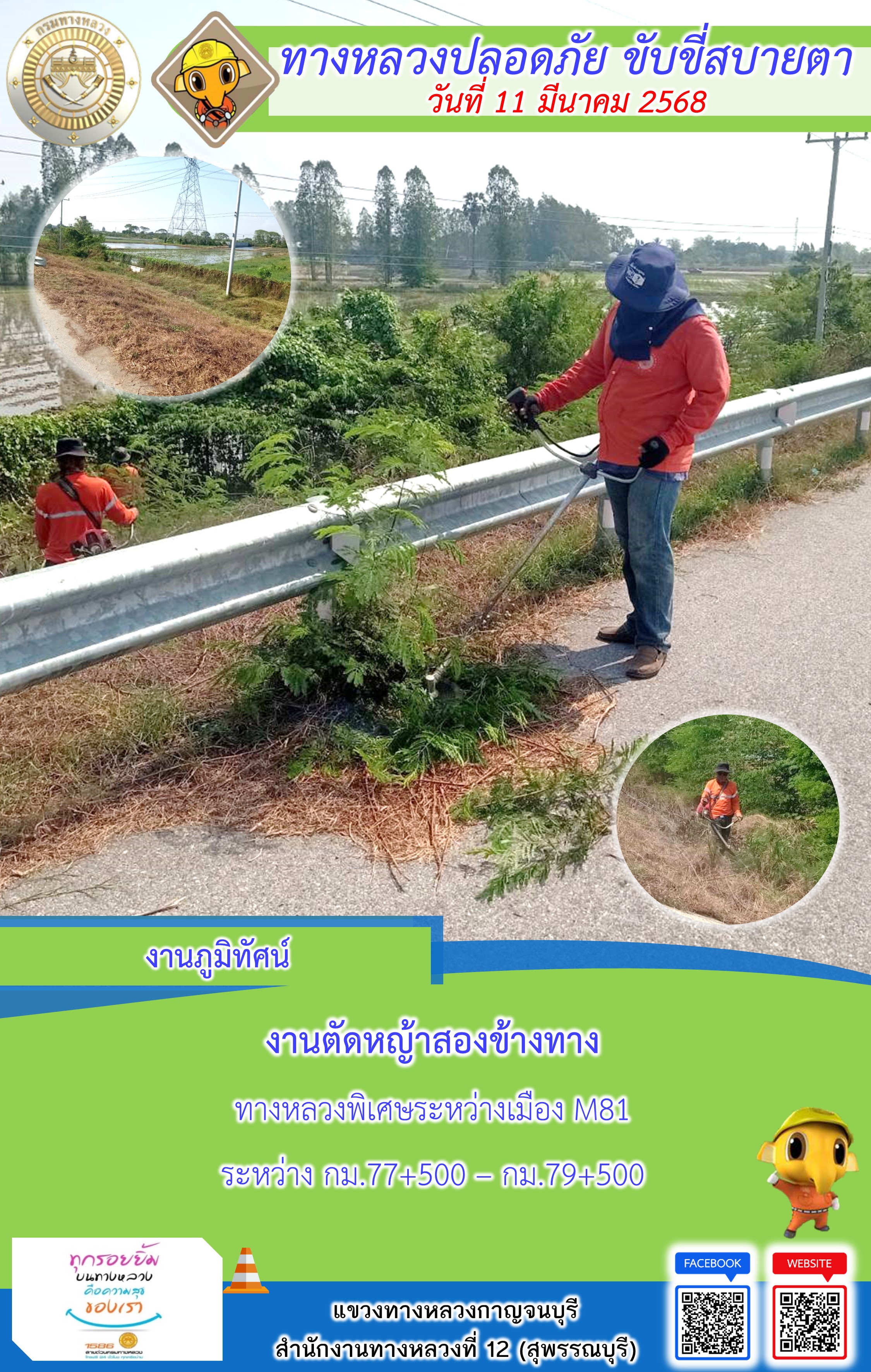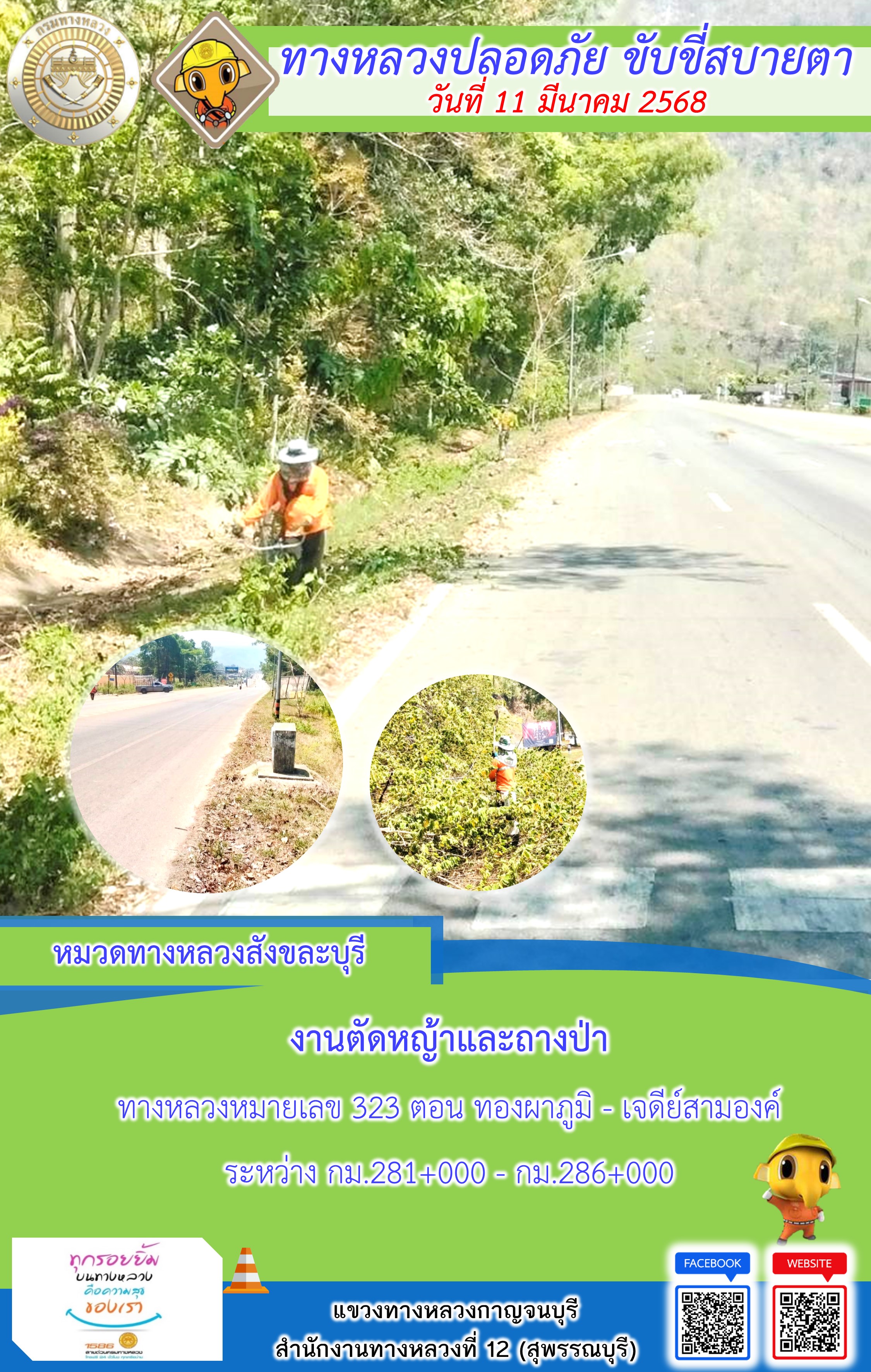 ข้อมูลภาพกิจกรรม : แขวงทางหลวงกาญจนบุรี โดยหมวดทางหลวงในสังกัด และงานอำนวยความปลอดภัยปฏิบัติงาน ประจำวันที่ 12 มี.ค. 68