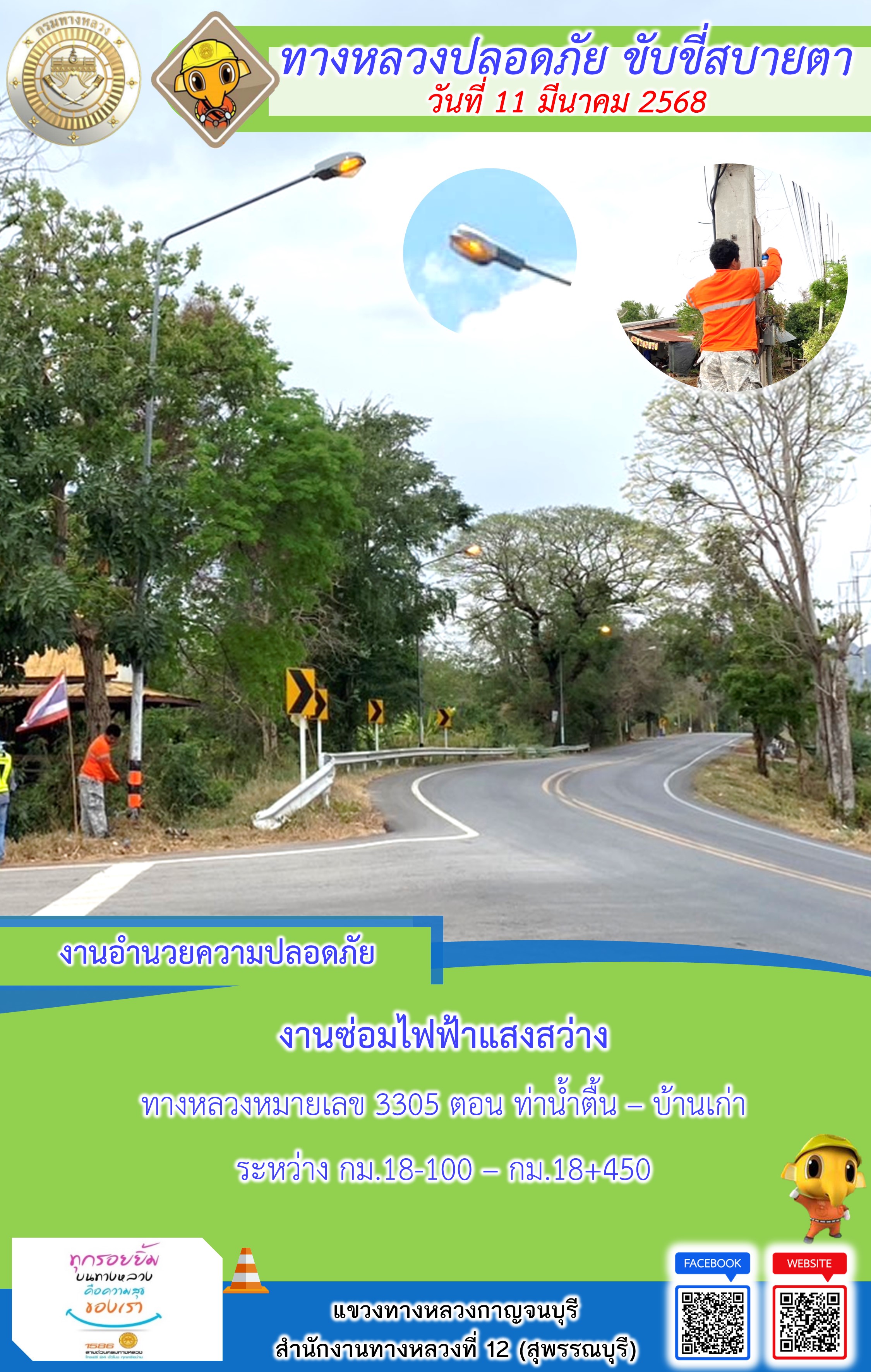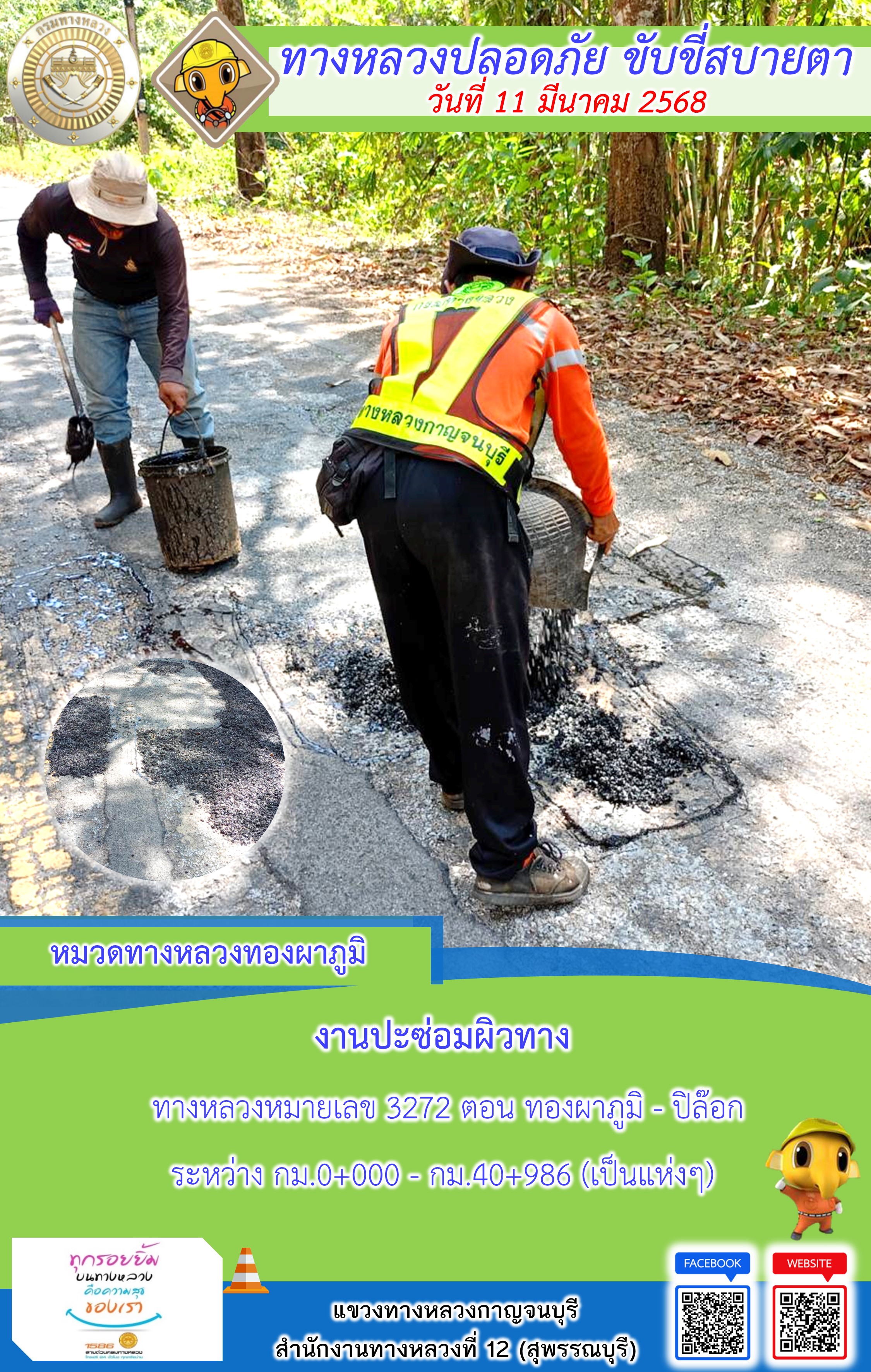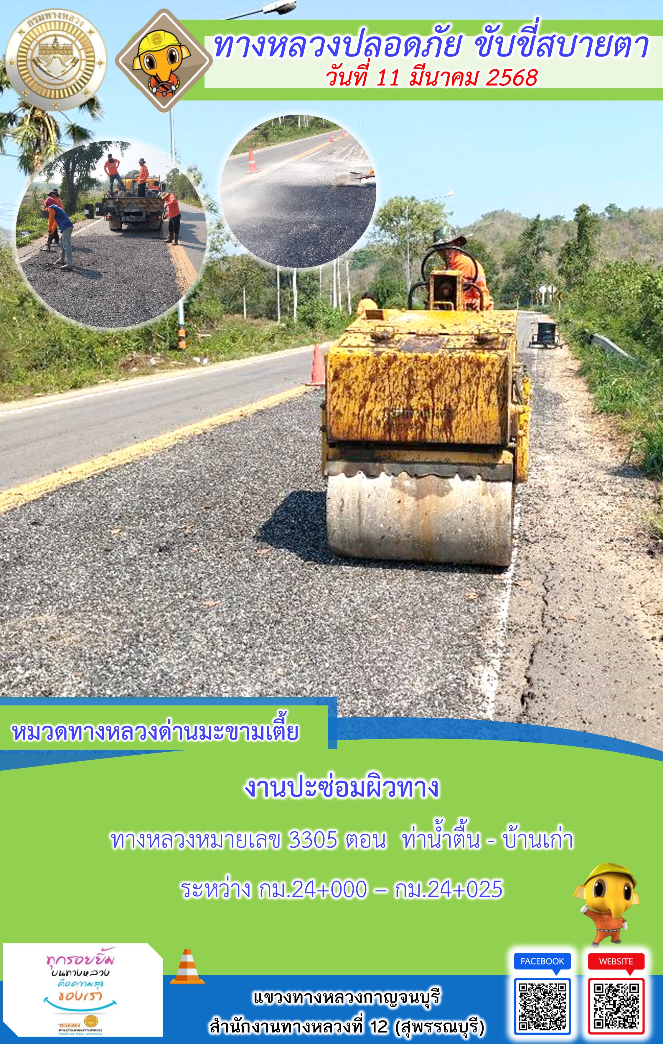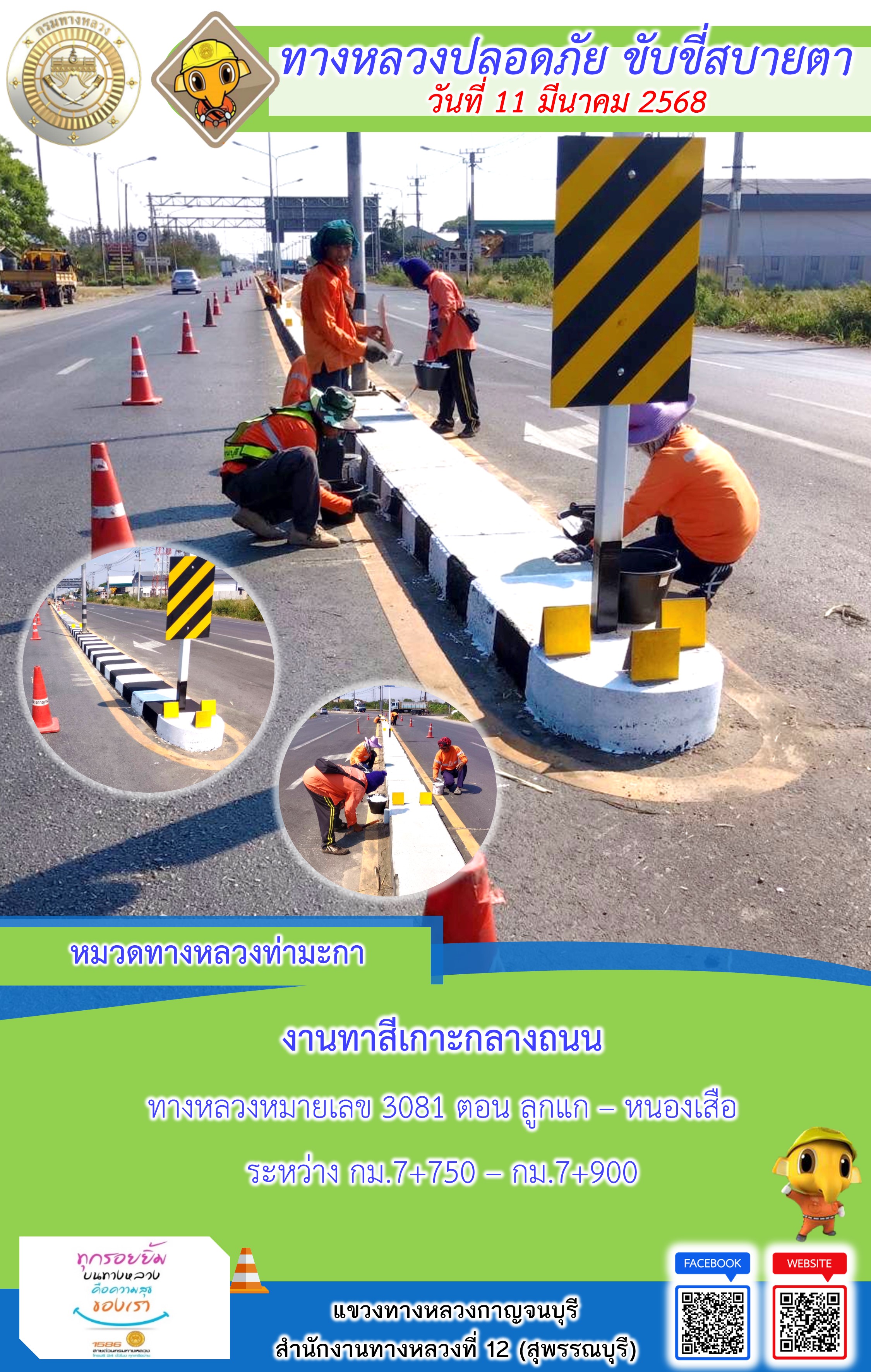 ข้อมูลภาพกิจกรรม : แขวงทางหลวงกาญจนบุรี โดยหมวดทางหลวงในสังกัด และงานอำนวยความปลอดภัยปฏิบัติงาน ประจำวันที่ 12 มี.ค. 68