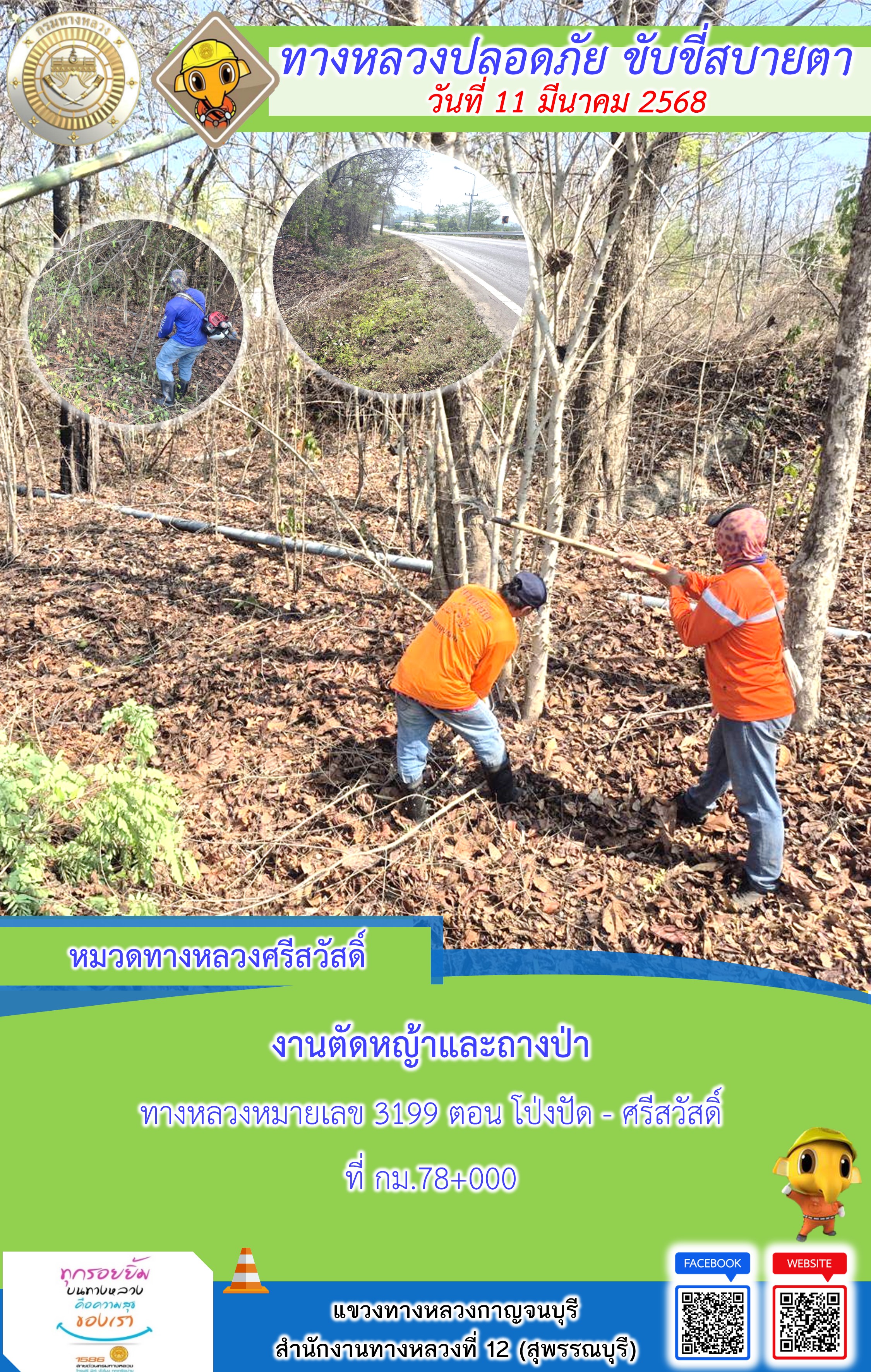 แขวงทางหลวงกาญจนบุรี โดยหมวดทางหลวงในสังกัด และงานอำนวยความปลอดภัยปฏิบัติงาน ประจำวันที่ 12 มี.ค. 68