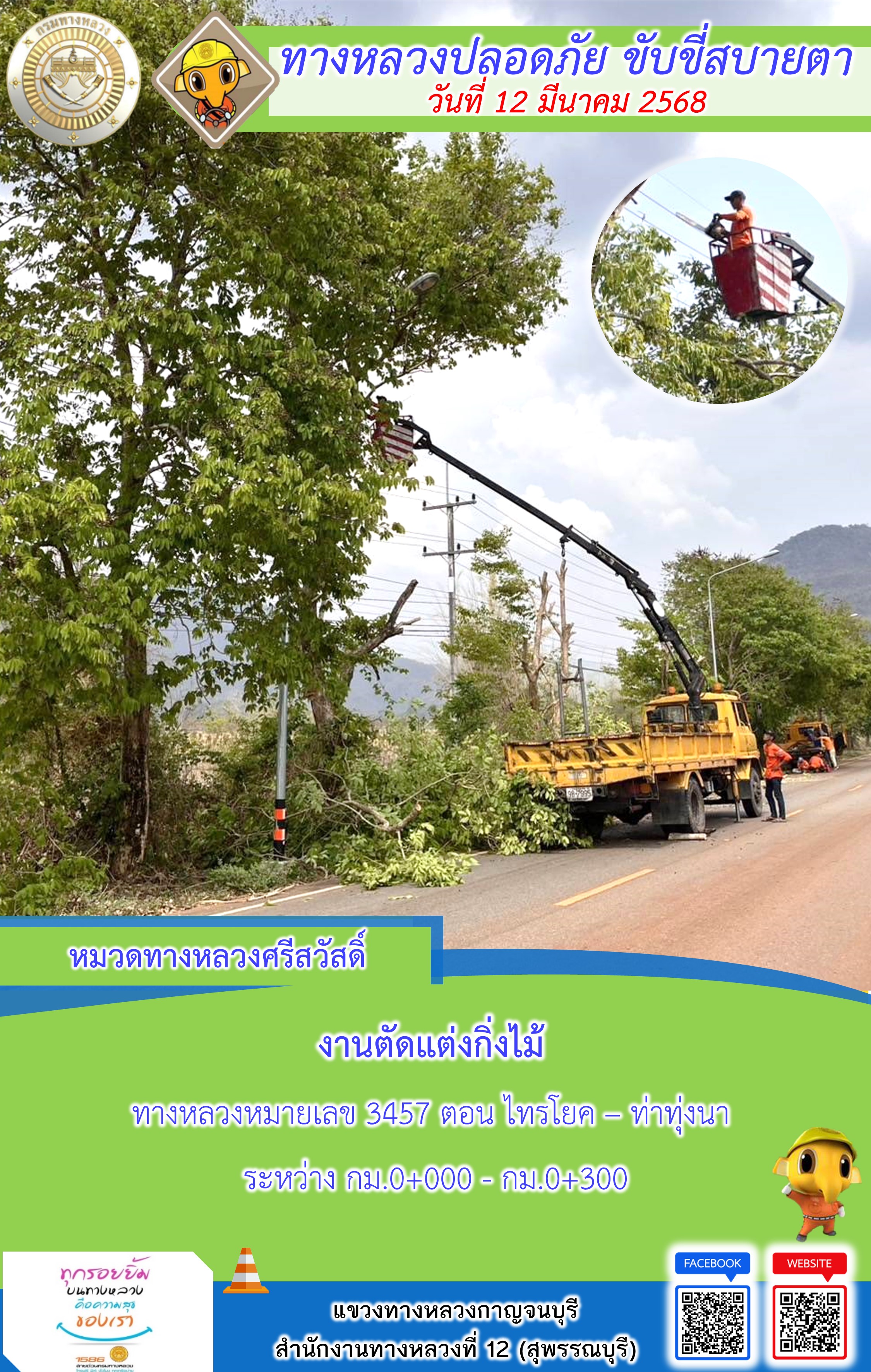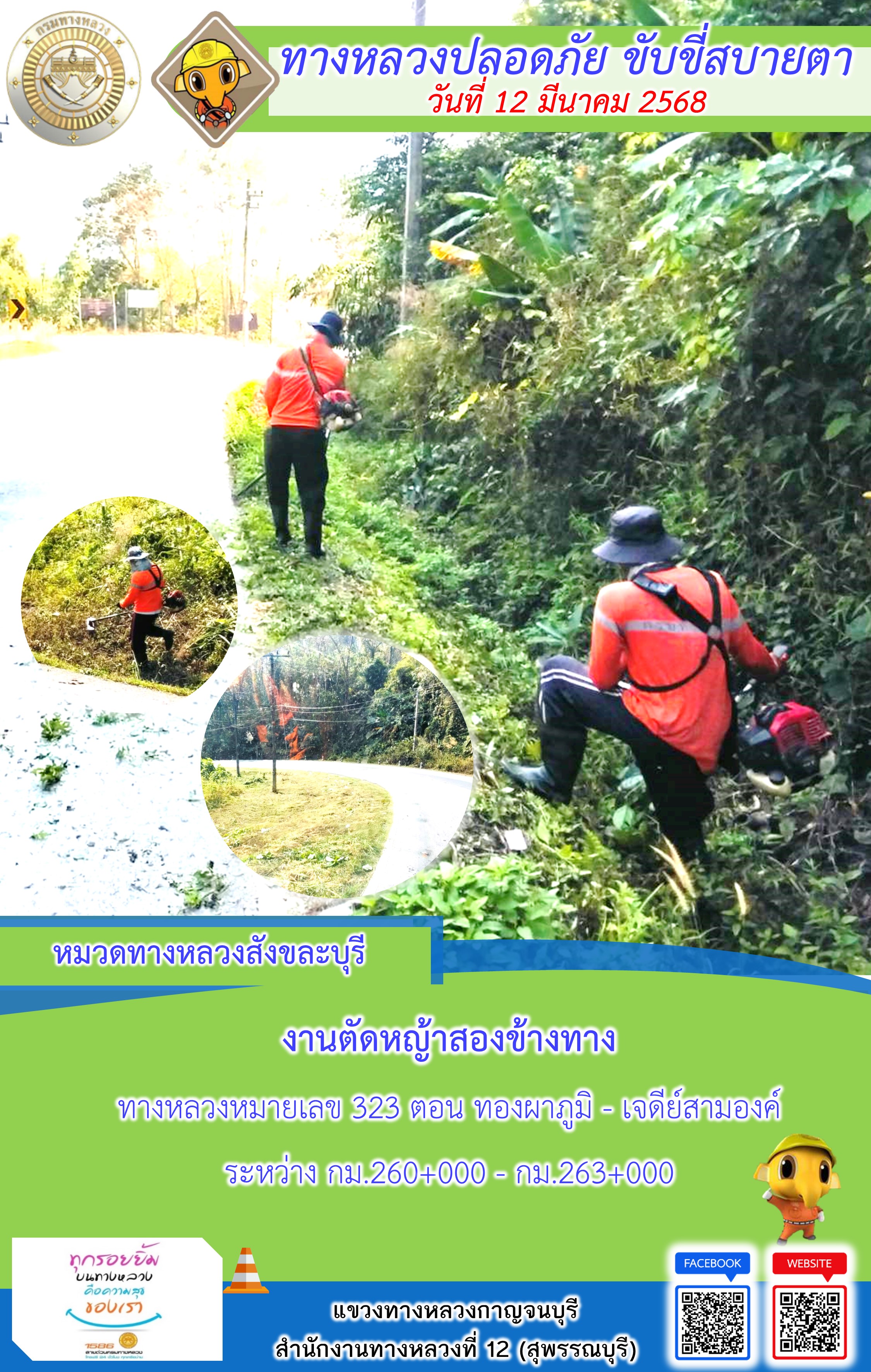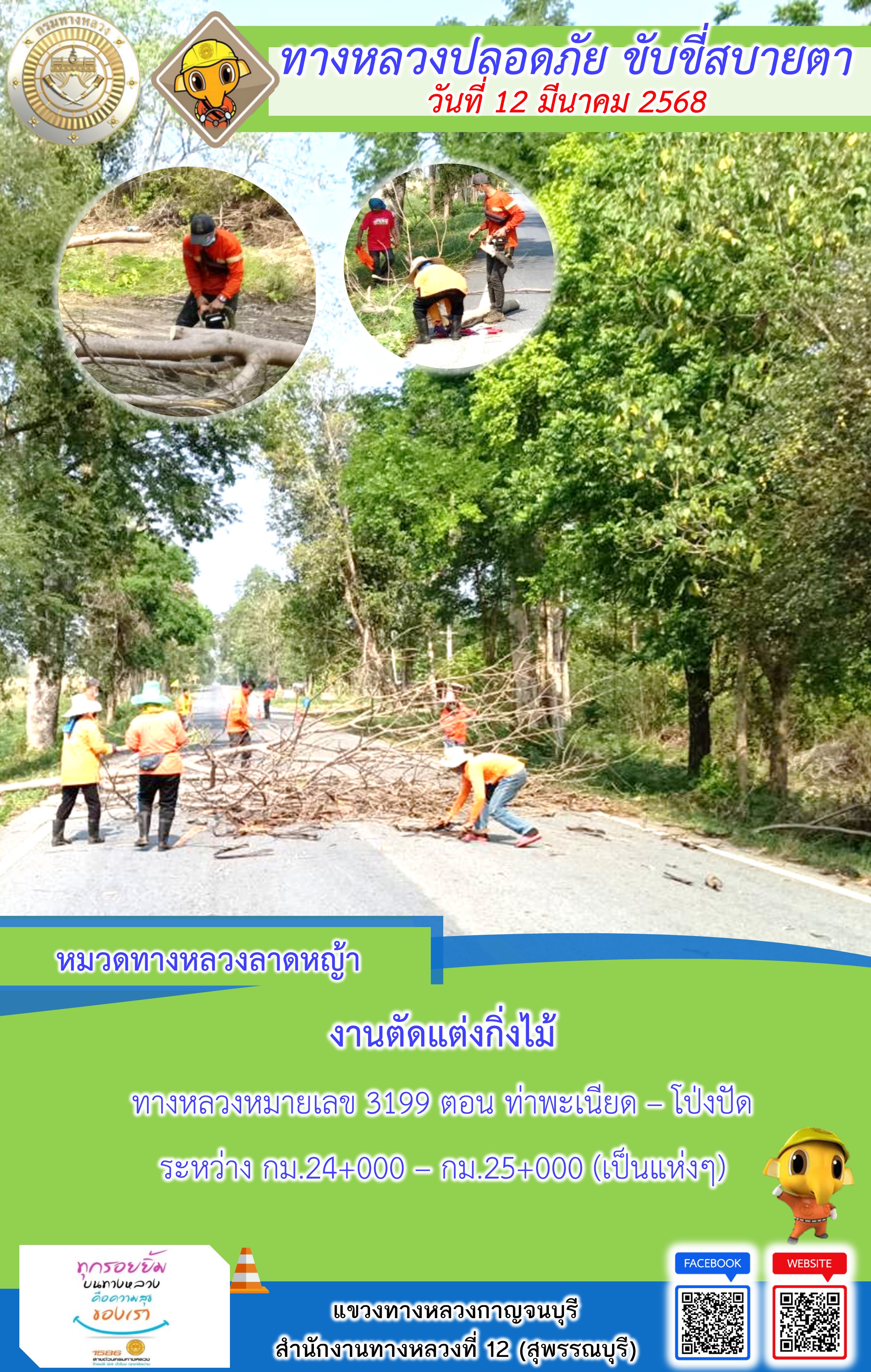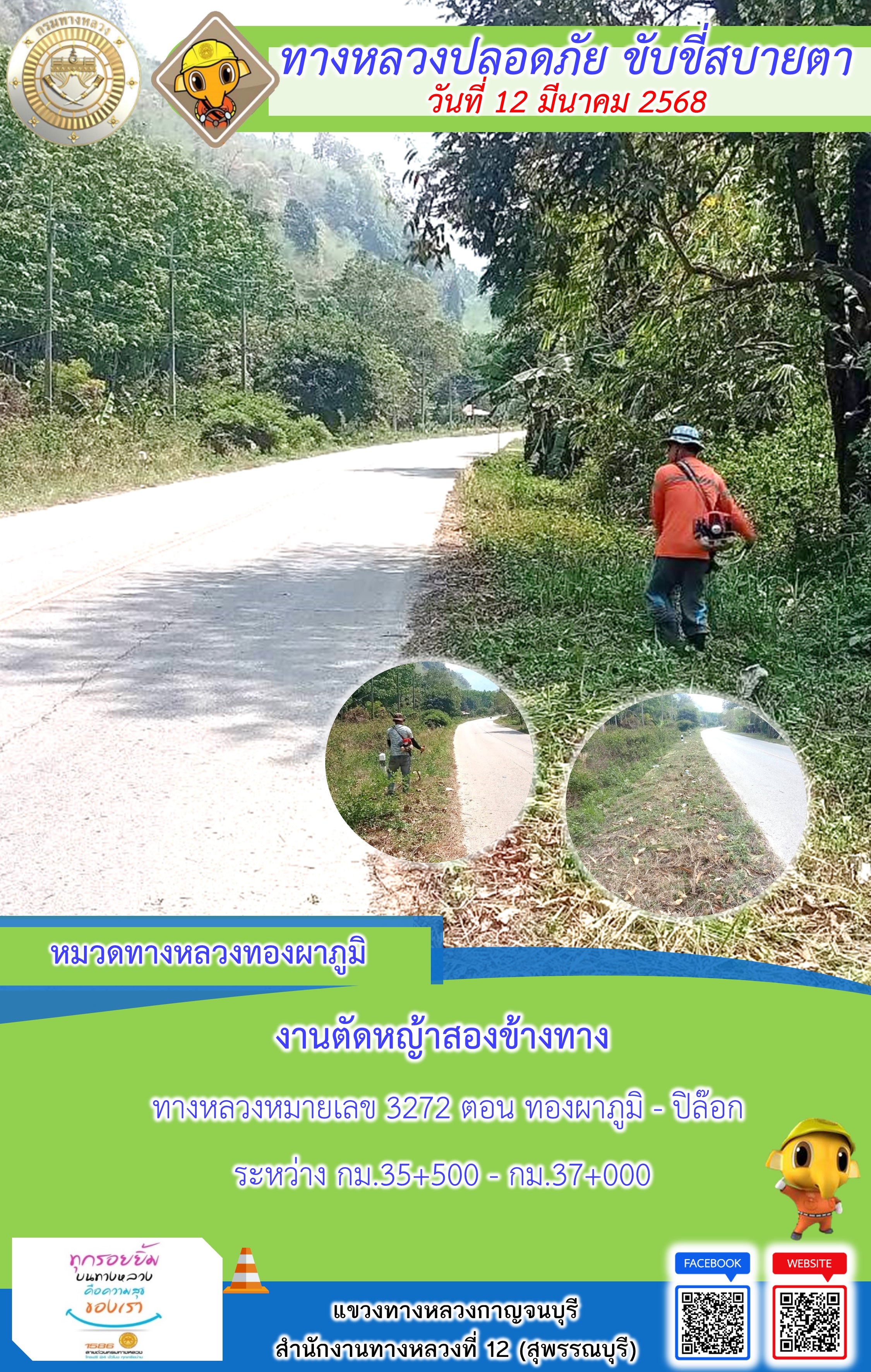 แขวงทางหลวงกาญจนบุรี โดยหมวดทางหลวงในสังกัด และงานอำนวยความปลอดภัยปฏิบัติงาน ประจำวันที่ 12 มี.ค. 68