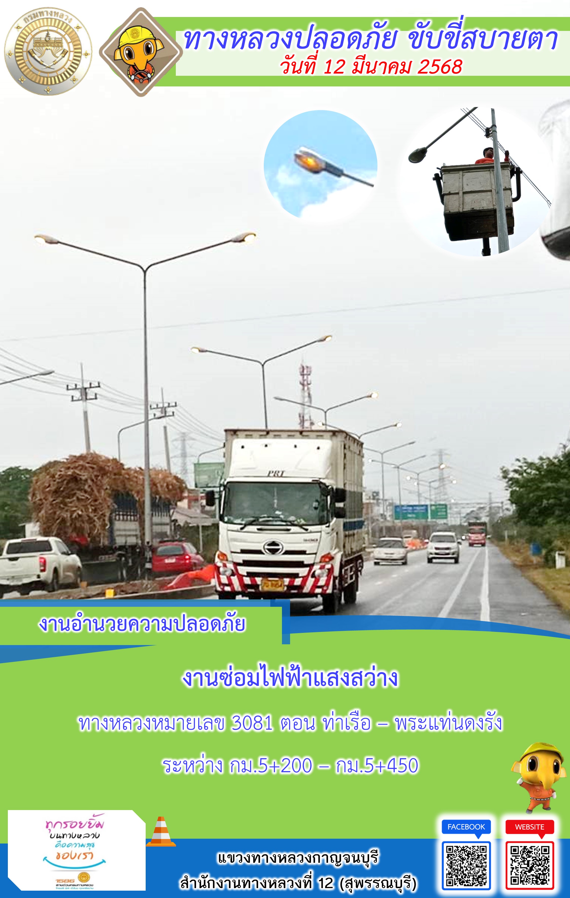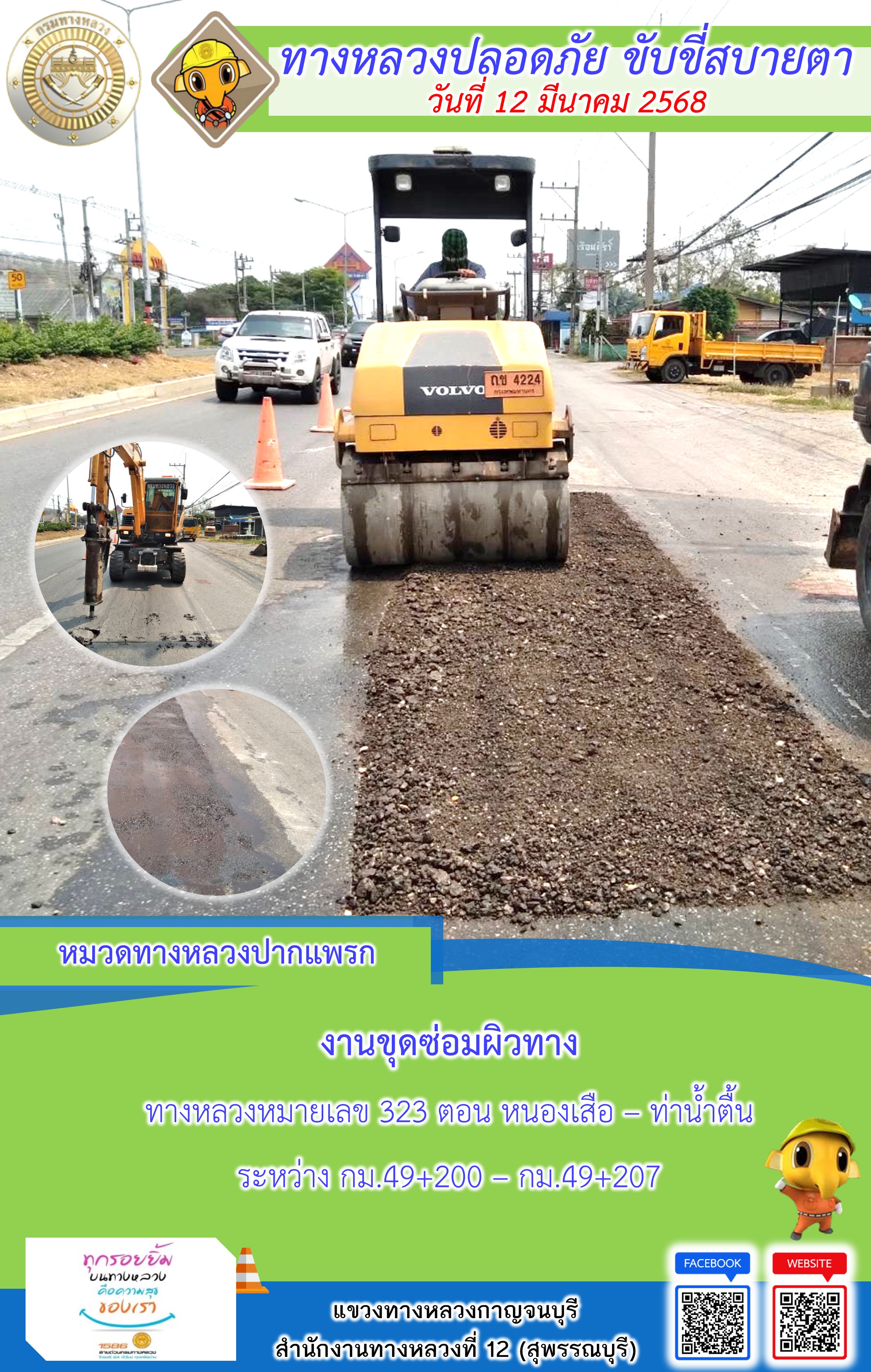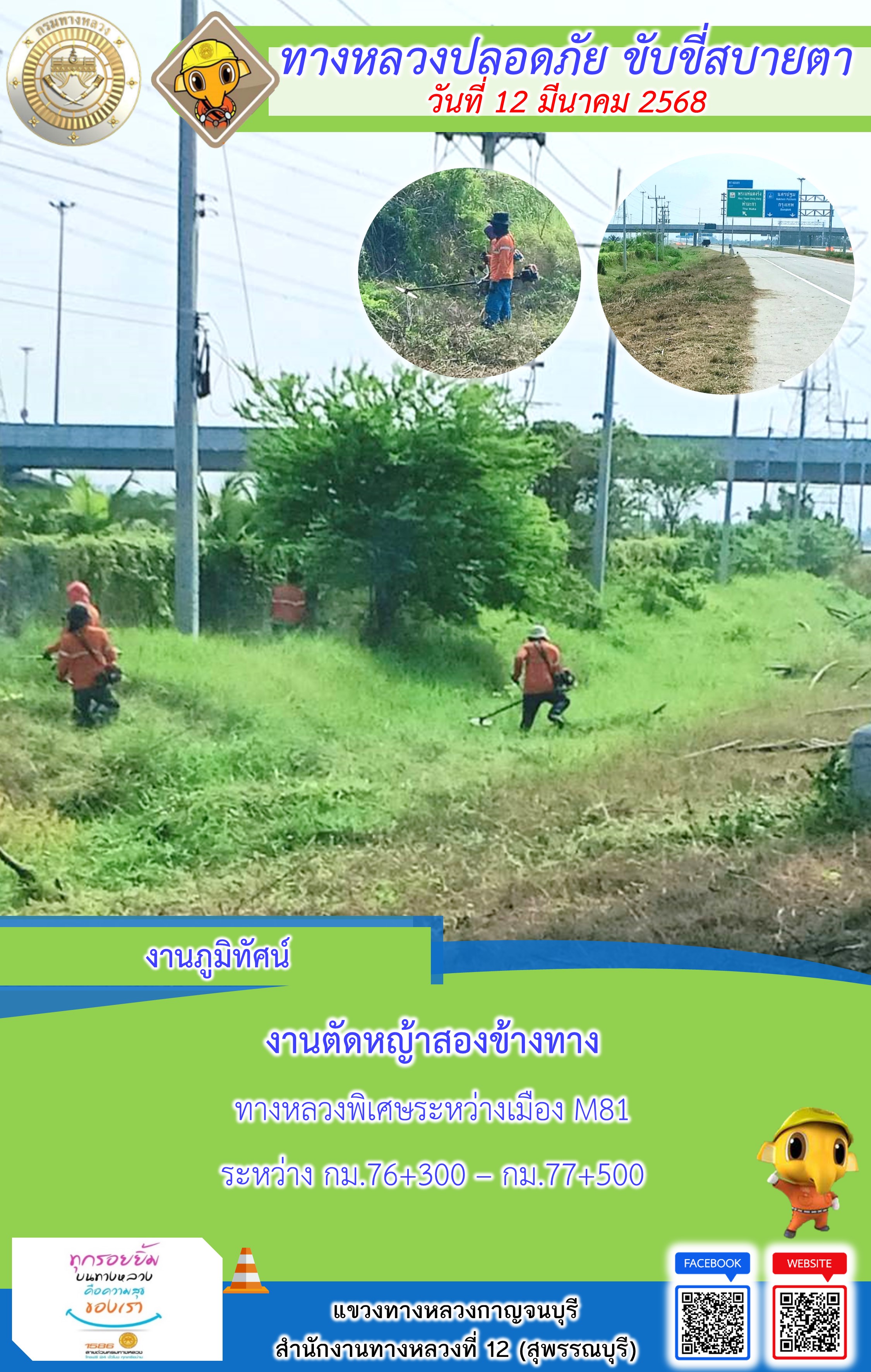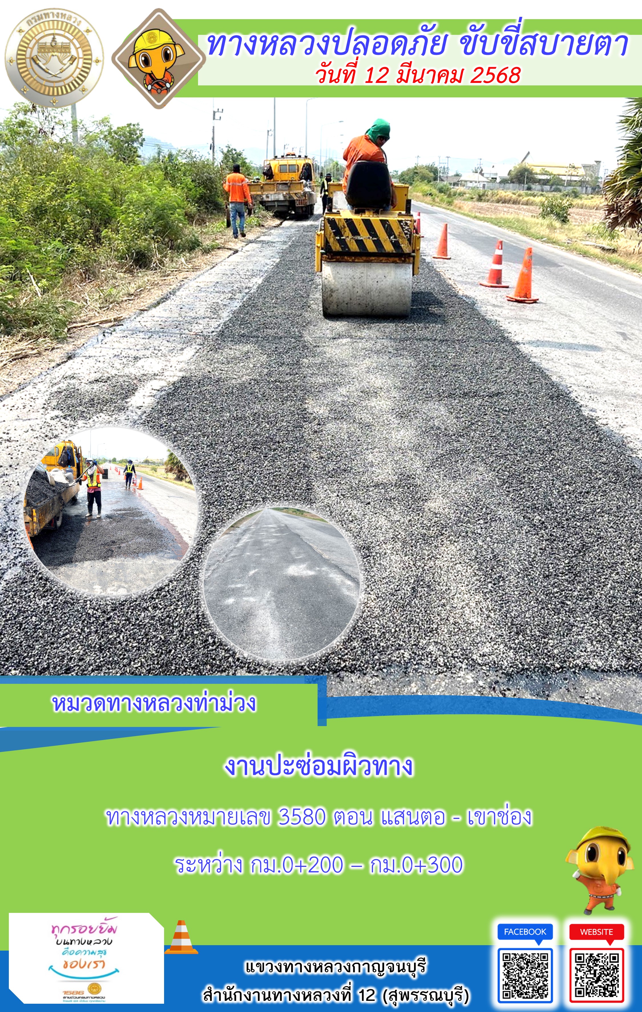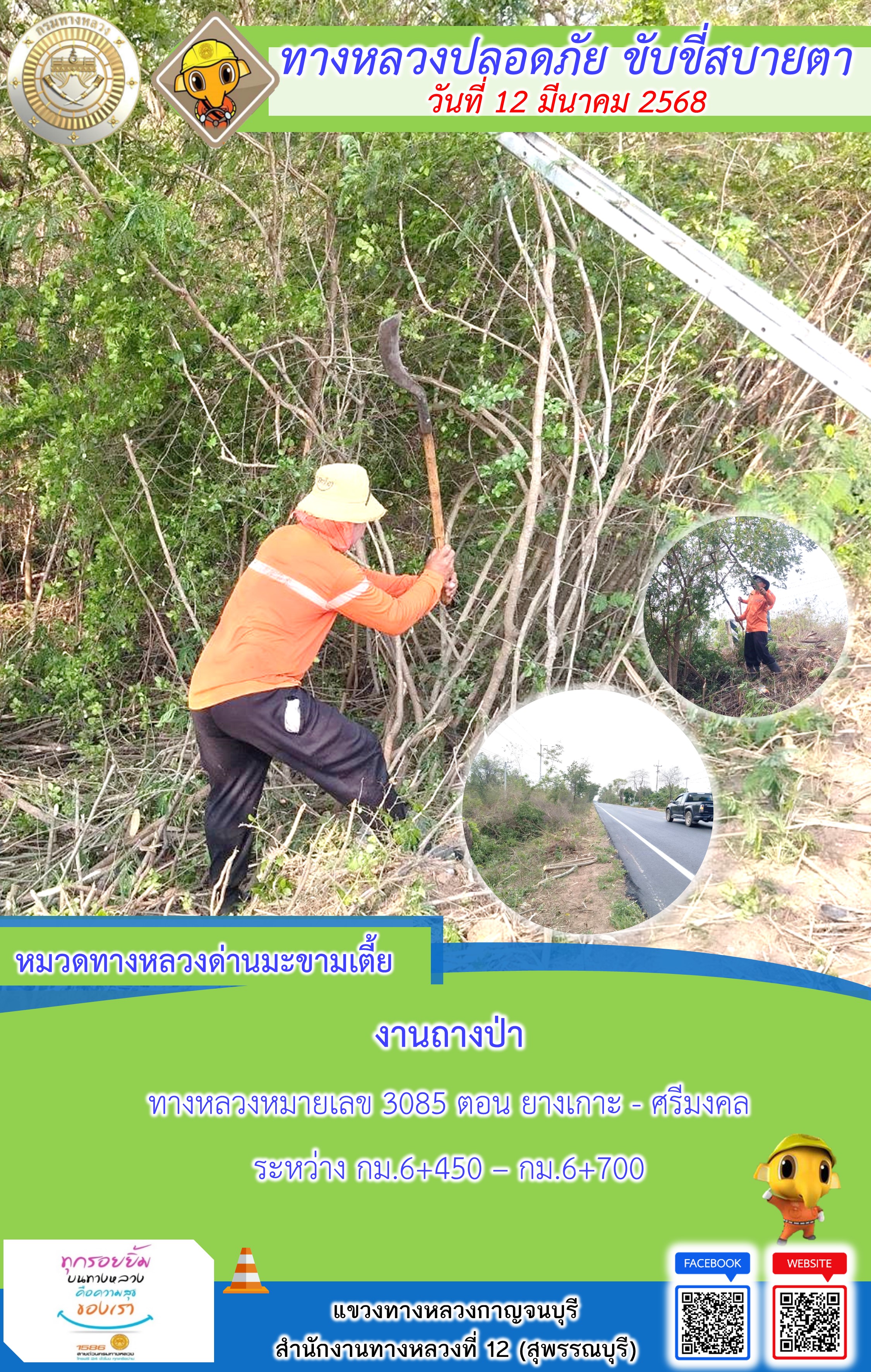 แขวงทางหลวงกาญจนบุรี โดยหมวดทางหลวงในสังกัด และงานอำนวยความปลอดภัยปฏิบัติงาน ประจำวันที่ 12 มี.ค. 68