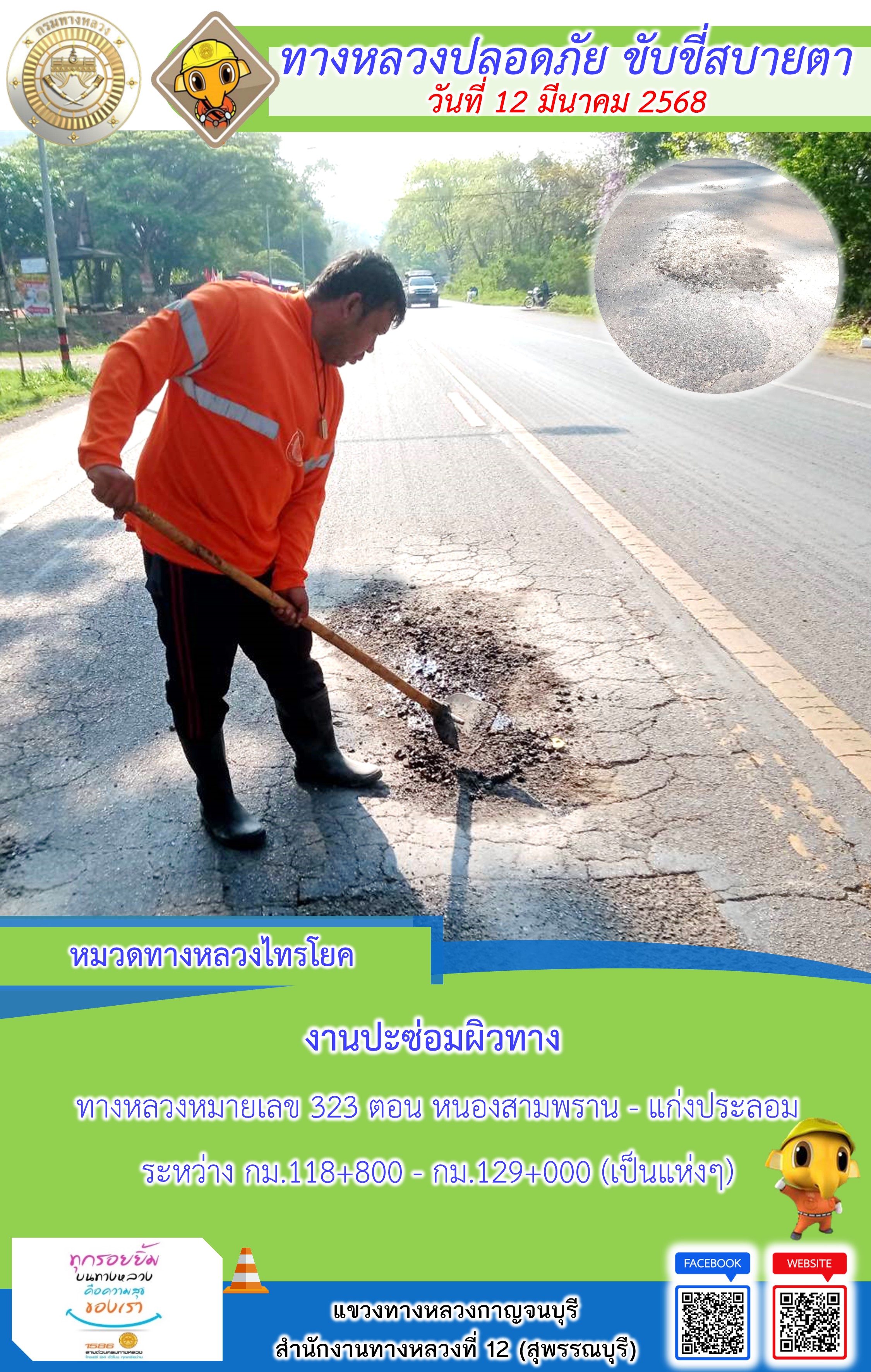 ข้อมูลภาพกิจกรรม : แขวงทางหลวงกาญจนบุรี โดยหมวดทางหลวงในสังกัด และงานอำนวยความปลอดภัยปฏิบัติงาน ประจำวันที่ 12 มี.ค. 68