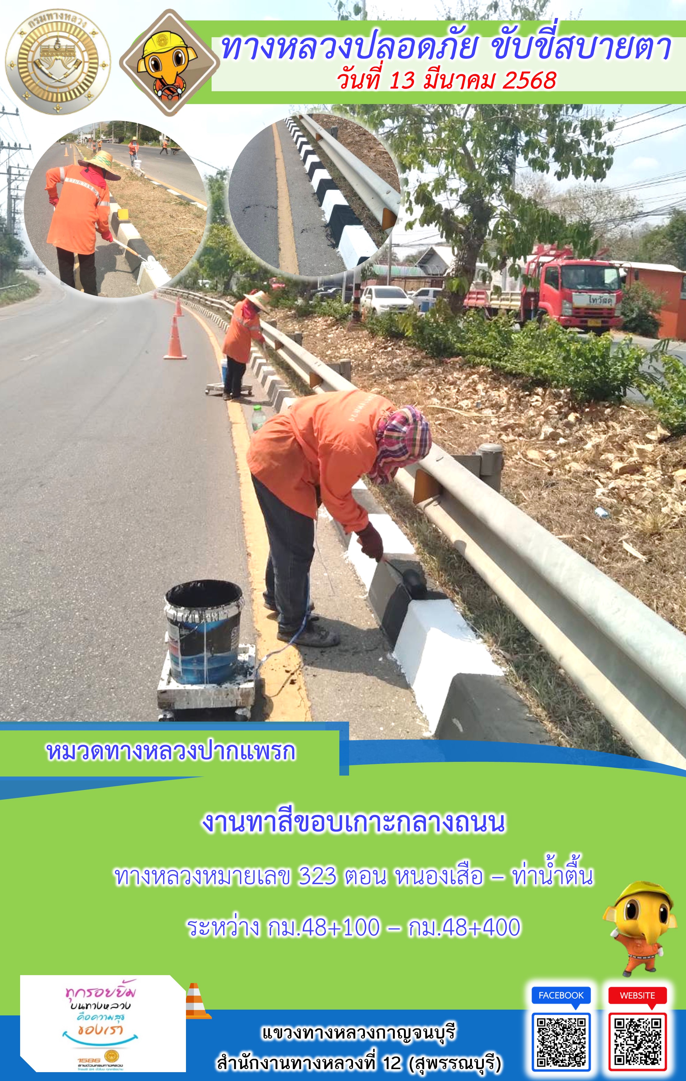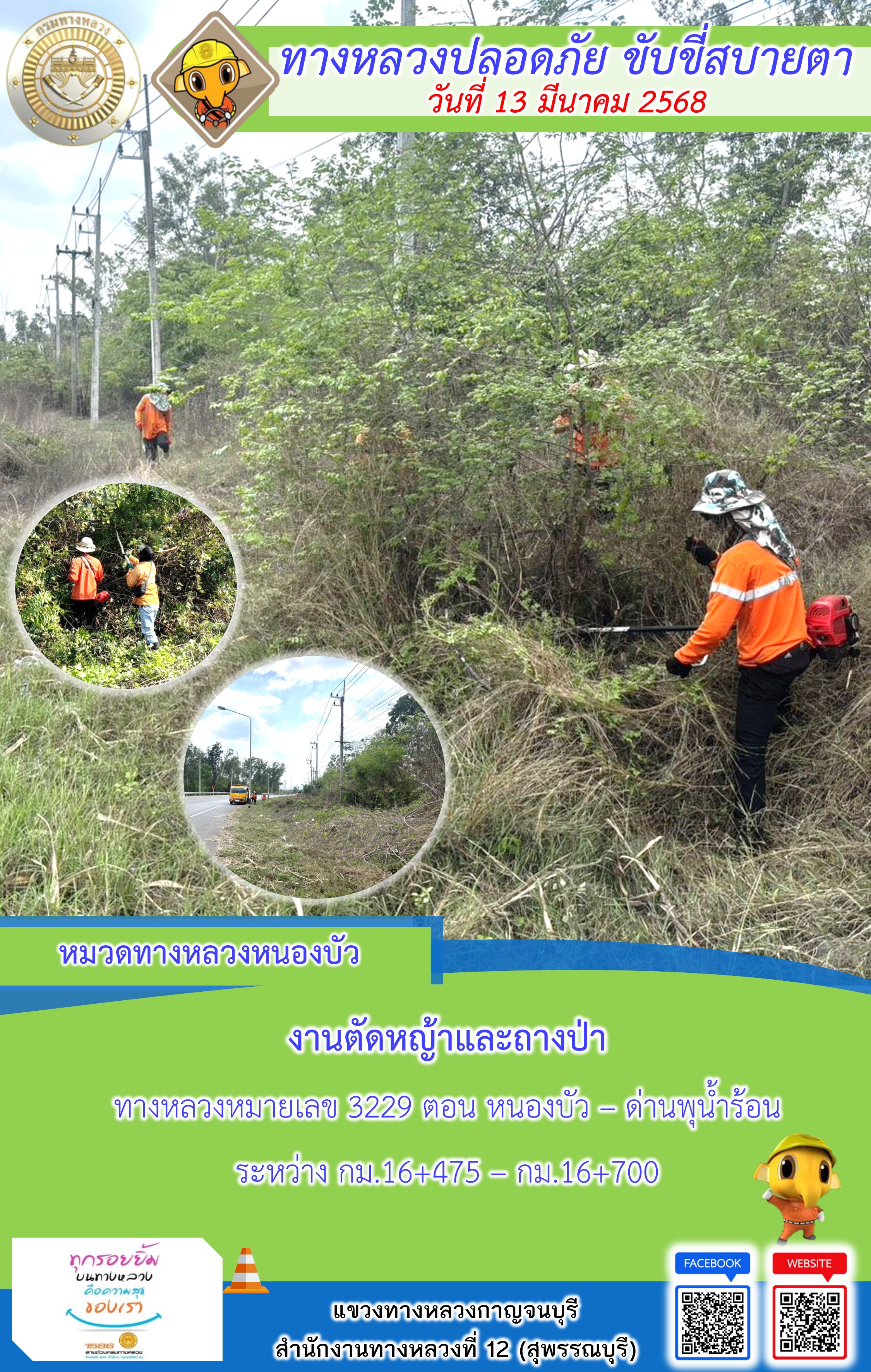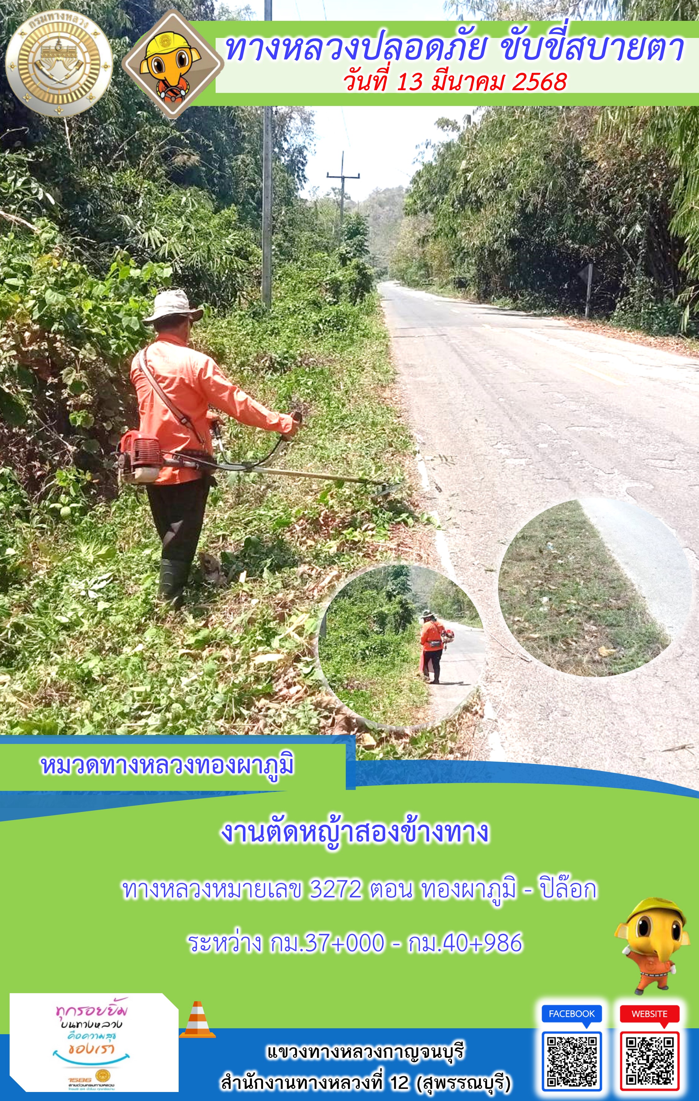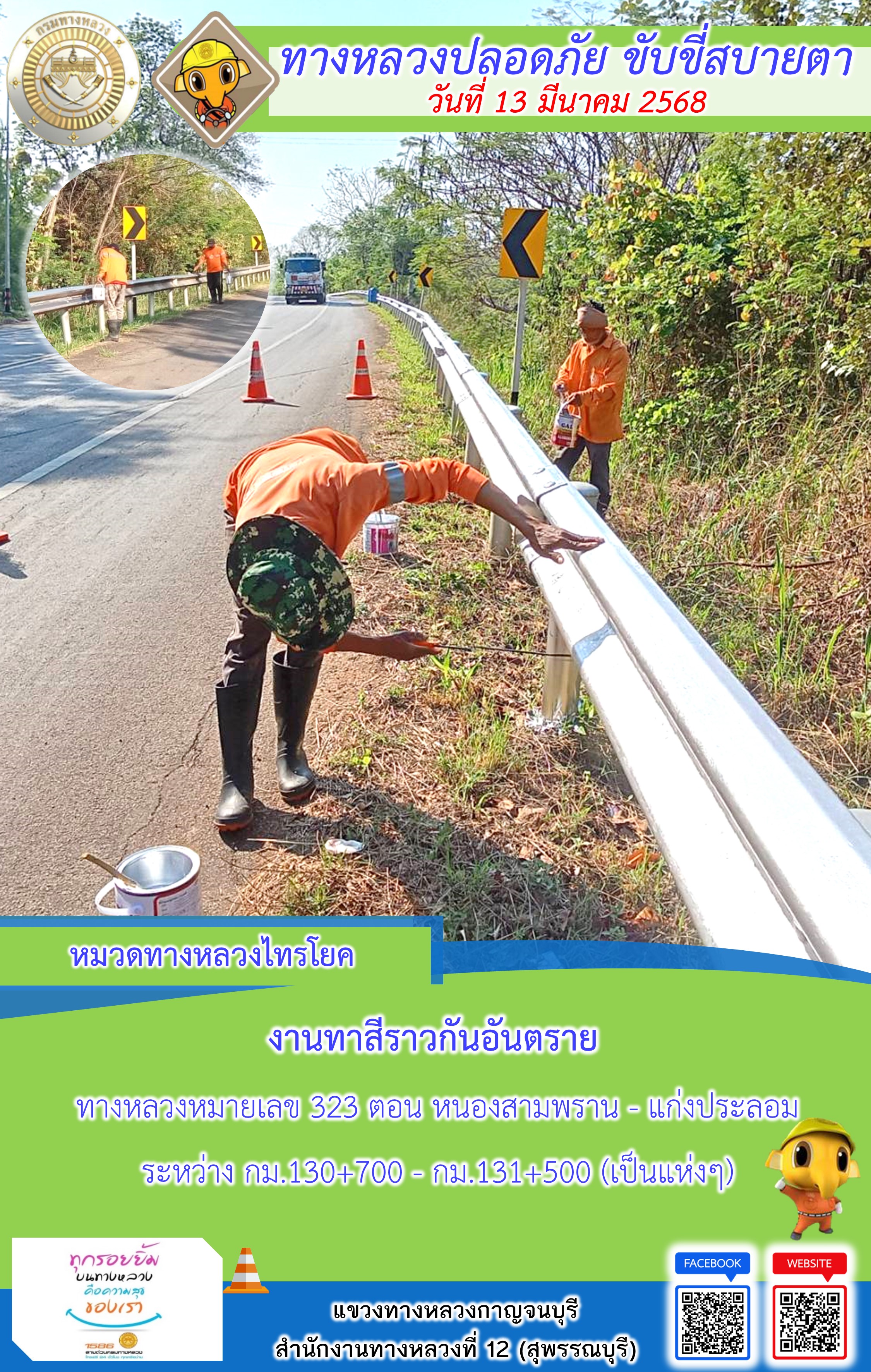 ข้อมูลภาพกิจกรรม : แขวงทางหลวงกาญจนบุรี โดยหมวดทางหลวงในสังกัด และงานอำนวยความปลอดภัยปฏิบัติงาน ประจำวันที่ 13 มี.ค. 68