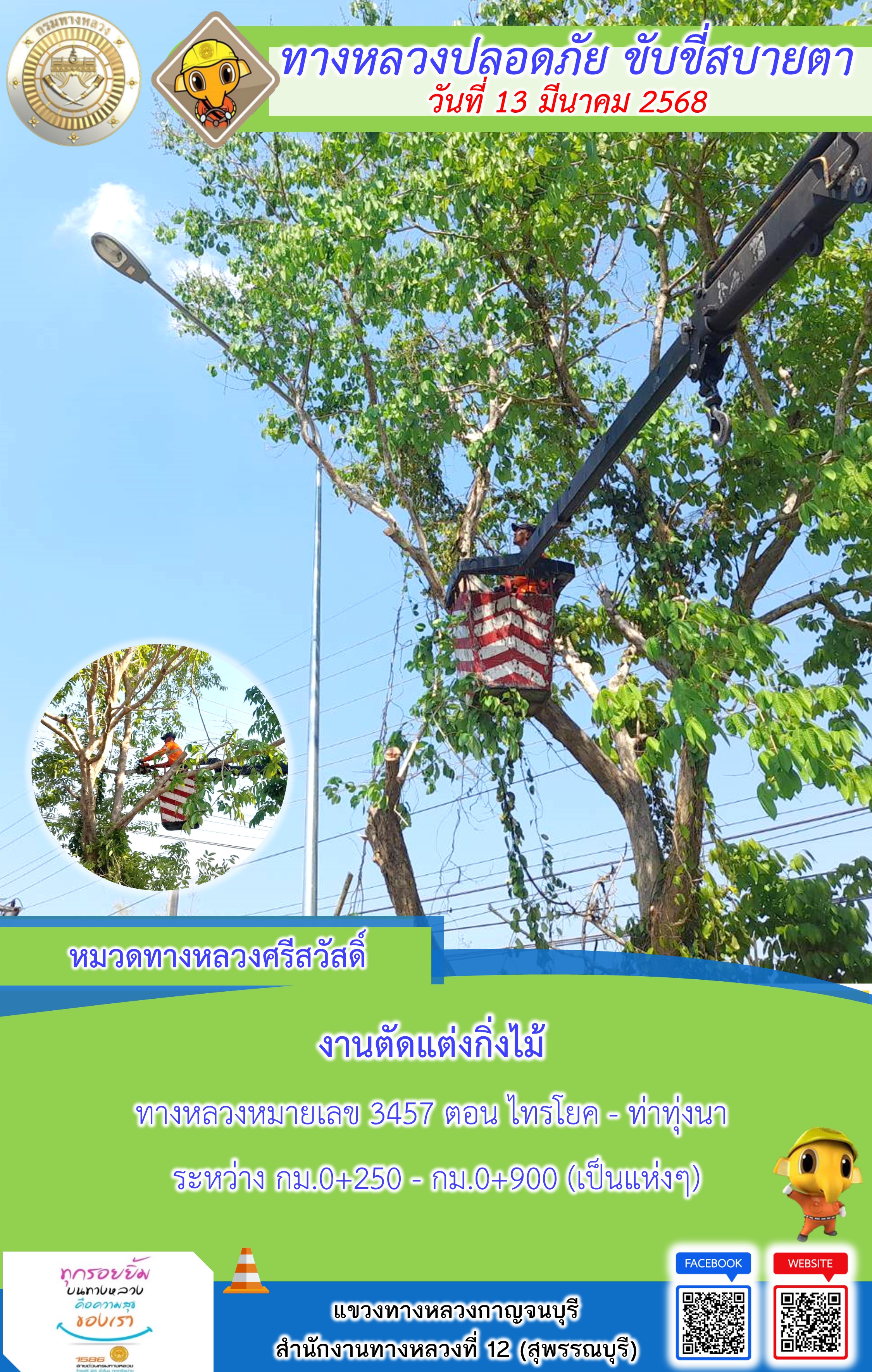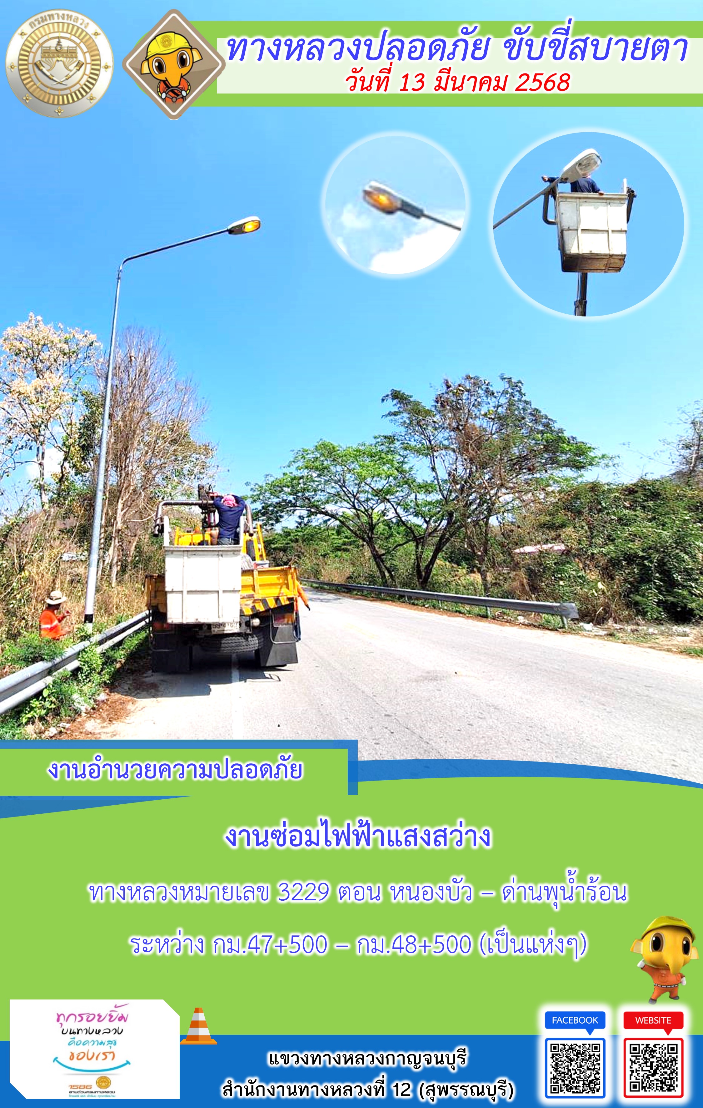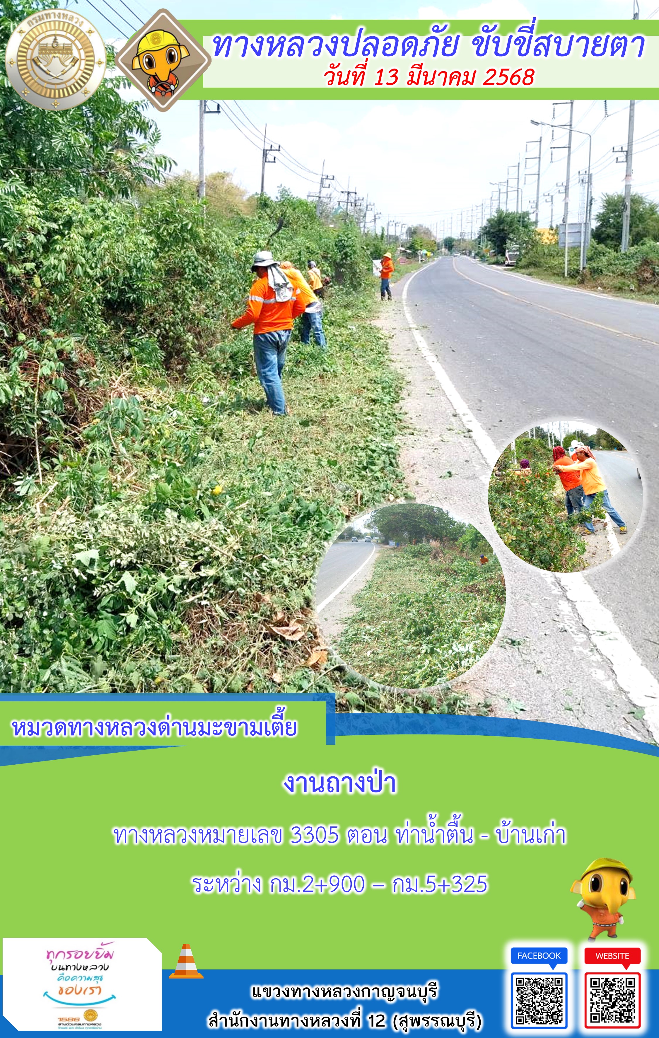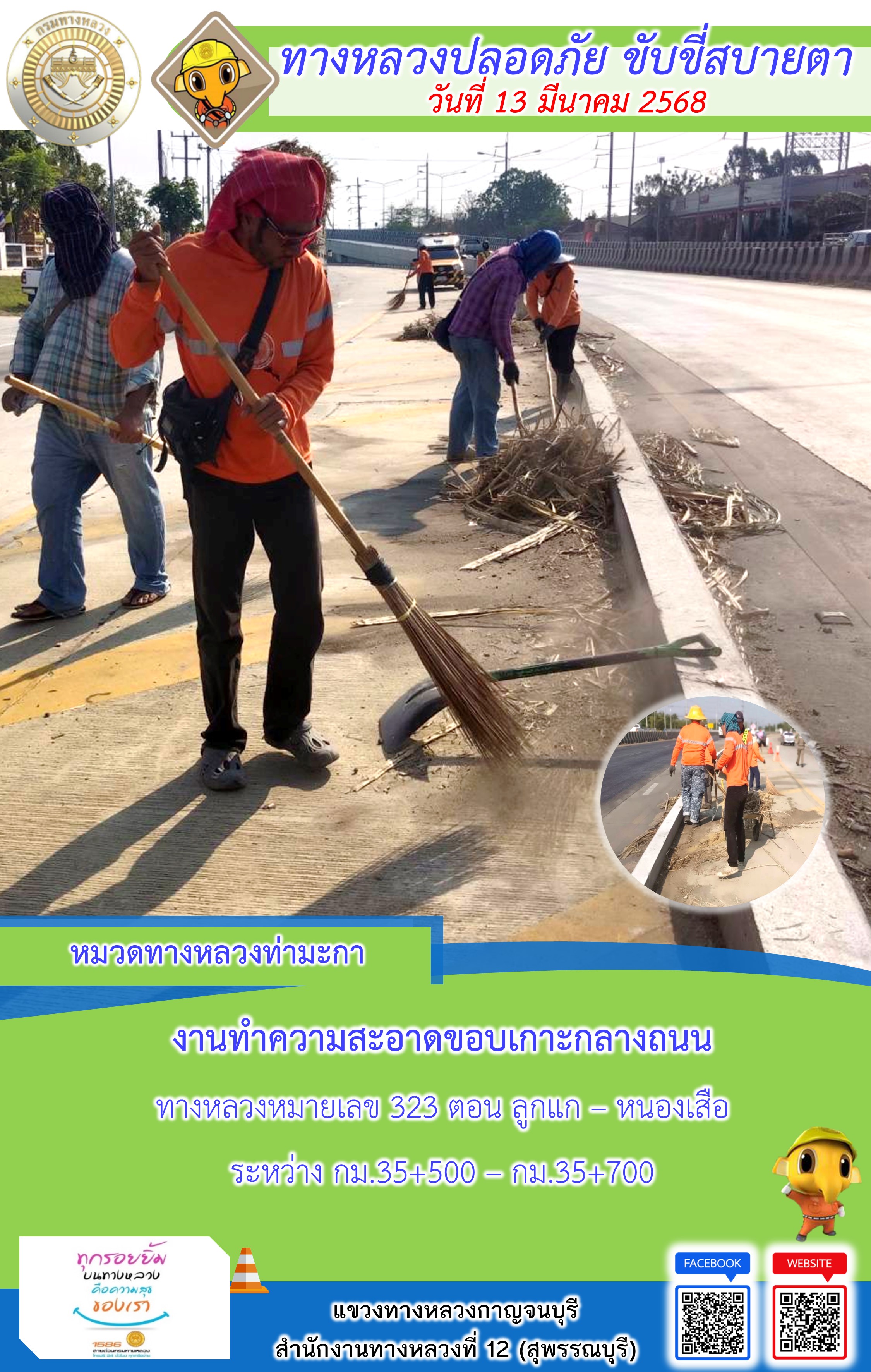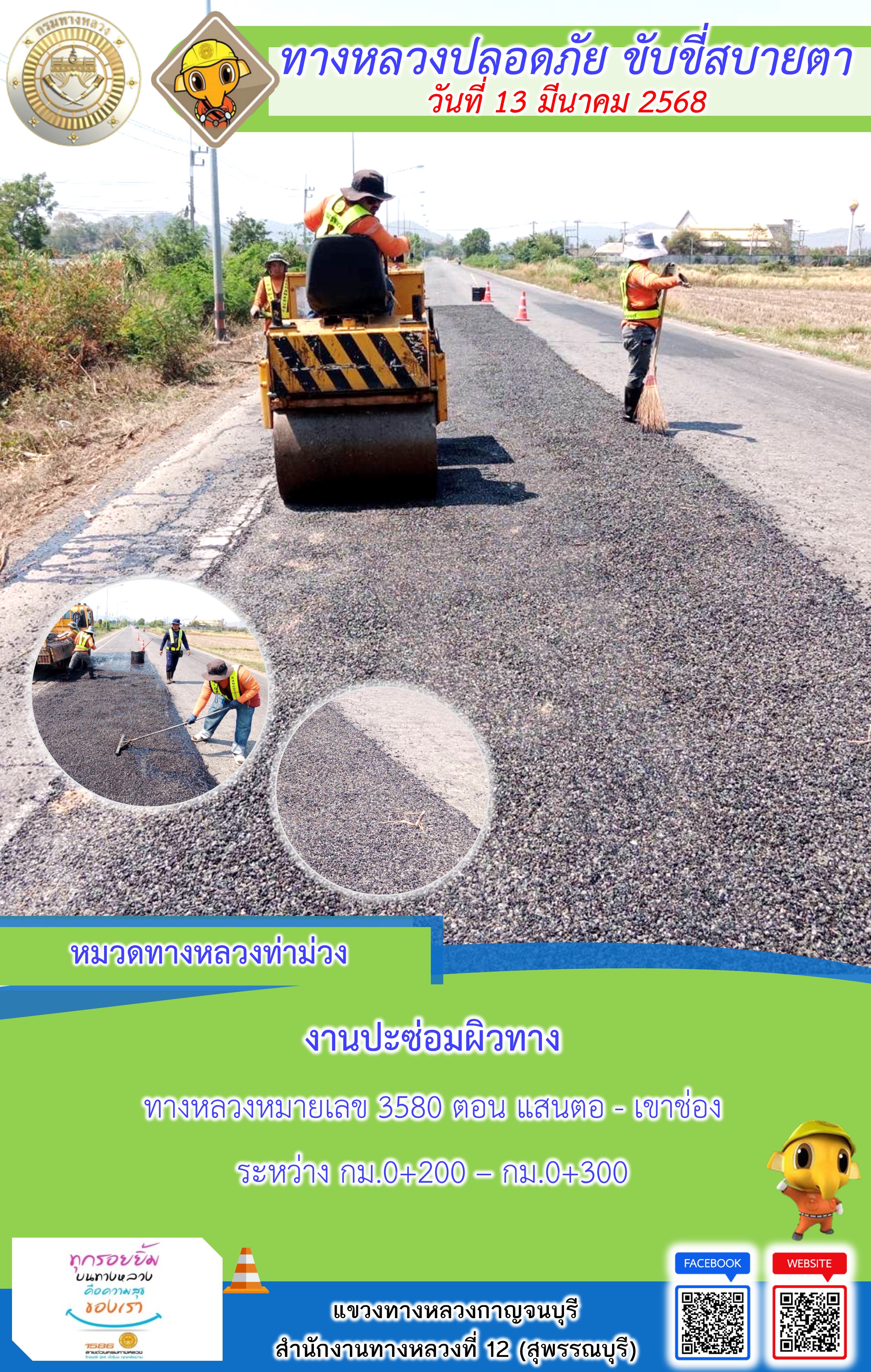 ข้อมูลภาพกิจกรรม : แขวงทางหลวงกาญจนบุรี โดยหมวดทางหลวงในสังกัด และงานอำนวยความปลอดภัยปฏิบัติงาน ประจำวันที่ 13 มี.ค. 68