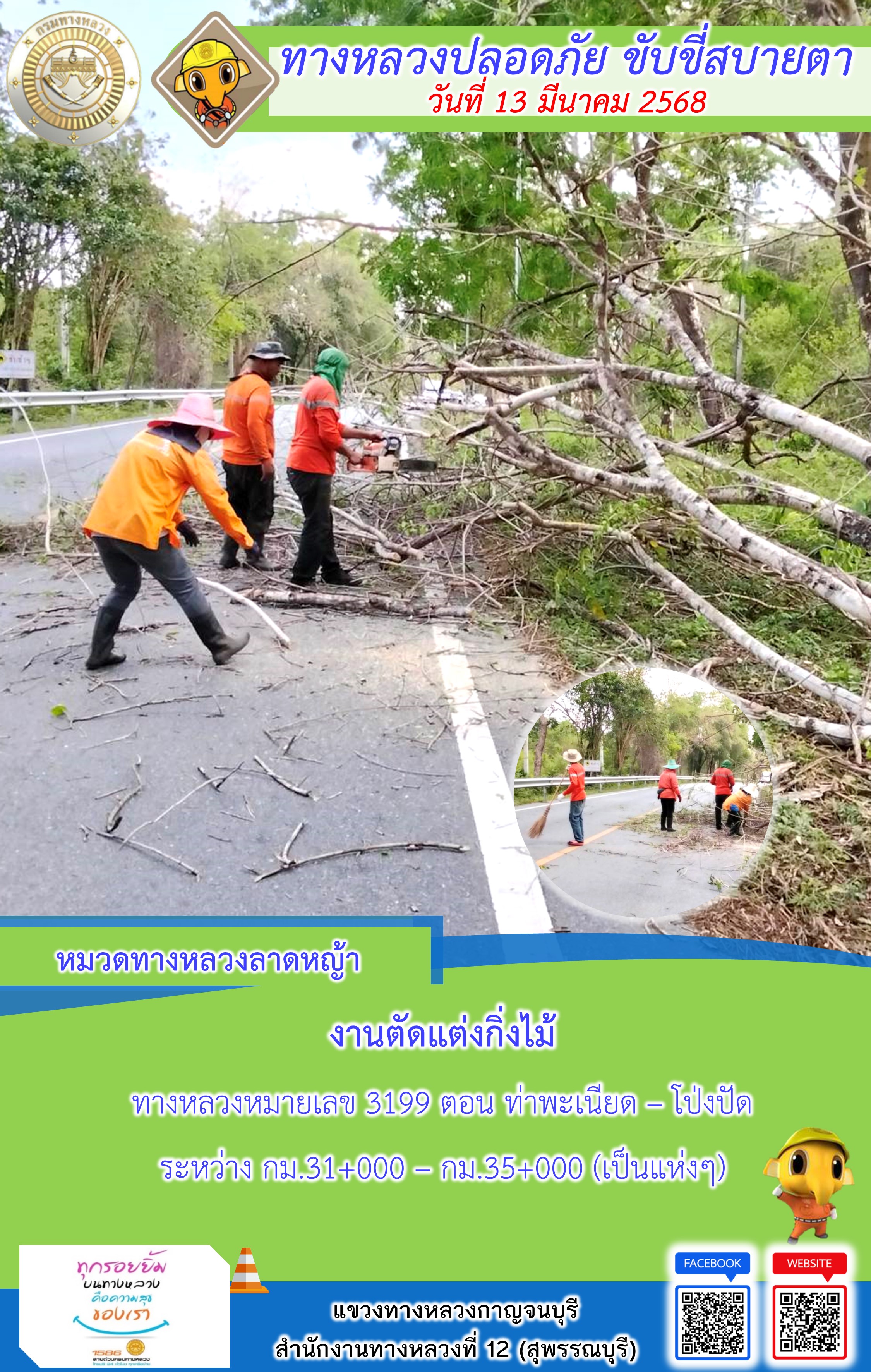แขวงทางหลวงกาญจนบุรี โดยหมวดทางหลวงในสังกัด และงานอำนวยความปลอดภัยปฏิบัติงาน ประจำวันที่ 13 มี.ค. 68