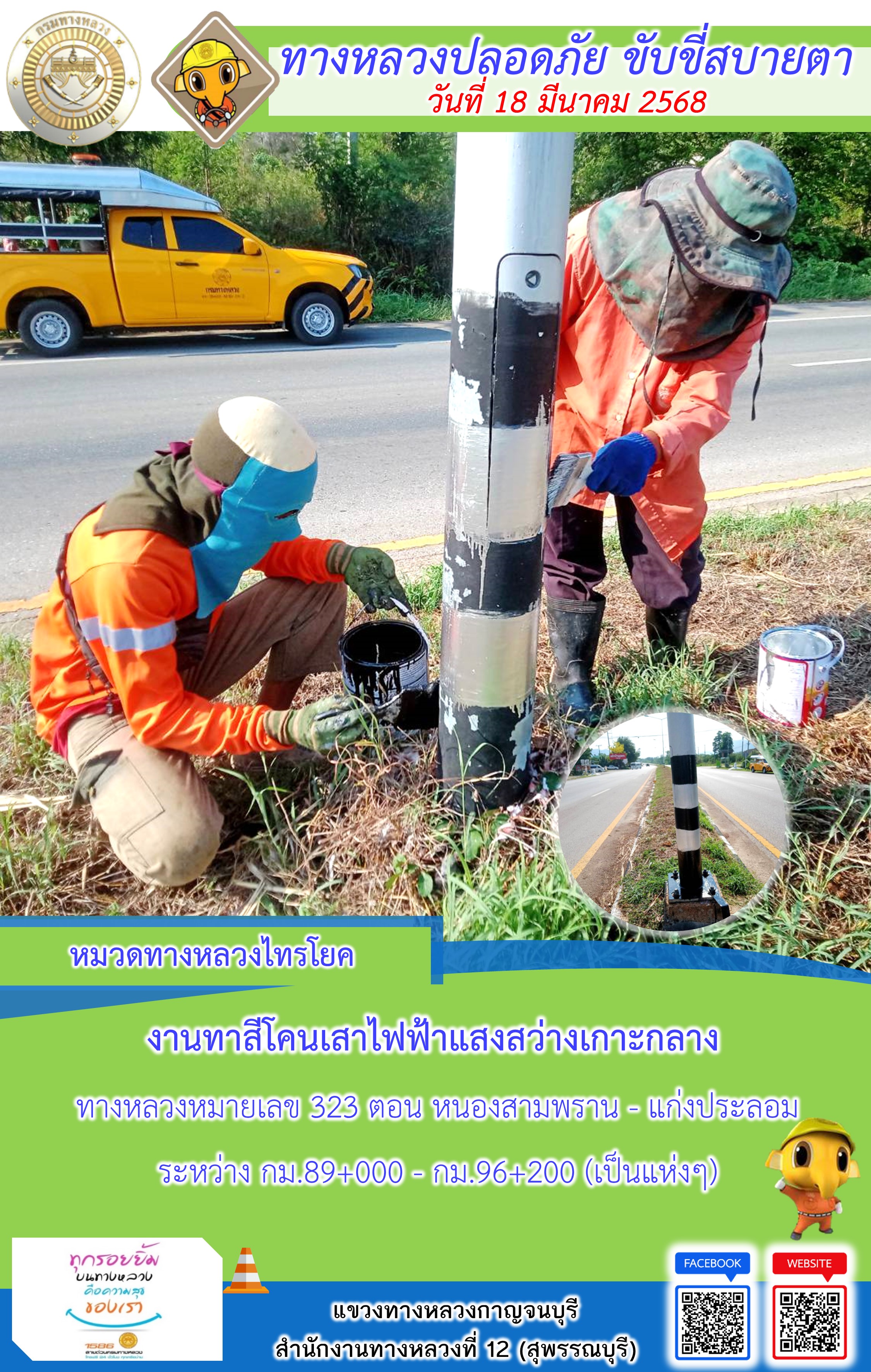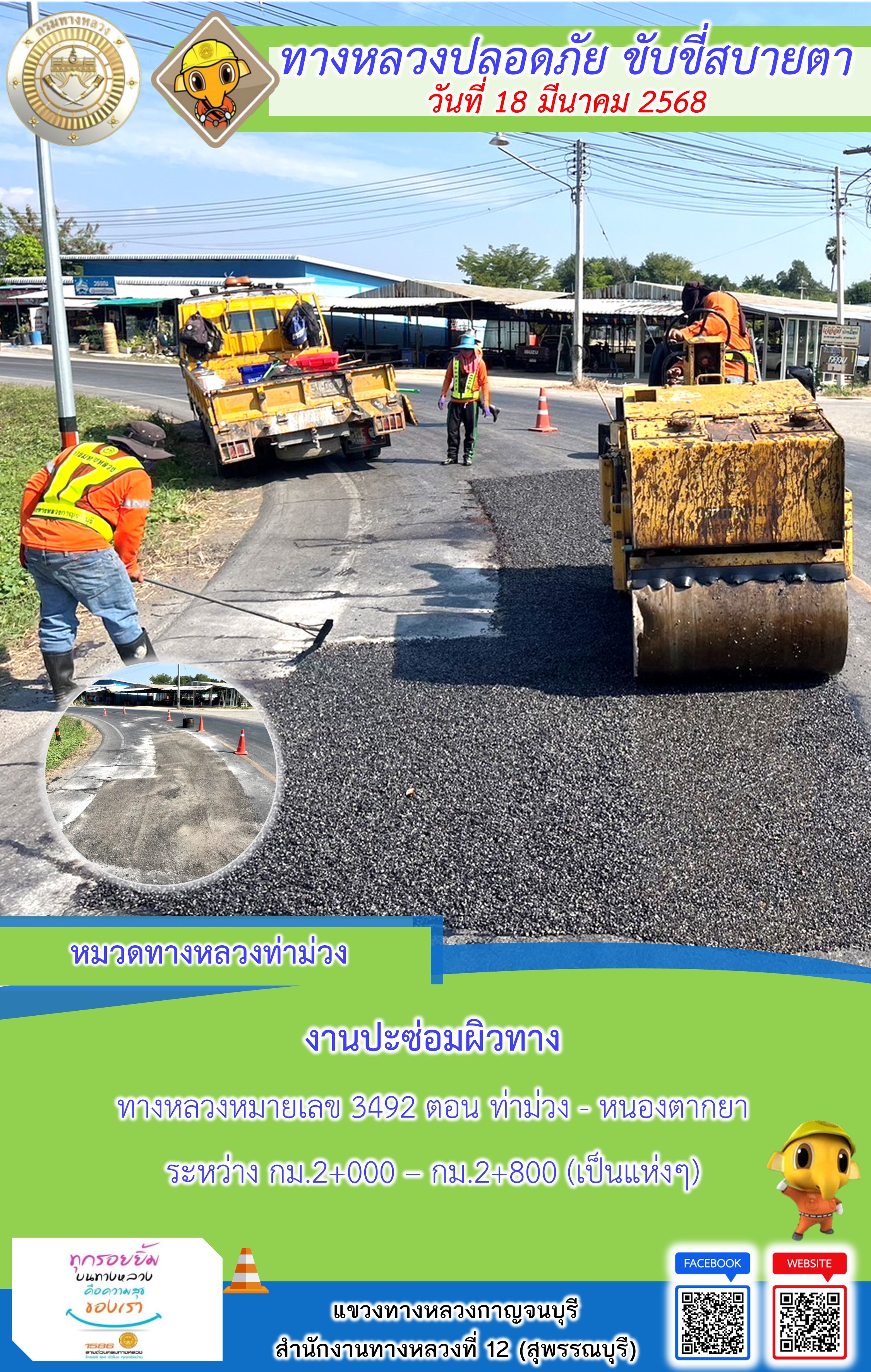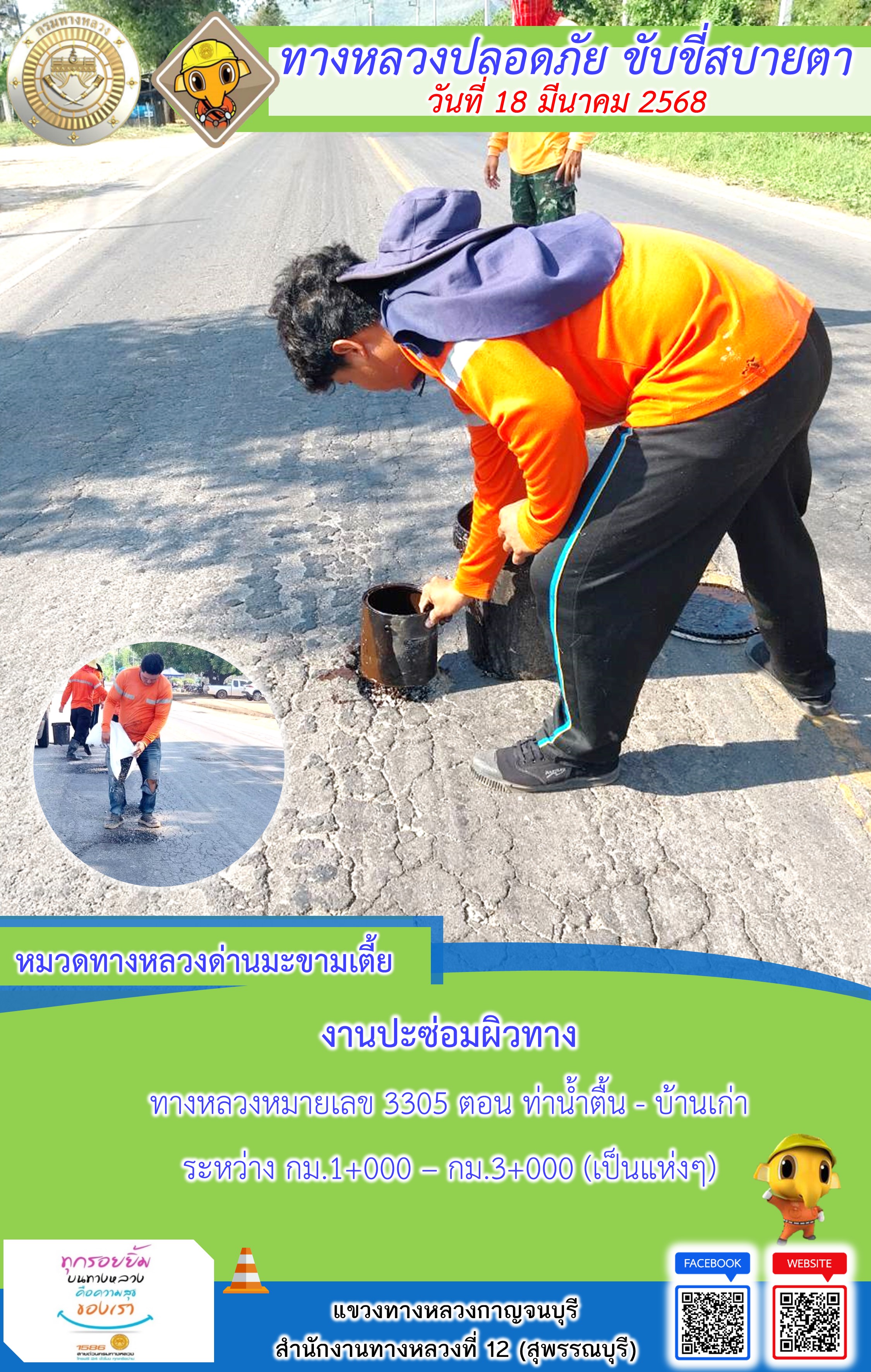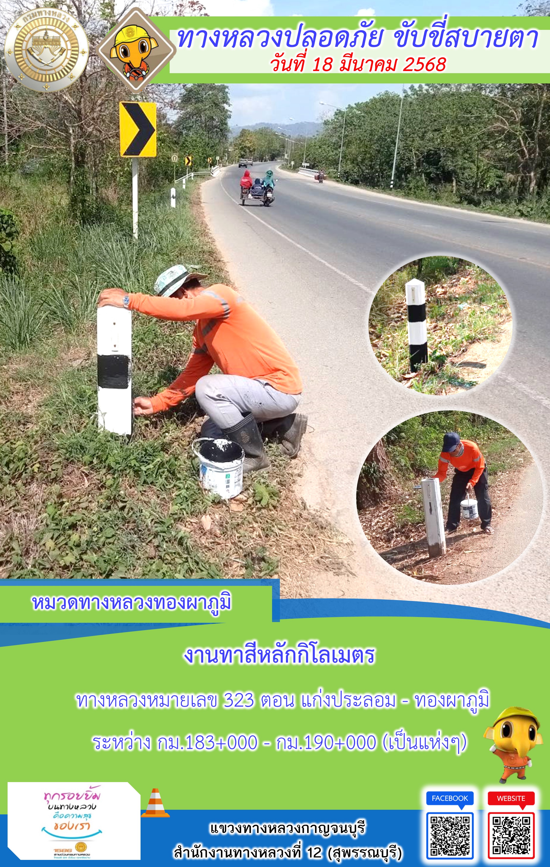 ข้อมูลภาพกิจกรรม : แขวงทางหลวงกาญจนบุรี โดยหมวดทางหลวงในสังกัด และงานอำนวยความปลอดภัยปฏิบัติงาน ประจำวันที่ 18 มี.ค. 68