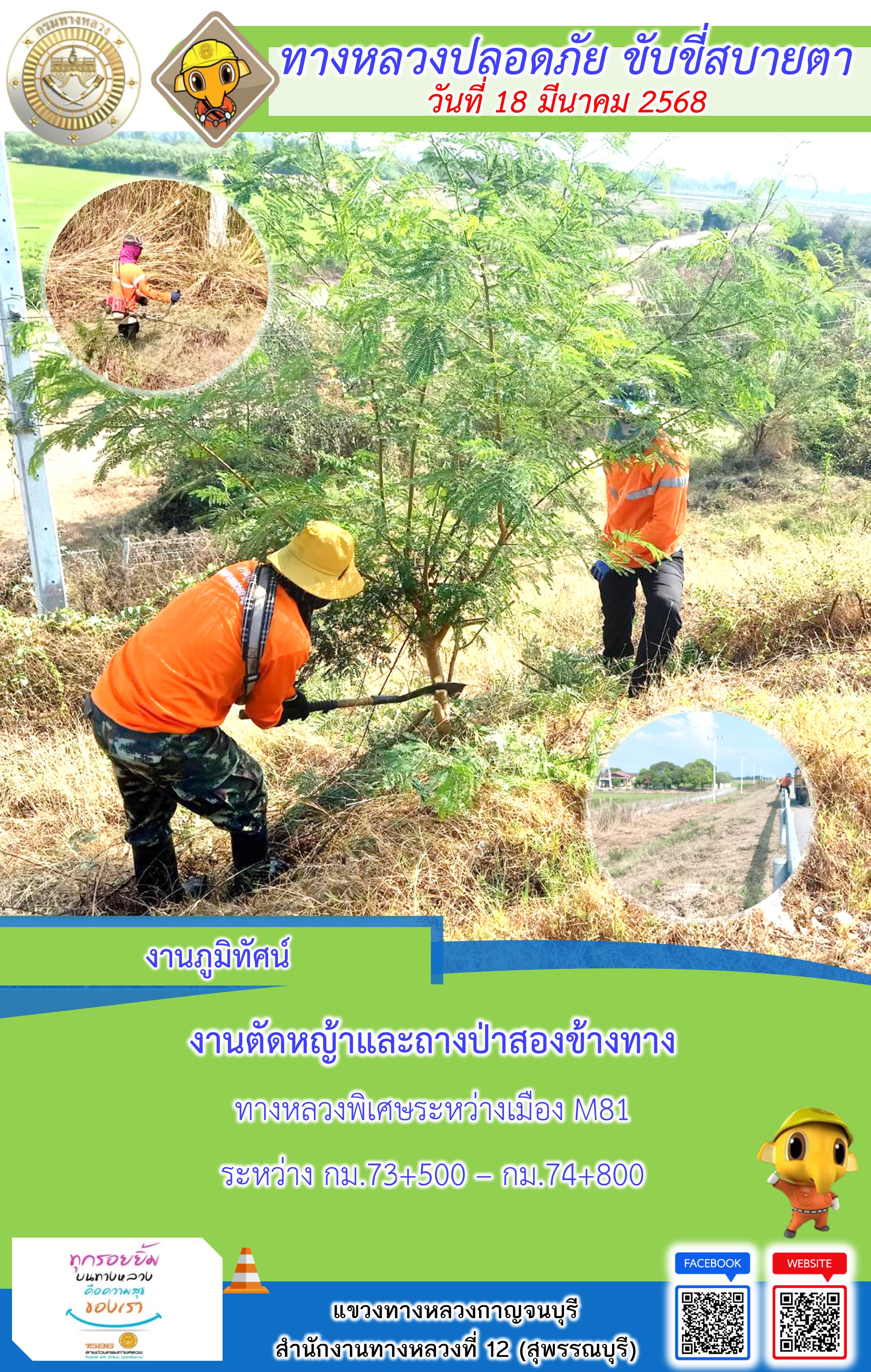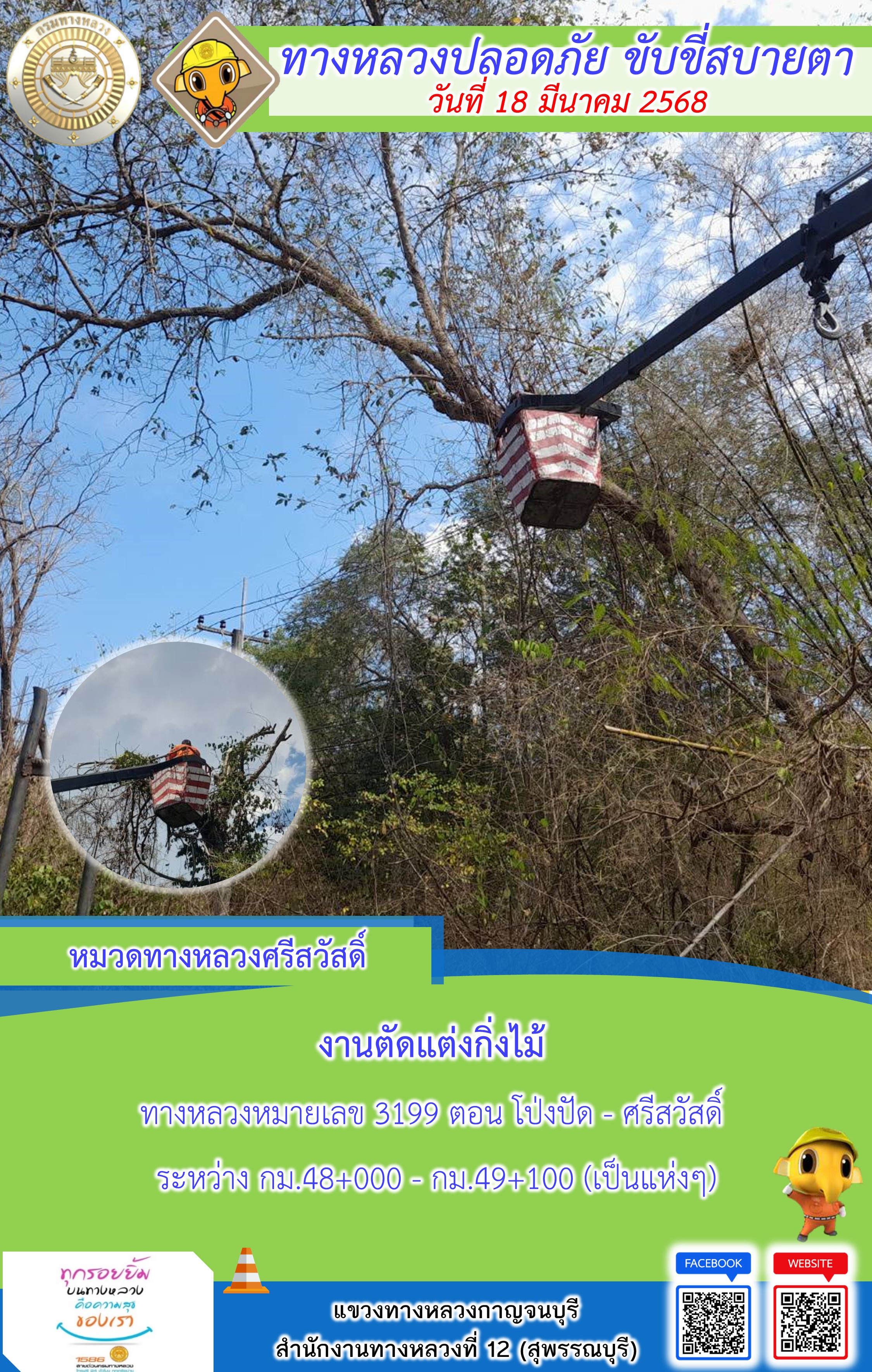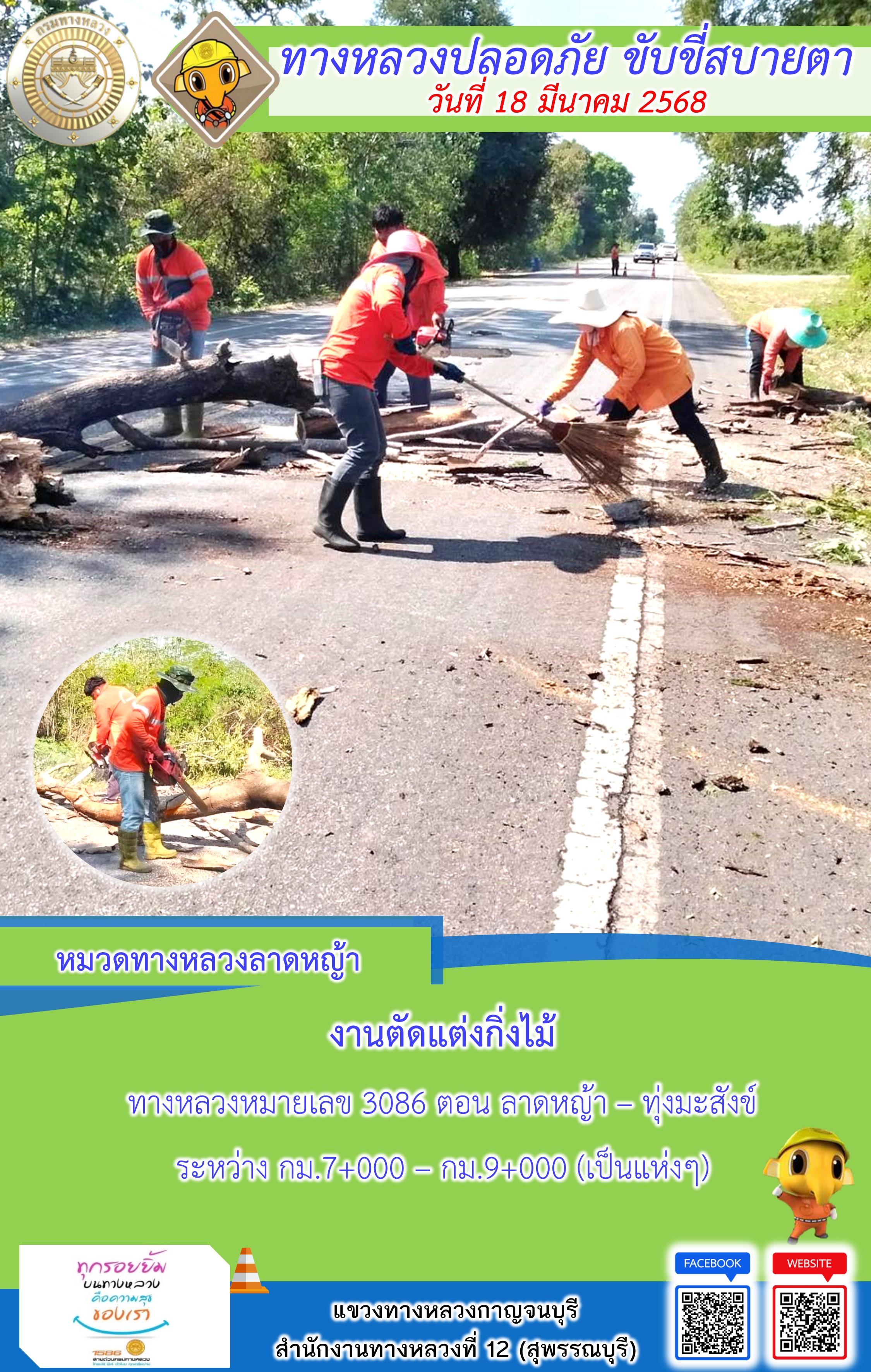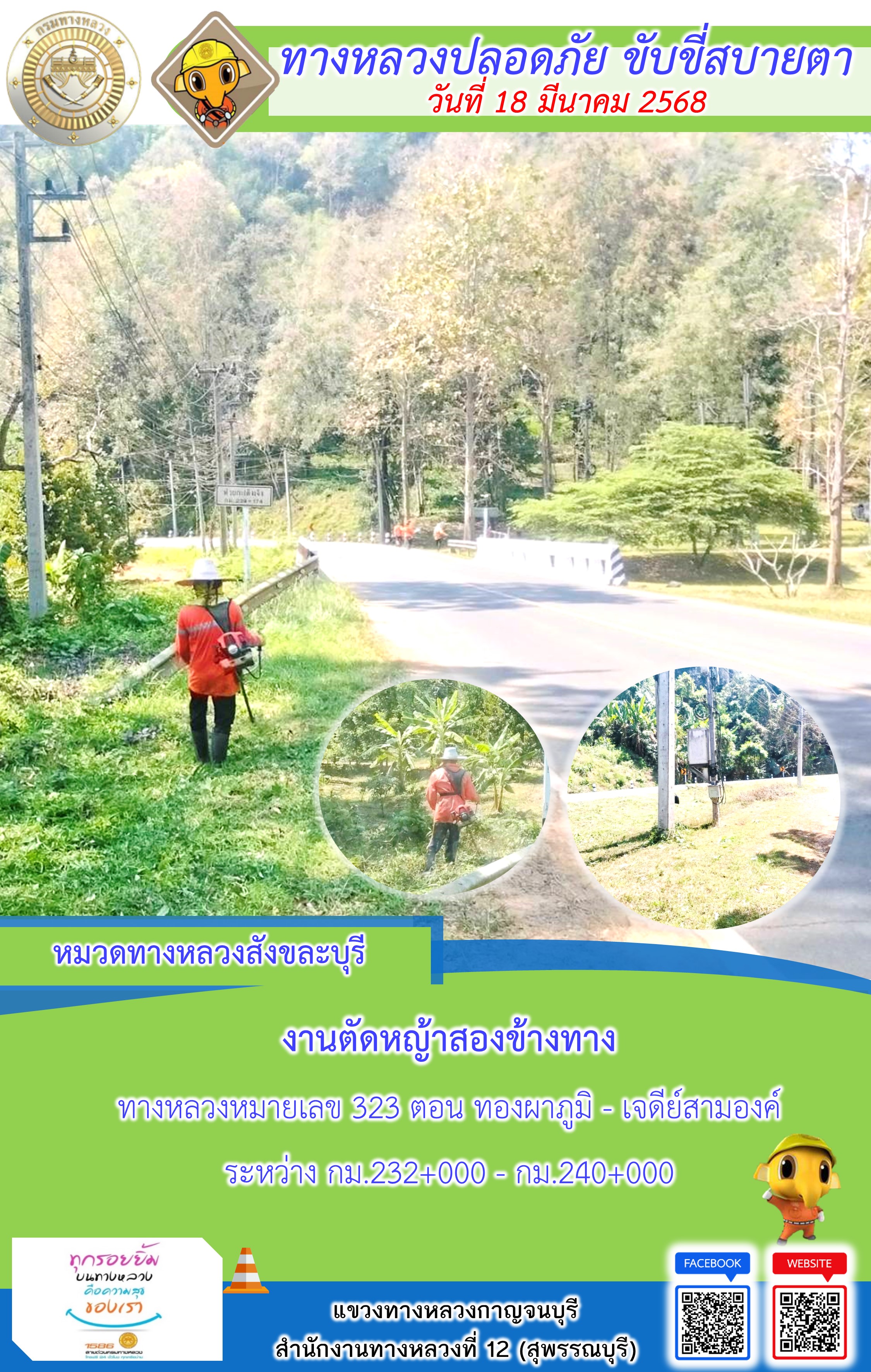 แขวงทางหลวงกาญจนบุรี โดยหมวดทางหลวงในสังกัด และงานอำนวยความปลอดภัยปฏิบัติงาน ประจำวันที่ 18 มี.ค. 68
