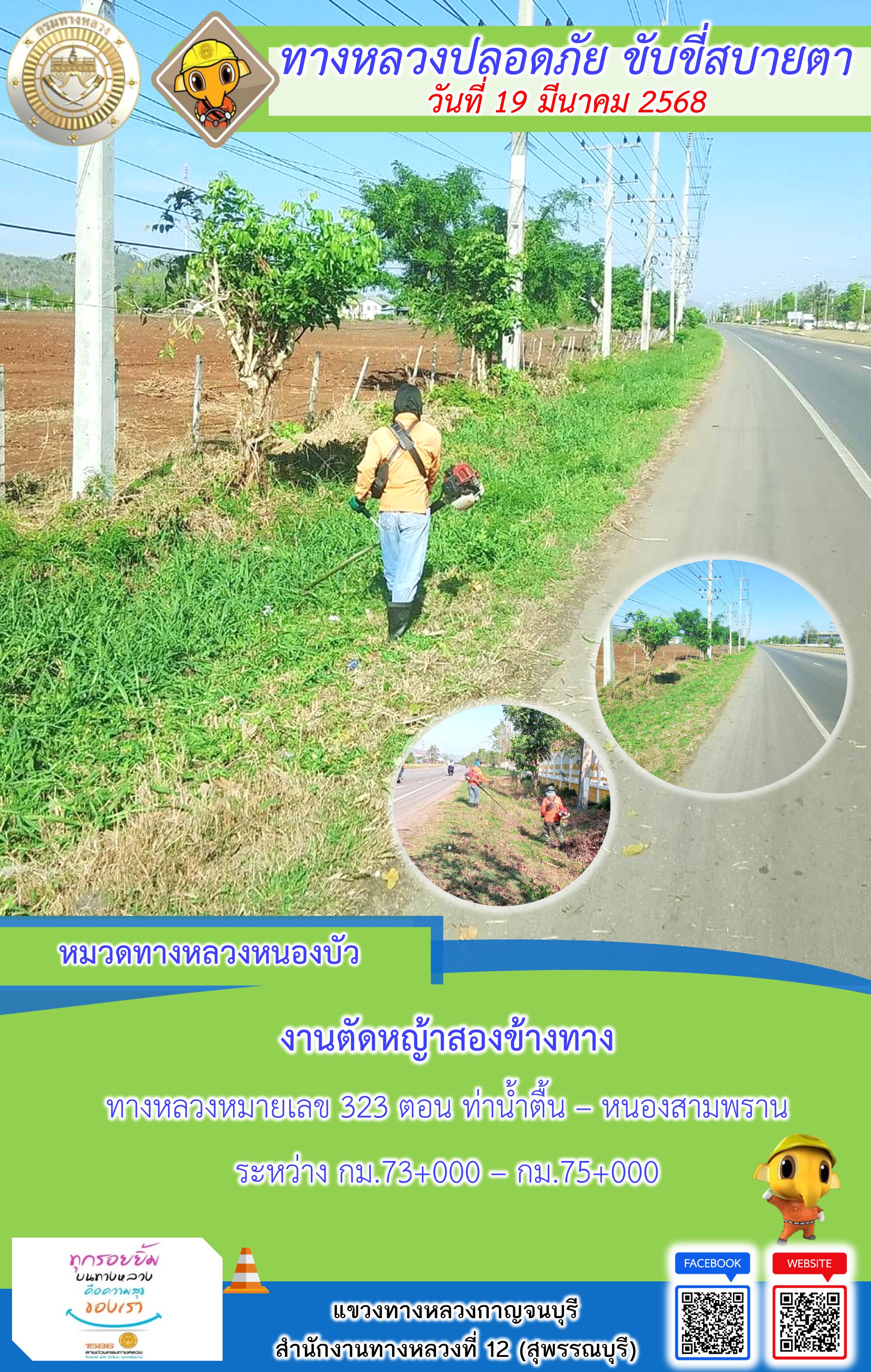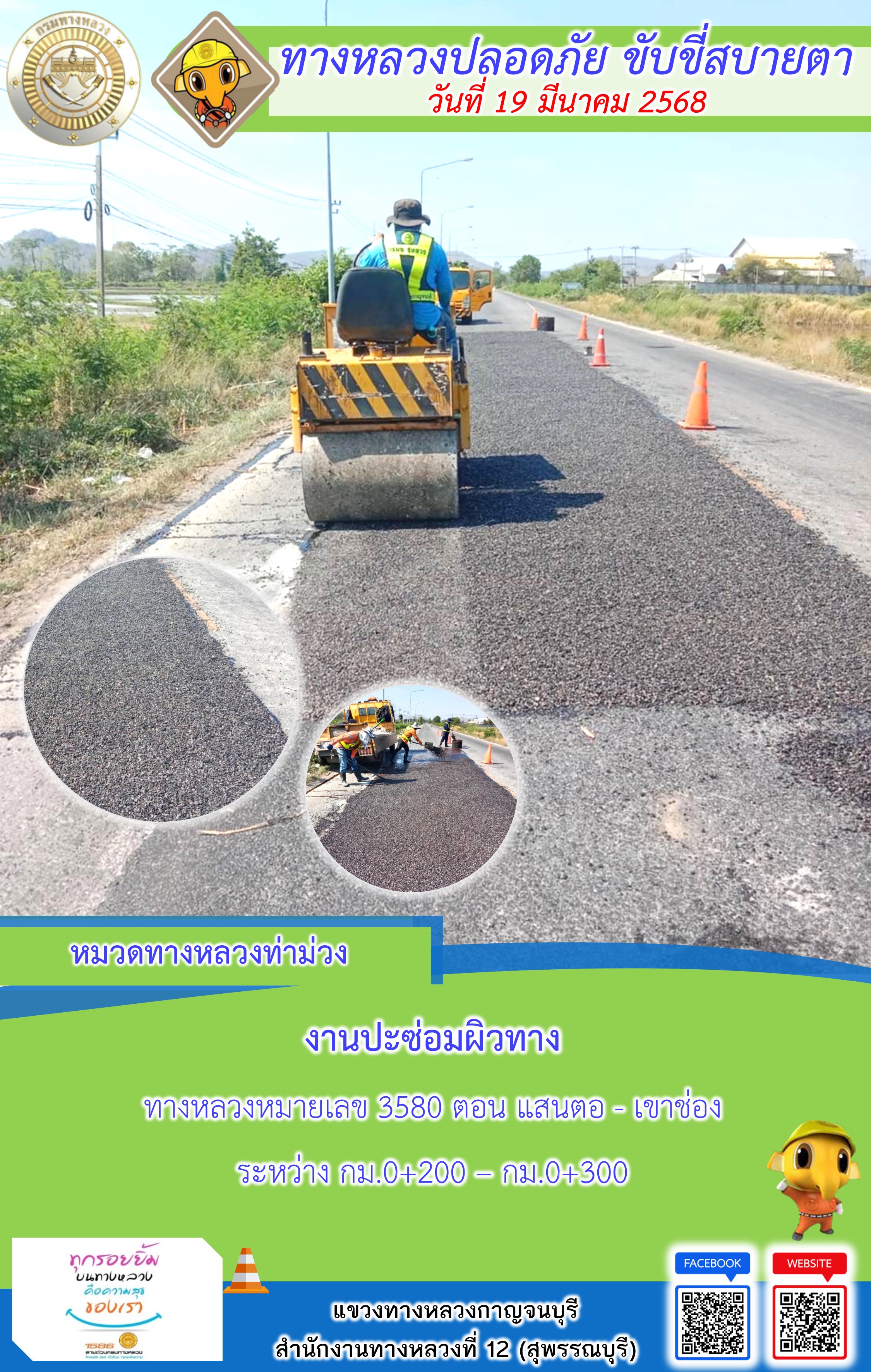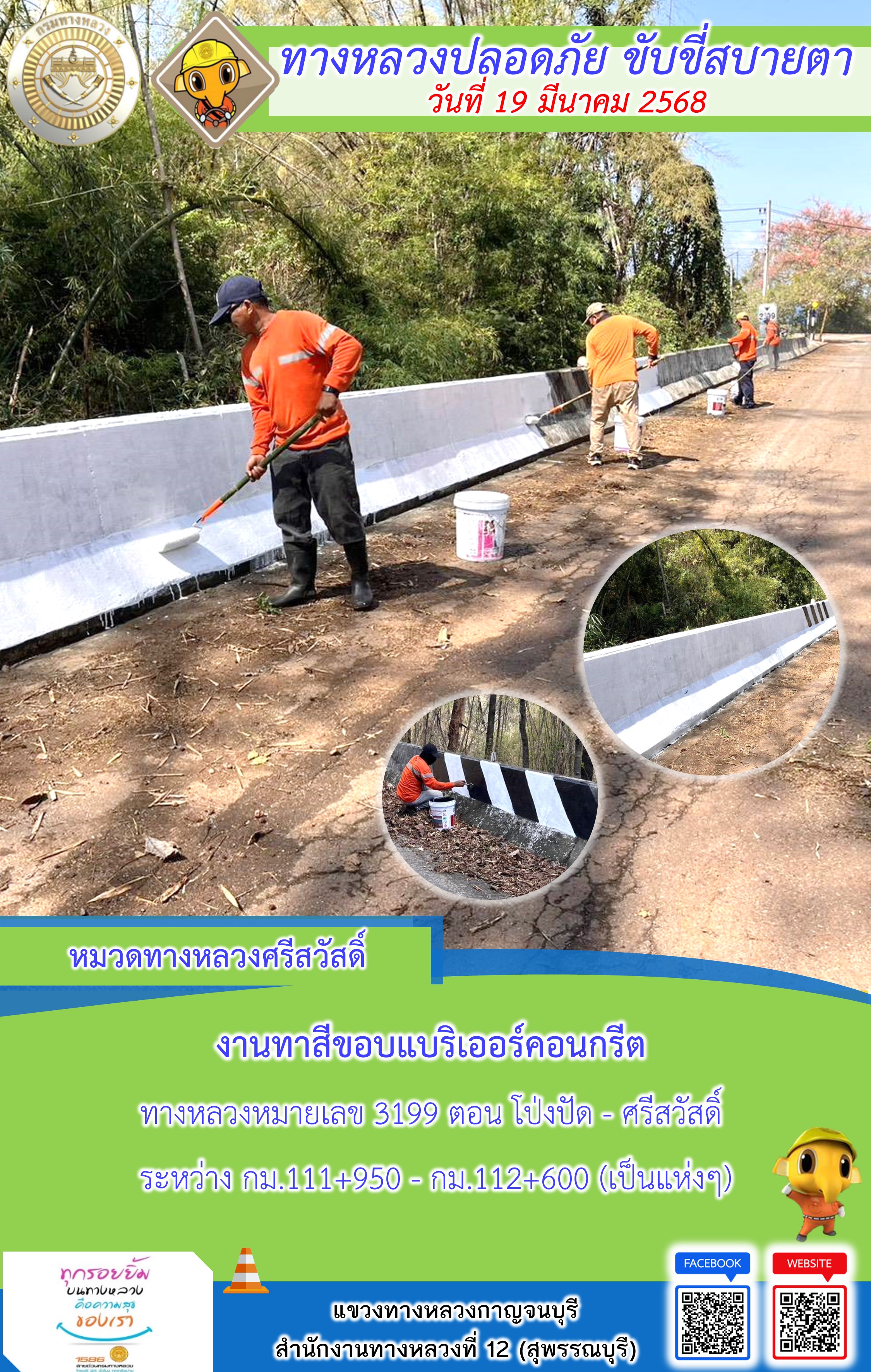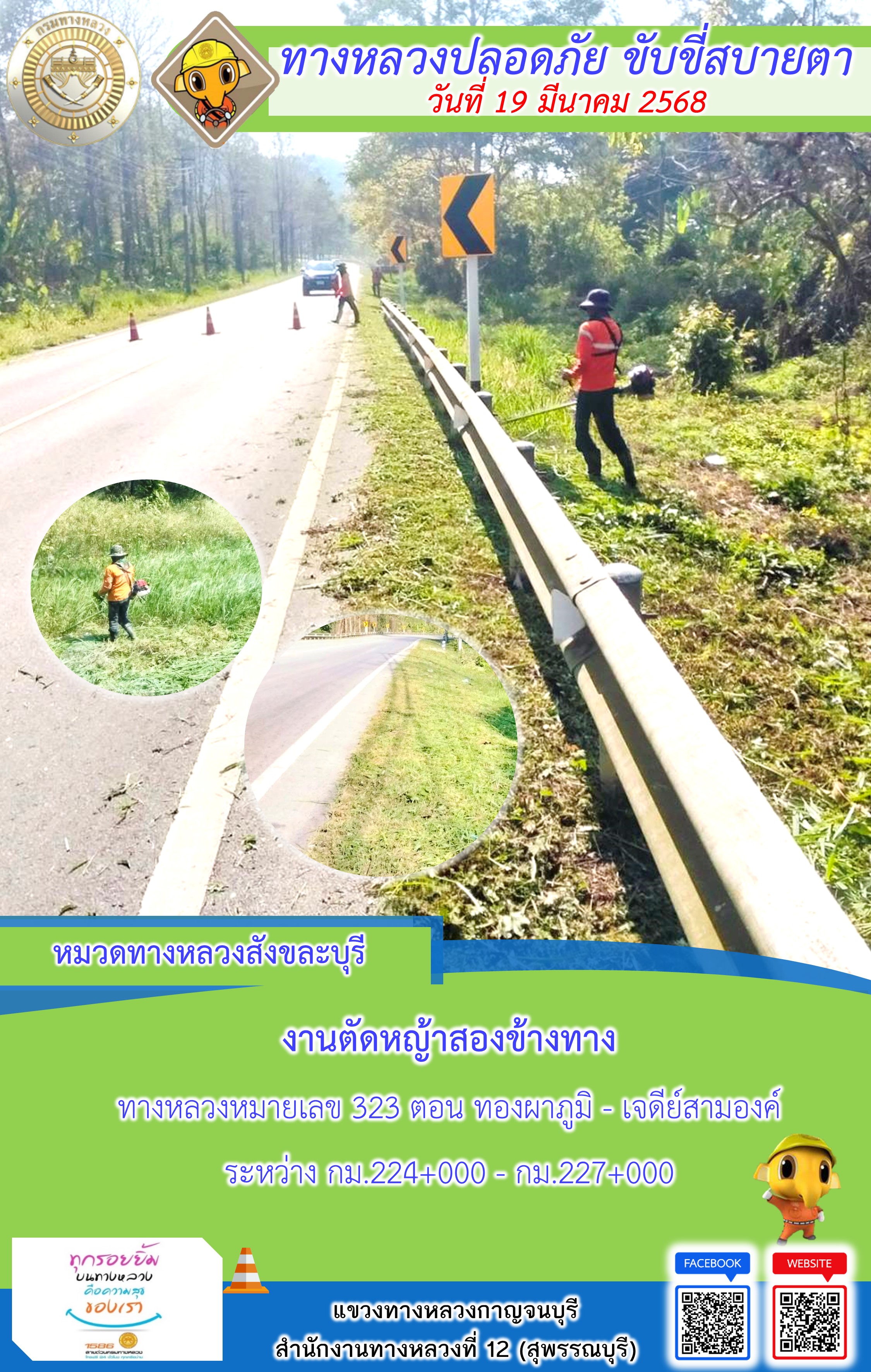 ข้อมูลภาพกิจกรรม : แขวงทางหลวงกาญจนบุรี โดยหมวดทางหลวงในสังกัด และงานอำนวยความปลอดภัยปฏิบัติงาน ประจำวันที่ 19 มี.ค. 68
