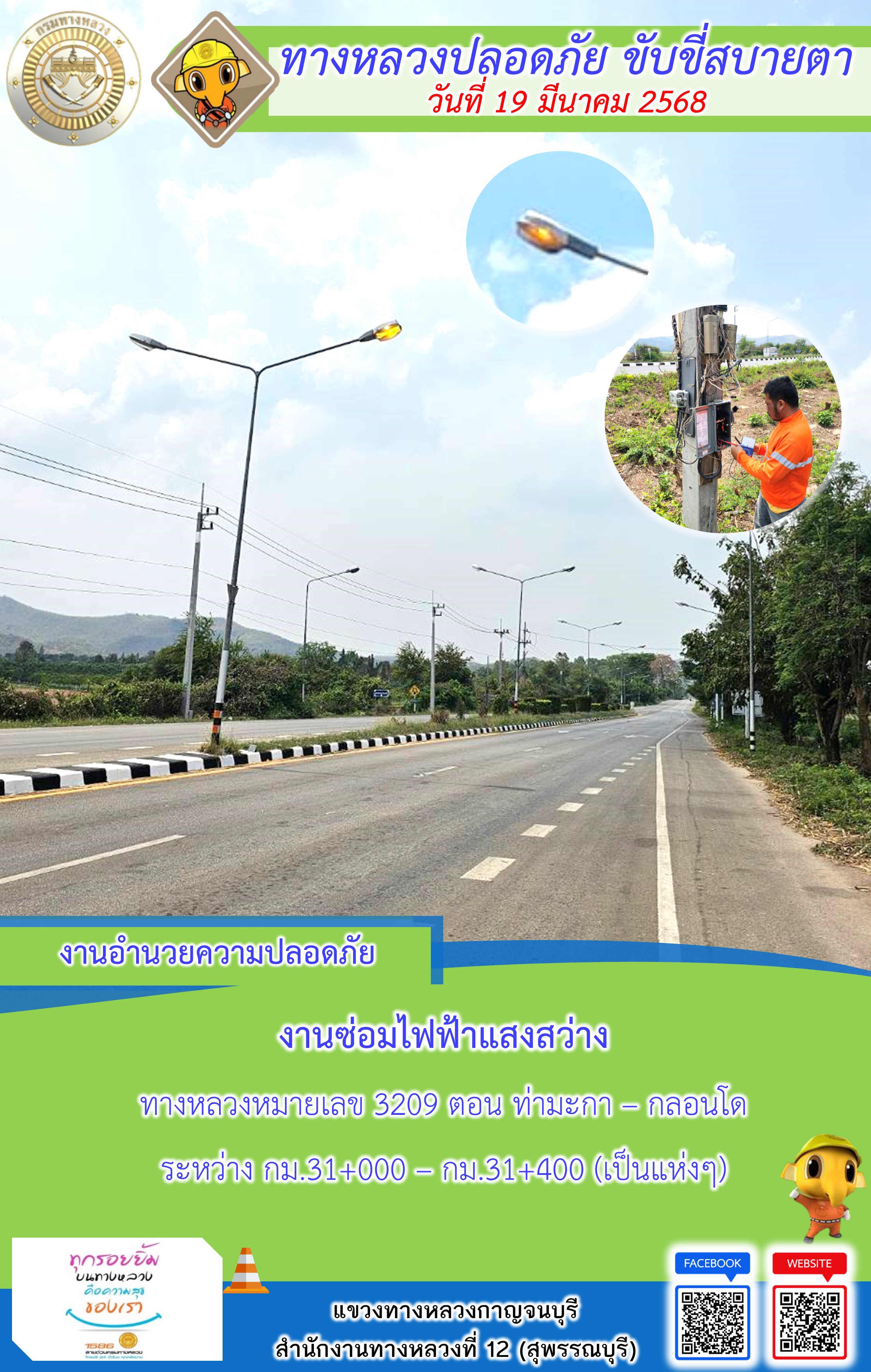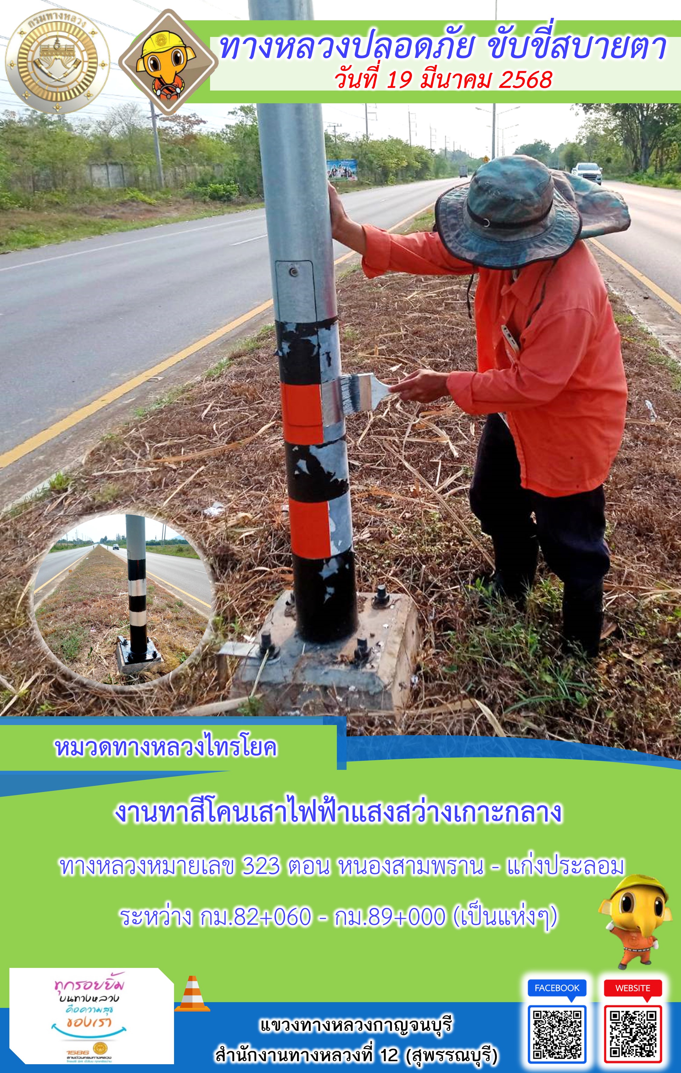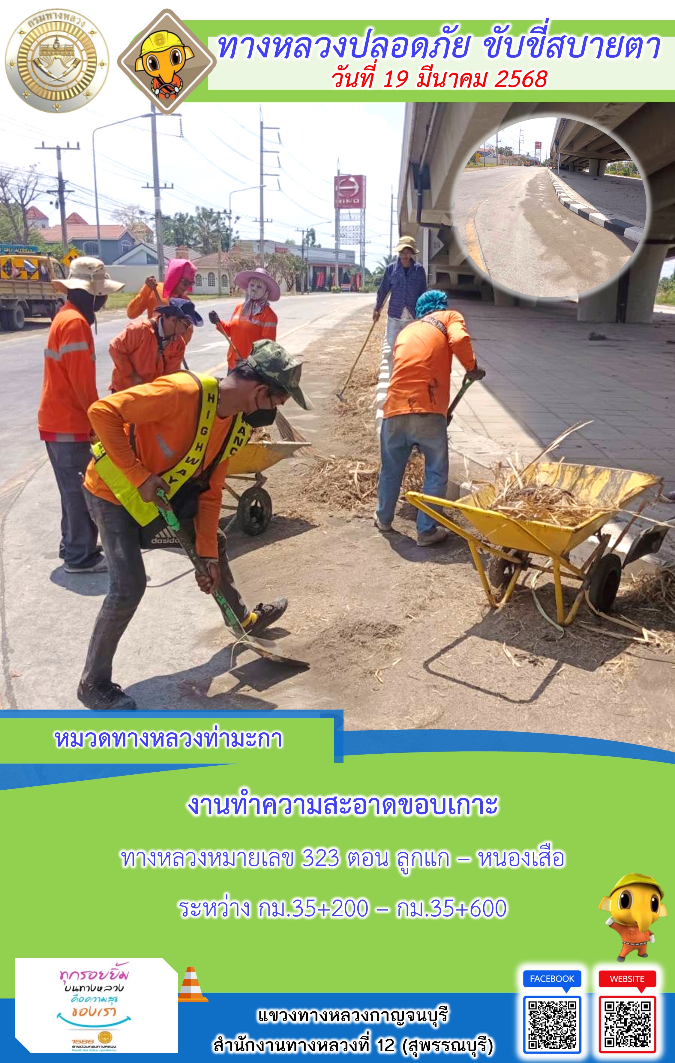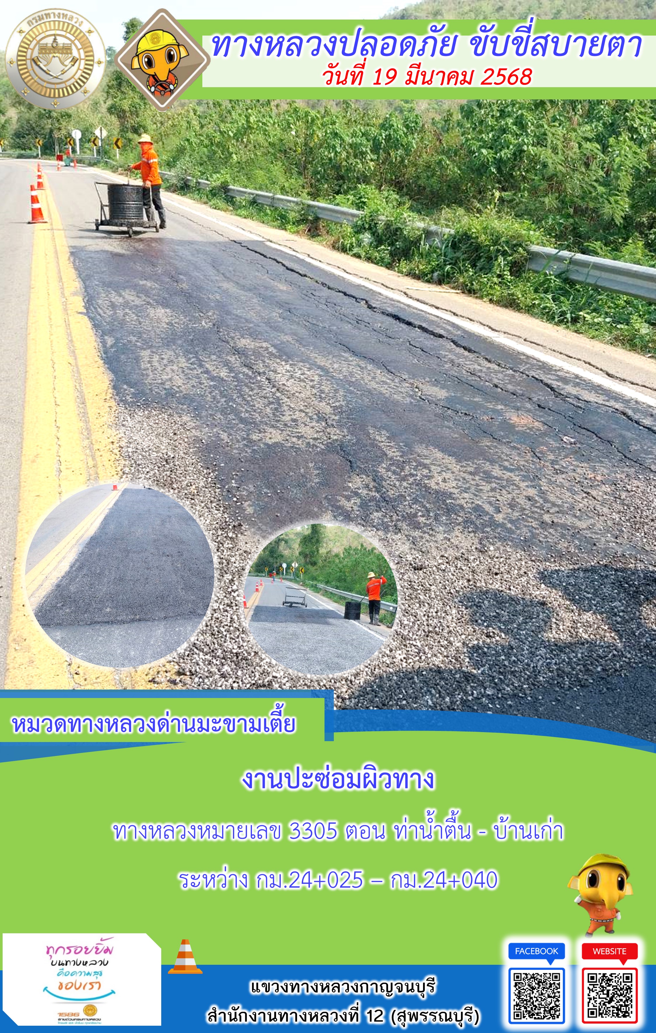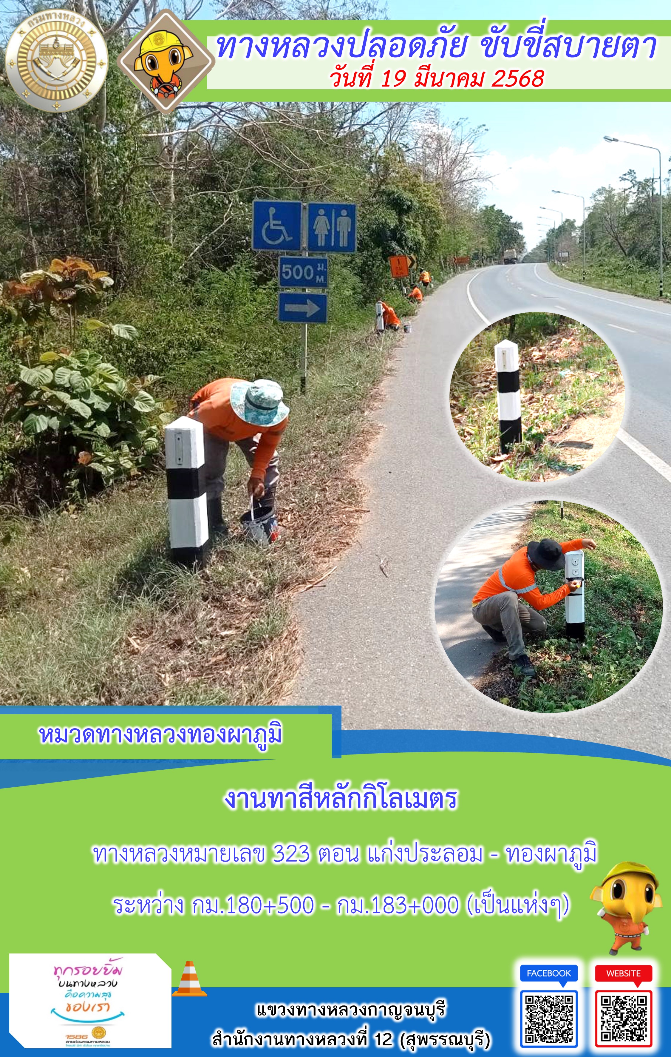ข้อมูลภาพกิจกรรม : แขวงทางหลวงกาญจนบุรี โดยหมวดทางหลวงในสังกัด และงานอำนวยความปลอดภัยปฏิบัติงาน ประจำวันที่ 19 มี.ค. 68
