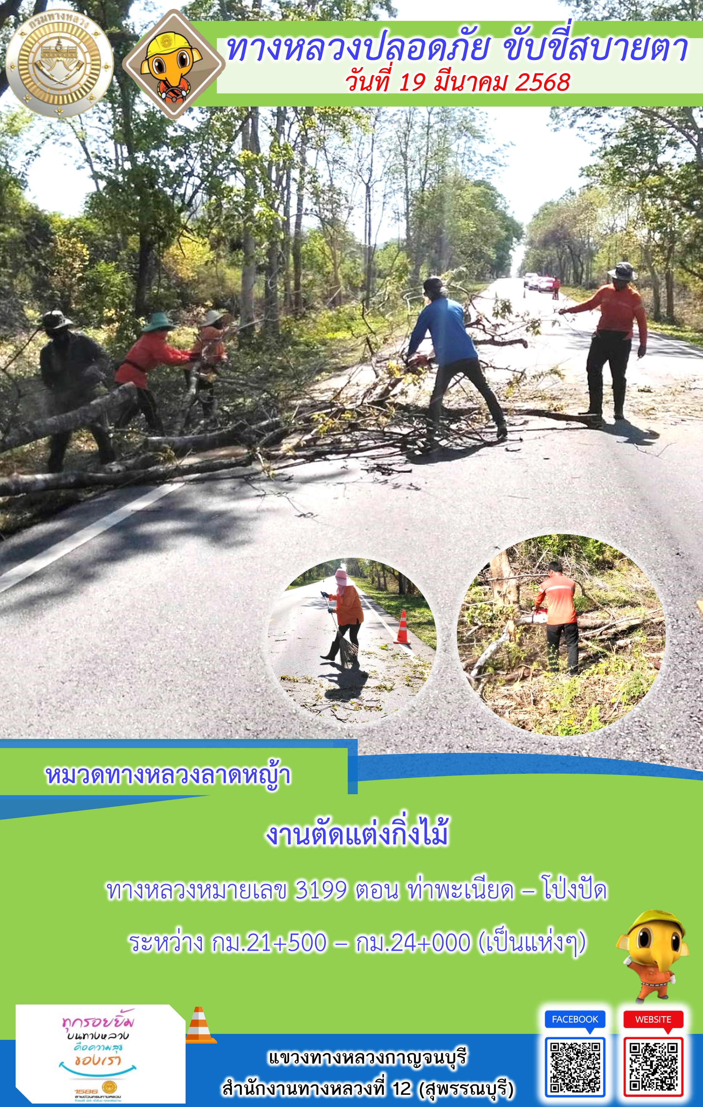 แขวงทางหลวงกาญจนบุรี โดยหมวดทางหลวงในสังกัด และงานอำนวยความปลอดภัยปฏิบัติงาน ประจำวันที่ 19 มี.ค. 68