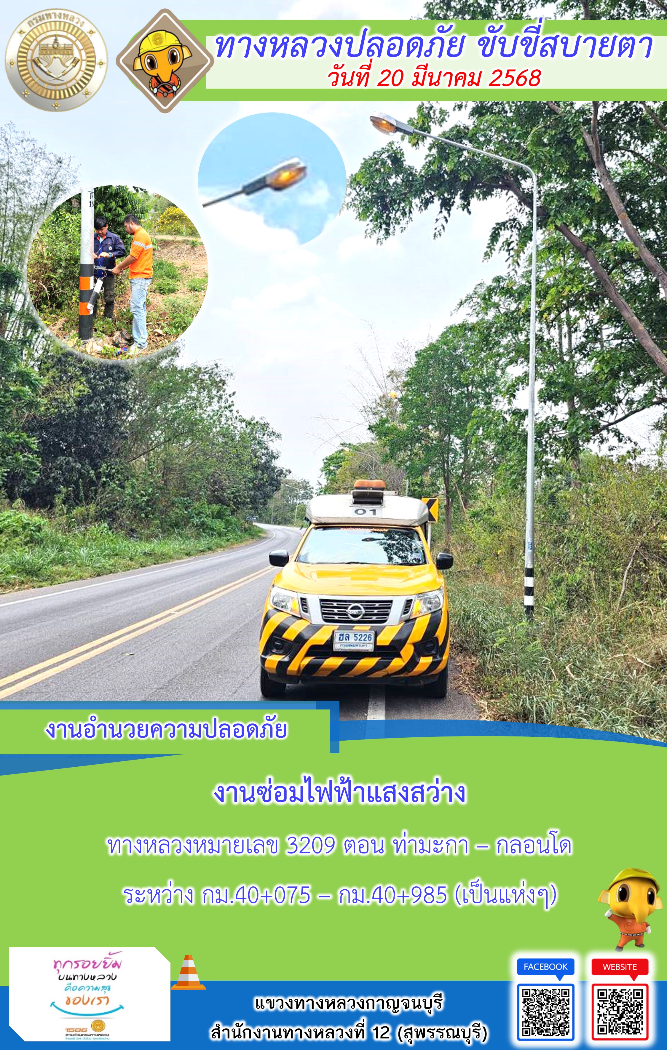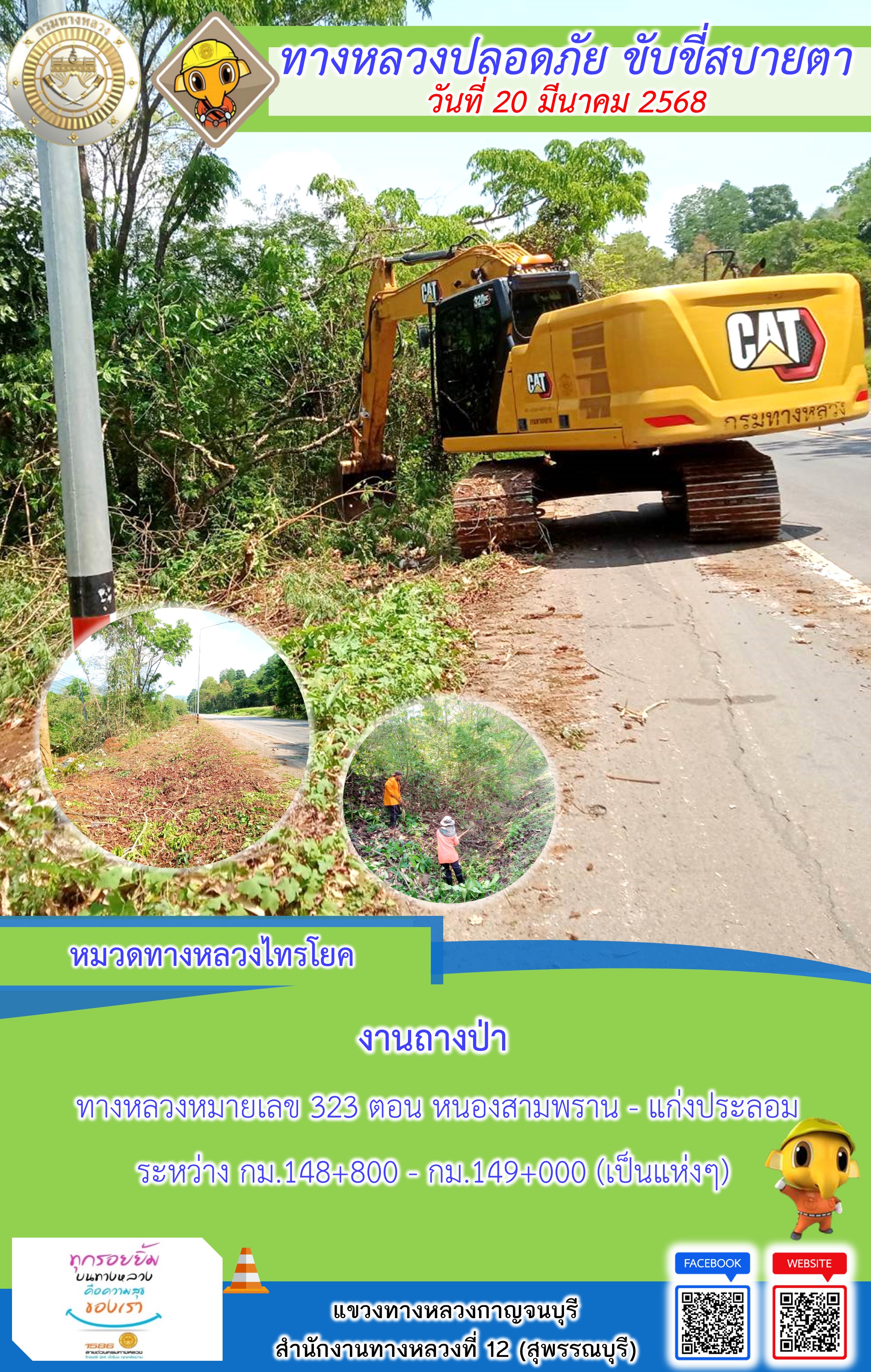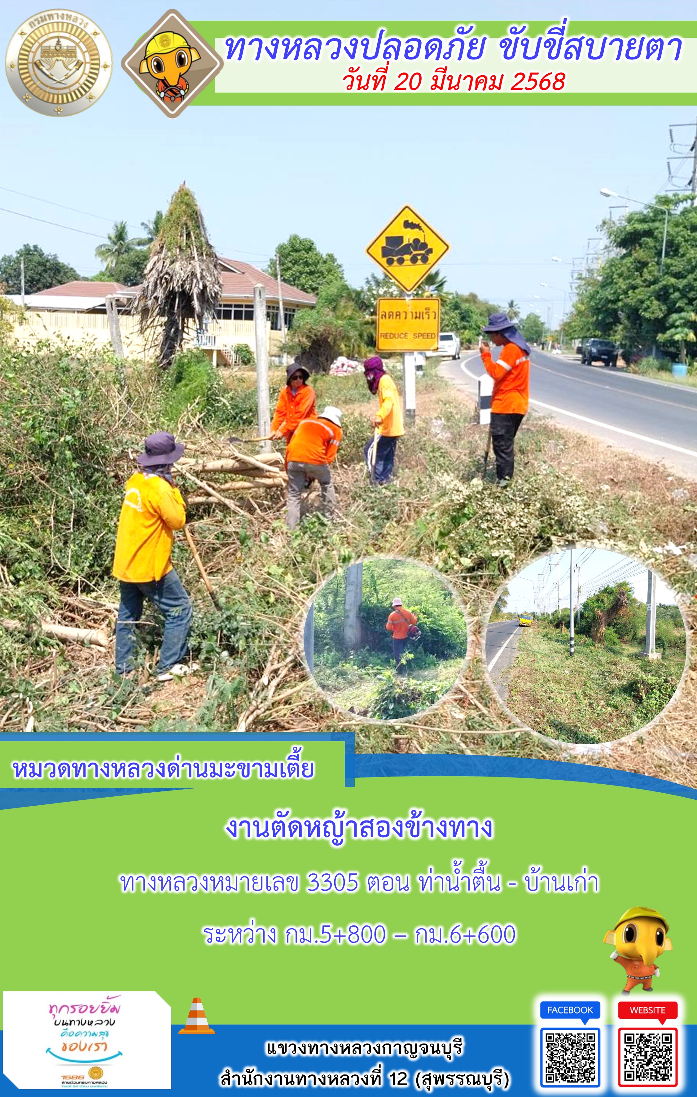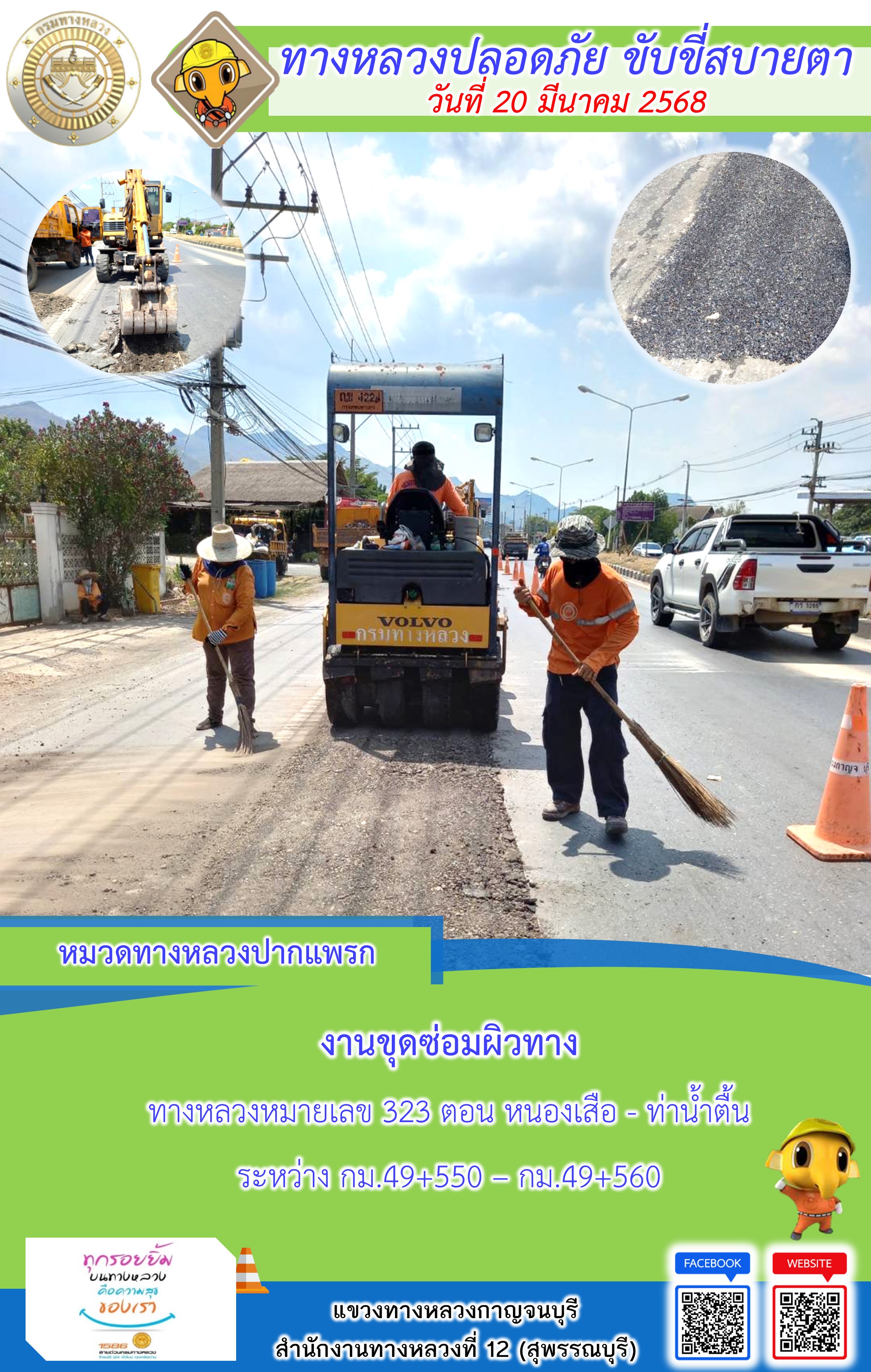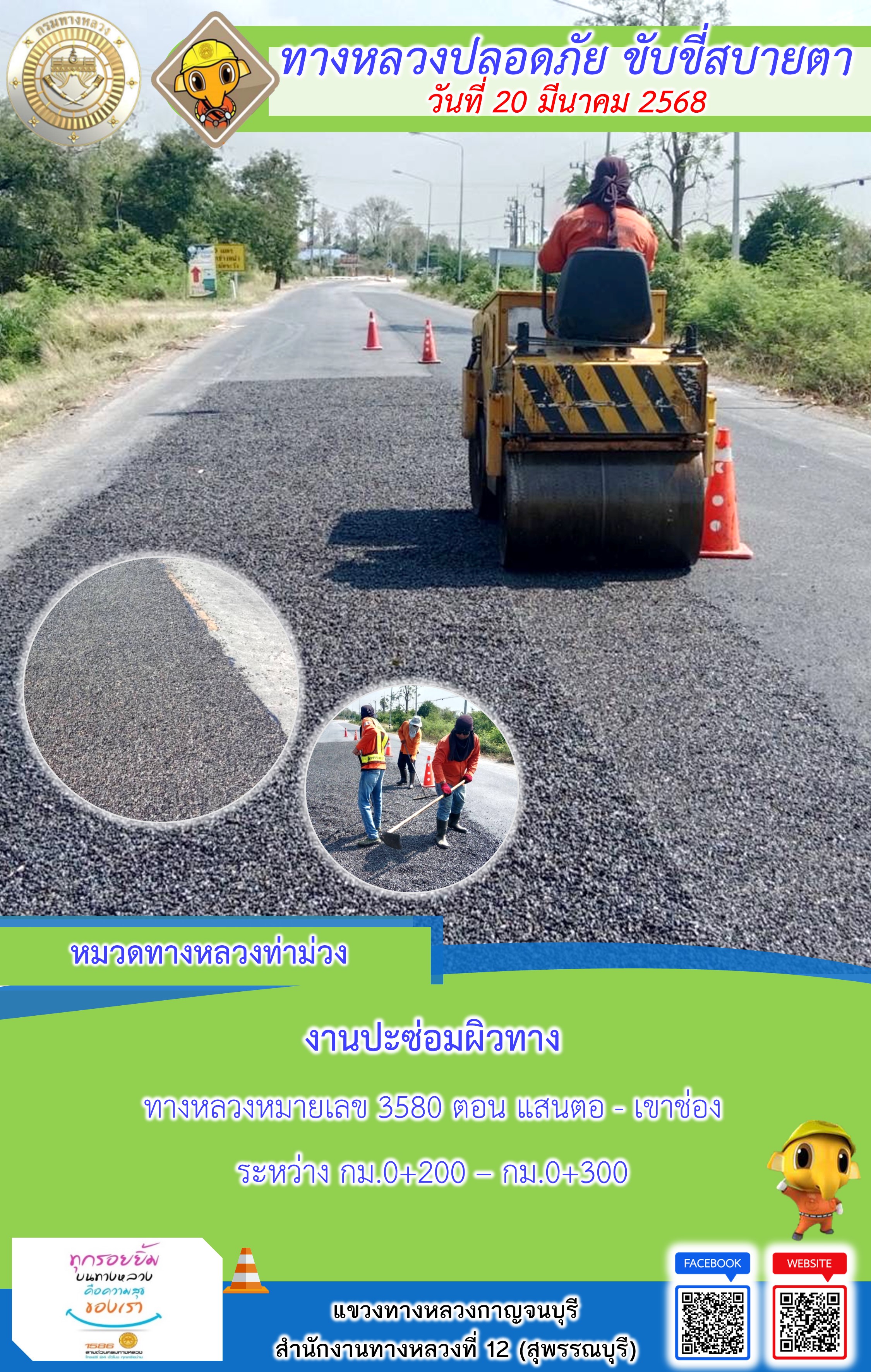 แขวงทางหลวงกาญจนบุรี โดยหมวดทางหลวงในสังกัด และงานอำนวยความปลอดภัยปฏิบัติงาน ประจำวันที่ 20 มี.ค. 68