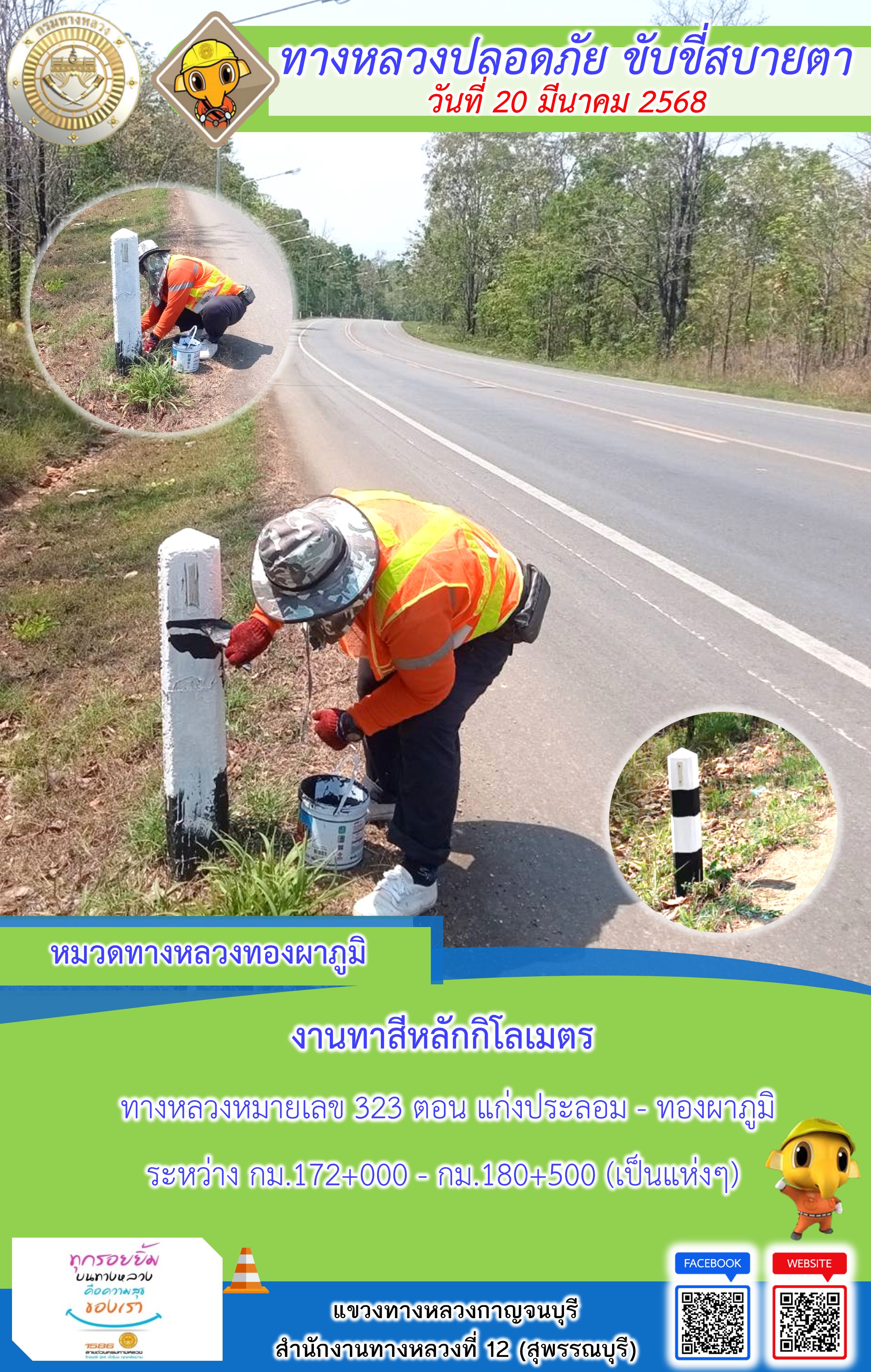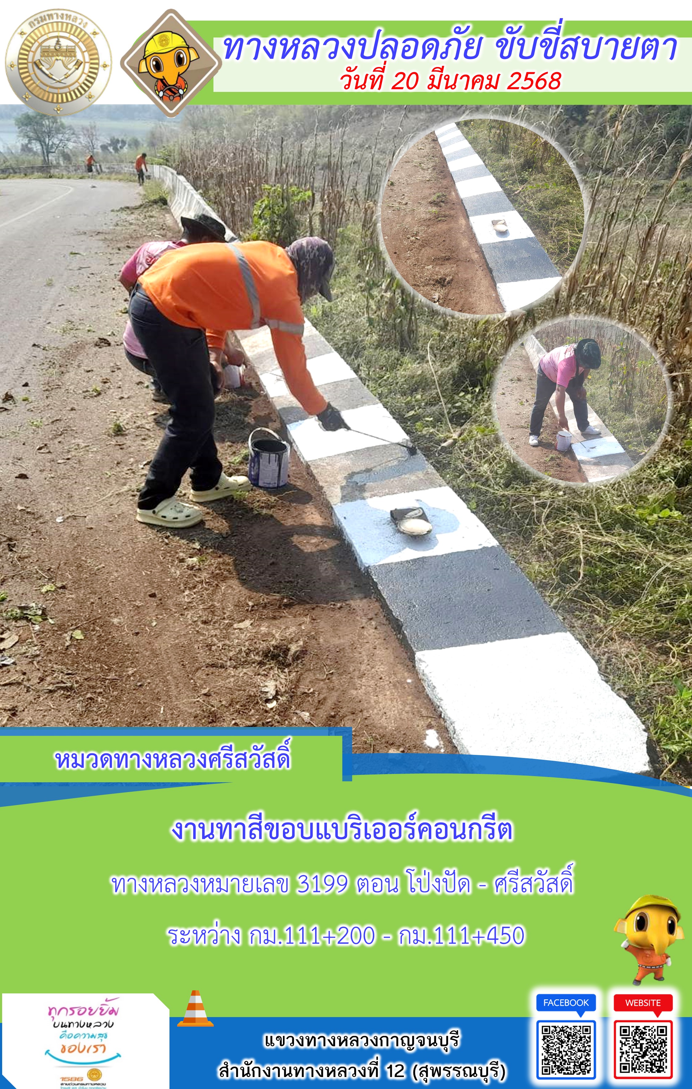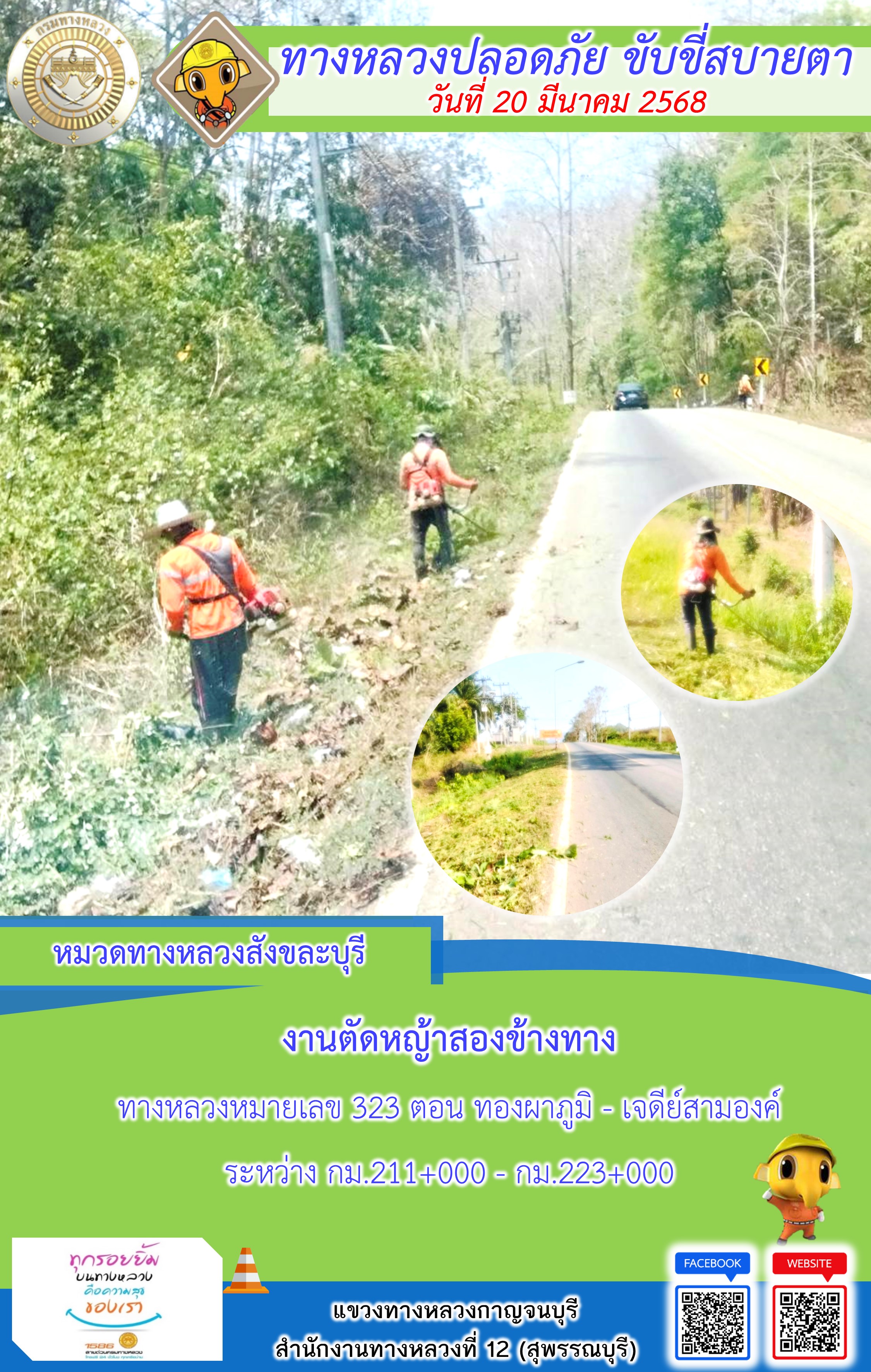 ข้อมูลภาพกิจกรรม : แขวงทางหลวงกาญจนบุรี โดยหมวดทางหลวงในสังกัด และงานอำนวยความปลอดภัยปฏิบัติงาน ประจำวันที่ 20 มี.ค. 68