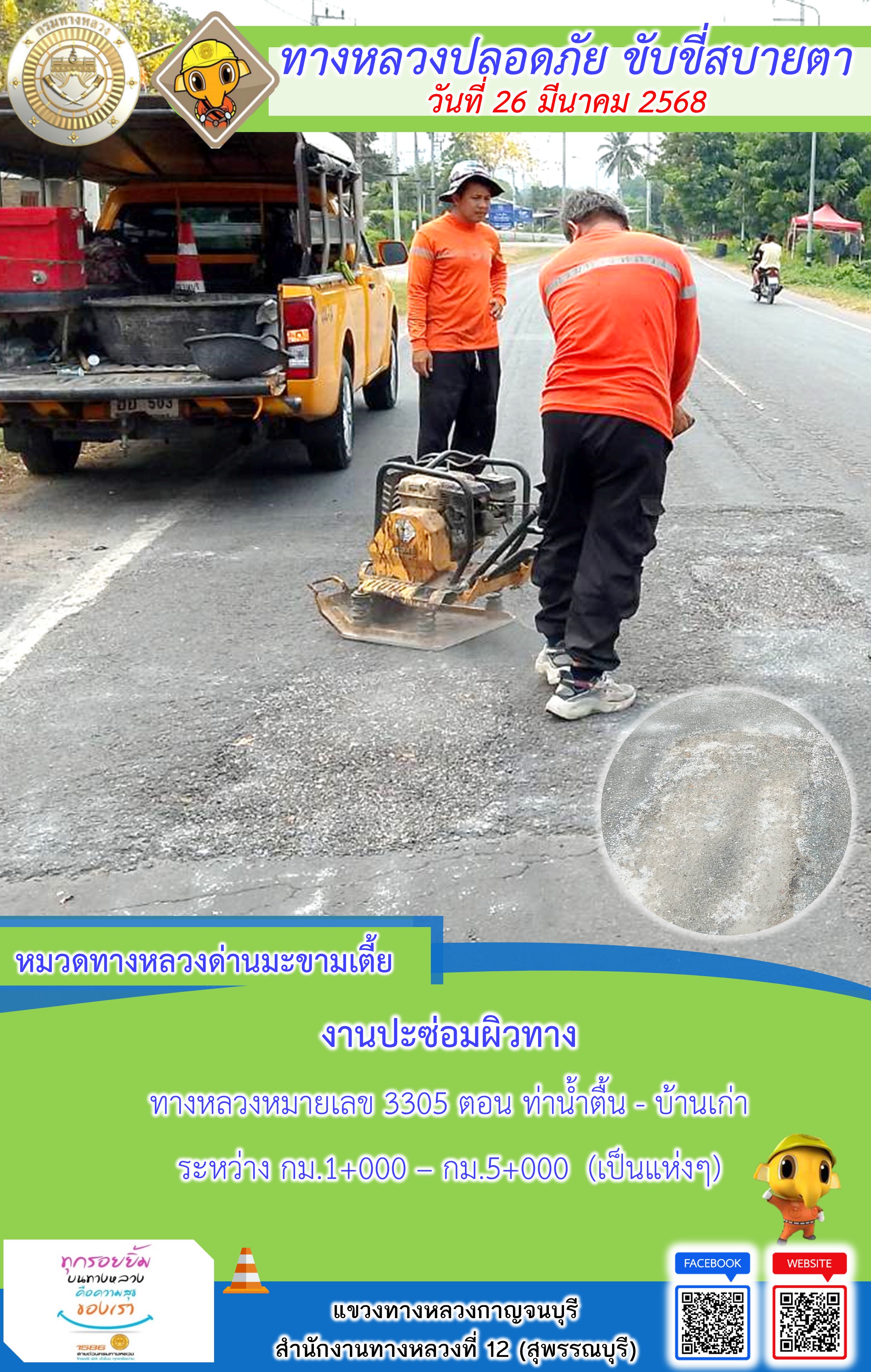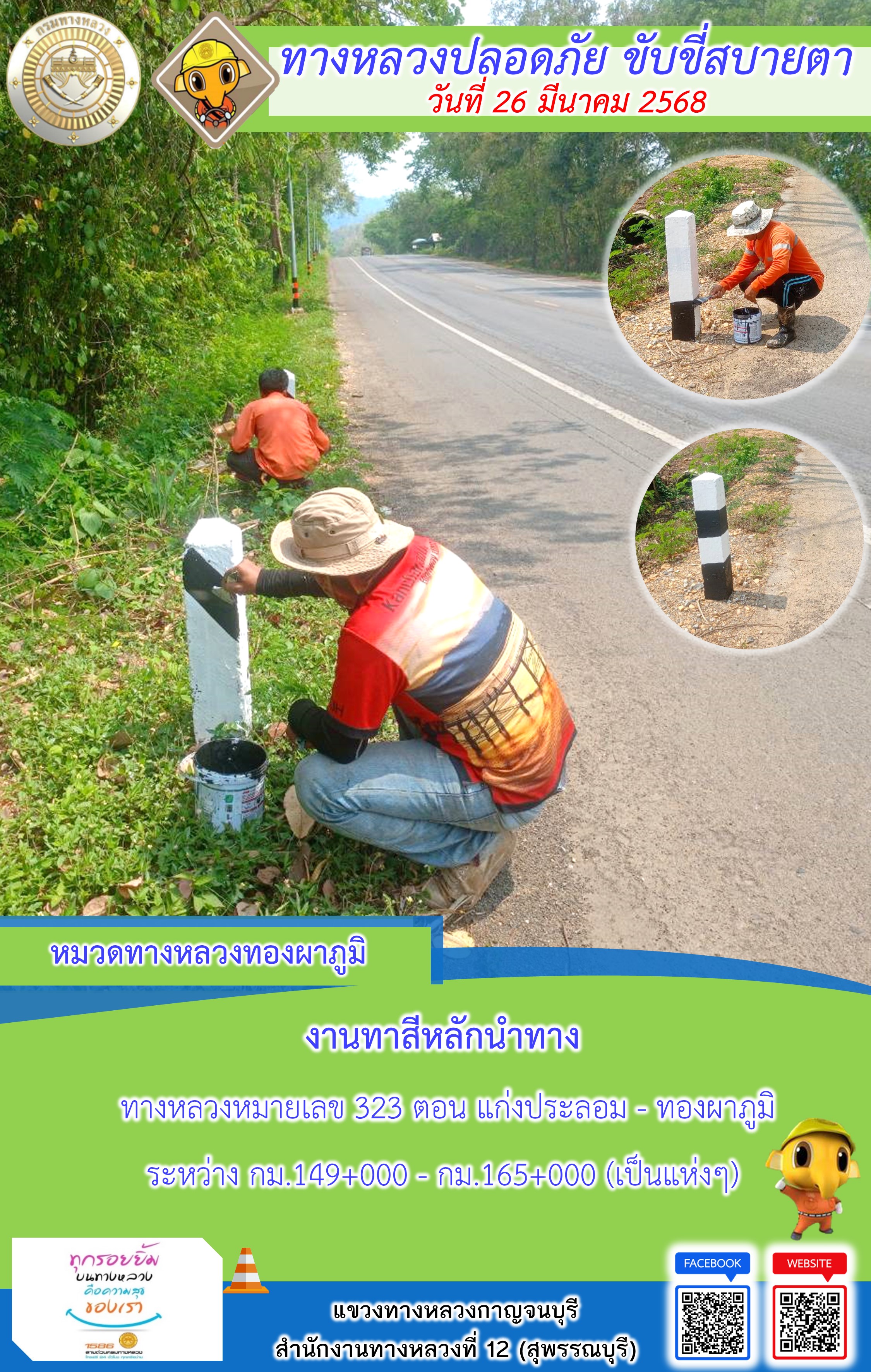 ข้อมูลภาพกิจกรรม : แขวงทางหลวงกาญจนบุรี โดยหมวดทางหลวงในสังกัด และงานอำนวยความปลอดภัยปฏิบัติงาน ประจำวันที่ 26 มี.ค. 68