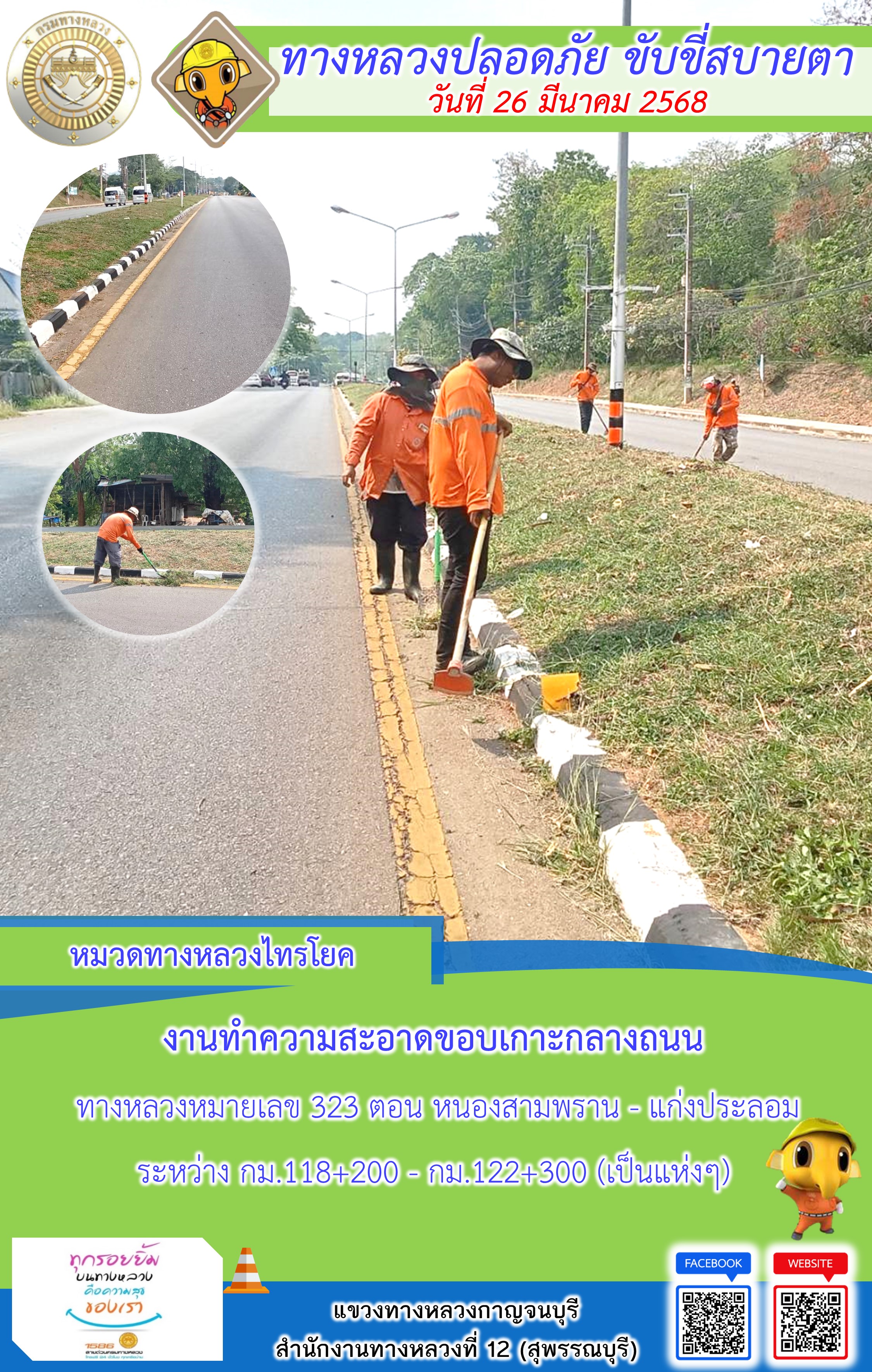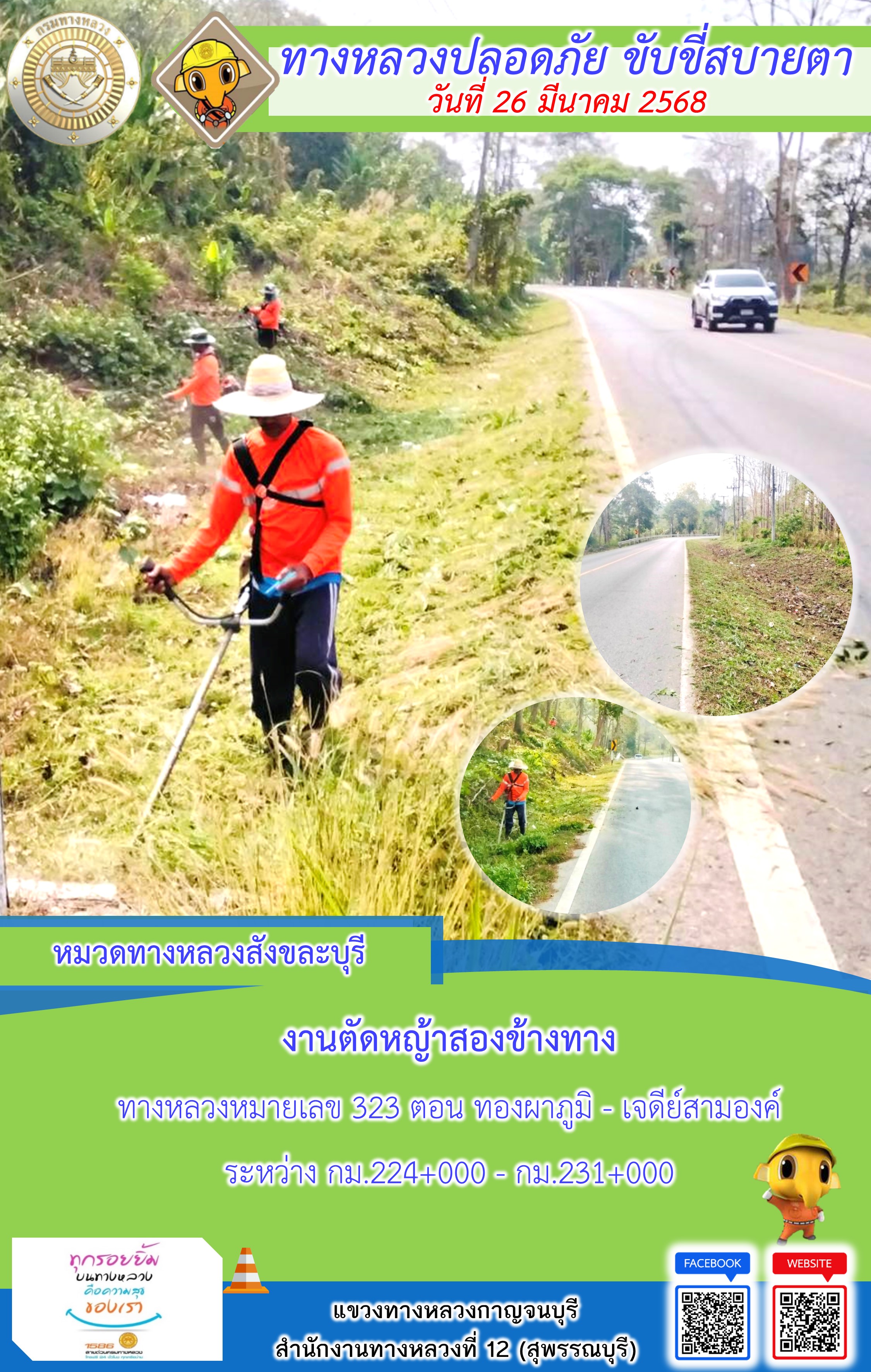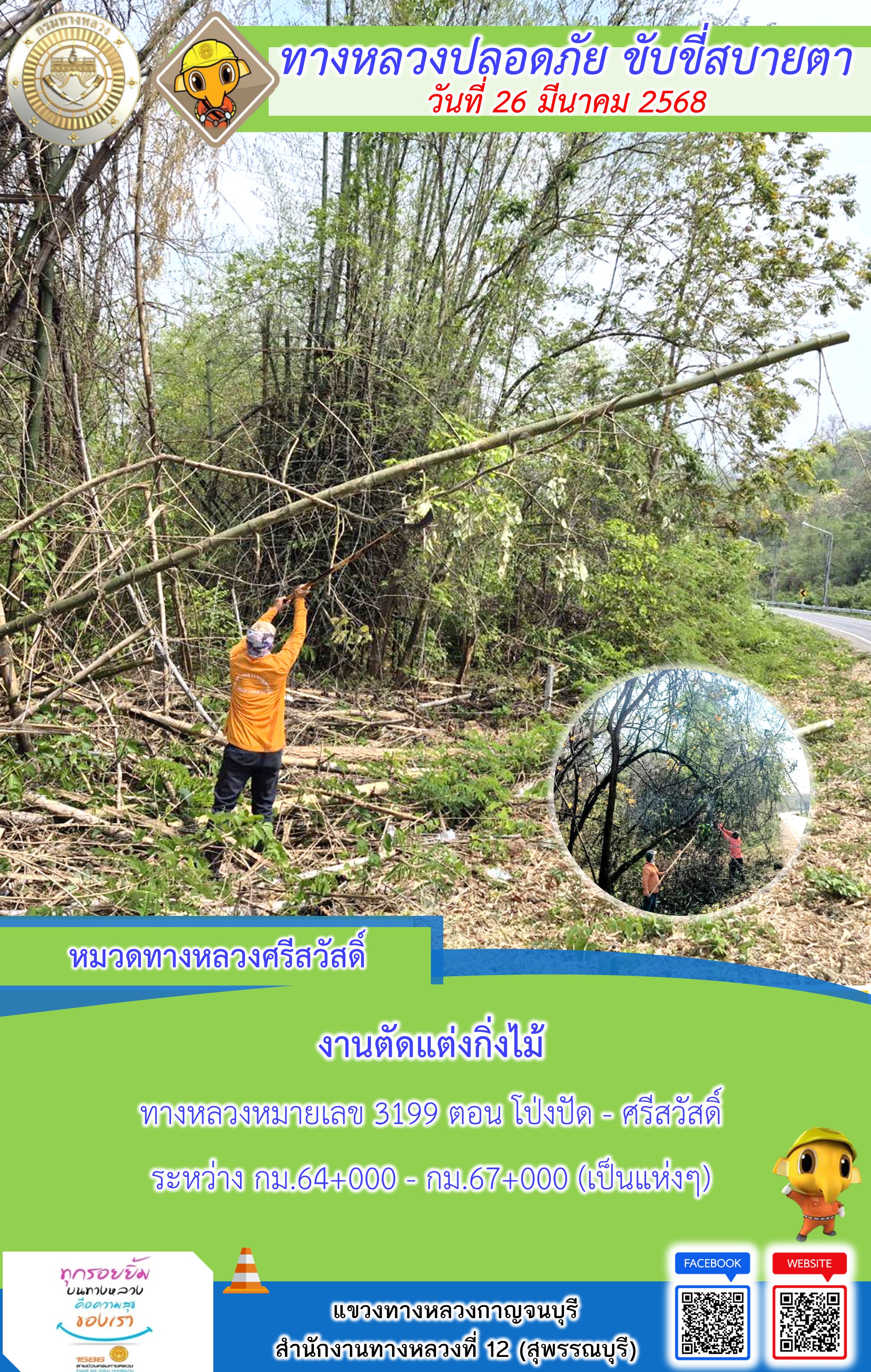 แขวงทางหลวงกาญจนบุรี โดยหมวดทางหลวงในสังกัด และงานอำนวยความปลอดภัยปฏิบัติงาน ประจำวันที่ 26 มี.ค. 68