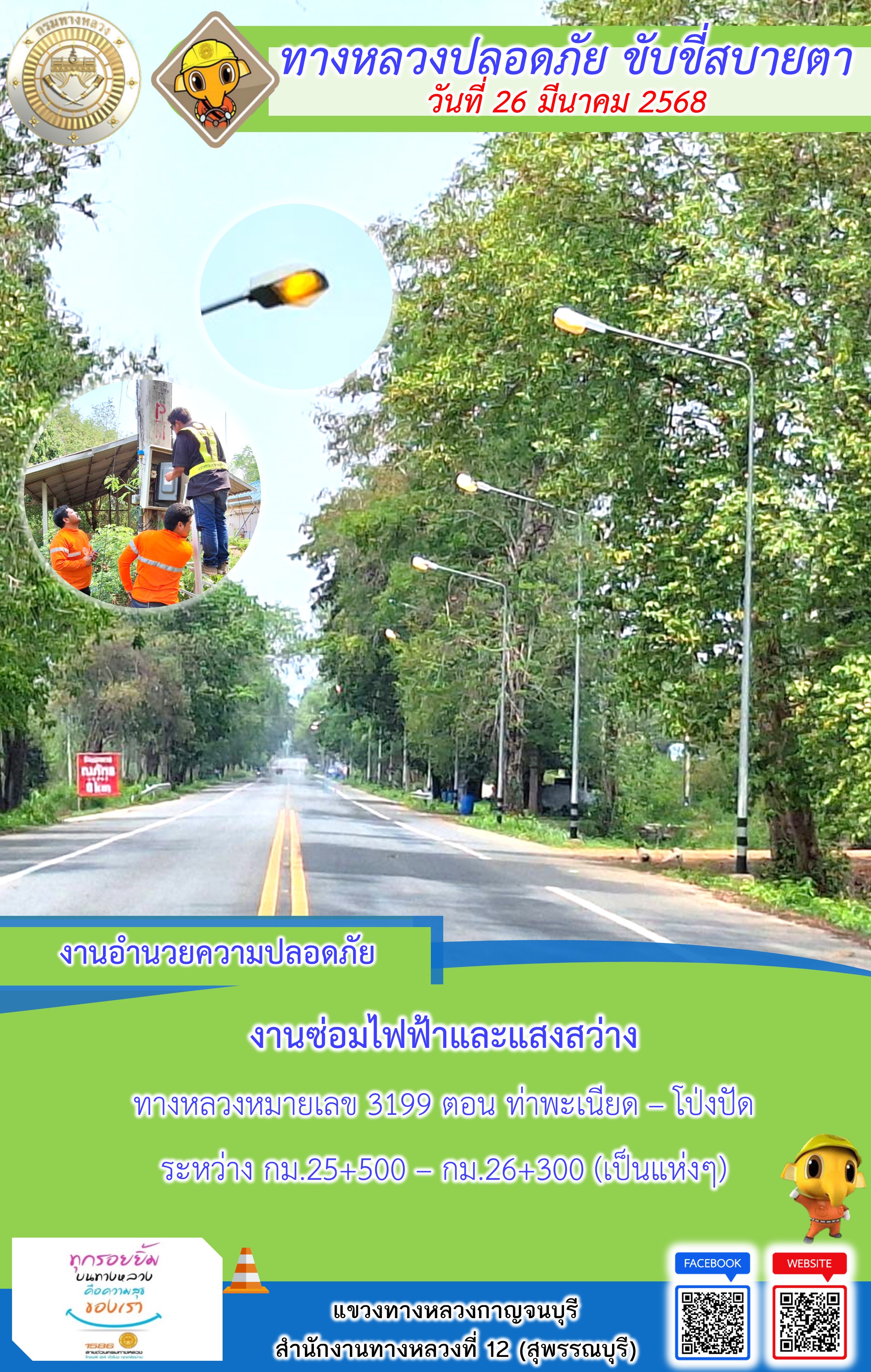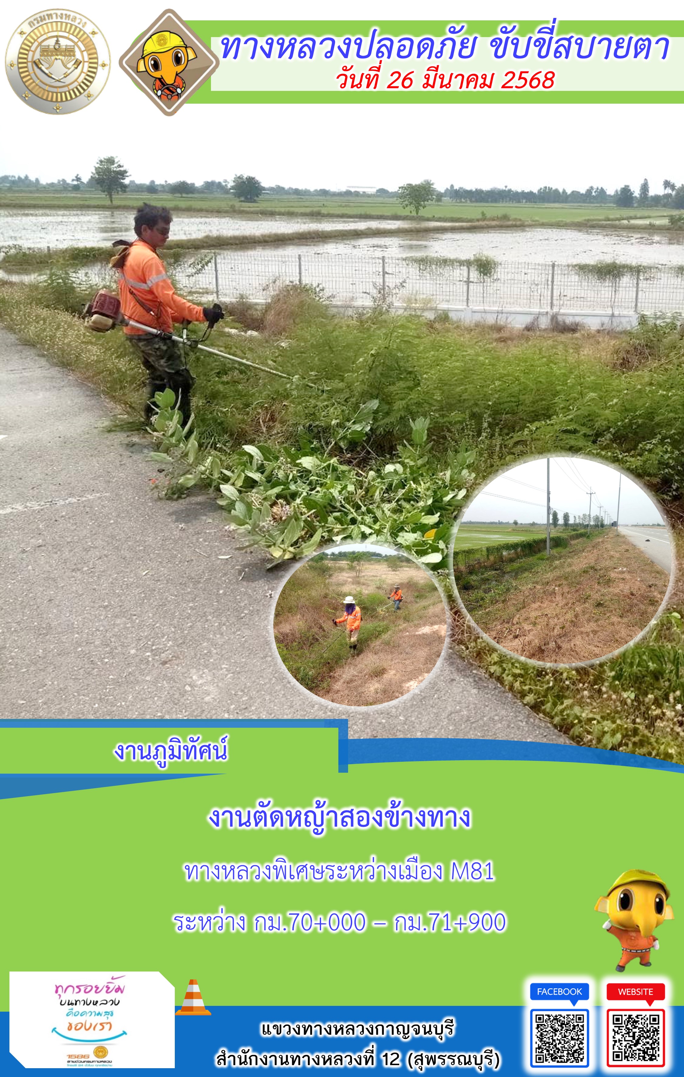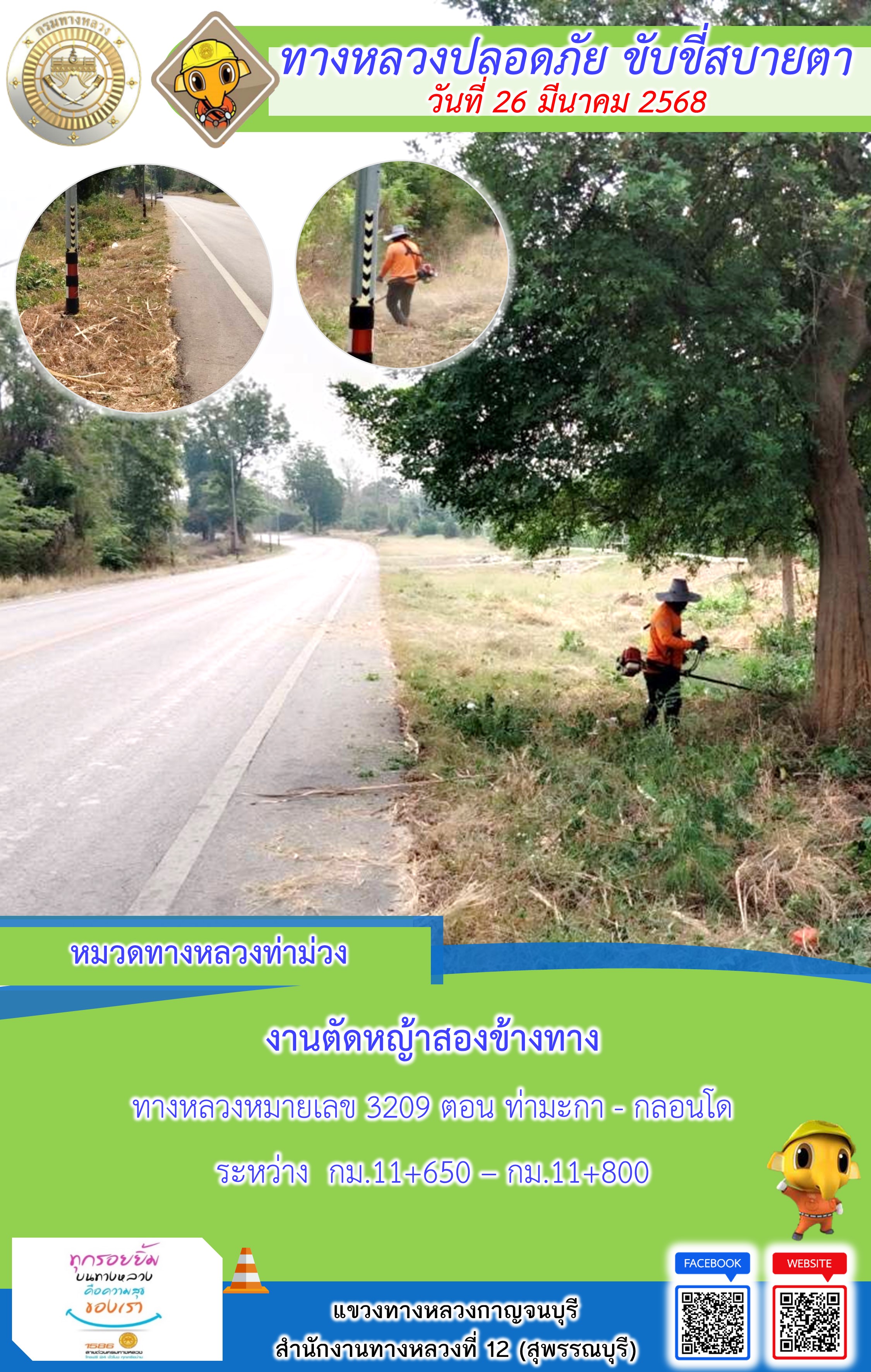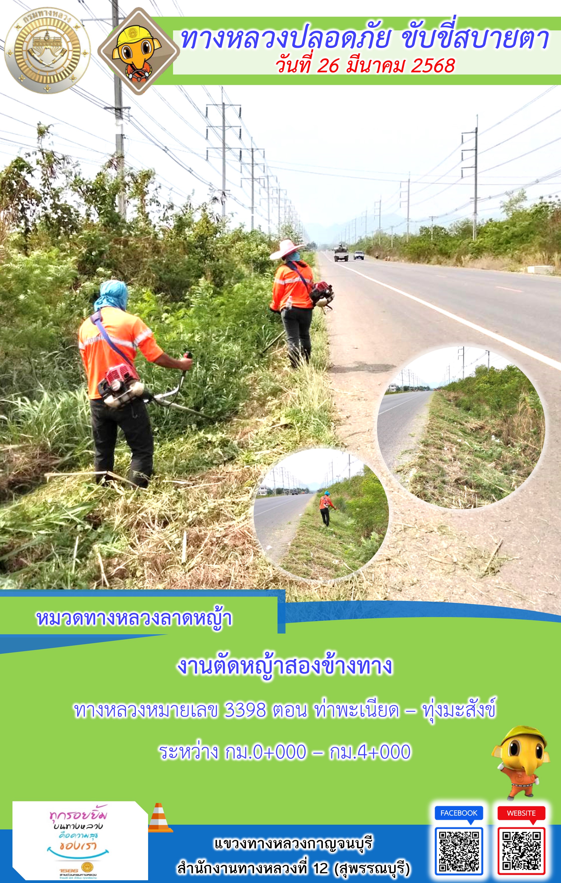 แขวงทางหลวงกาญจนบุรี โดยหมวดทางหลวงในสังกัด และงานอำนวยความปลอดภัยปฏิบัติงาน ประจำวันที่ 26 มี.ค. 68