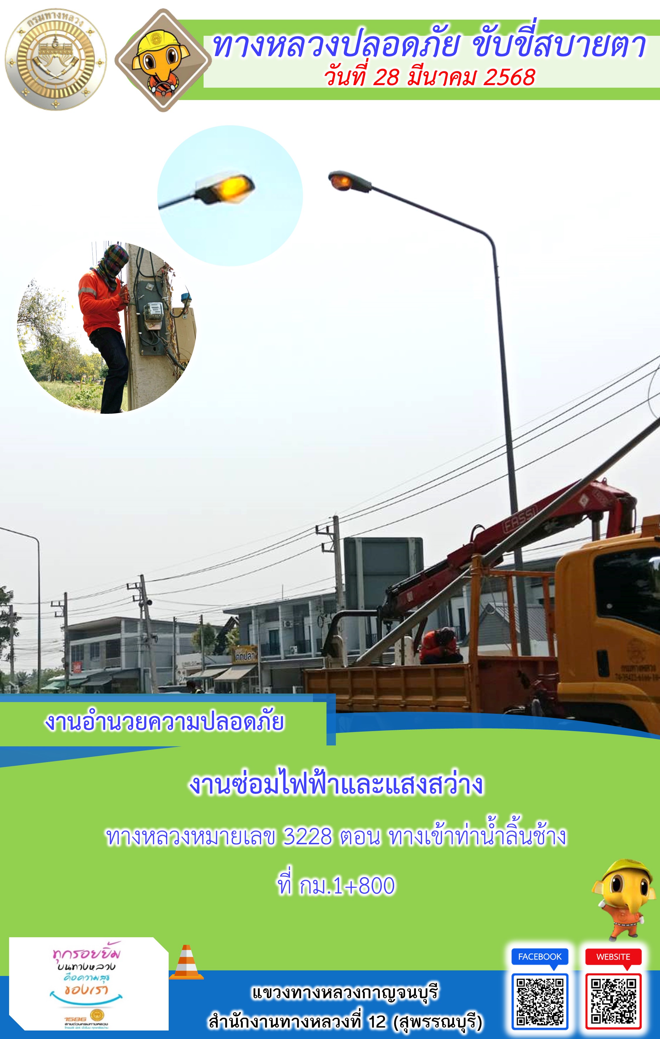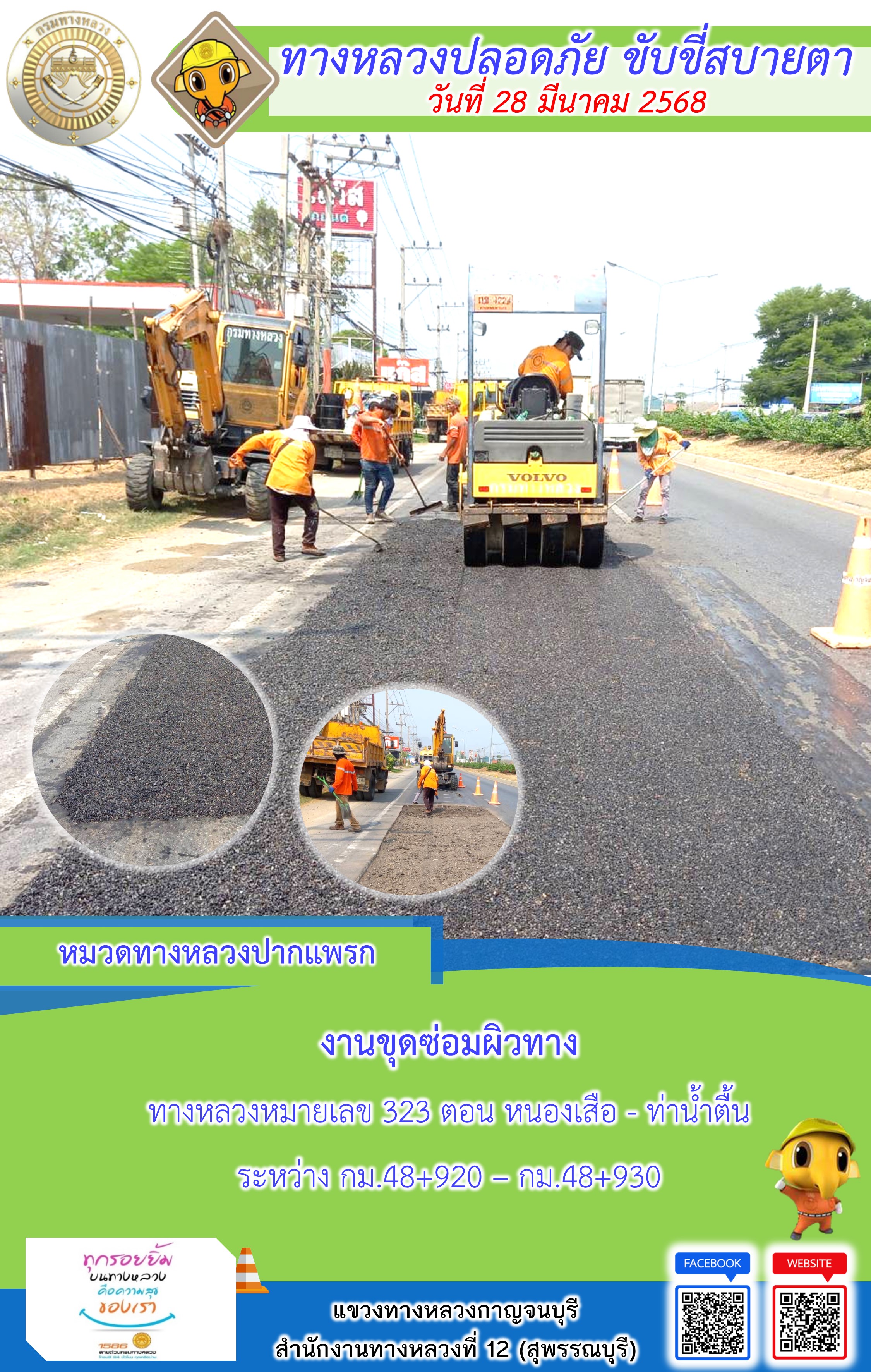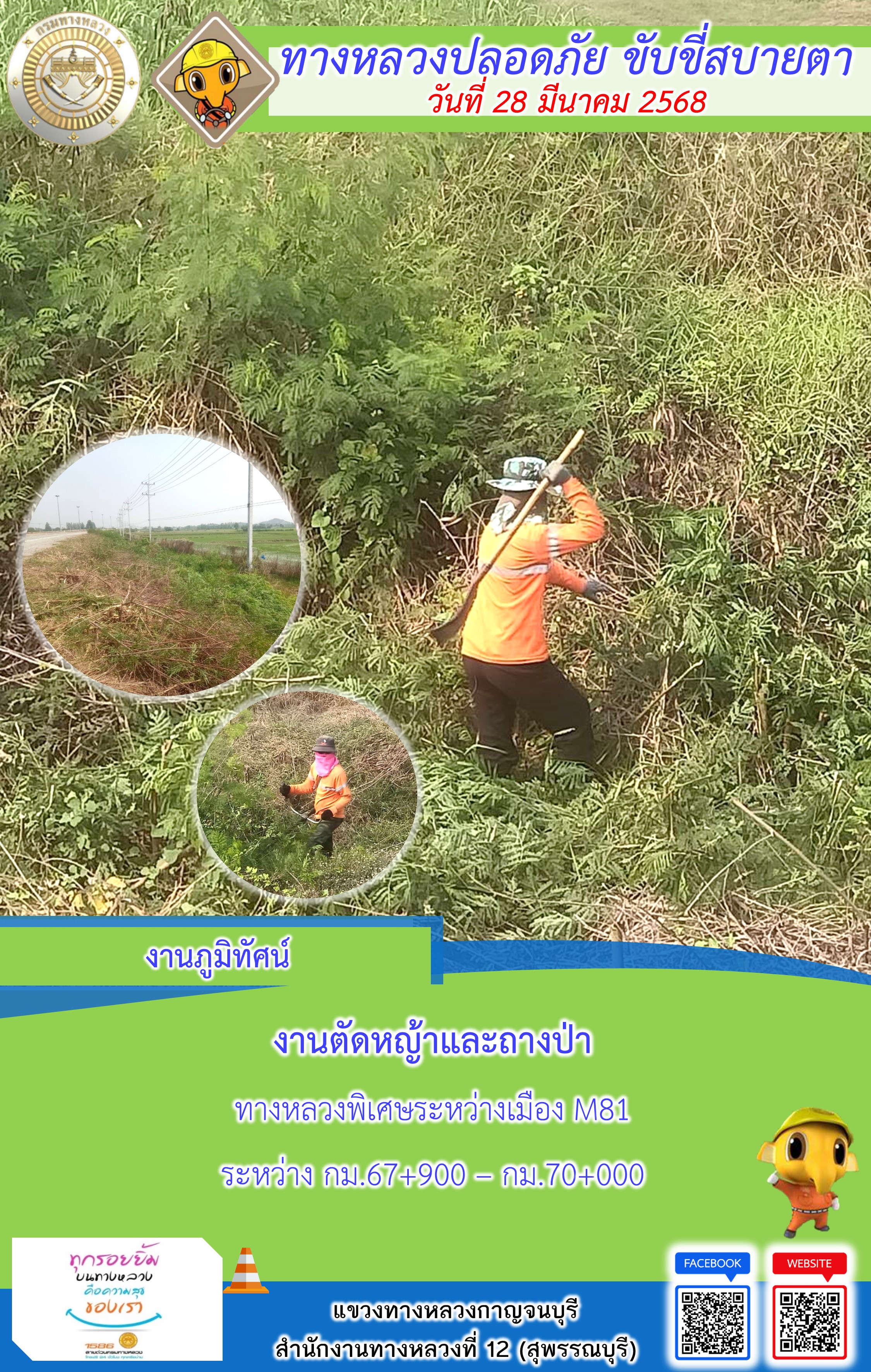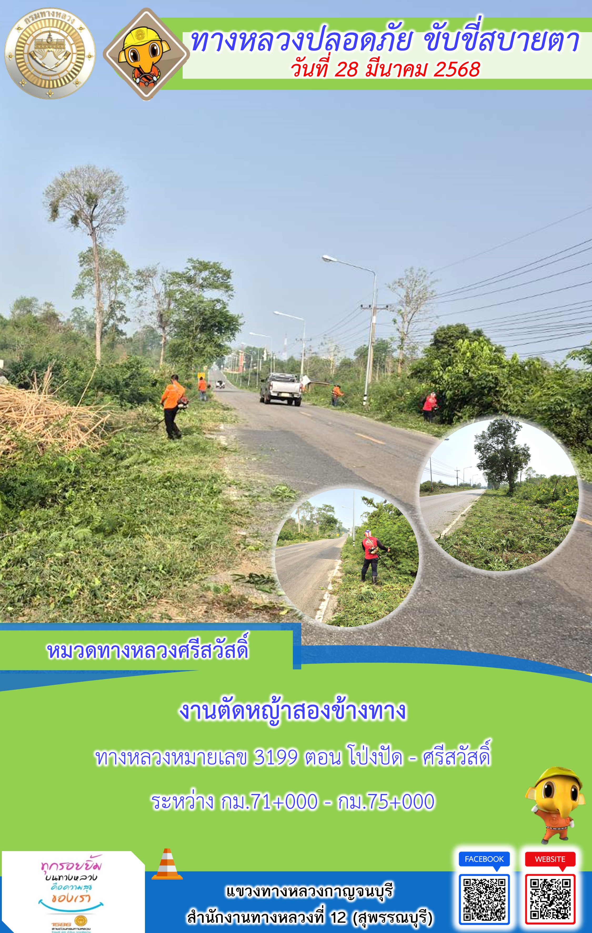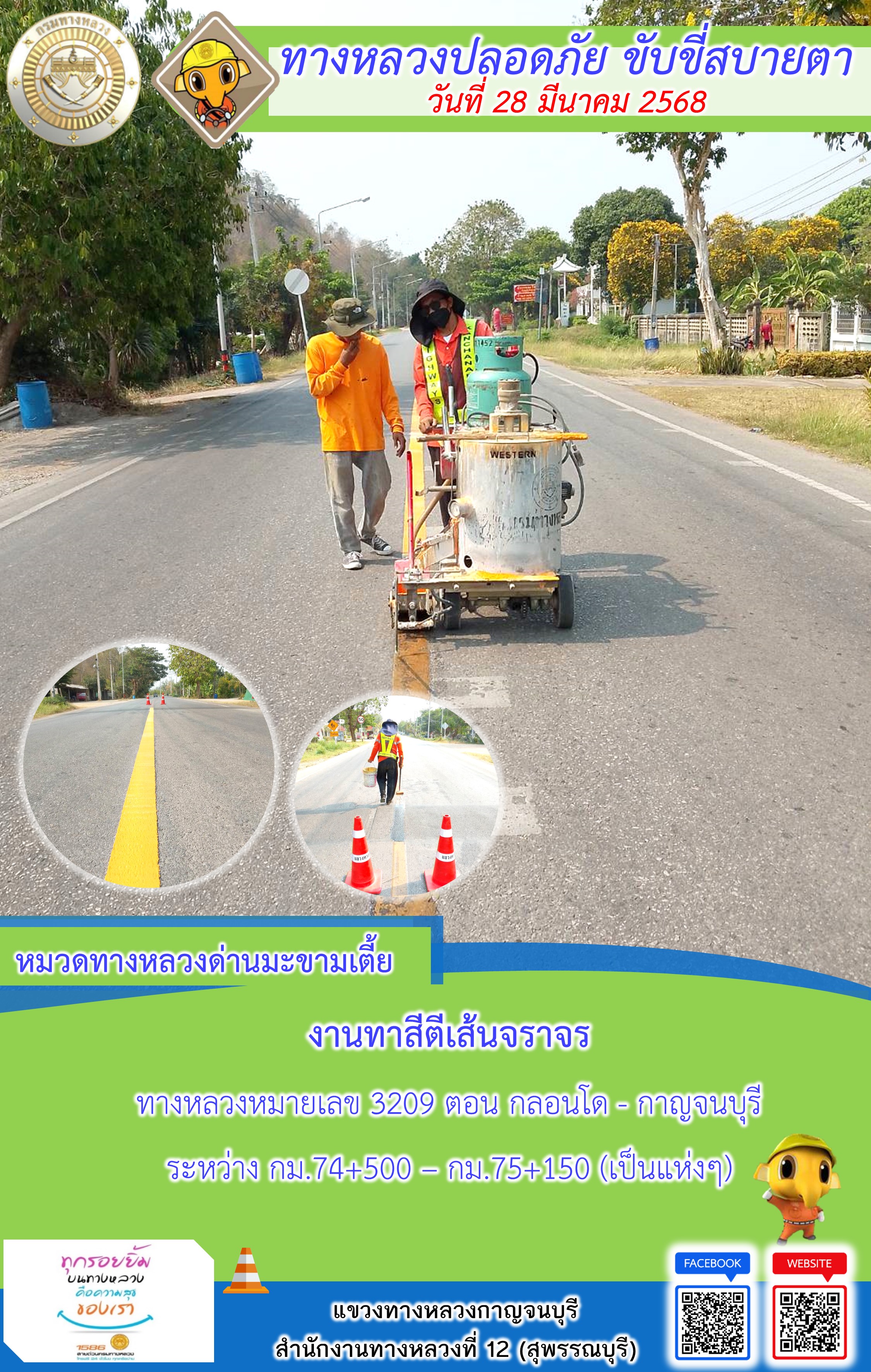 แขวงทางหลวงกาญจนบุรี โดยหมวดทางหลวงในสังกัด และงานอำนวยความปลอดภัยปฏิบัติงาน ประจำวันที่ 28 มี.ค. 68
