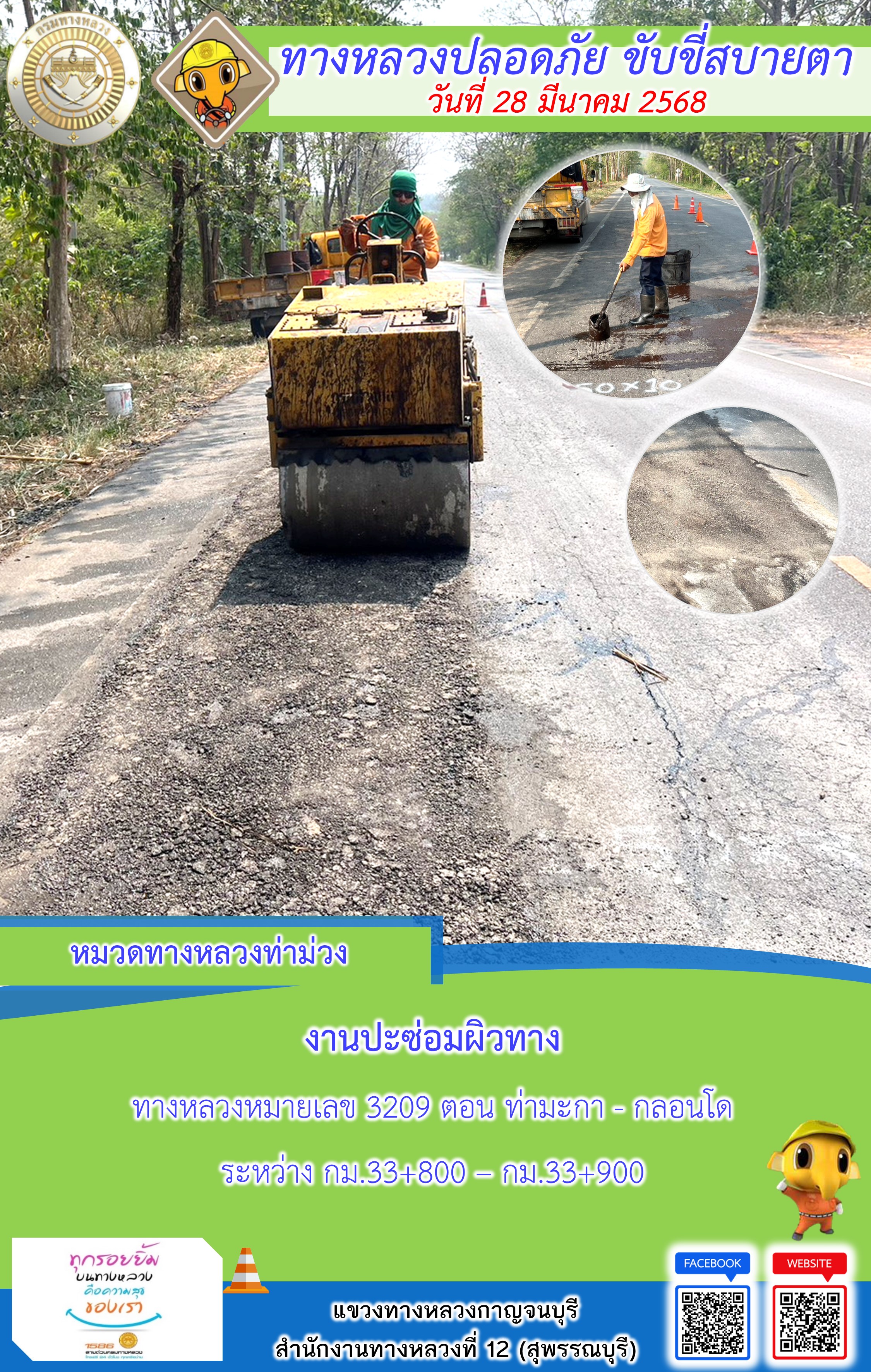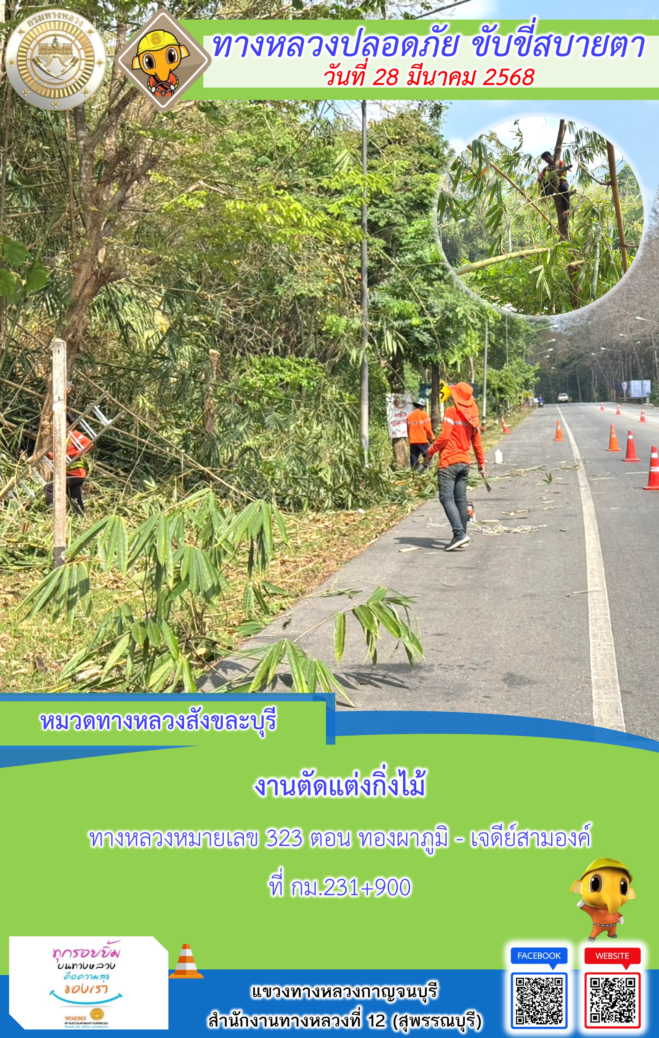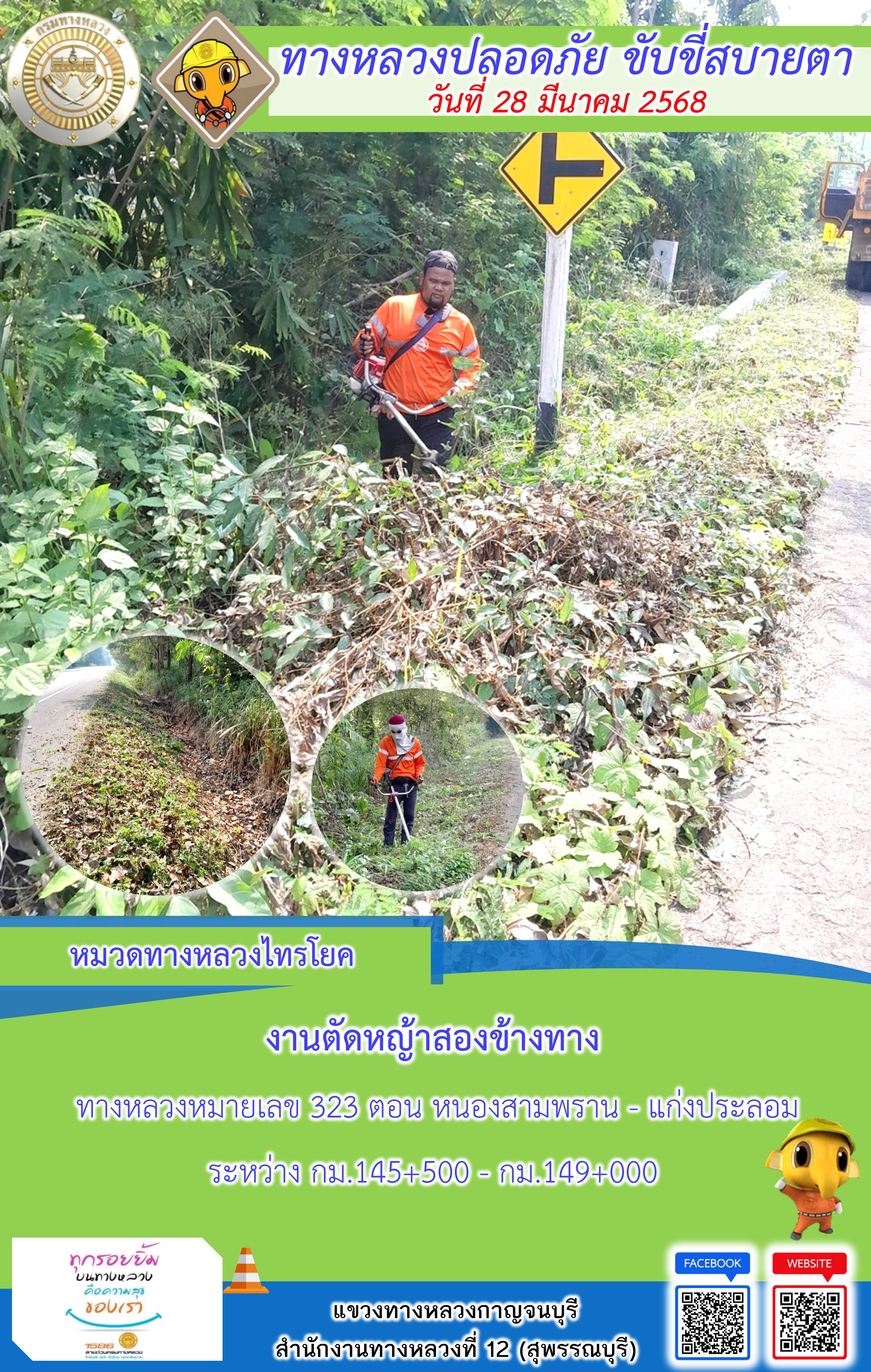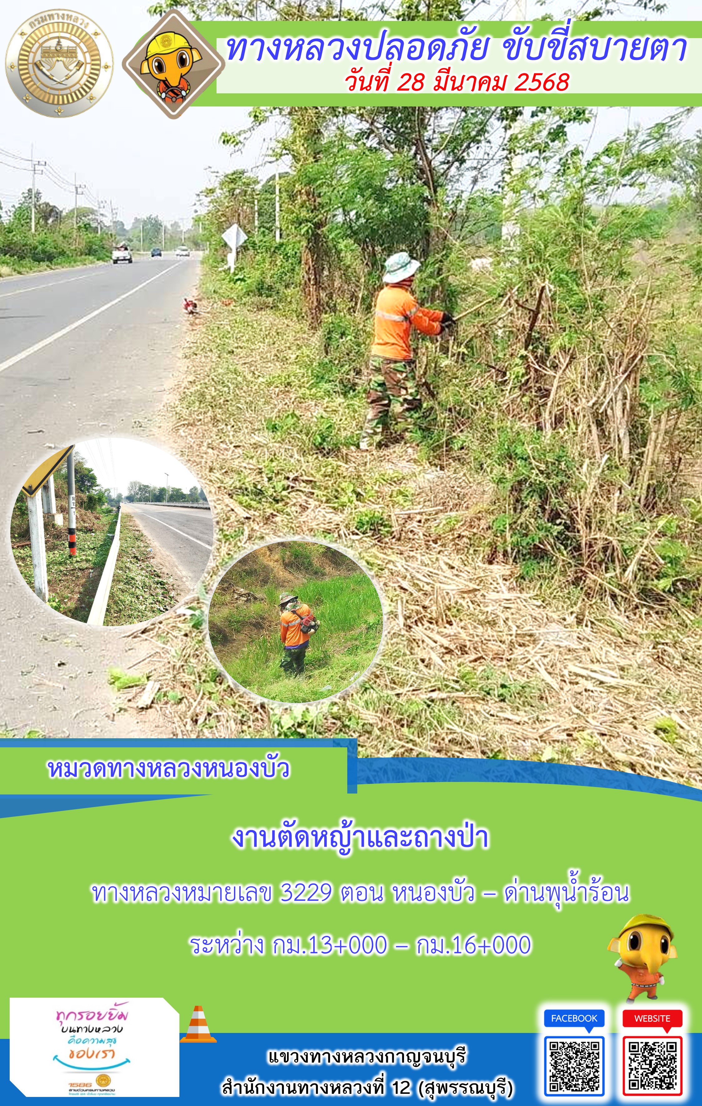 ข้อมูลภาพกิจกรรม : แขวงทางหลวงกาญจนบุรี โดยหมวดทางหลวงในสังกัด และงานอำนวยความปลอดภัยปฏิบัติงาน ประจำวันที่ 28 มี.ค. 68