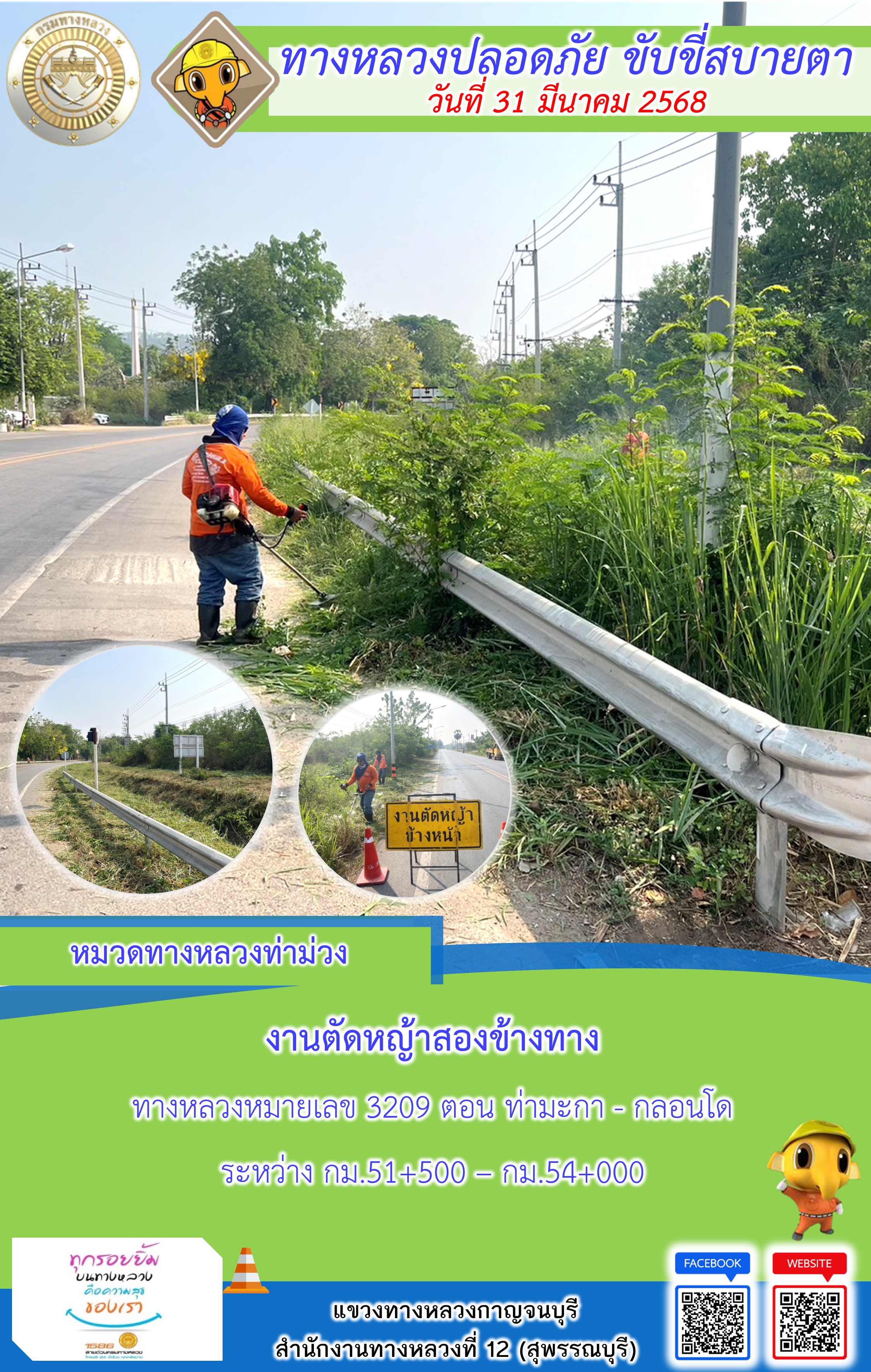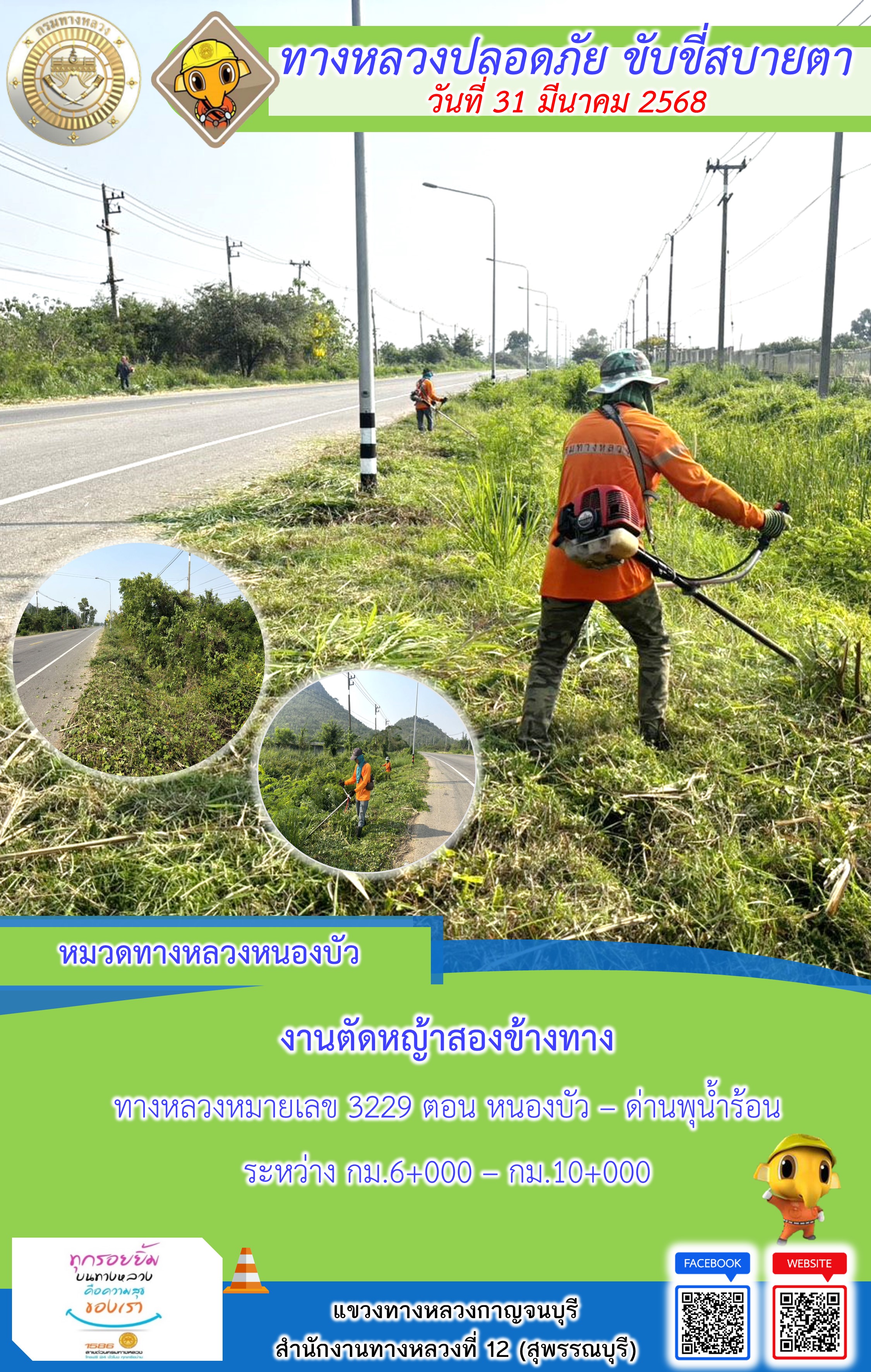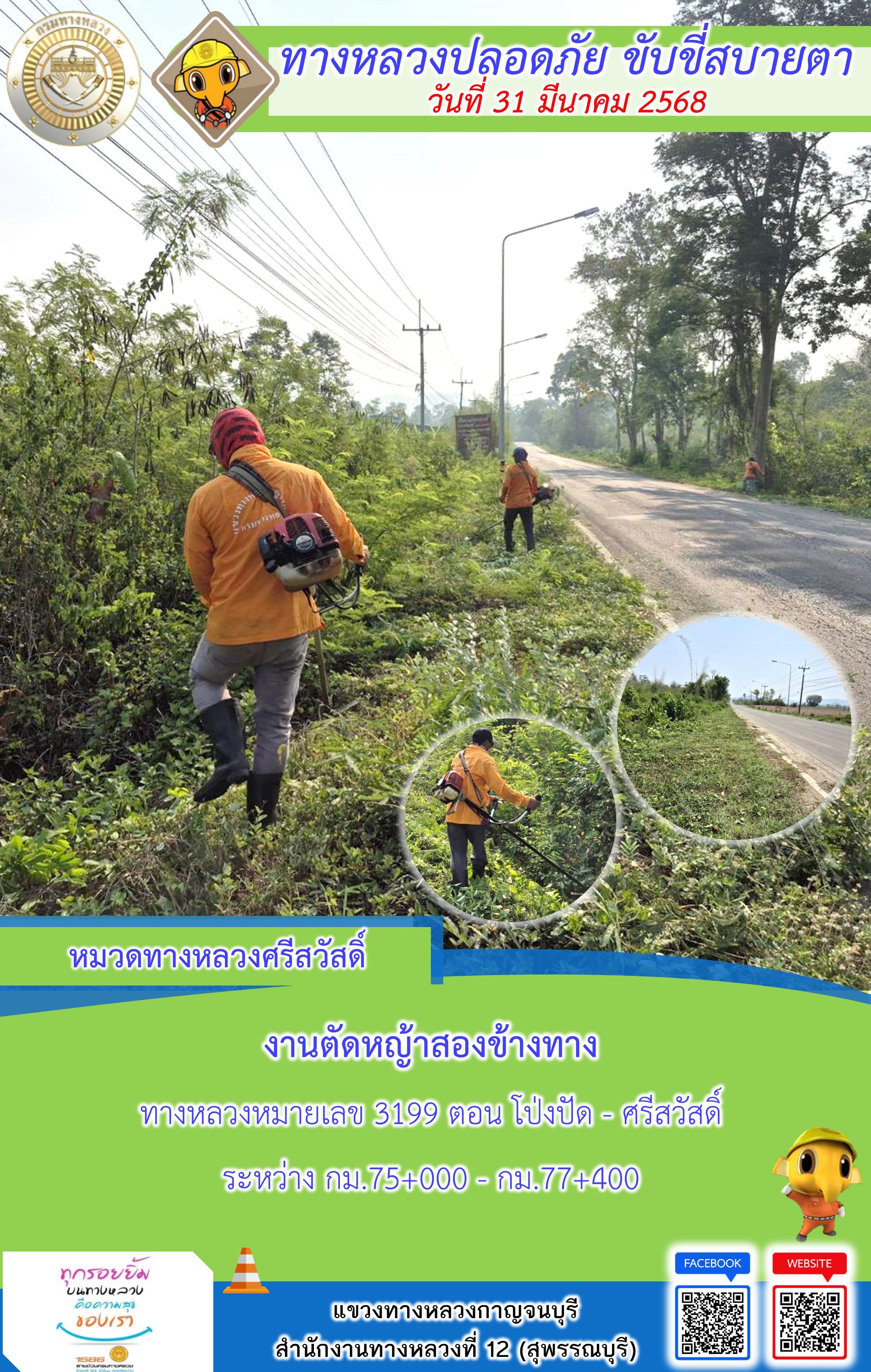 แขวงทางหลวงกาญจนบุรี โดยหมวดทางหลวงในสังกัด และงานอำนวยความปลอดภัยปฏิบัติงาน ประจำวันที่ 31 มี.ค. 68