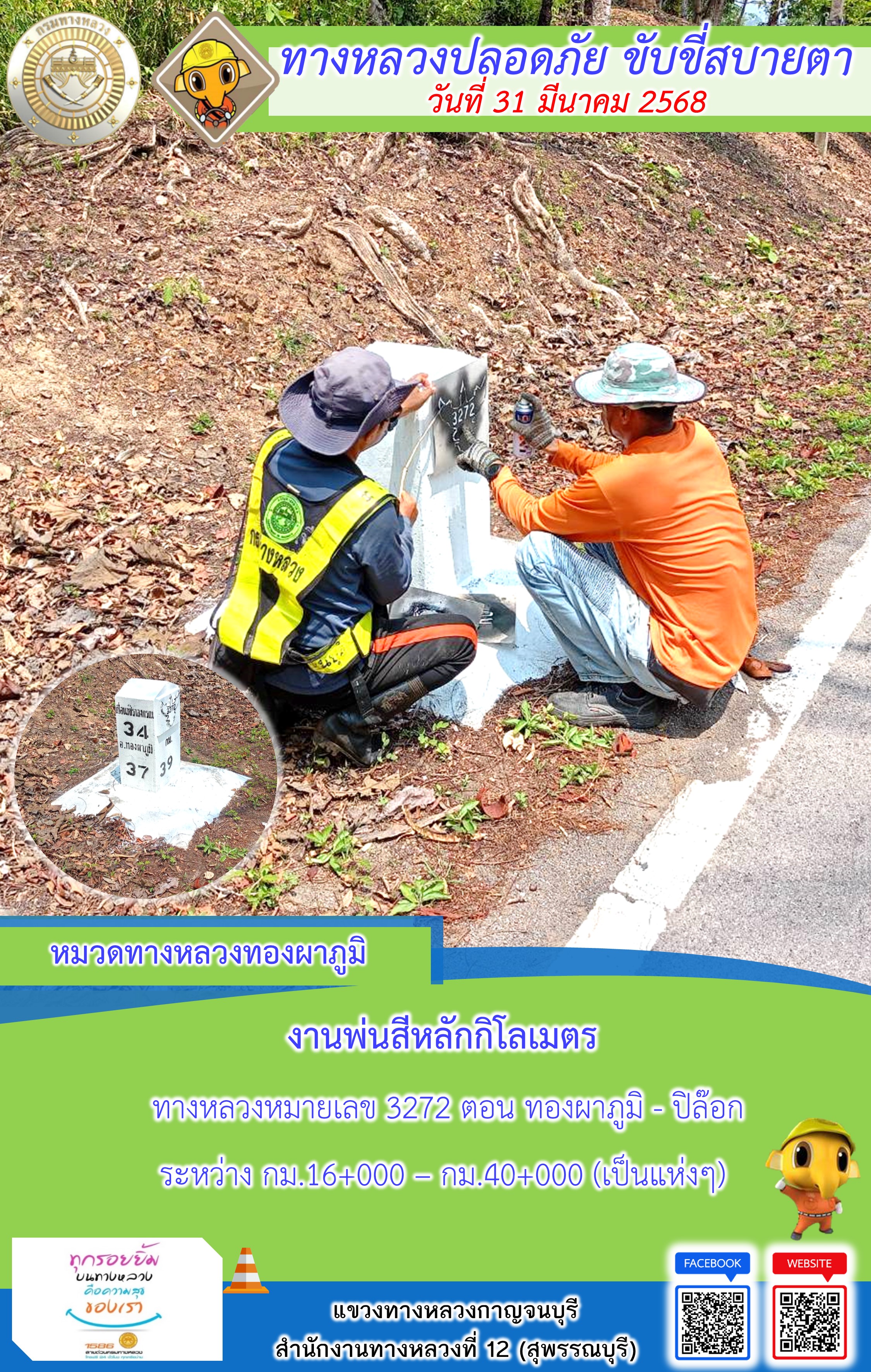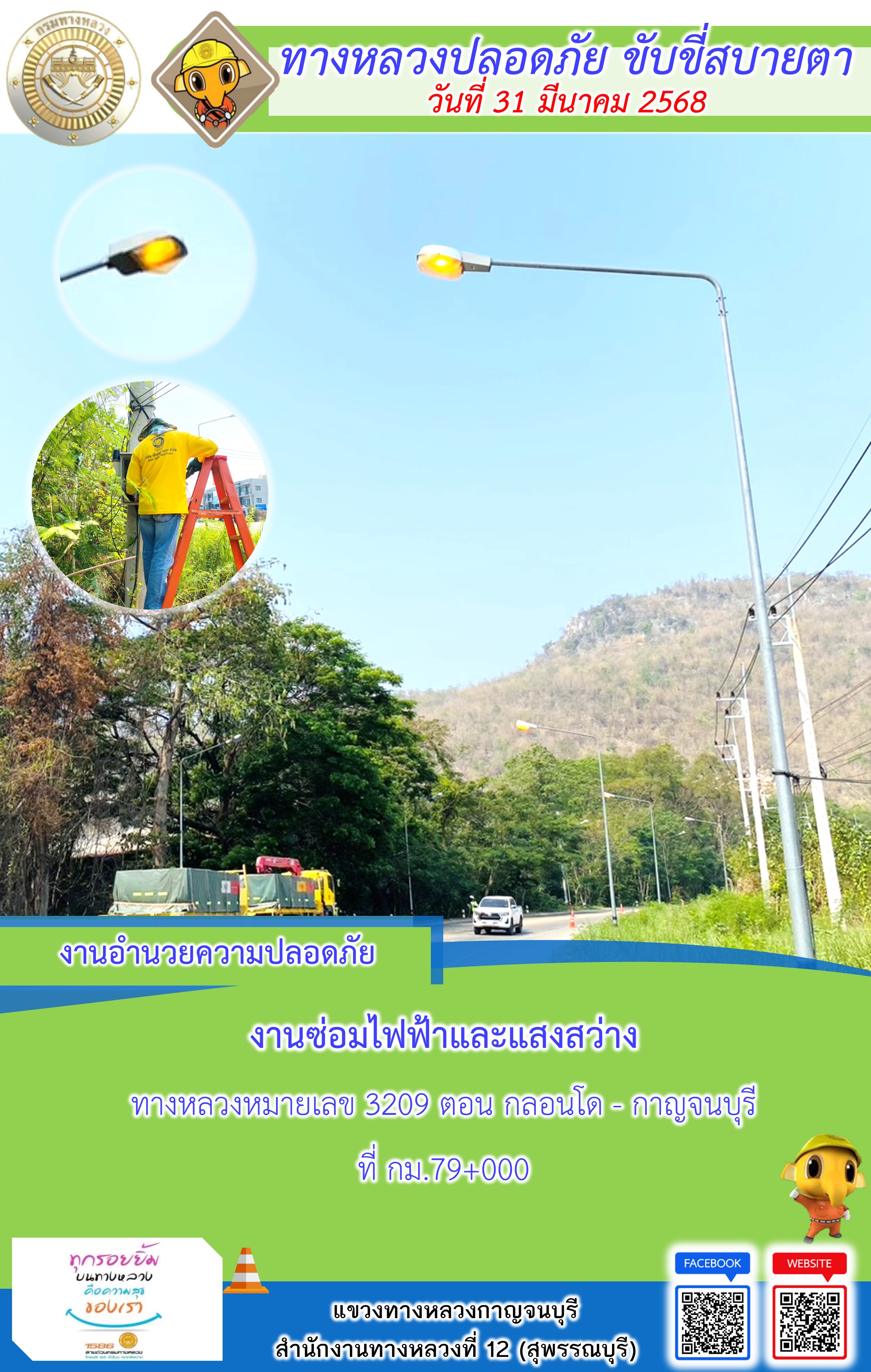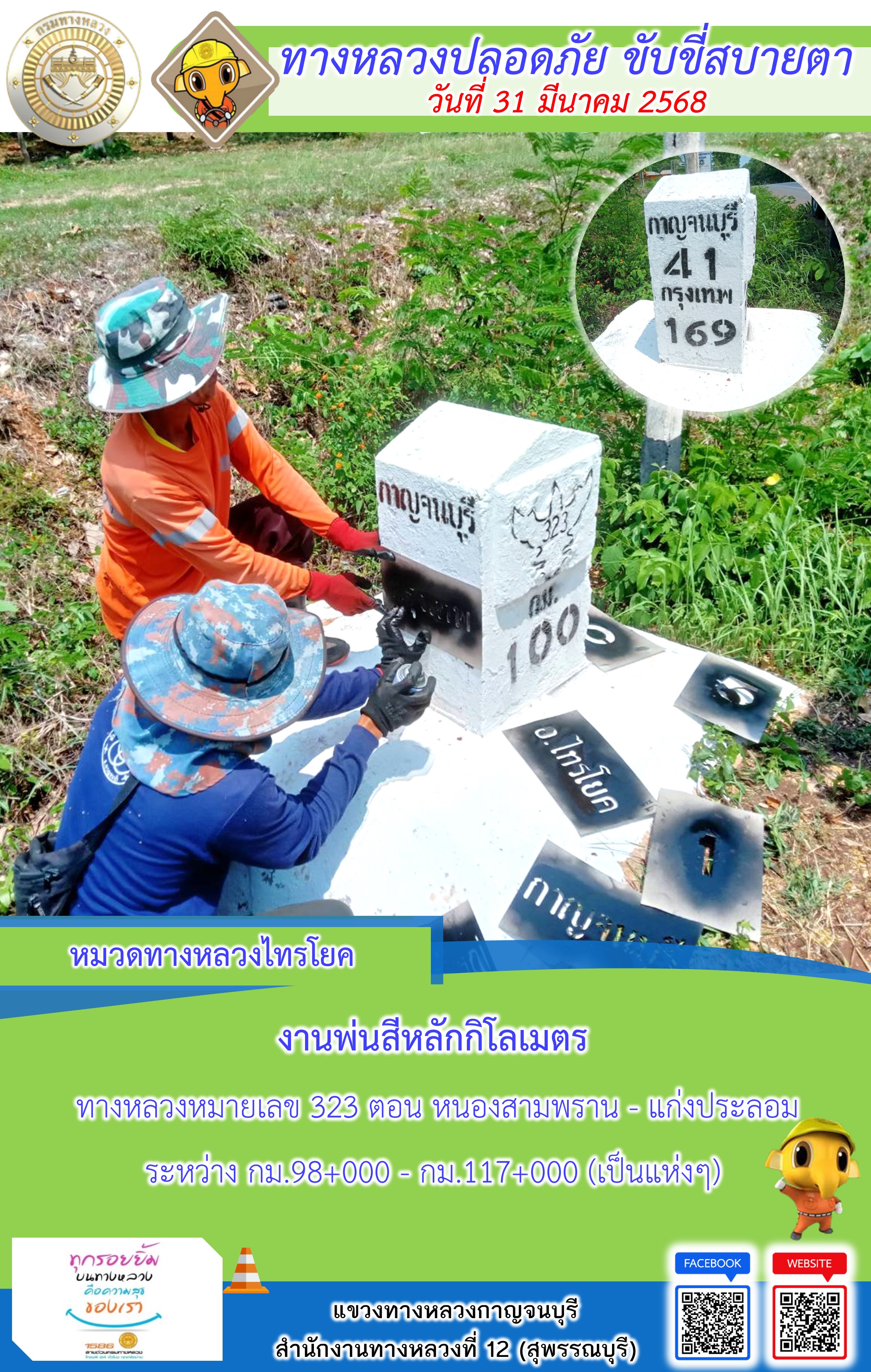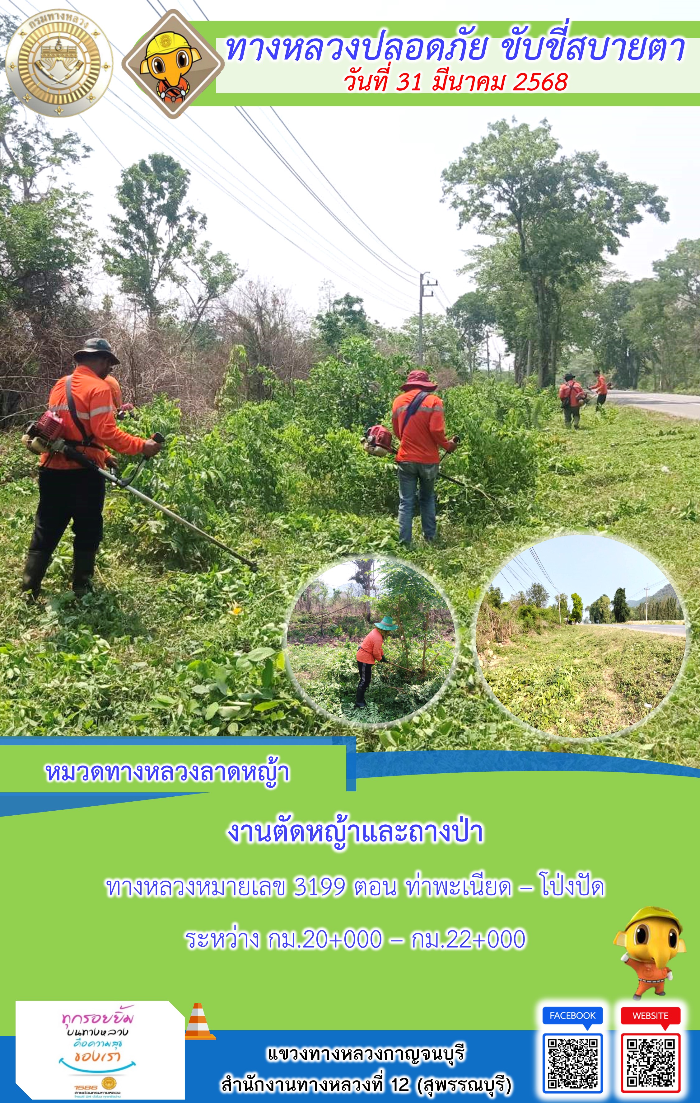 แขวงทางหลวงกาญจนบุรี โดยหมวดทางหลวงในสังกัด และงานอำนวยความปลอดภัยปฏิบัติงาน ประจำวันที่ 31 มี.ค. 68
