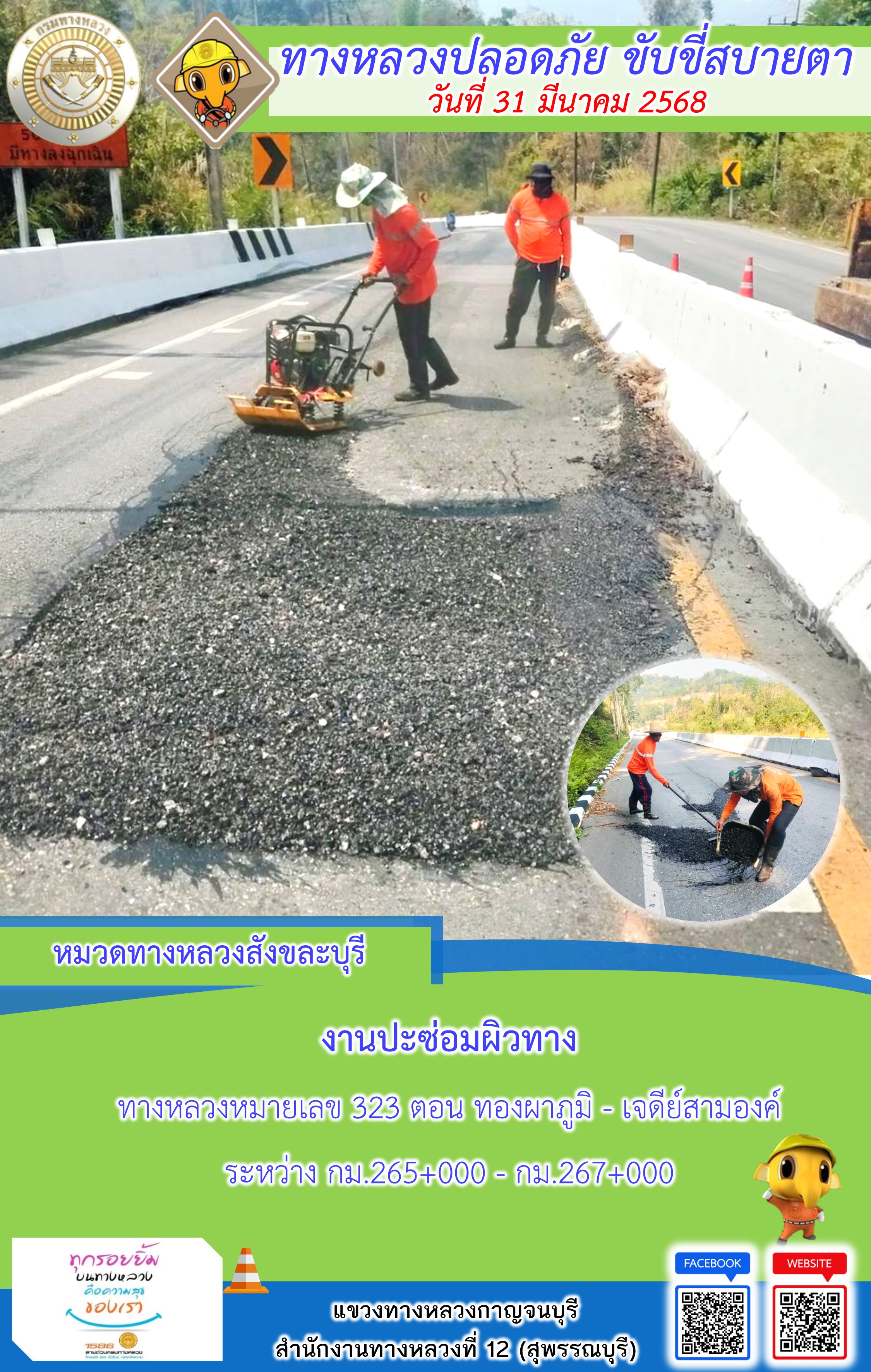 ข้อมูลภาพกิจกรรม : แขวงทางหลวงกาญจนบุรี โดยหมวดทางหลวงในสังกัด และงานอำนวยความปลอดภัยปฏิบัติงาน ประจำวันที่ 31 มี.ค. 68