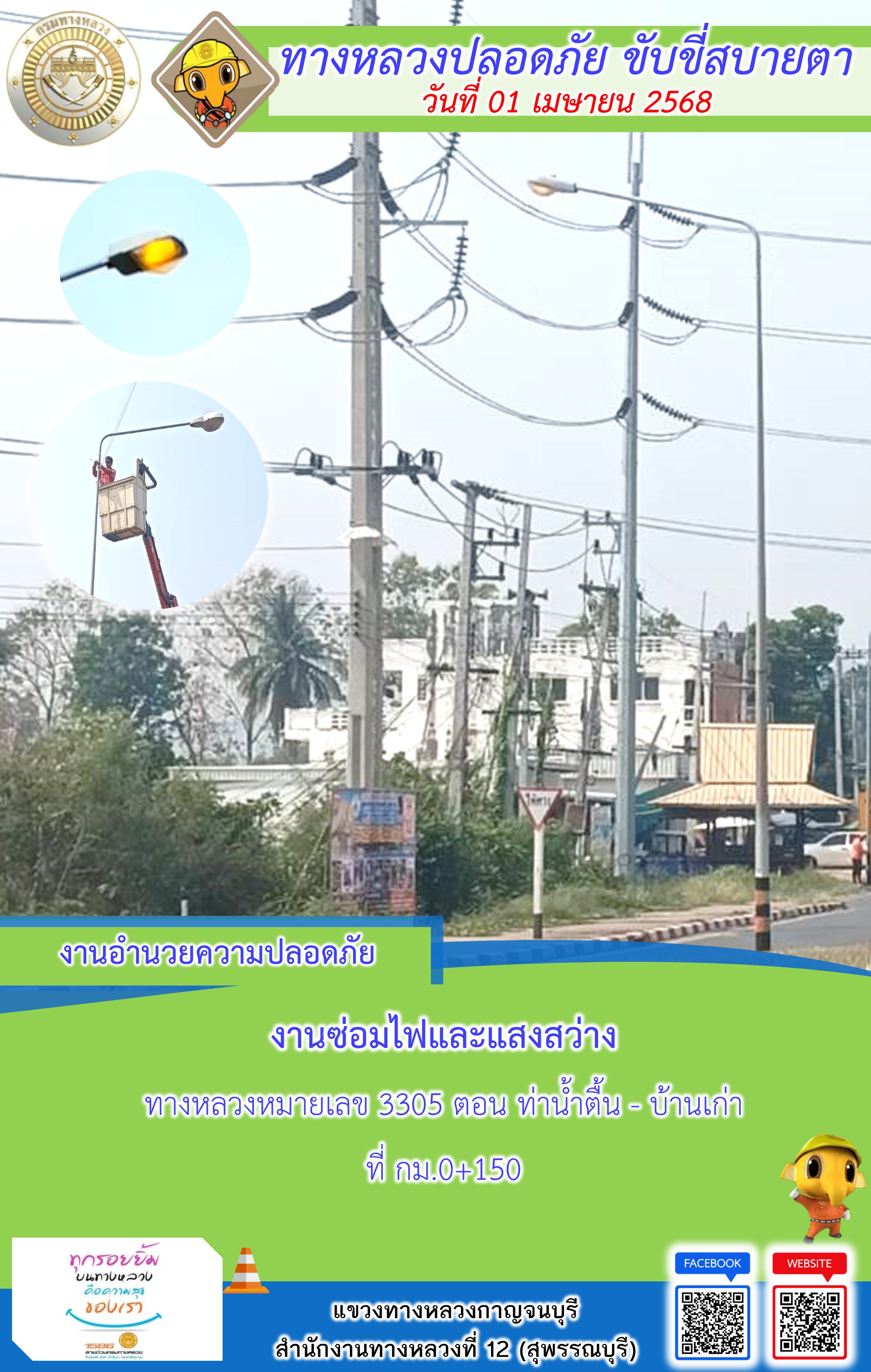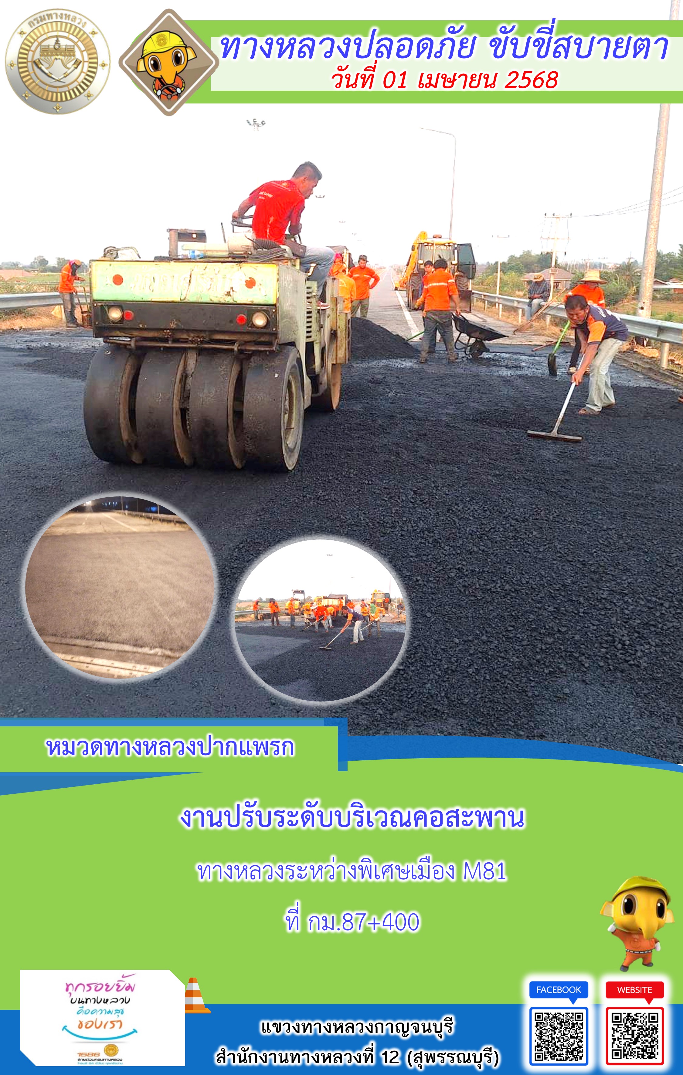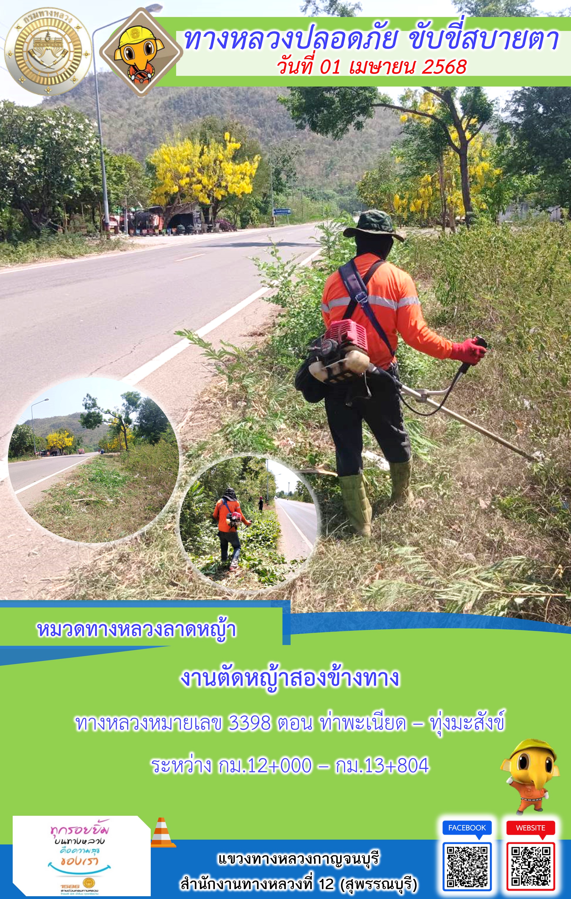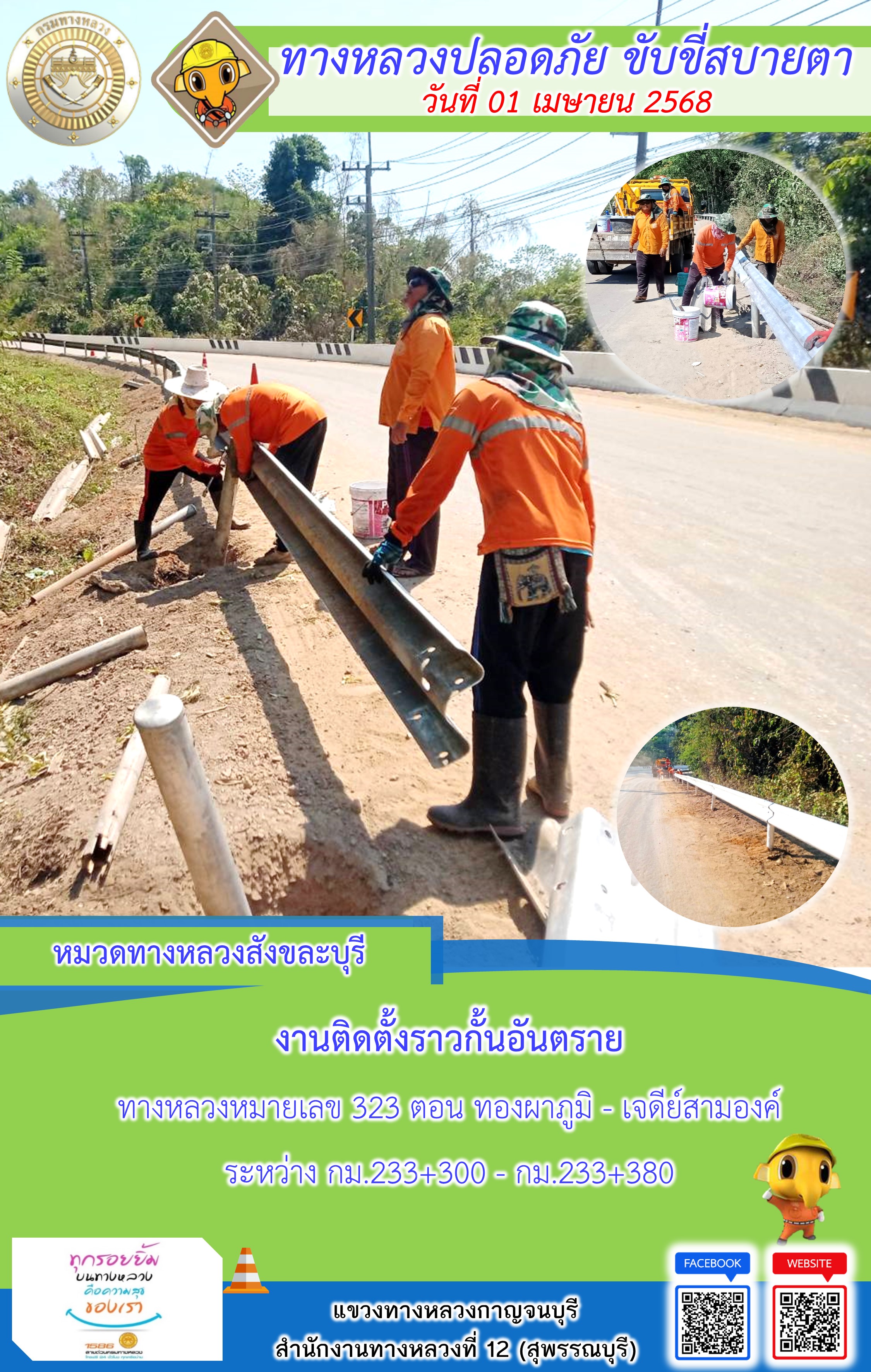 ข้อมูลภาพกิจกรรม : แขวงทางหลวงกาญจนบุรี โดยหมวดทางหลวงในสังกัด และงานอำนวยความปลอดภัยปฏิบัติงาน ประจำวันที่ 1 เม.ย. 68