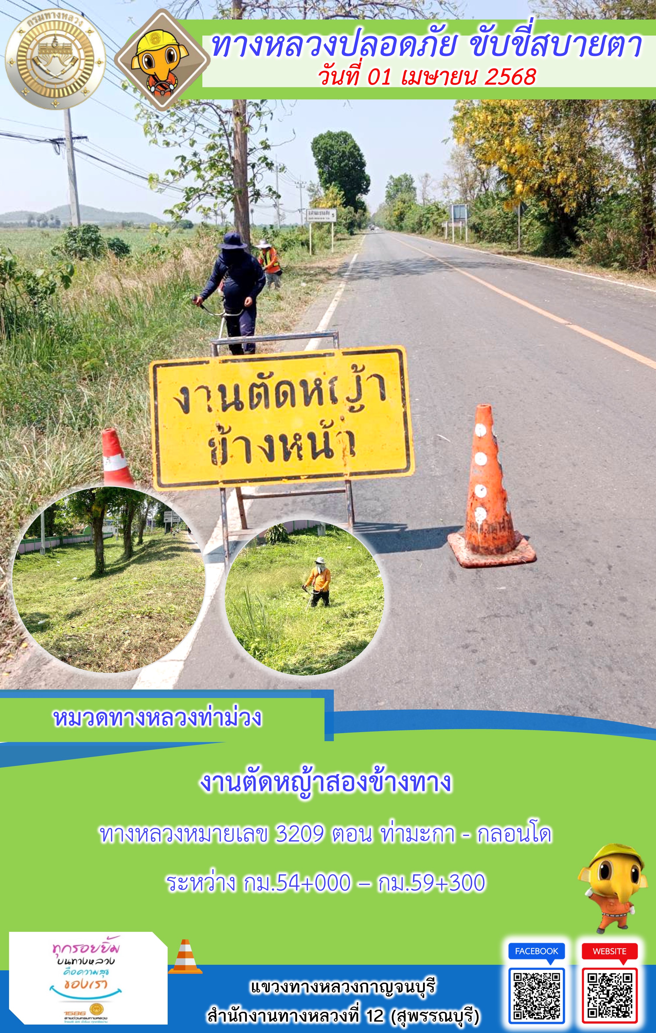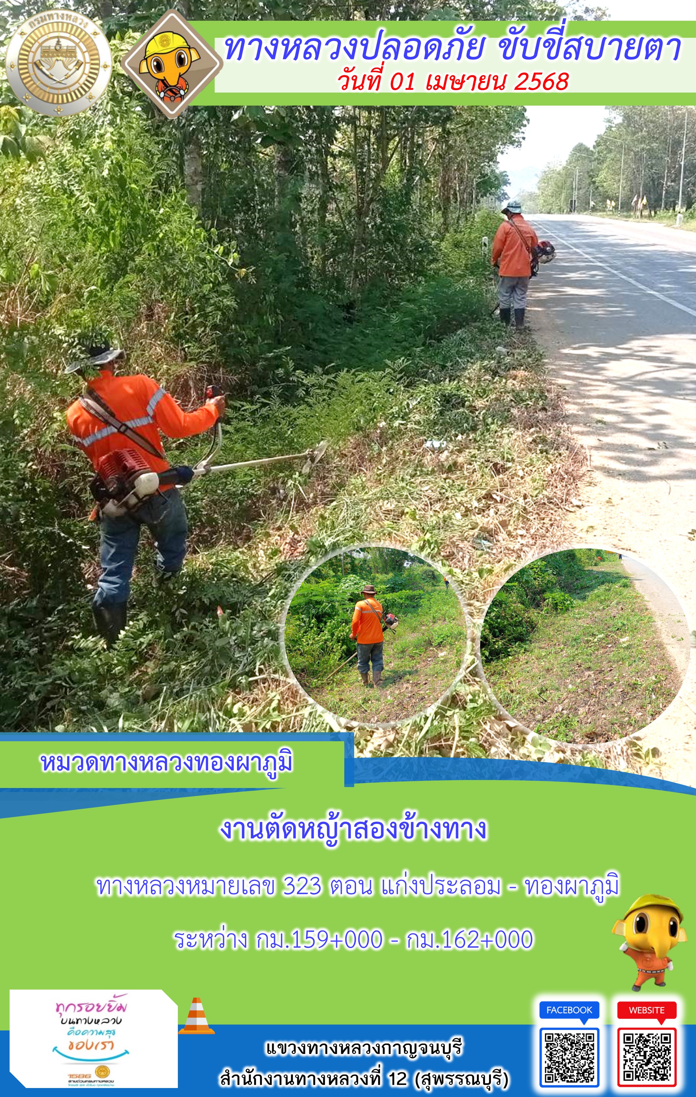 แขวงทางหลวงกาญจนบุรี โดยหมวดทางหลวงในสังกัด และงานอำนวยความปลอดภัยปฏิบัติงาน ประจำวันที่ 1 เม.ย. 68