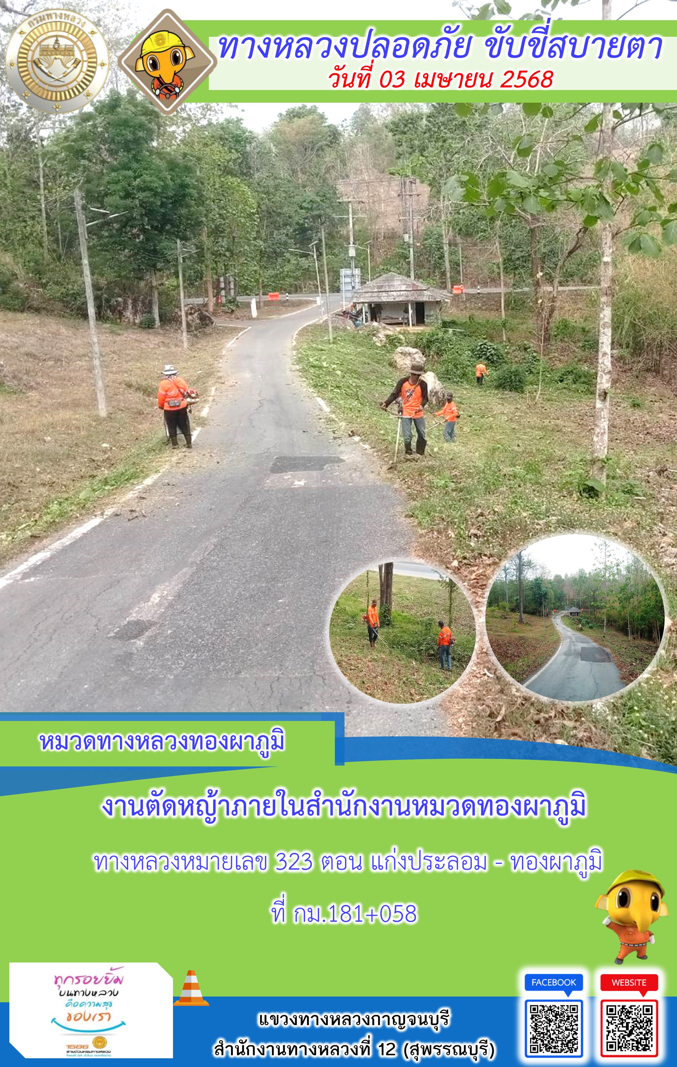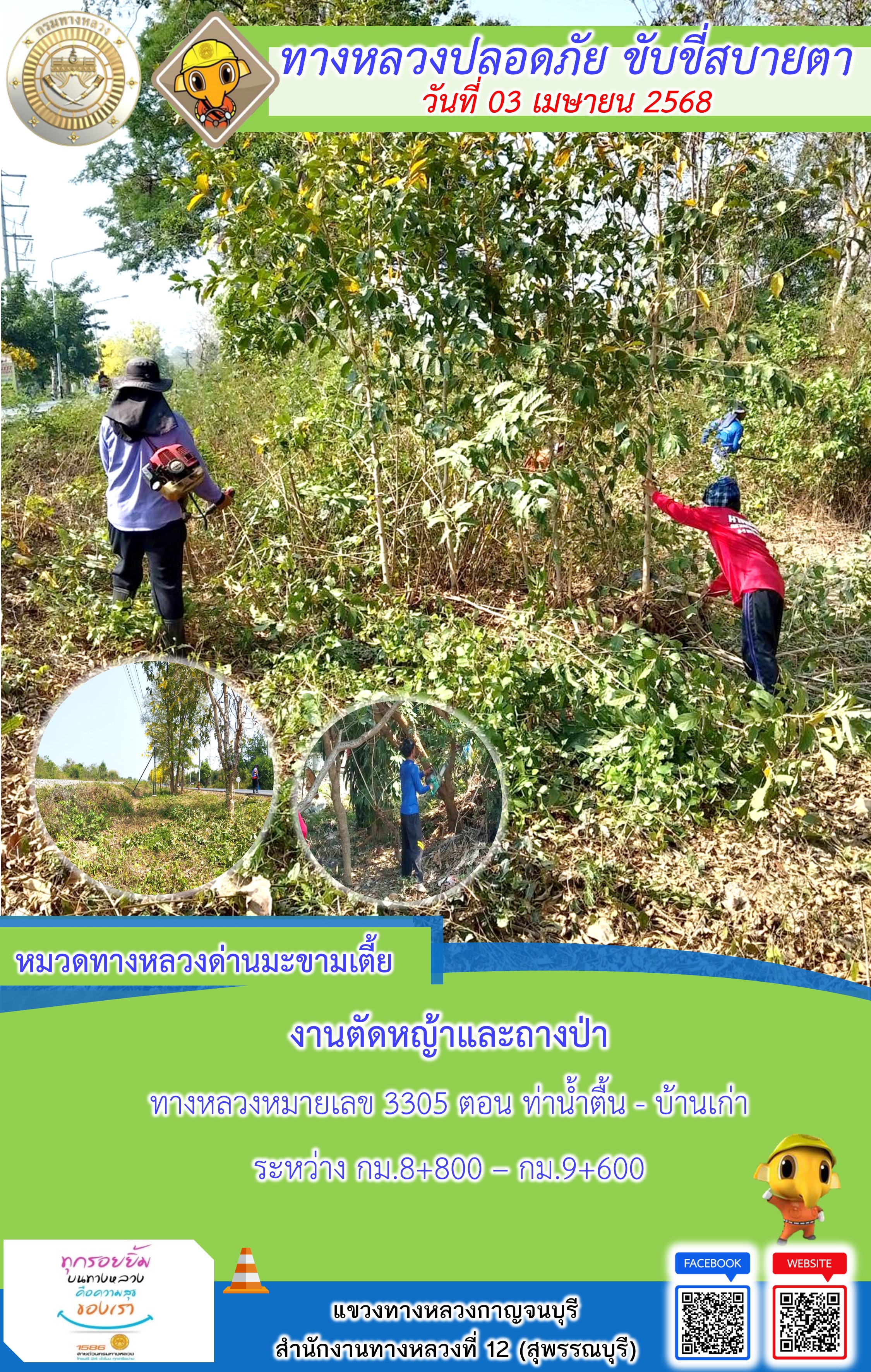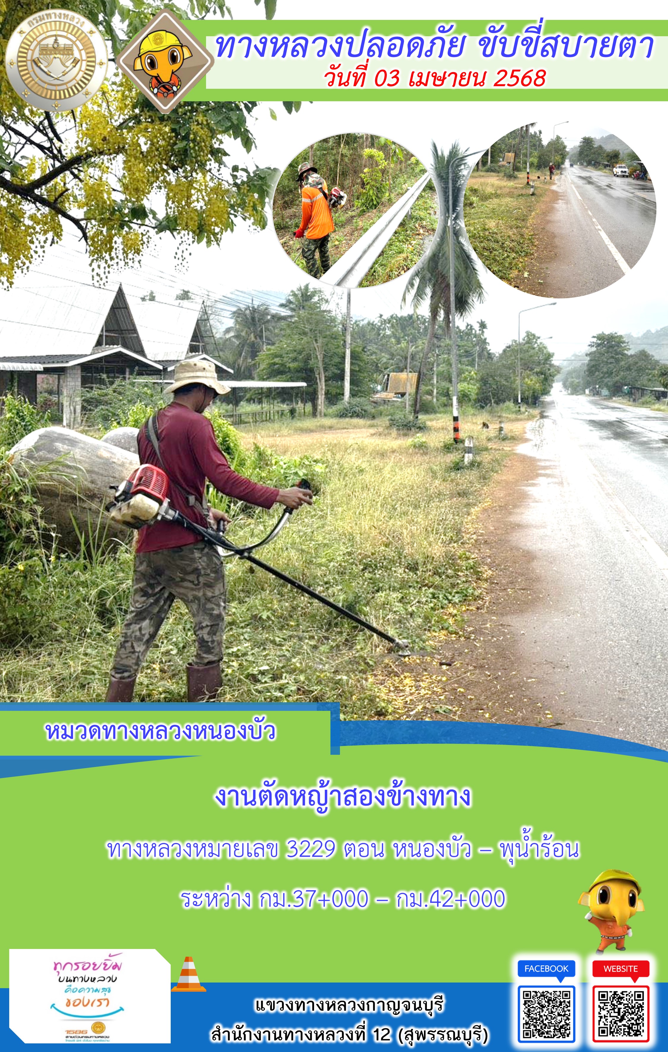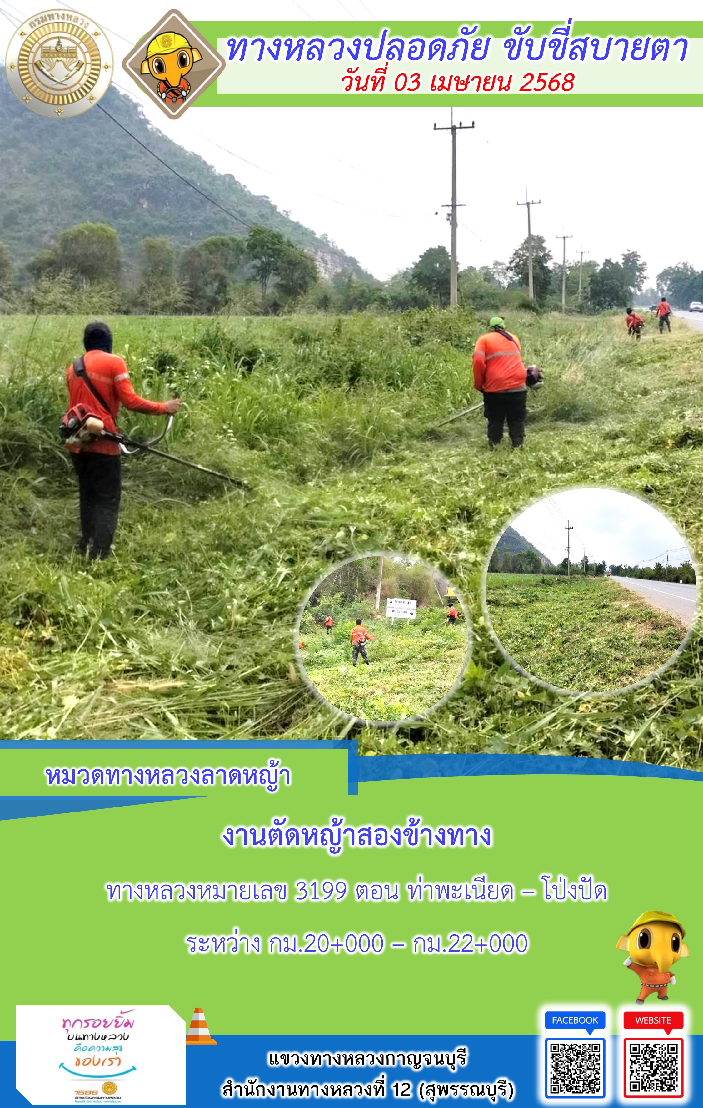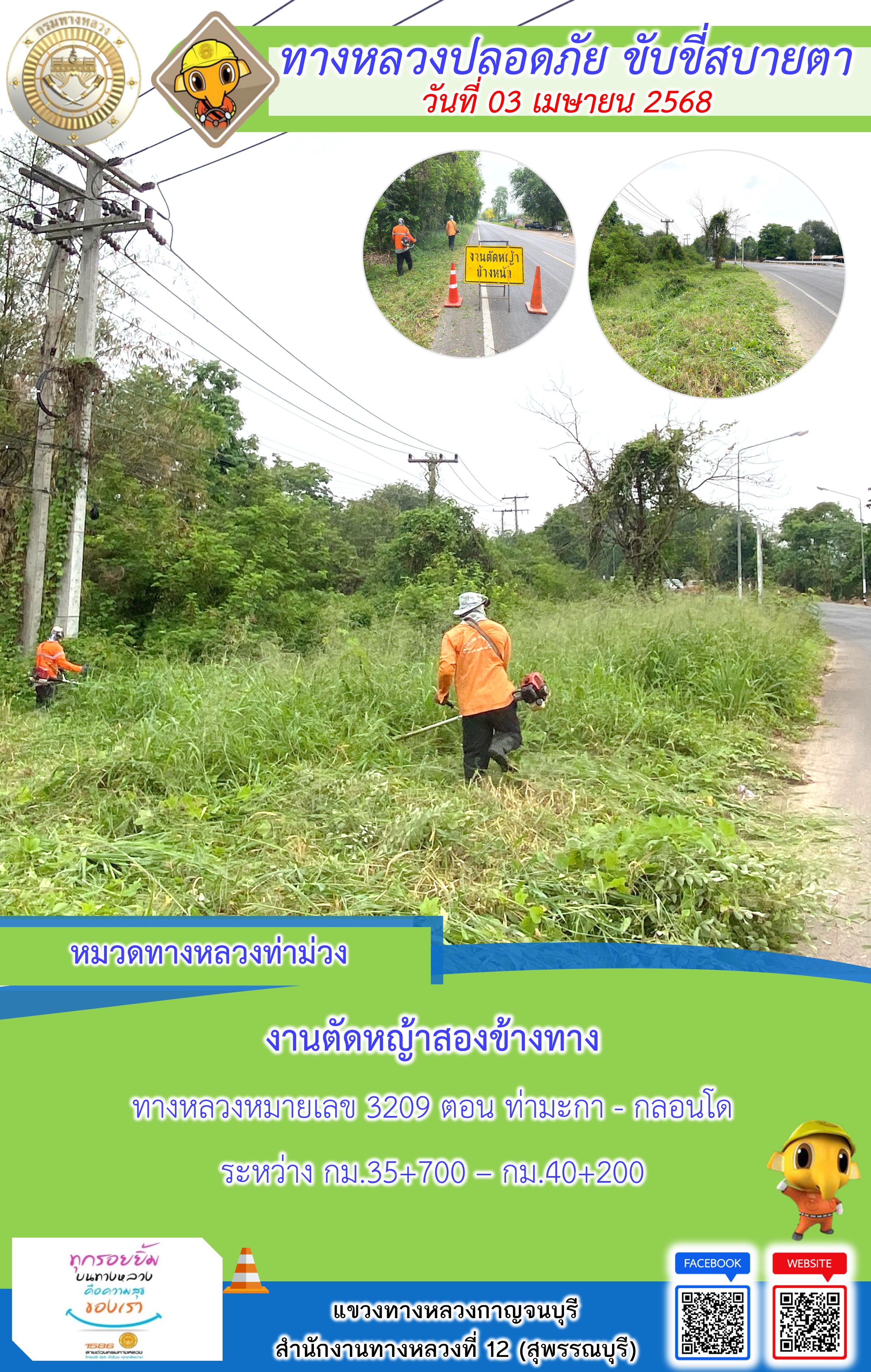 ข้อมูลภาพกิจกรรม : แขวงทางหลวงกาญจนบุรี โดยหมวดทางหลวงในสังกัด และงานอำนวยความปลอดภัยปฏิบัติงาน ประจำวันที่ 3 เม.ย. 68