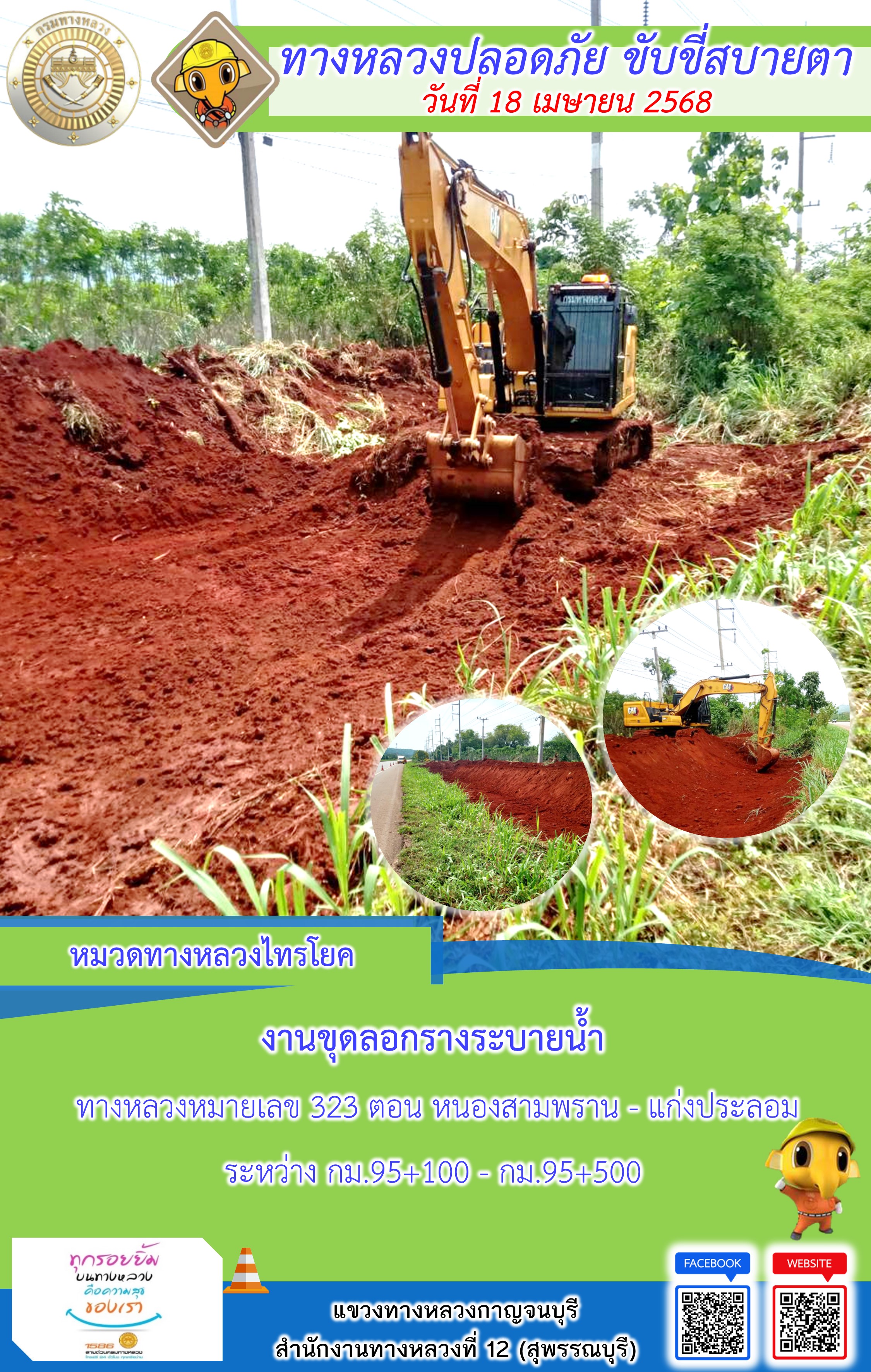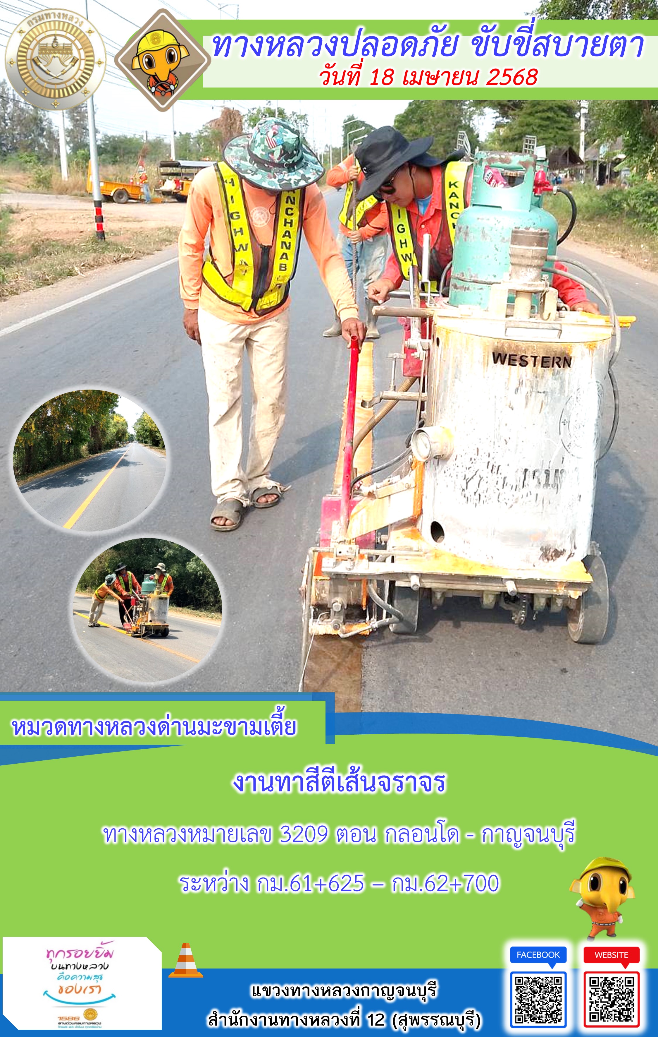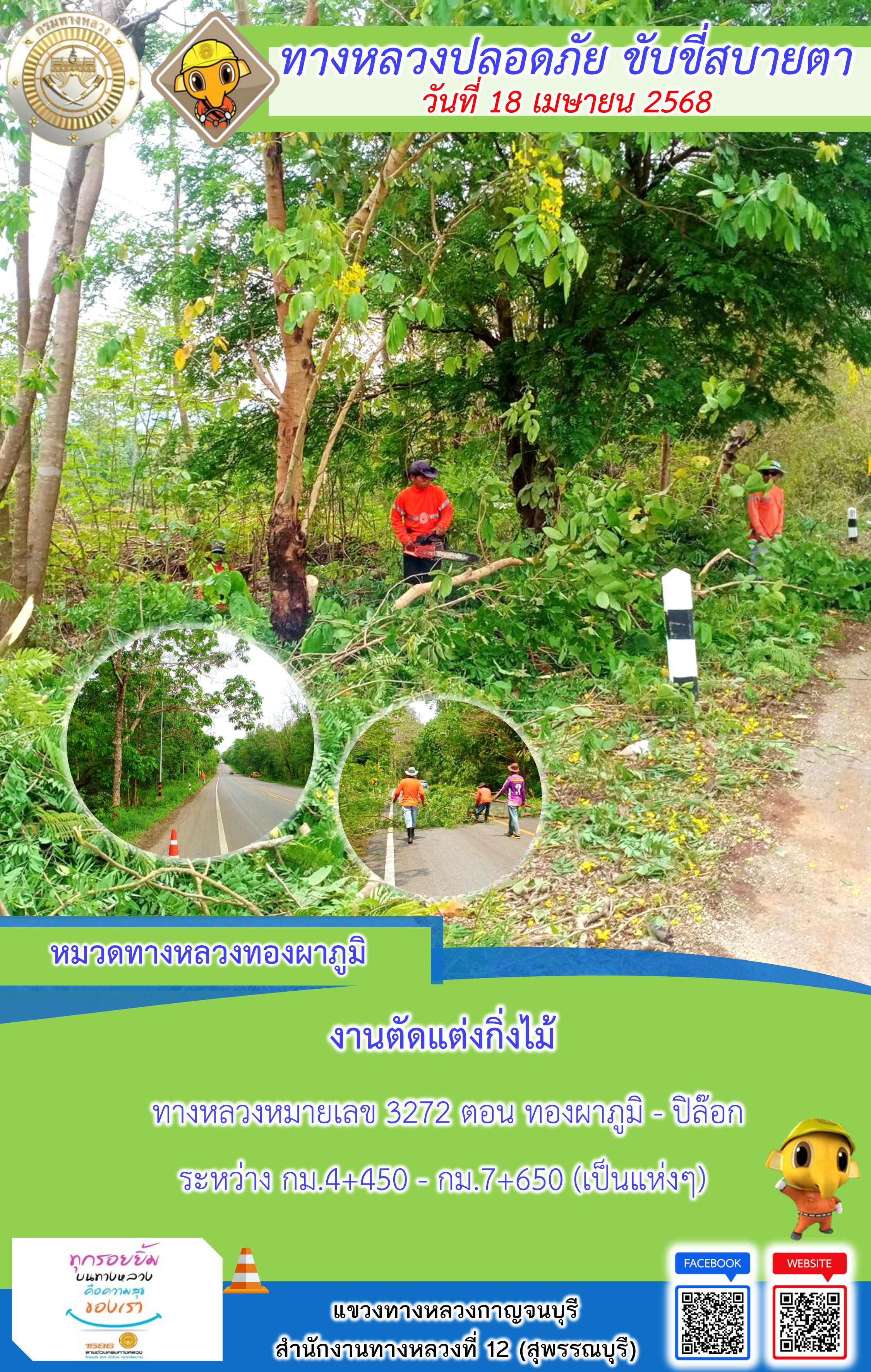 แขวงทางหลวงกาญจนบุรี โดยหมวดทางหลวงในสังกัด และงานอำนวยความปลอดภัยปฏิบัติงาน ประจำวันที่ 18 เม.ย. 68