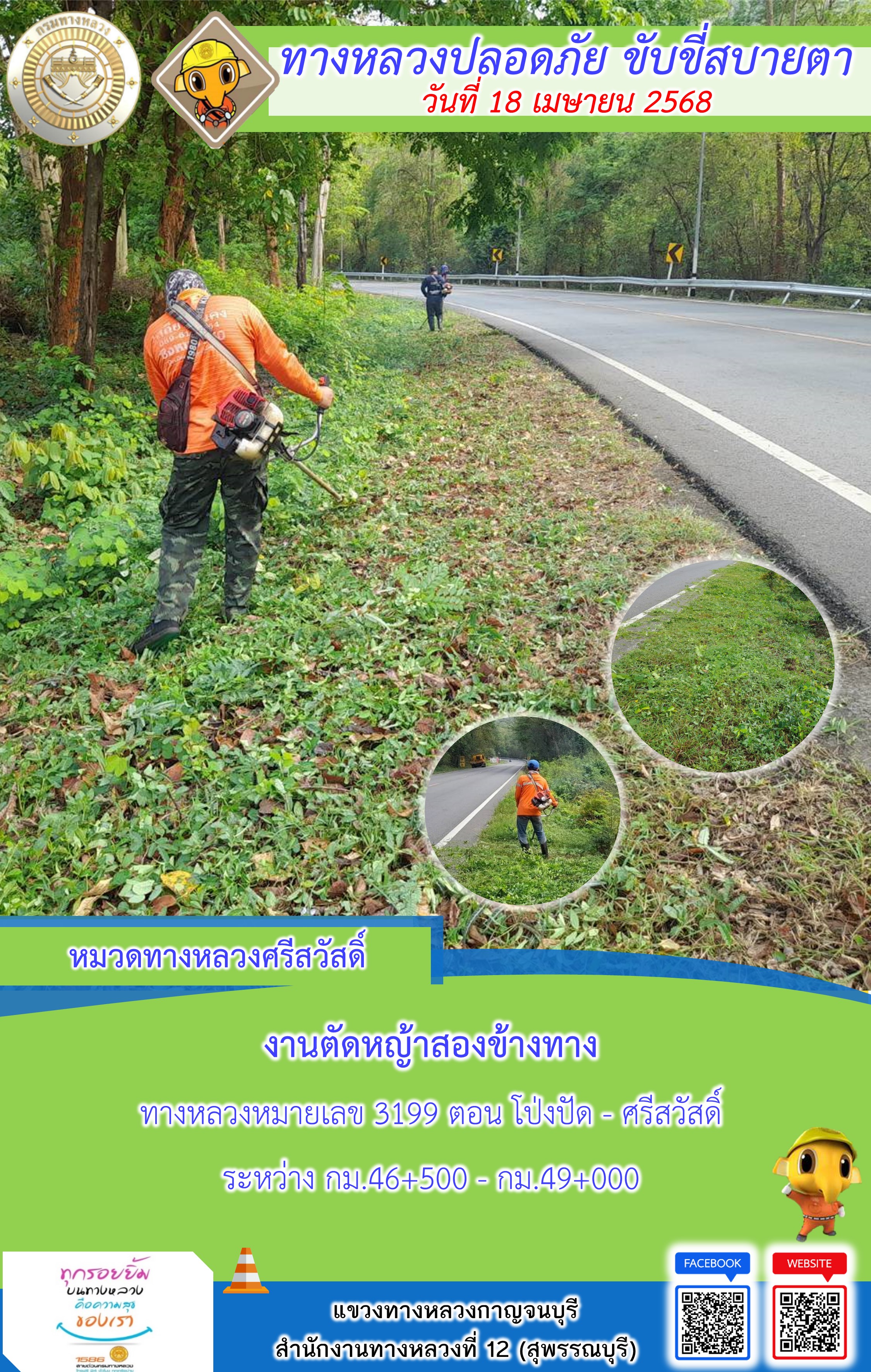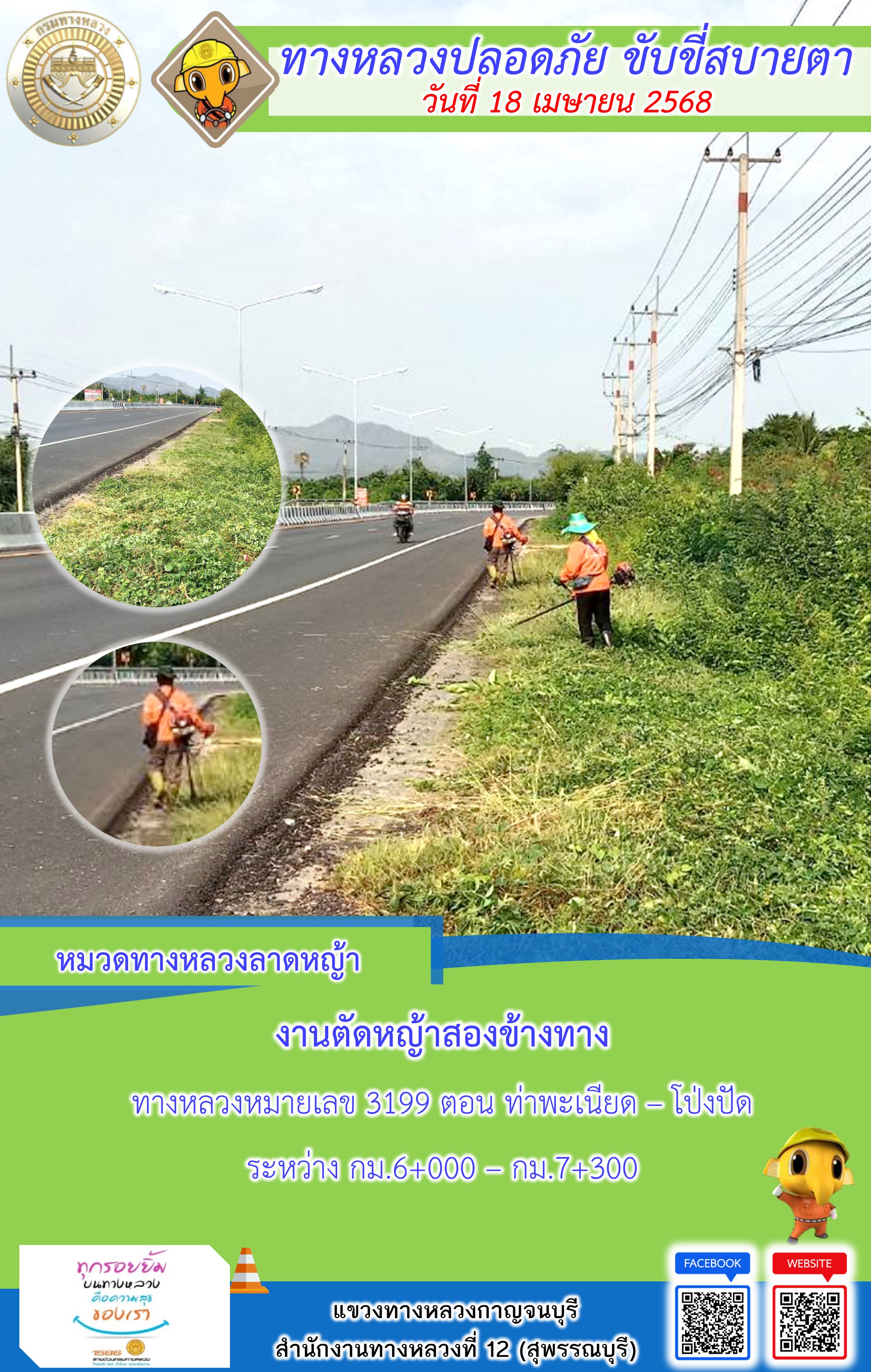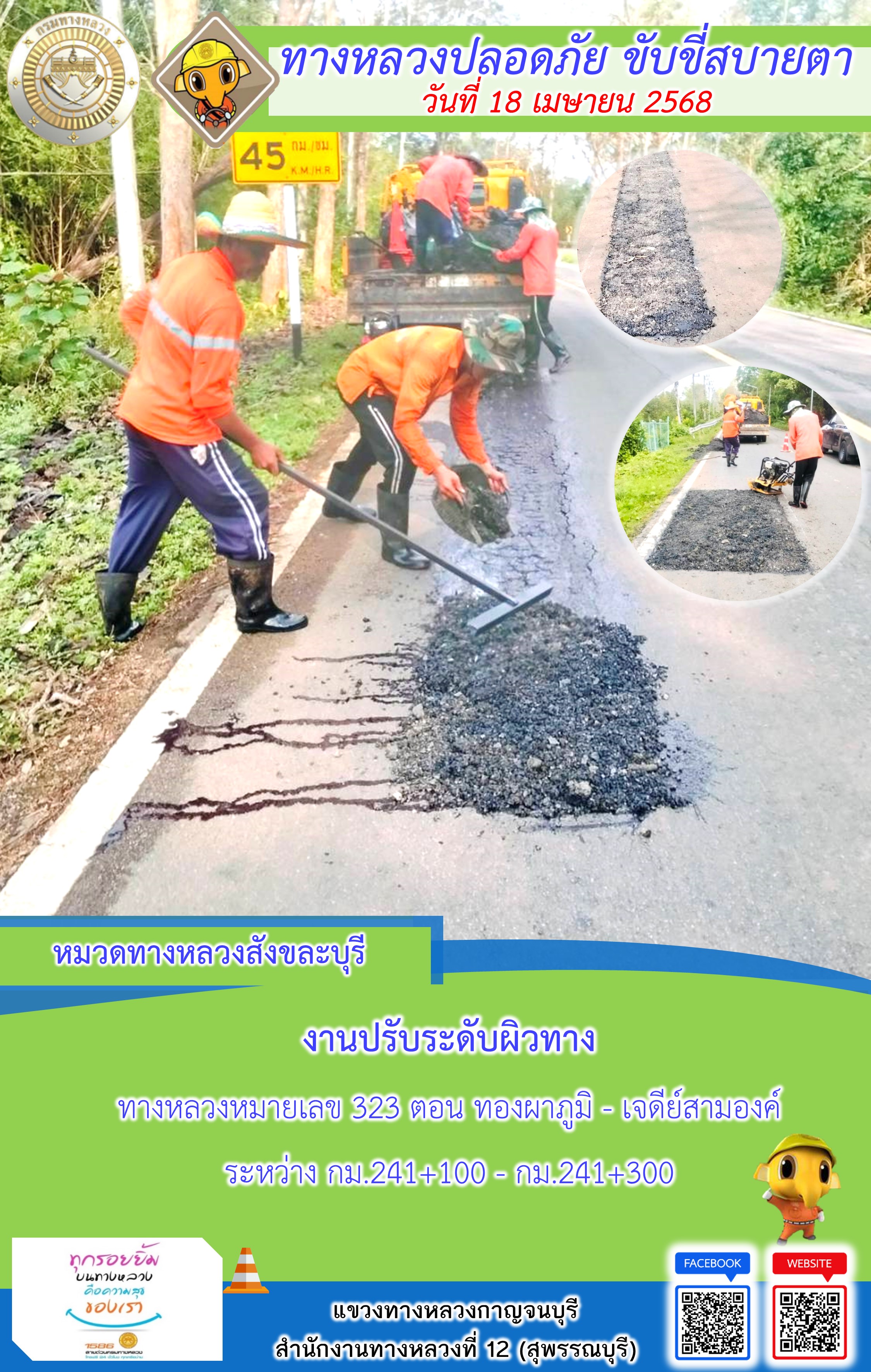 ข้อมูลภาพกิจกรรม : แขวงทางหลวงกาญจนบุรี โดยหมวดทางหลวงในสังกัด และงานอำนวยความปลอดภัยปฏิบัติงาน ประจำวันที่ 18 เม.ย. 68
