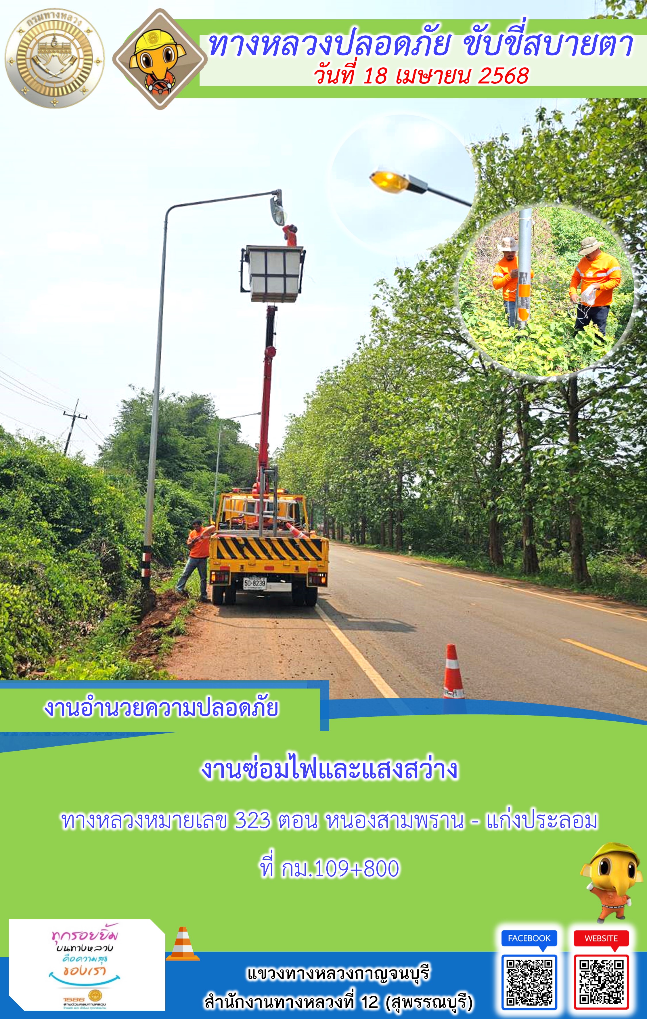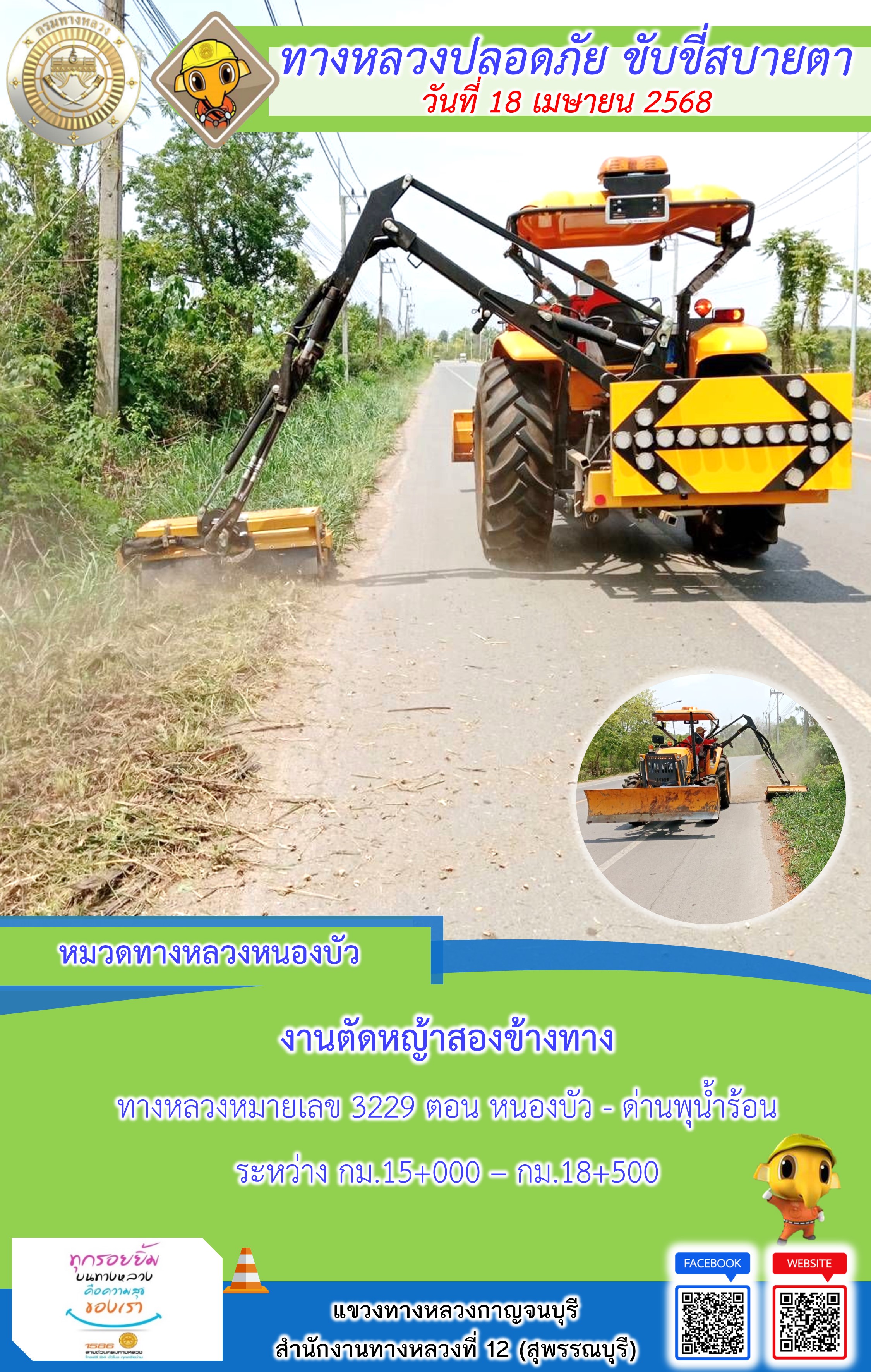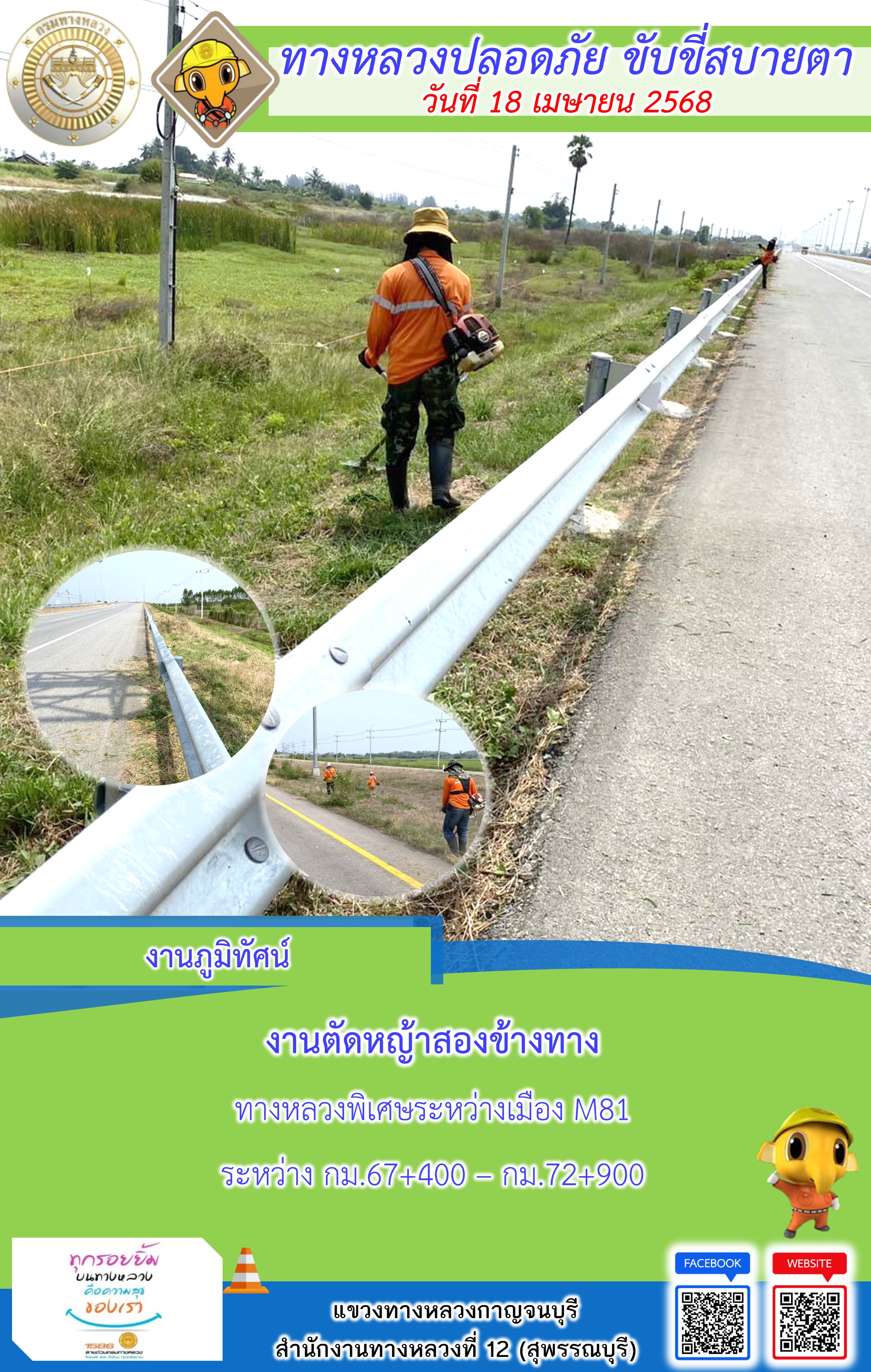 ข้อมูลภาพกิจกรรม : แขวงทางหลวงกาญจนบุรี โดยหมวดทางหลวงในสังกัด และงานอำนวยความปลอดภัยปฏิบัติงาน ประจำวันที่ 18 เม.ย. 68