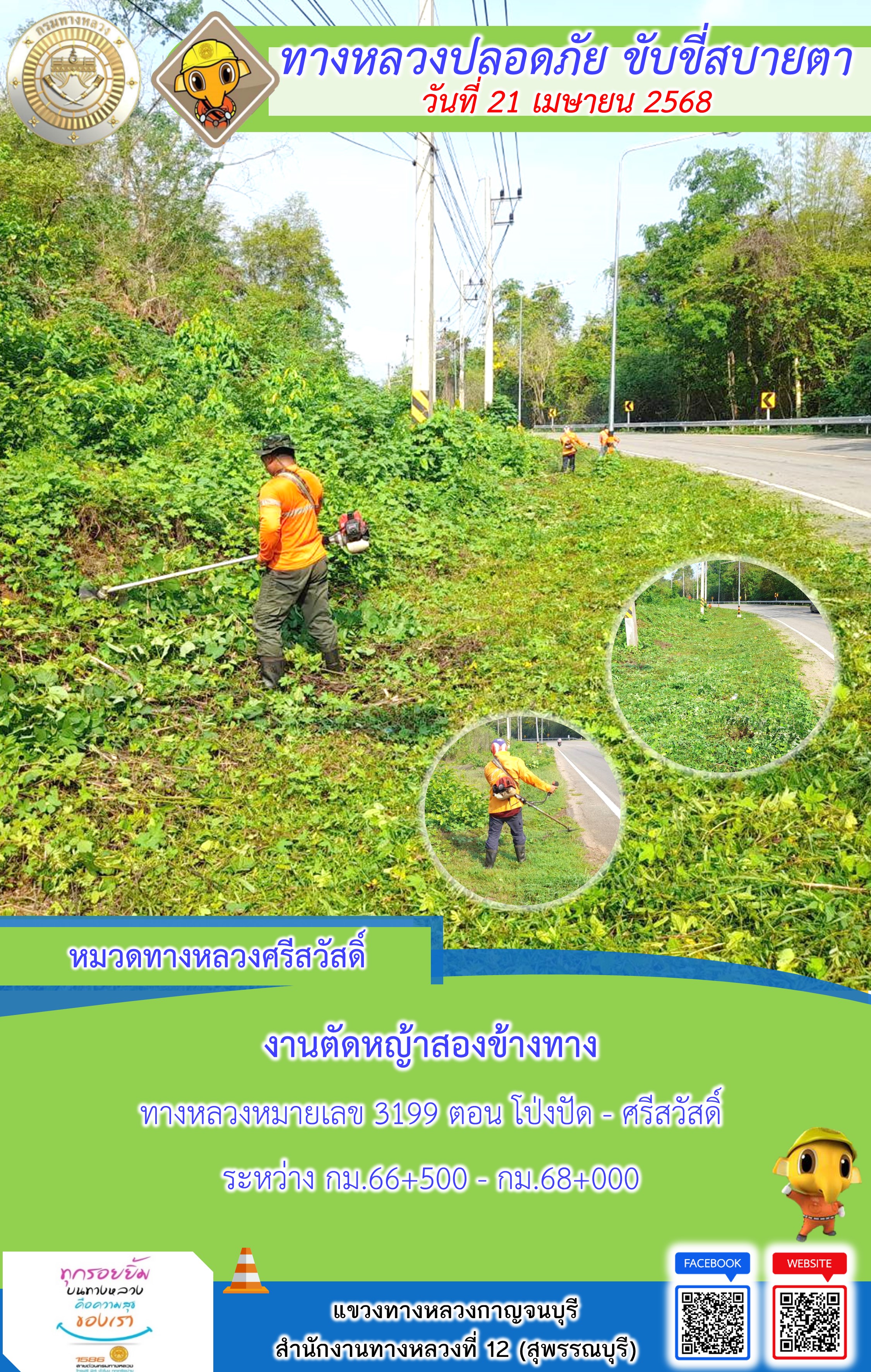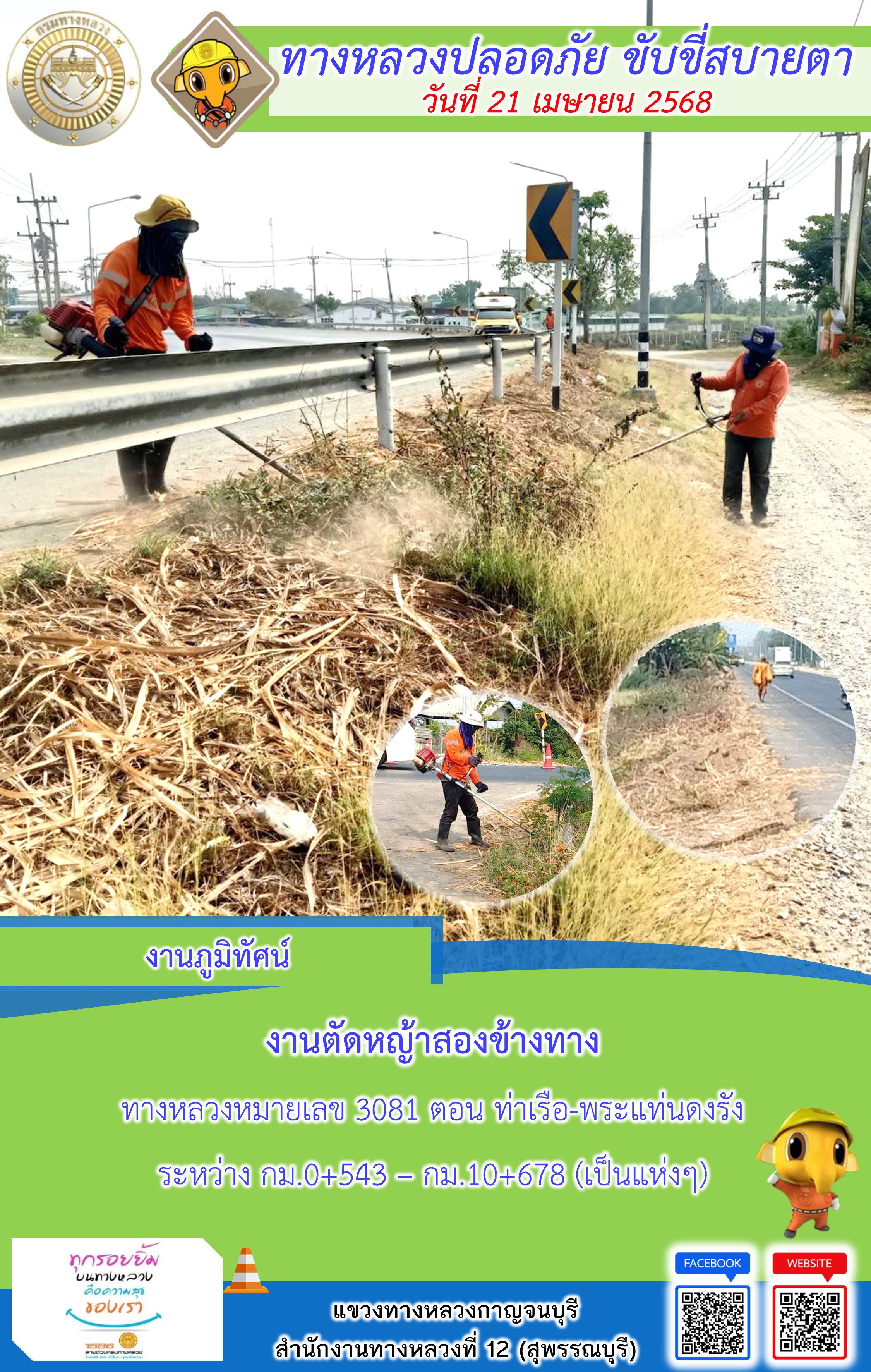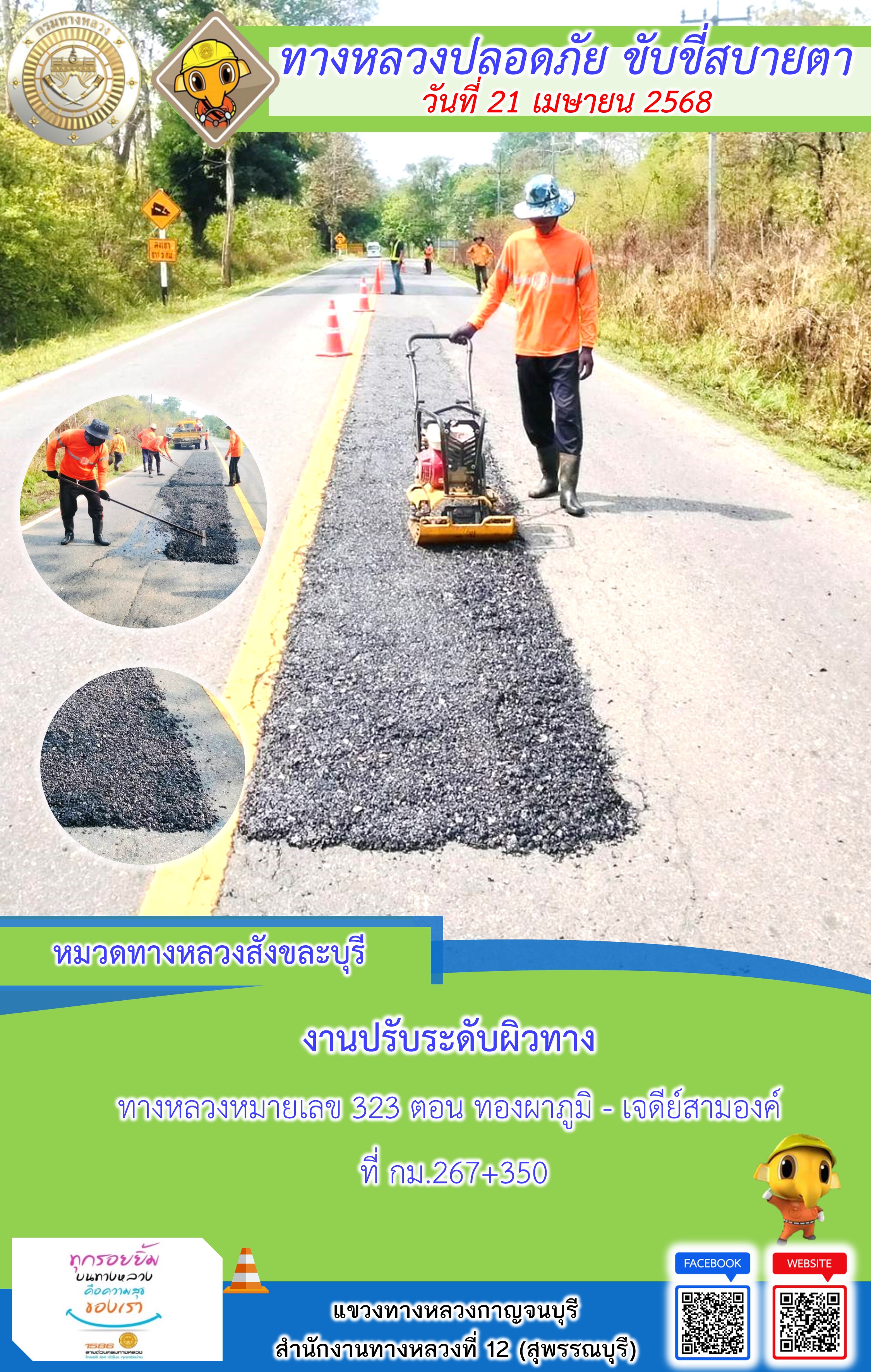 ข้อมูลภาพกิจกรรม : แขวงทางหลวงกาญจนบุรี โดยหมวดทางหลวงในสังกัด และงานอำนวยความปลอดภัยปฏิบัติงาน ประจำวันที่ 21 เม.ย. 68