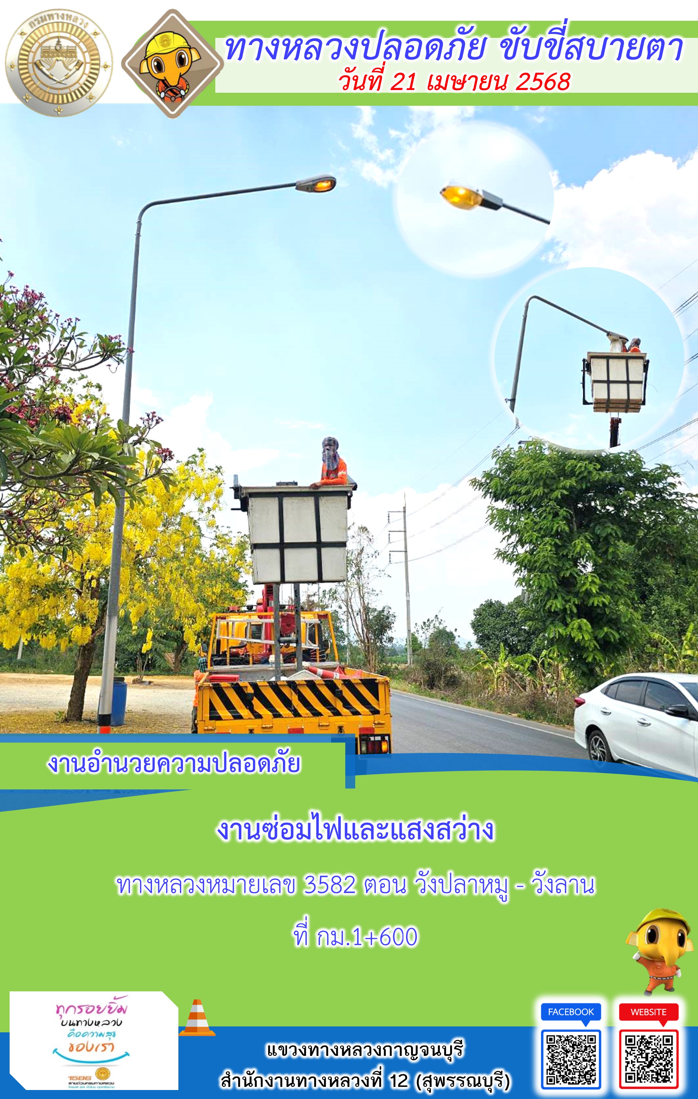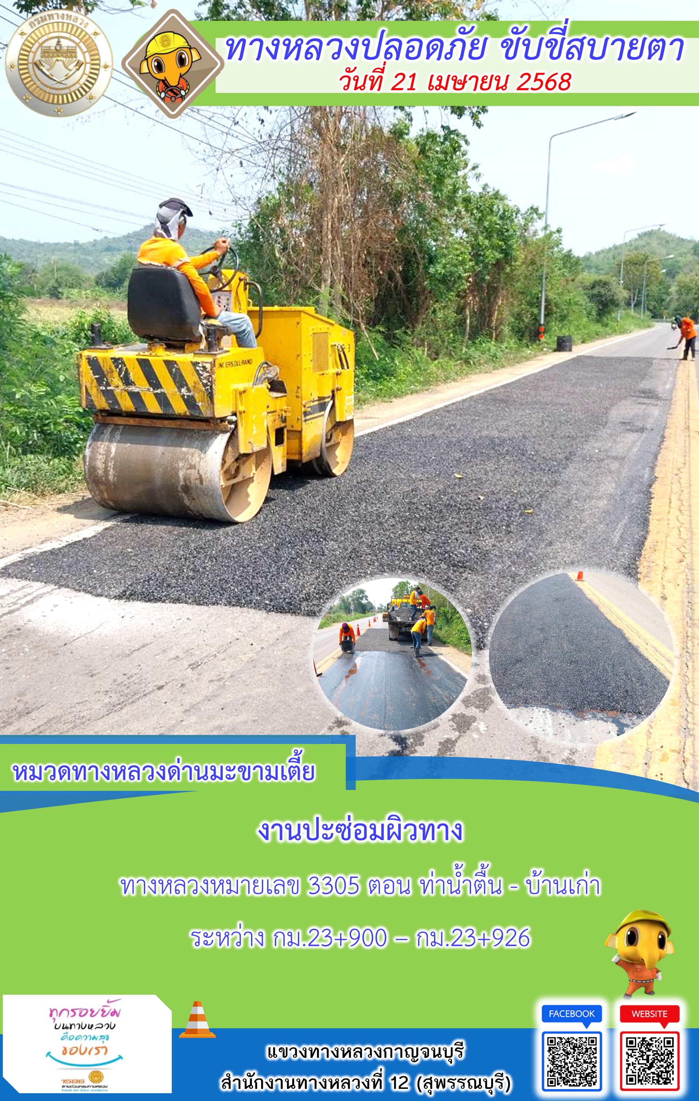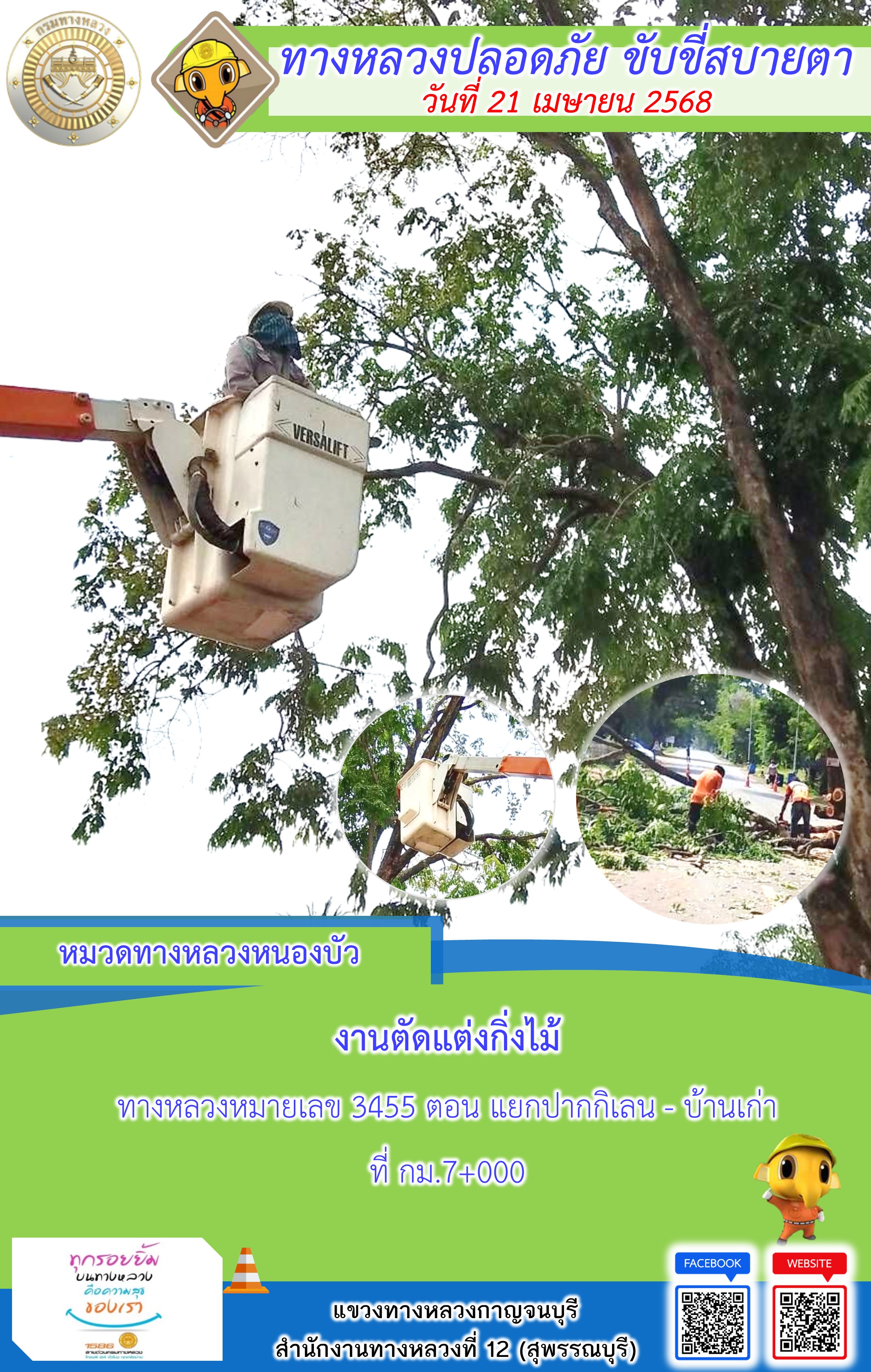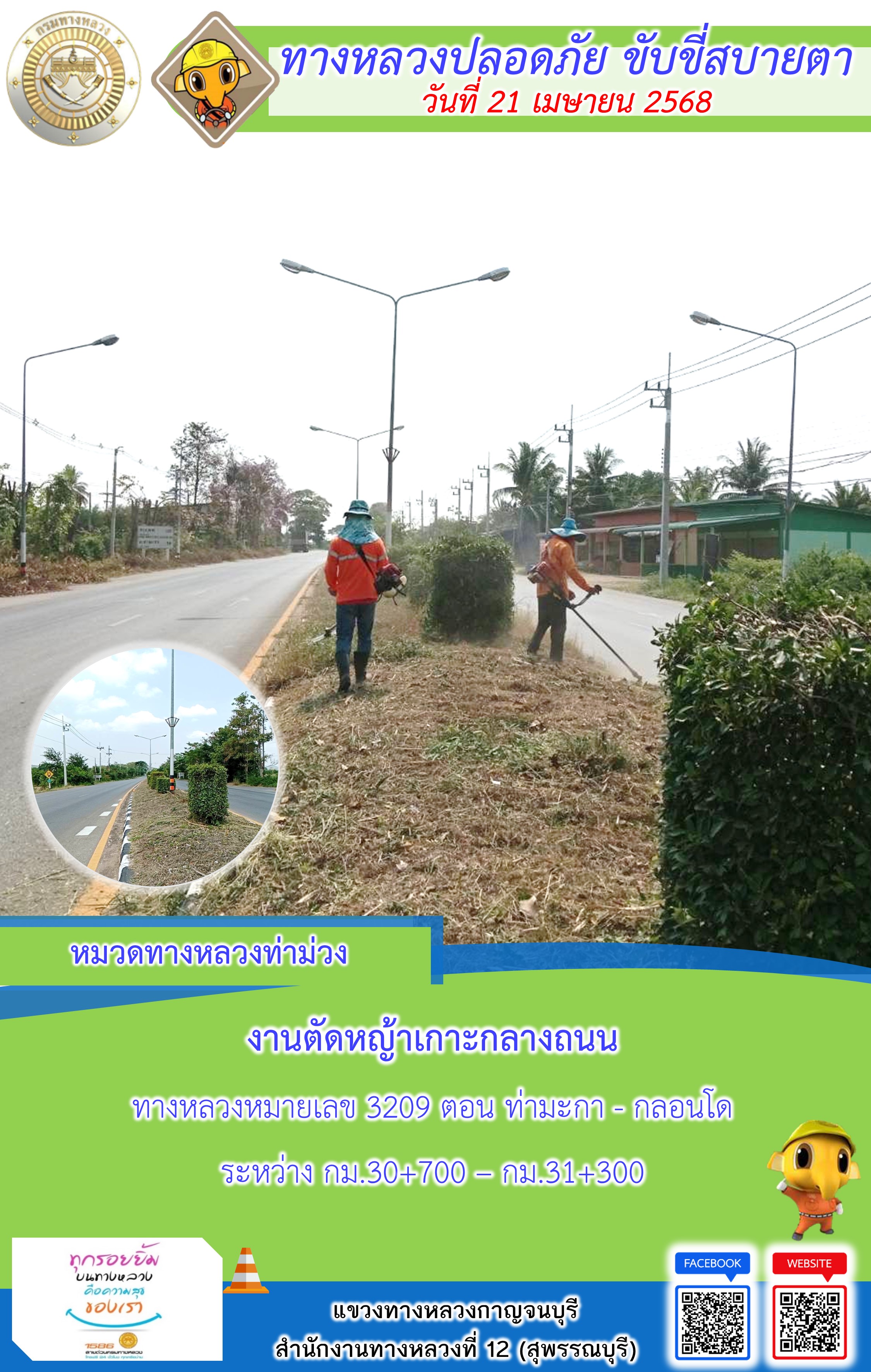 ข้อมูลภาพกิจกรรม : แขวงทางหลวงกาญจนบุรี โดยหมวดทางหลวงในสังกัด และงานอำนวยความปลอดภัยปฏิบัติงาน ประจำวันที่ 21 เม.ย. 68