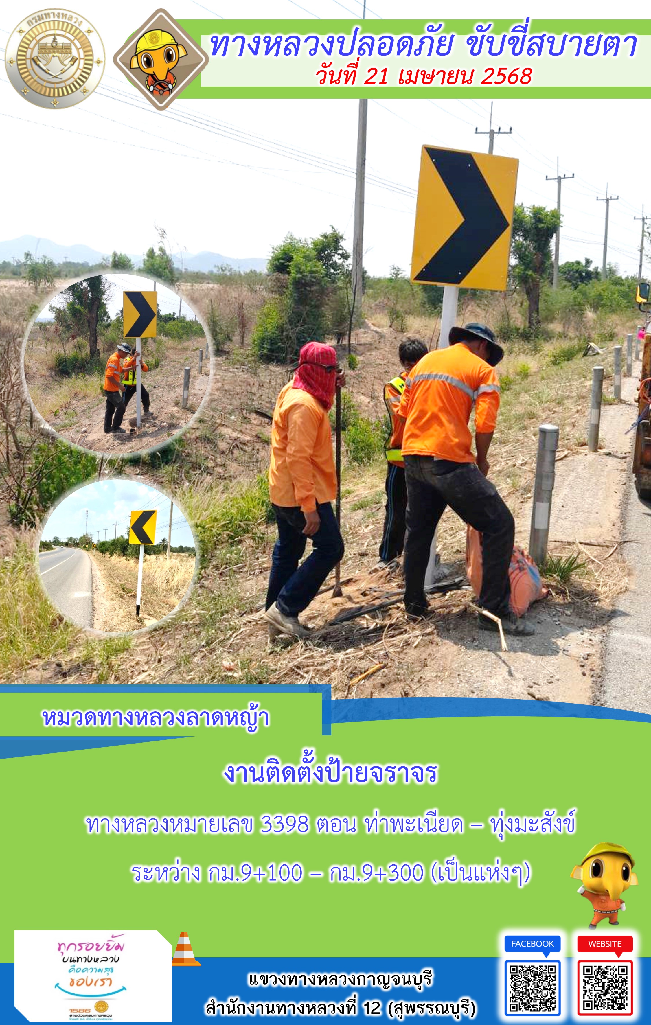 แขวงทางหลวงกาญจนบุรี โดยหมวดทางหลวงในสังกัด และงานอำนวยความปลอดภัยปฏิบัติงาน ประจำวันที่ 21 เม.ย. 68