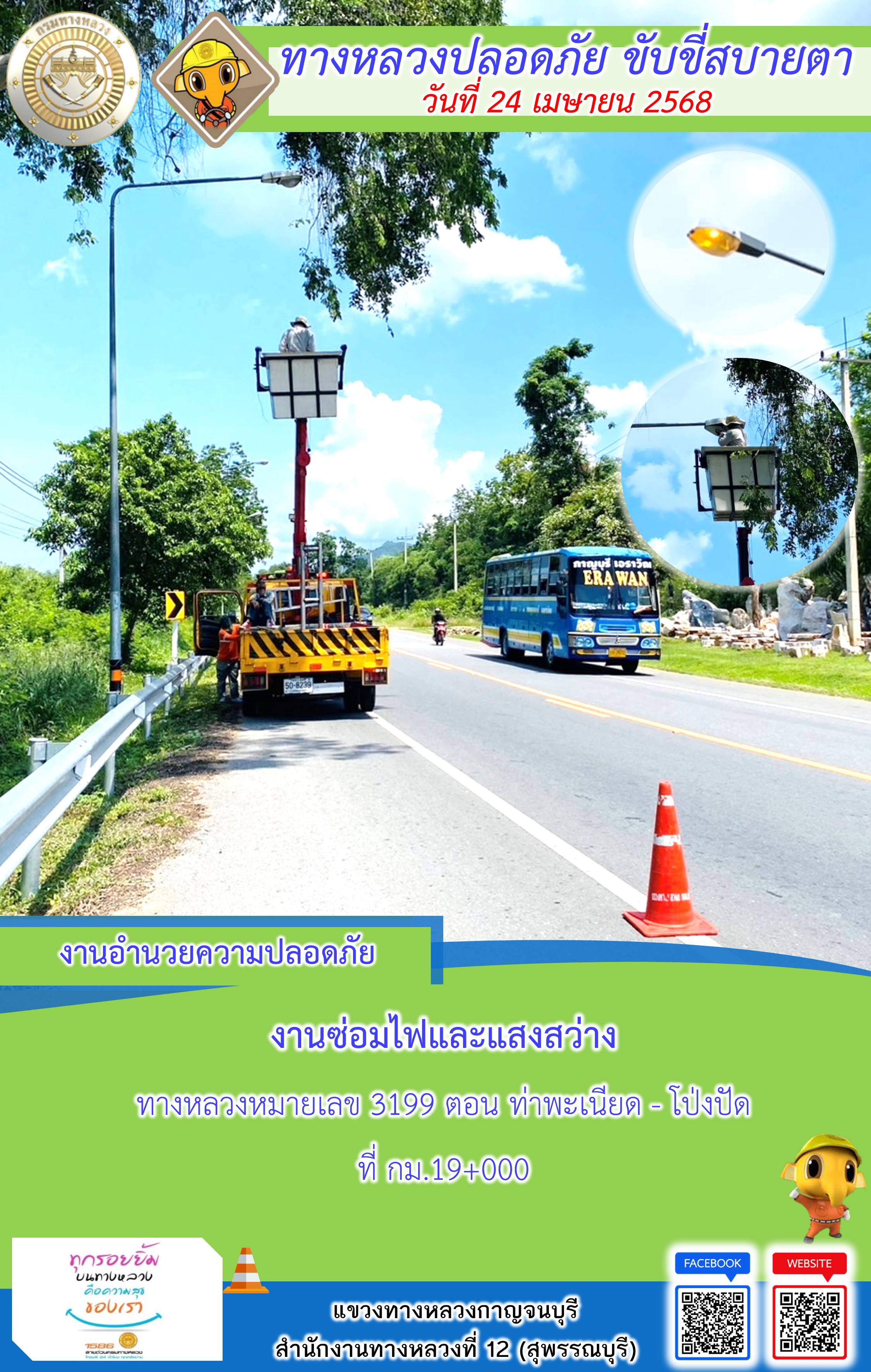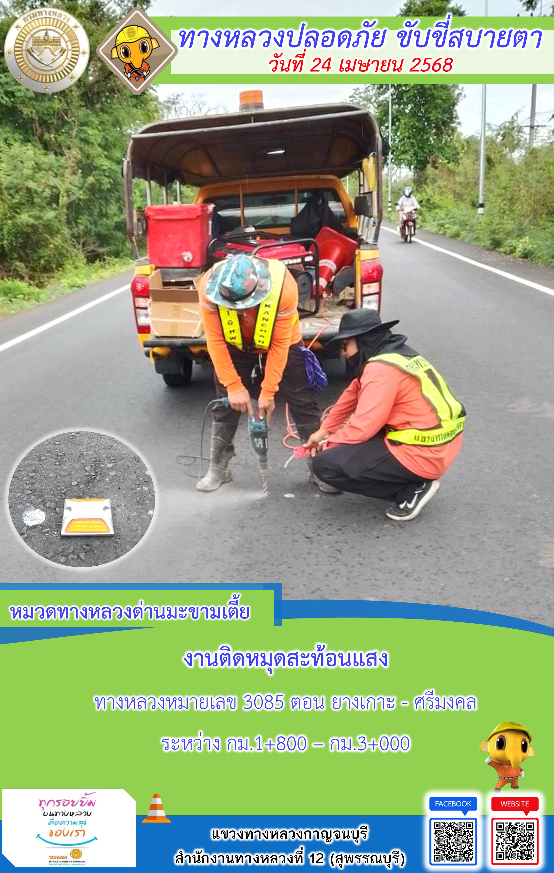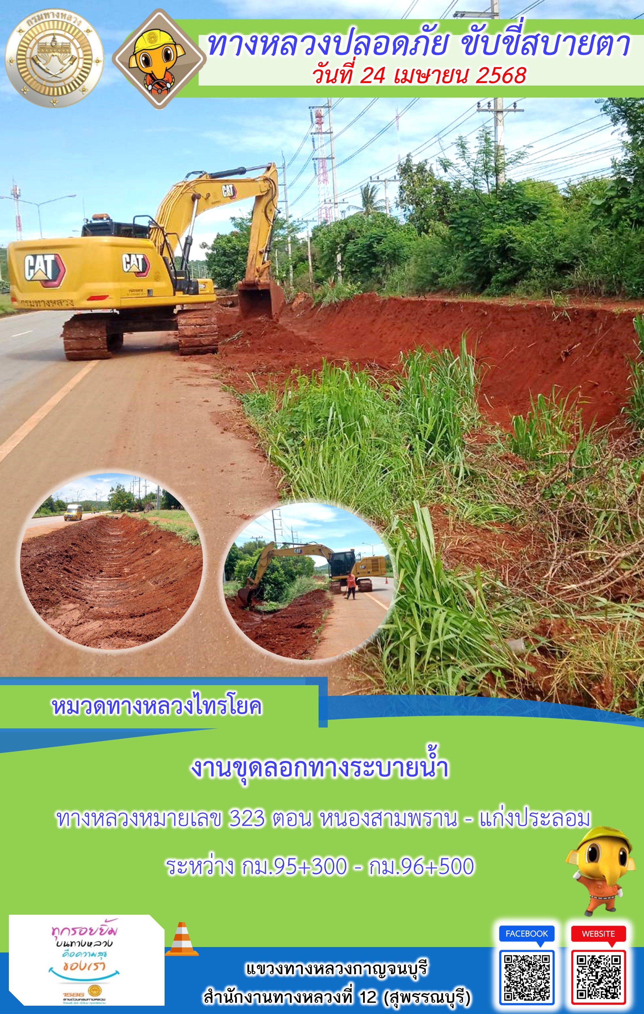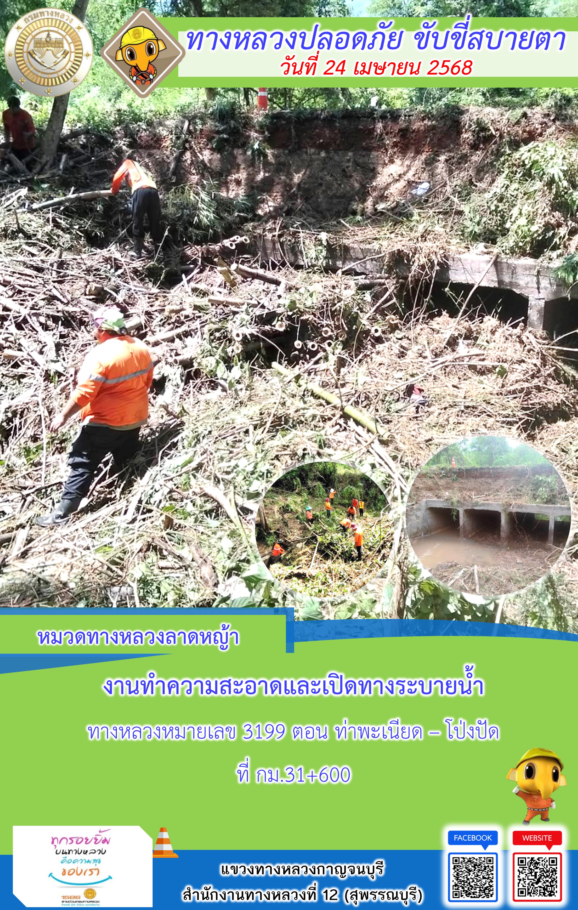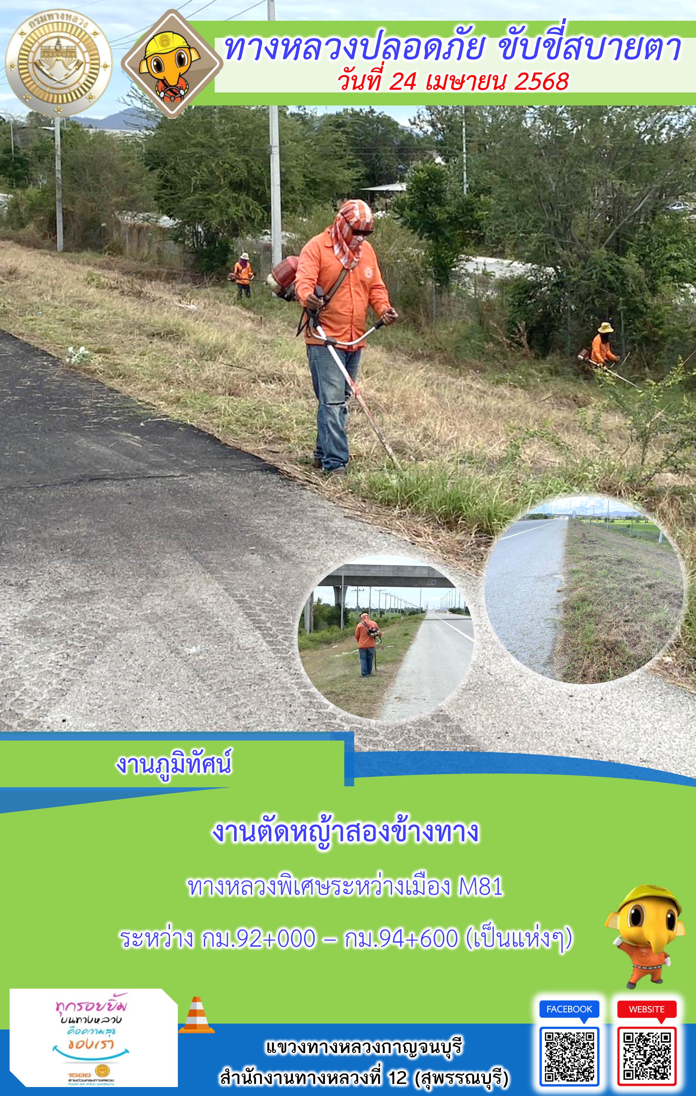 ข้อมูลภาพกิจกรรม : แขวงทางหลวงกาญจนบุรี โดยหมวดทางหลวงในสังกัด และงานอำนวยความปลอดภัยปฏิบัติงาน ประจำวันที่ 24 เม.ย. 68