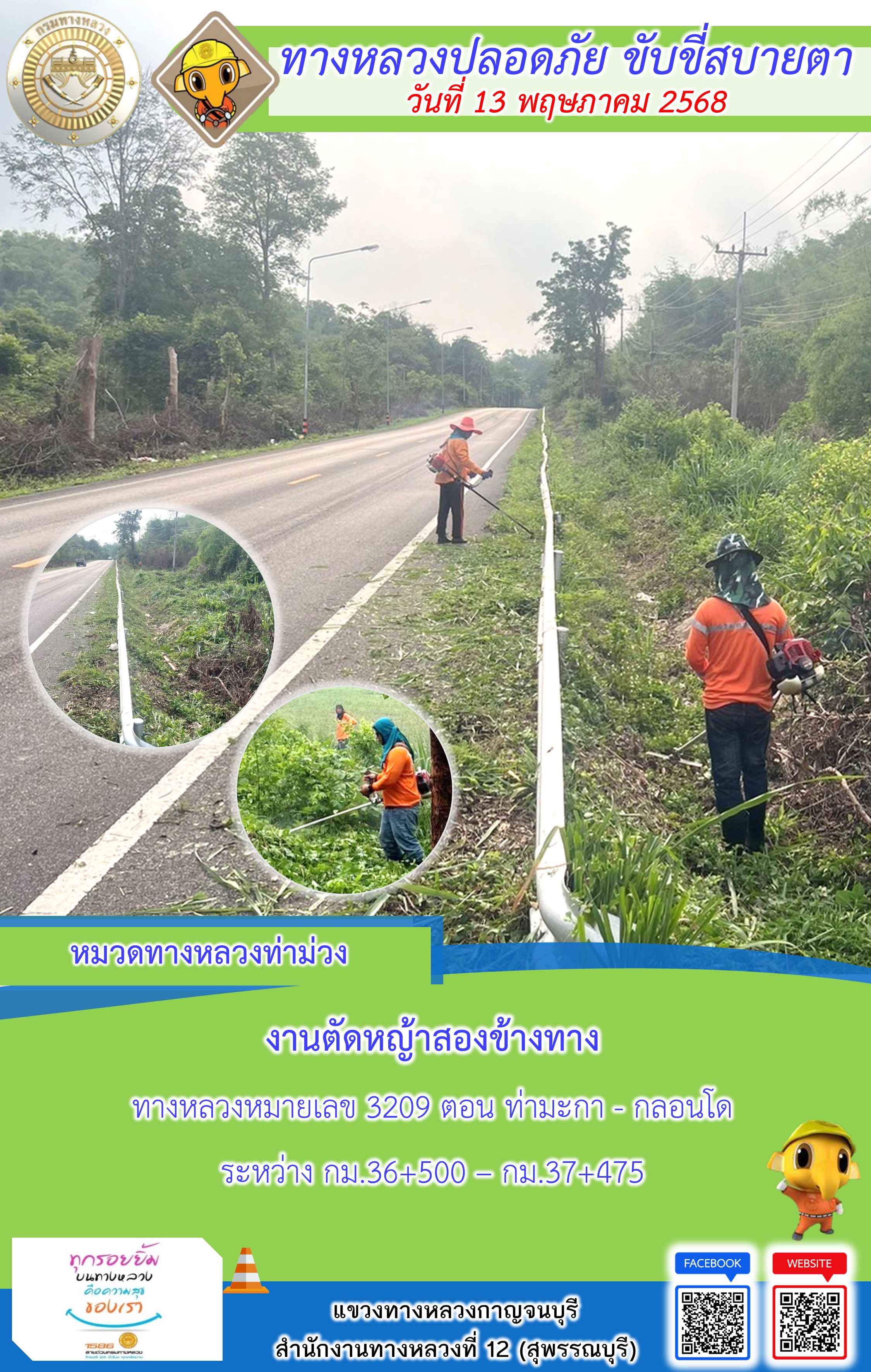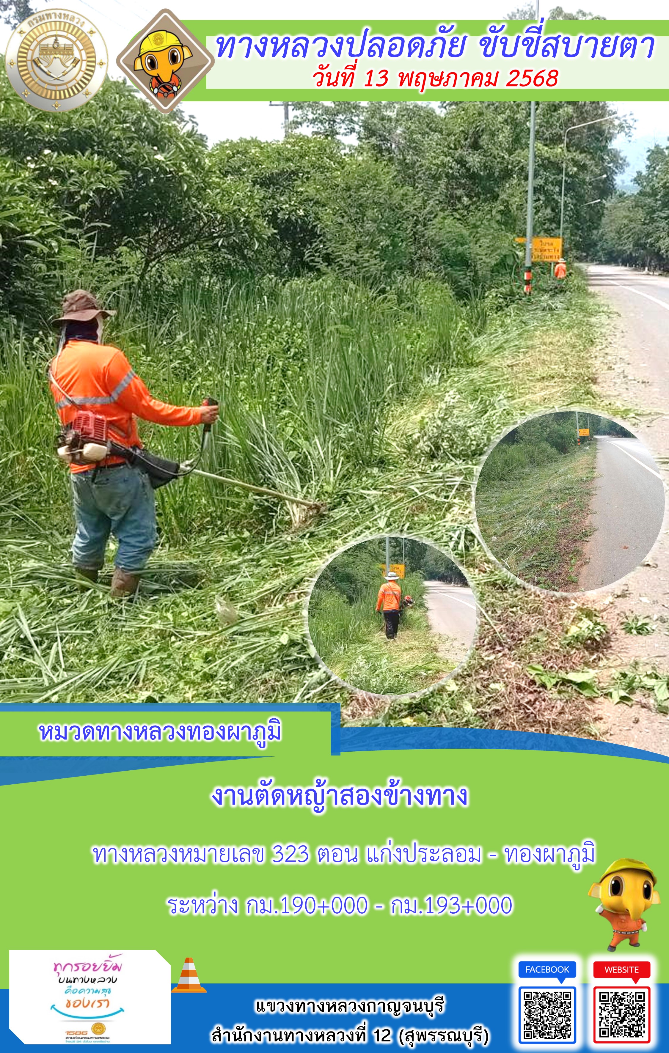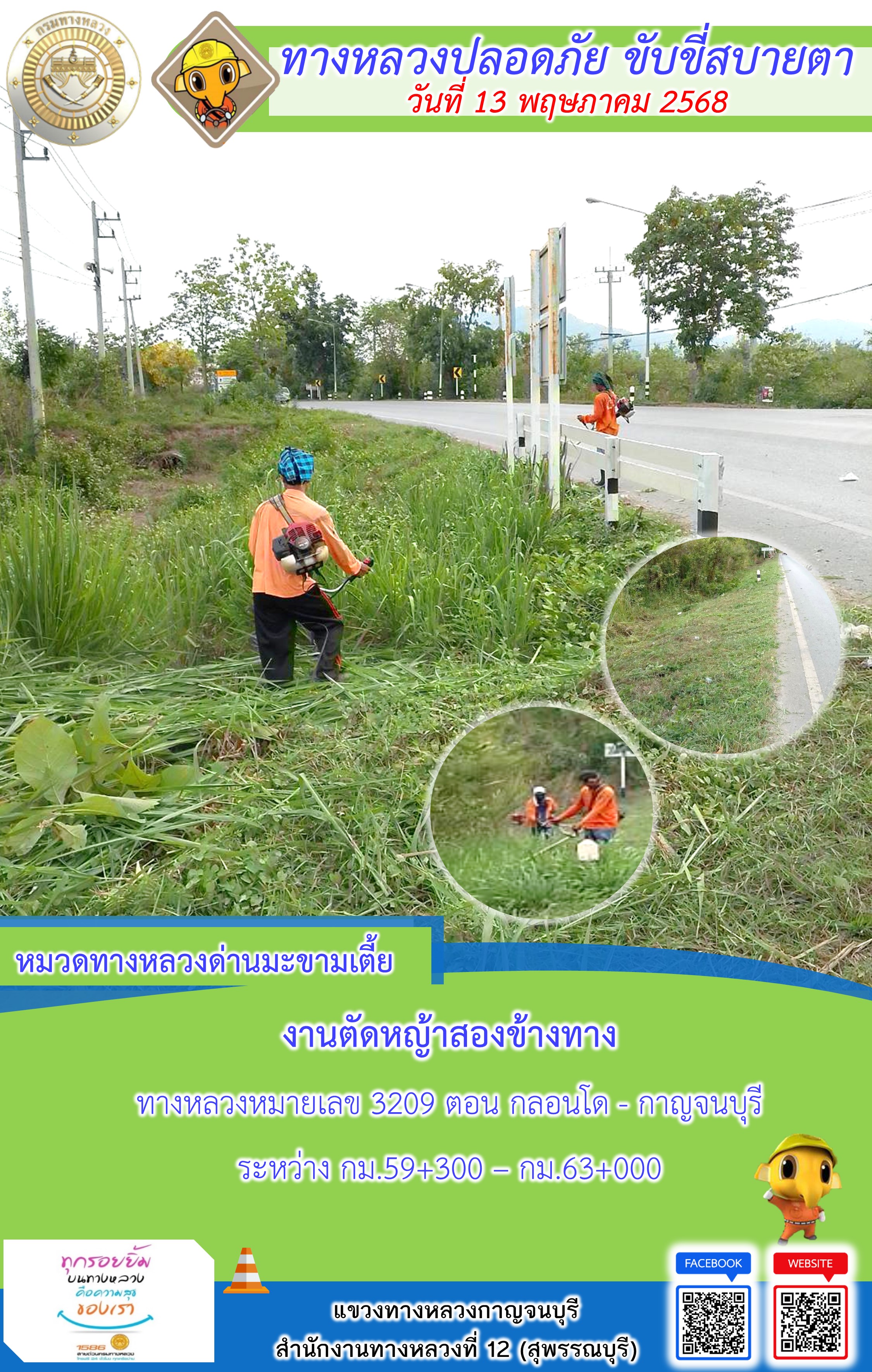 ข้อมูลภาพกิจกรรม : แขวงทางหลวงกาญจนบุรี โดยหมวดทางหลวงในสังกัด และงานอำนวยความปลอดภัยปฏิบัติงาน ประจำวันที่ 13 พ.ค. 68