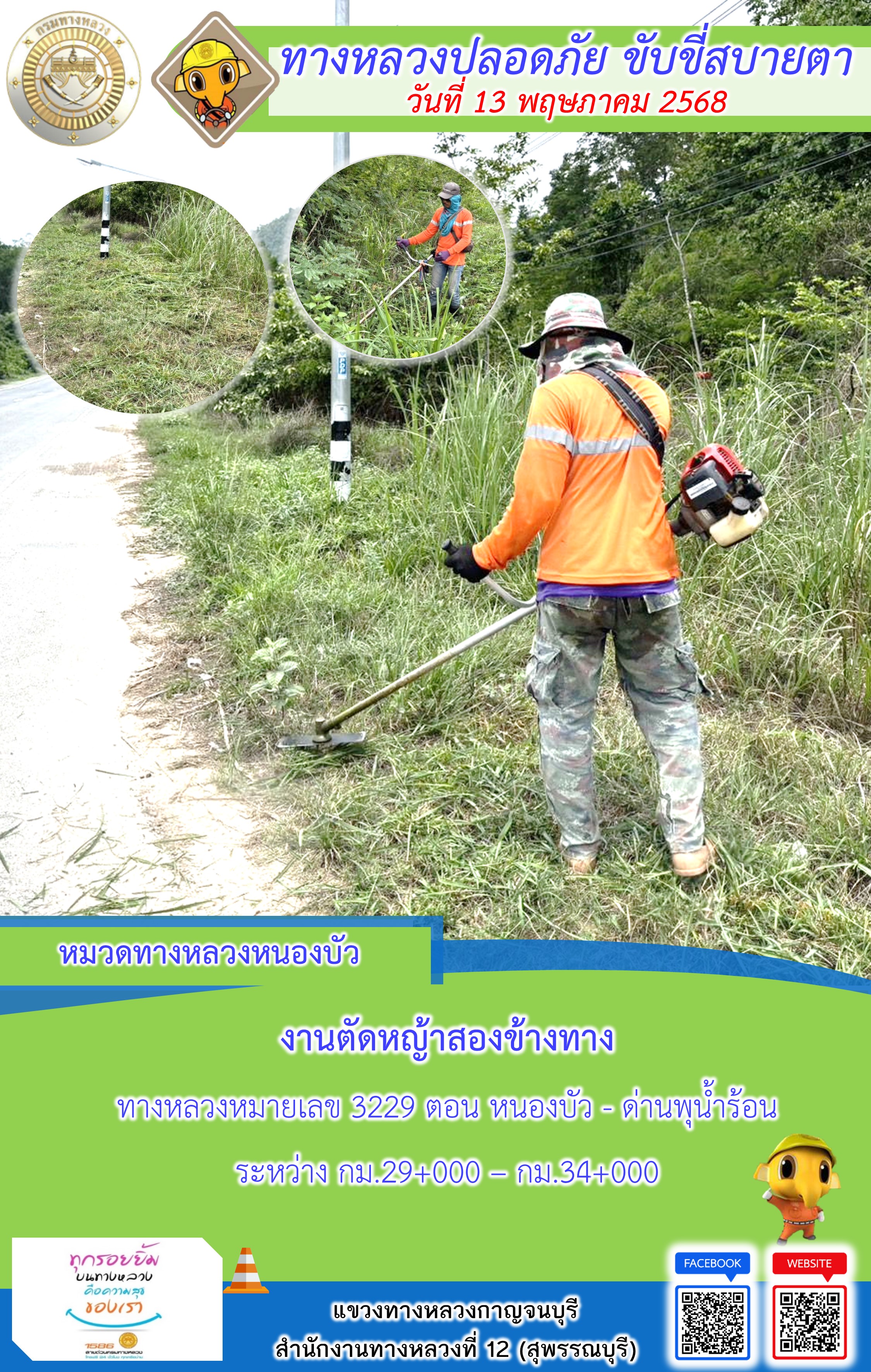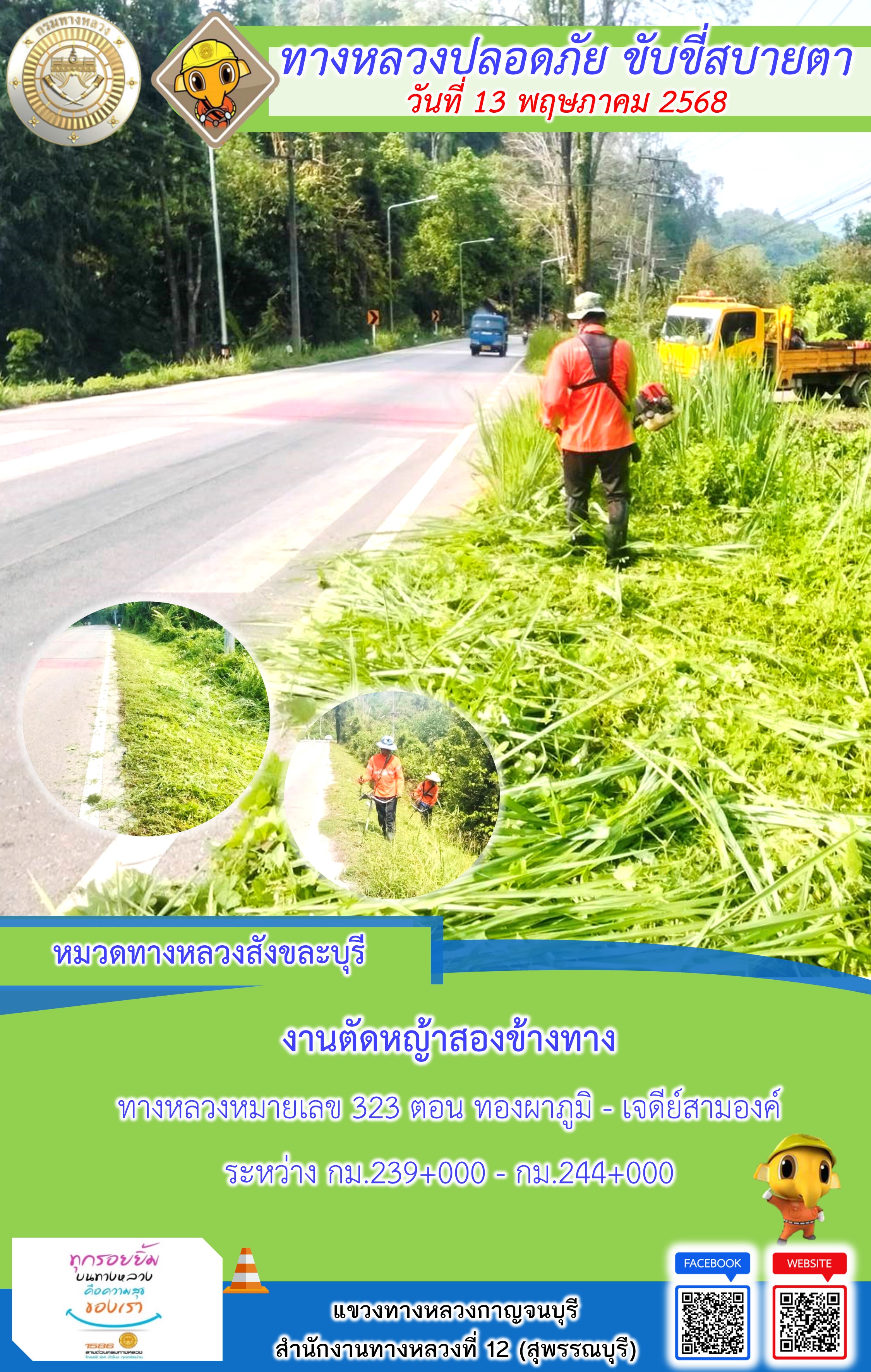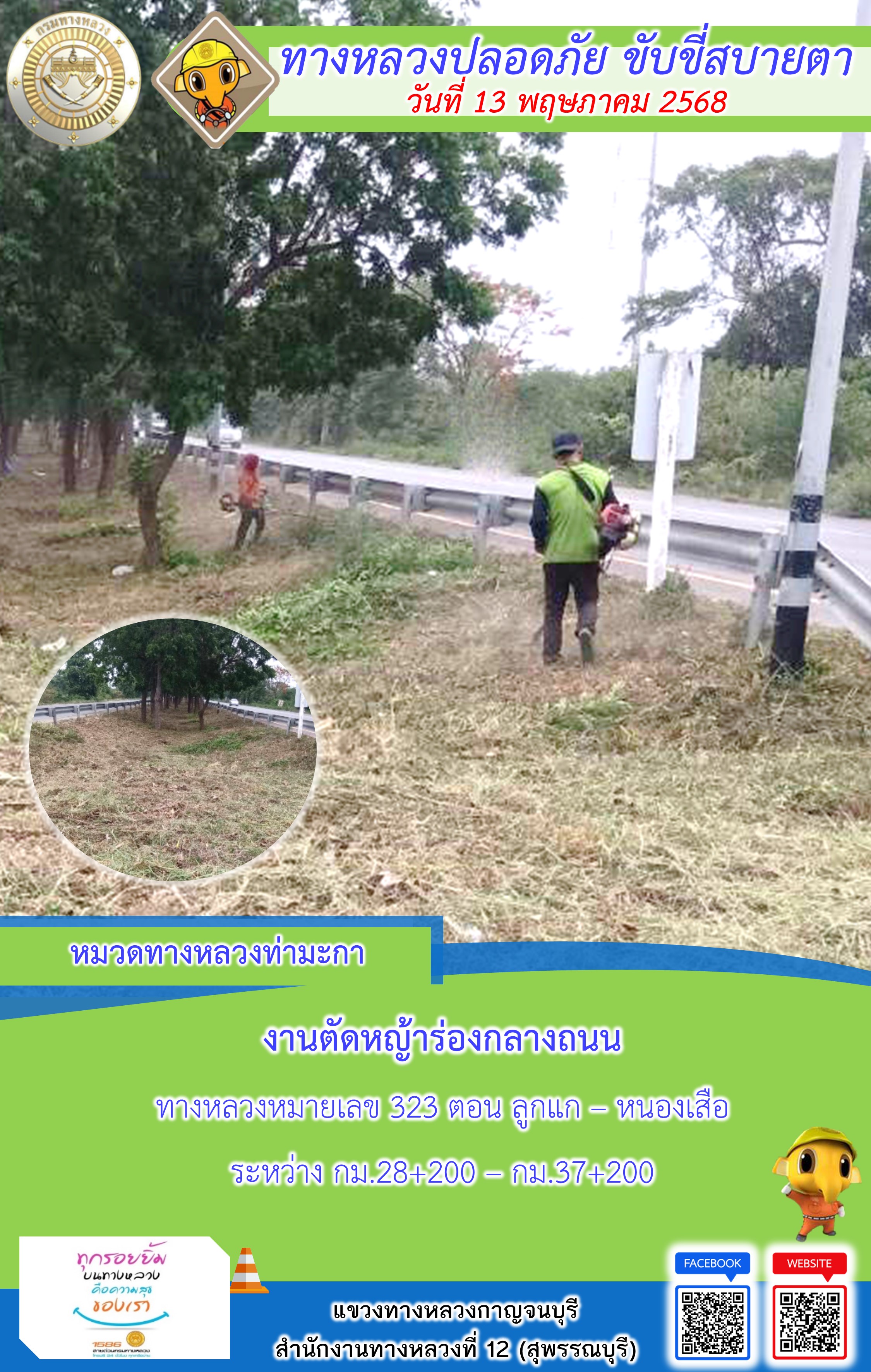 ข้อมูลภาพกิจกรรม : แขวงทางหลวงกาญจนบุรี โดยหมวดทางหลวงในสังกัด และงานอำนวยความปลอดภัยปฏิบัติงาน ประจำวันที่ 13 พ.ค. 68