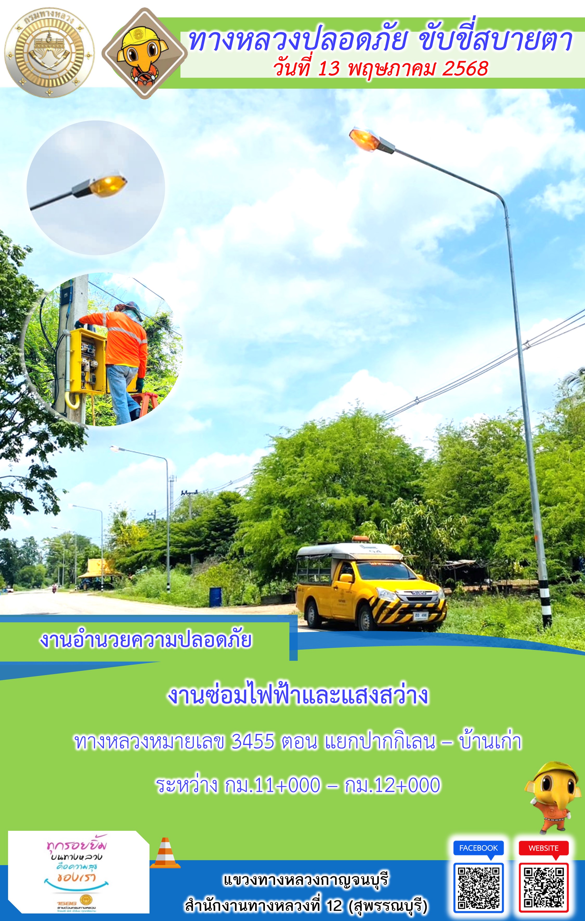 แขวงทางหลวงกาญจนบุรี โดยหมวดทางหลวงในสังกัด และงานอำนวยความปลอดภัยปฏิบัติงาน ประจำวันที่ 13 พ.ค. 68