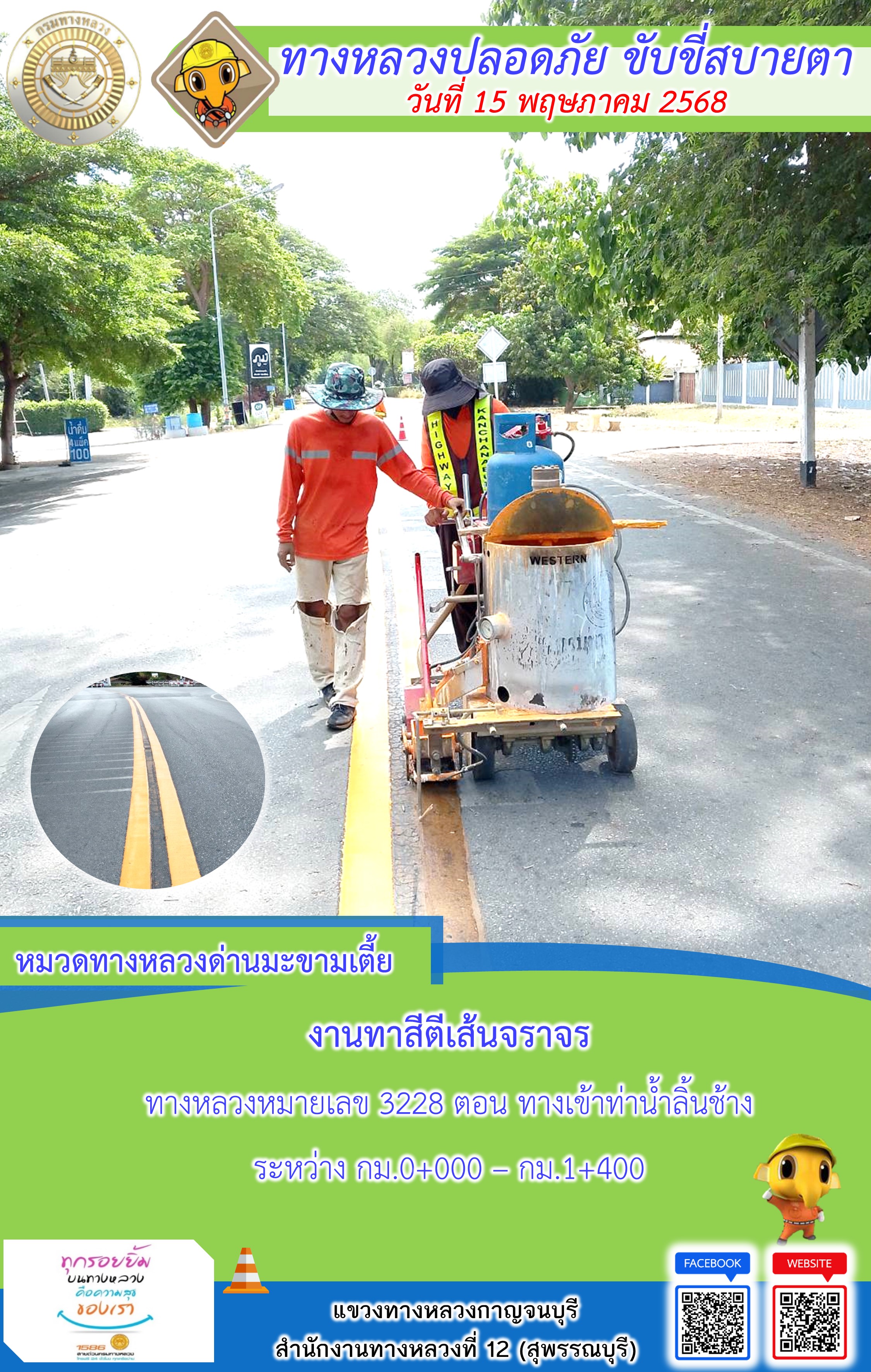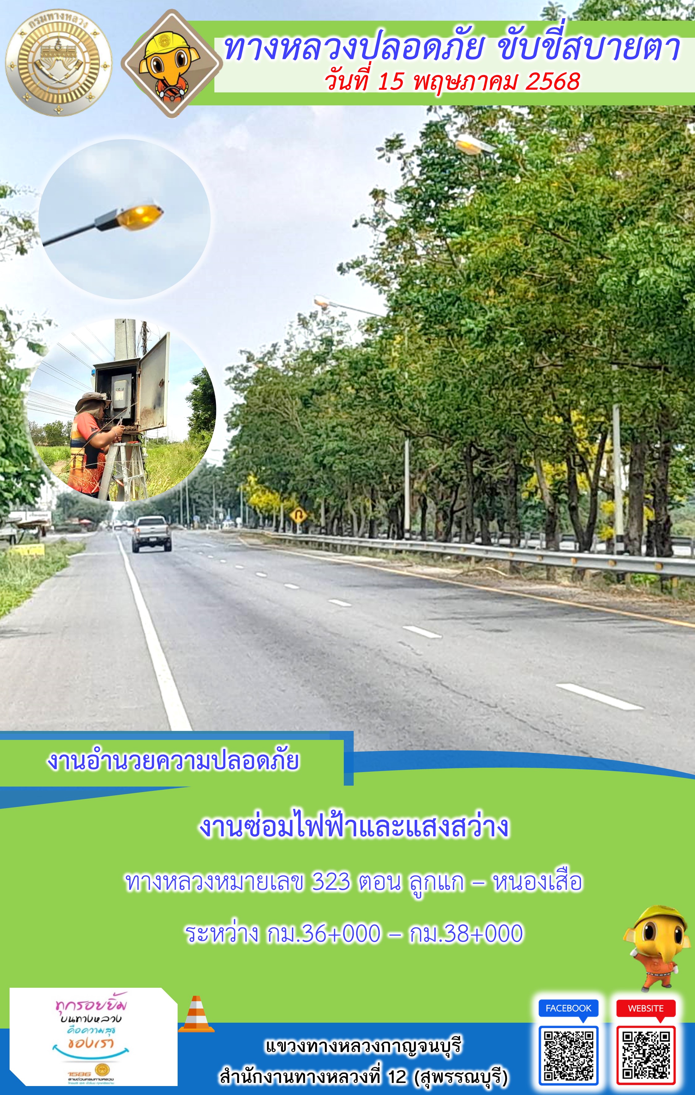 แขวงทางหลวงกาญจนบุรี โดยหมวดทางหลวงในสังกัด และงานอำนวยความปลอดภัยปฏิบัติงาน ประจำวันที่ 15 พ.ค. 68