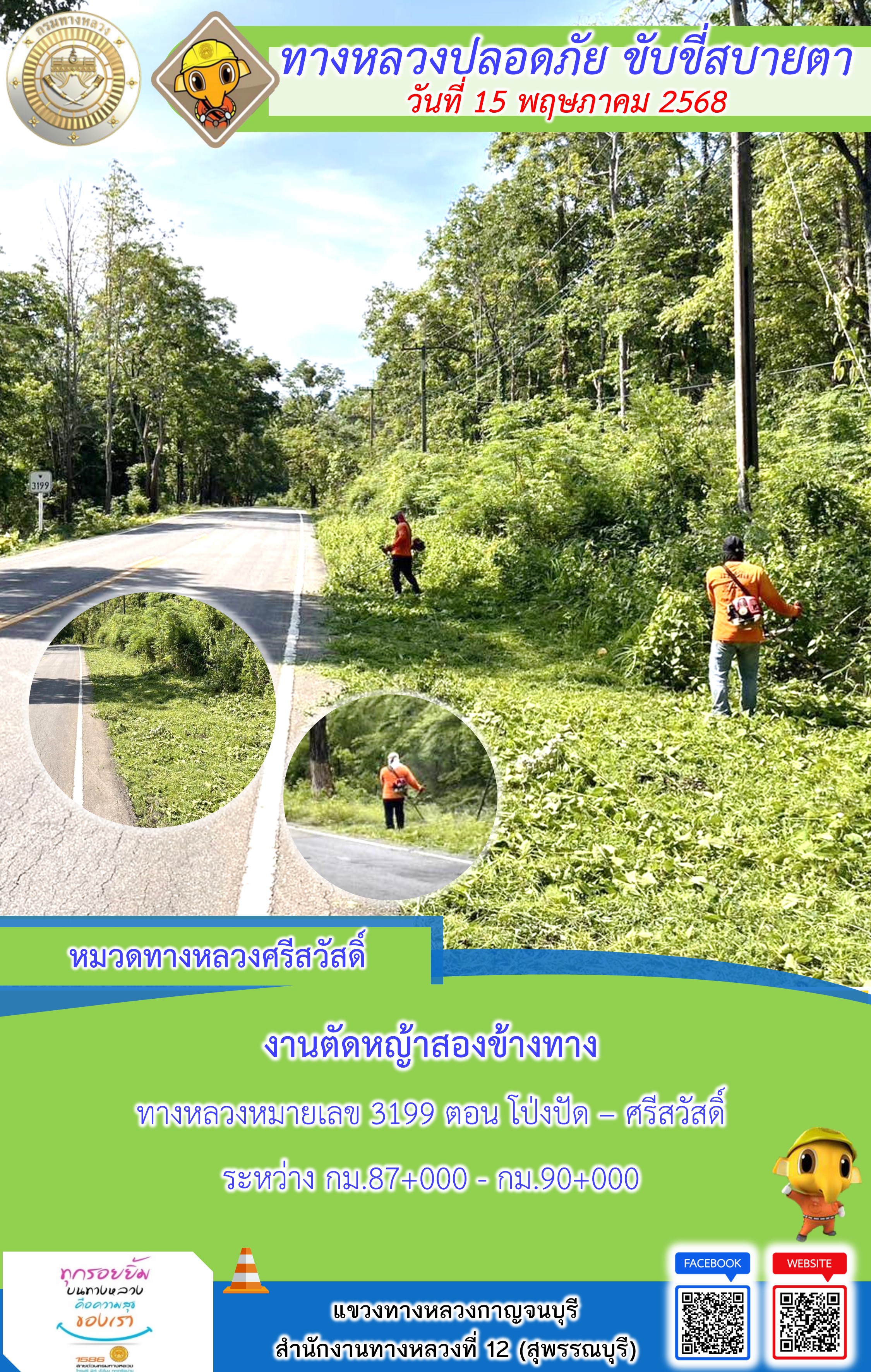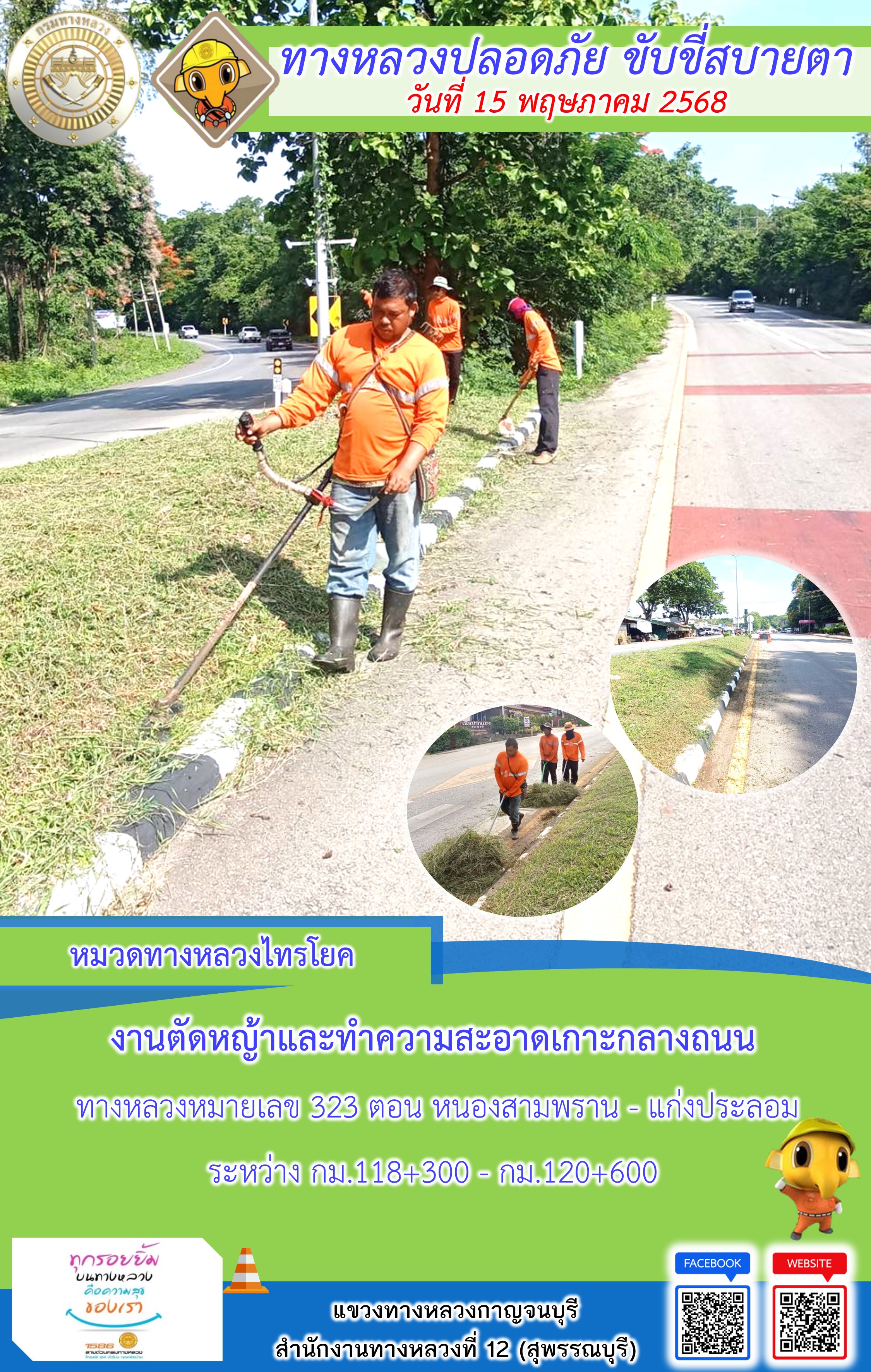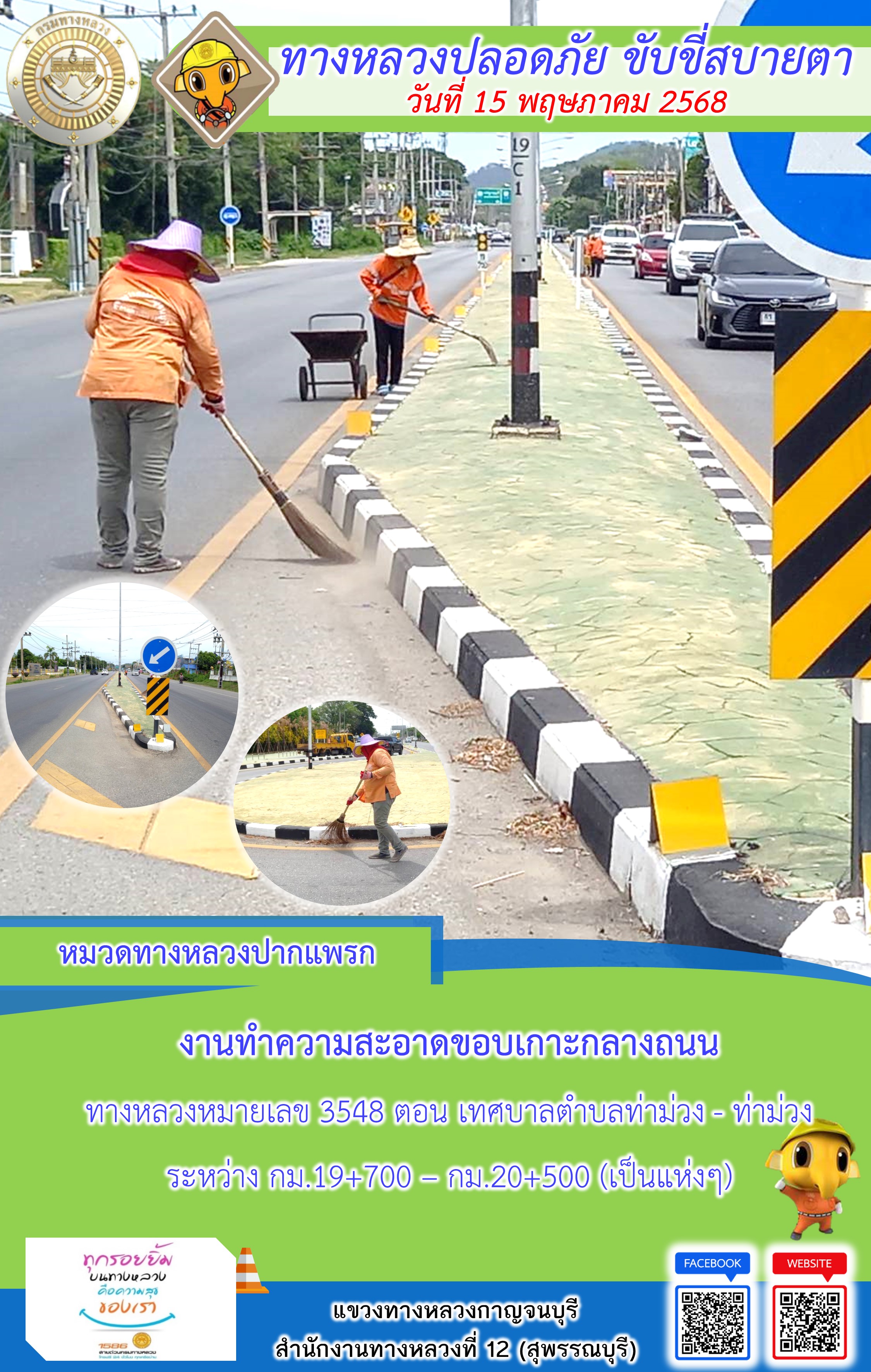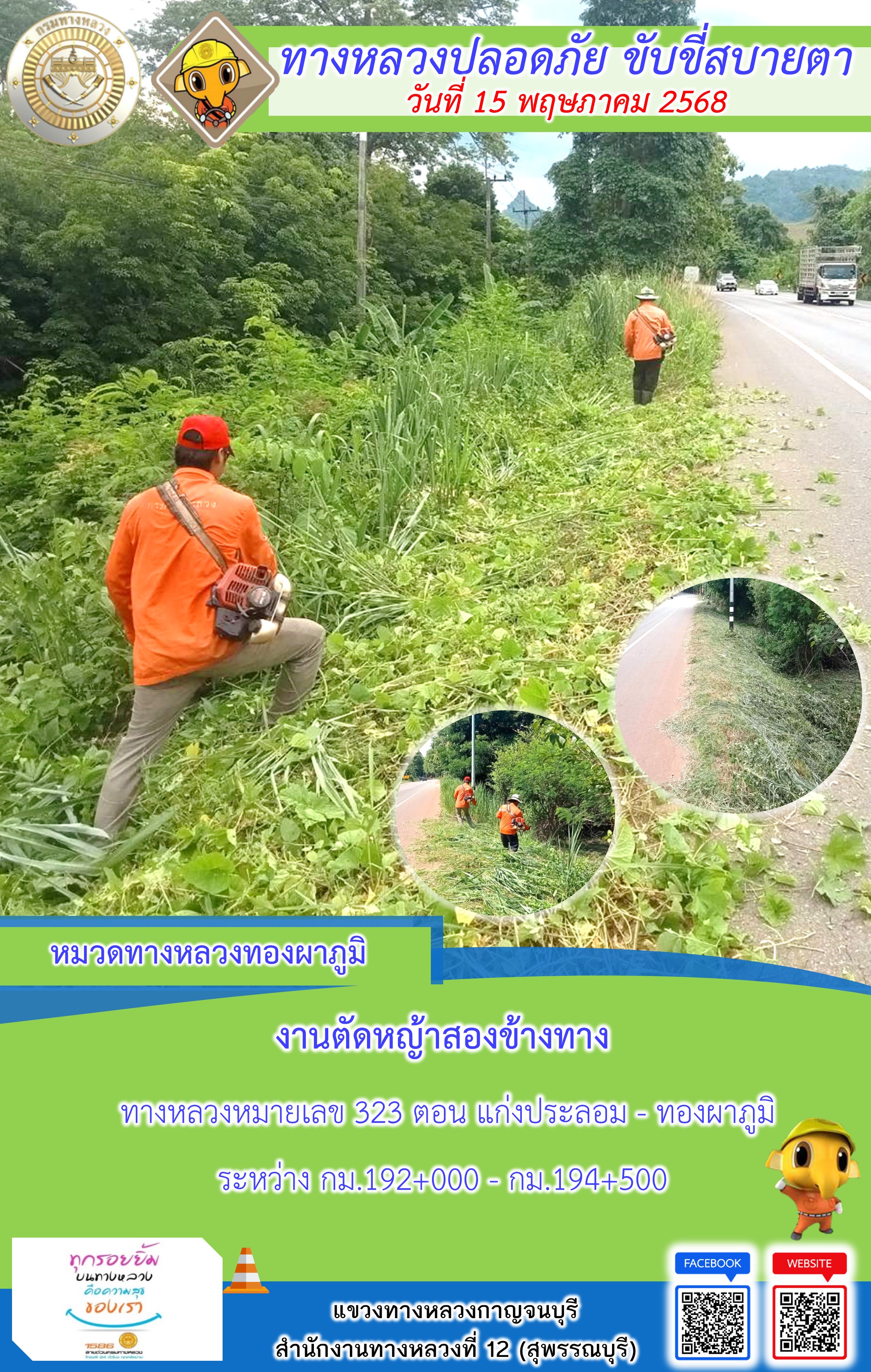 ข้อมูลภาพกิจกรรม : แขวงทางหลวงกาญจนบุรี โดยหมวดทางหลวงในสังกัด และงานอำนวยความปลอดภัยปฏิบัติงาน ประจำวันที่ 15 พ.ค. 68