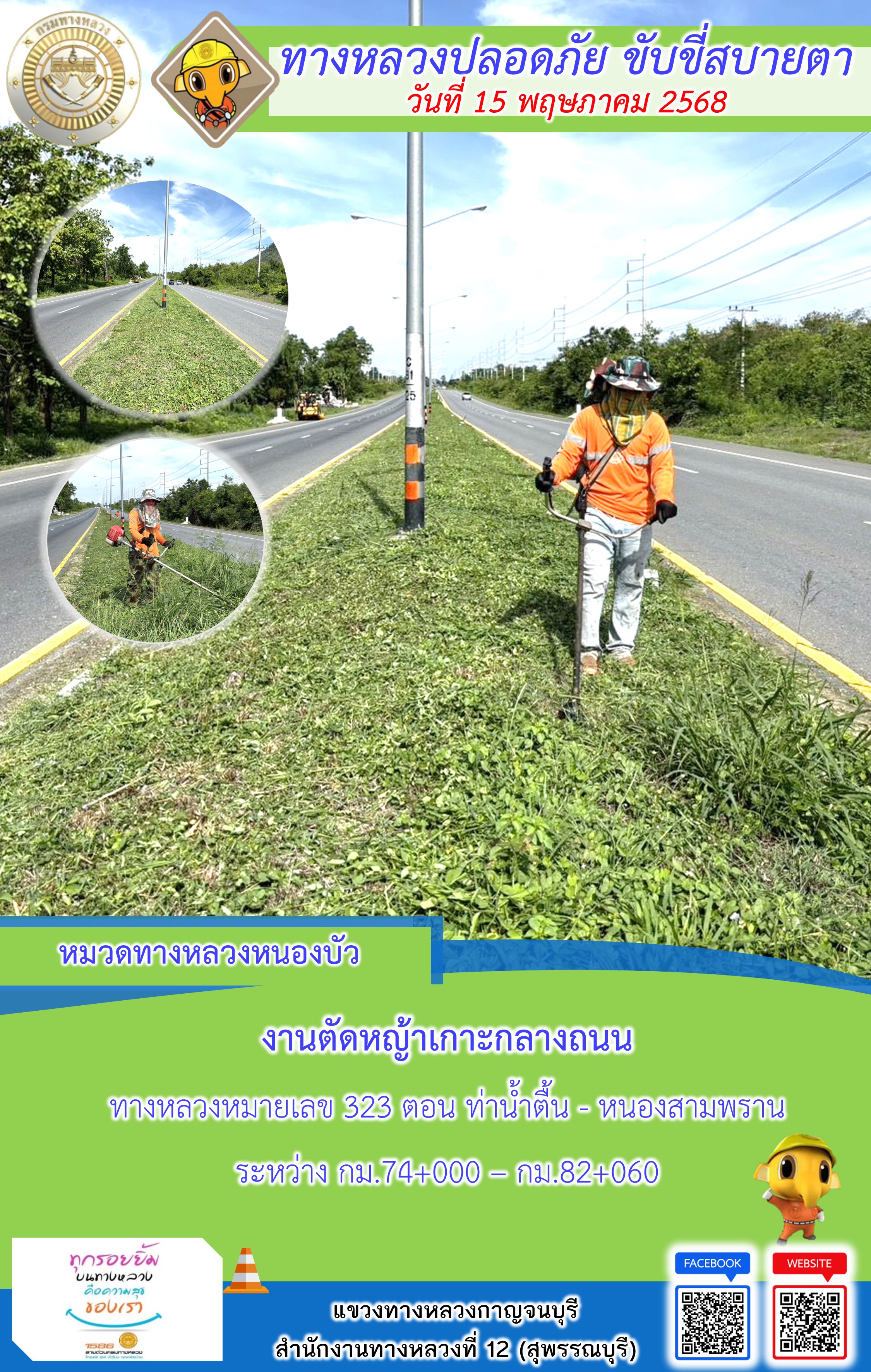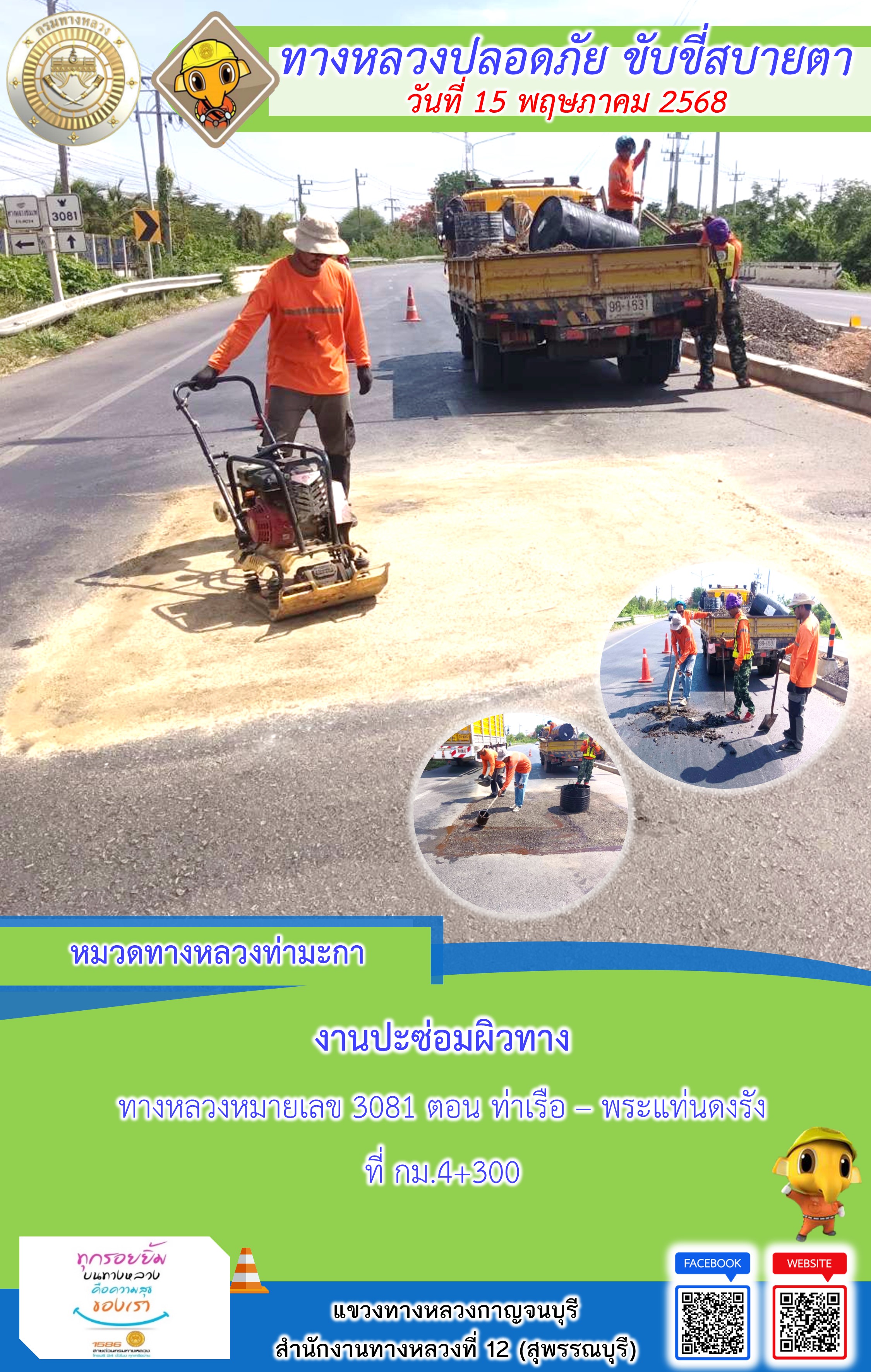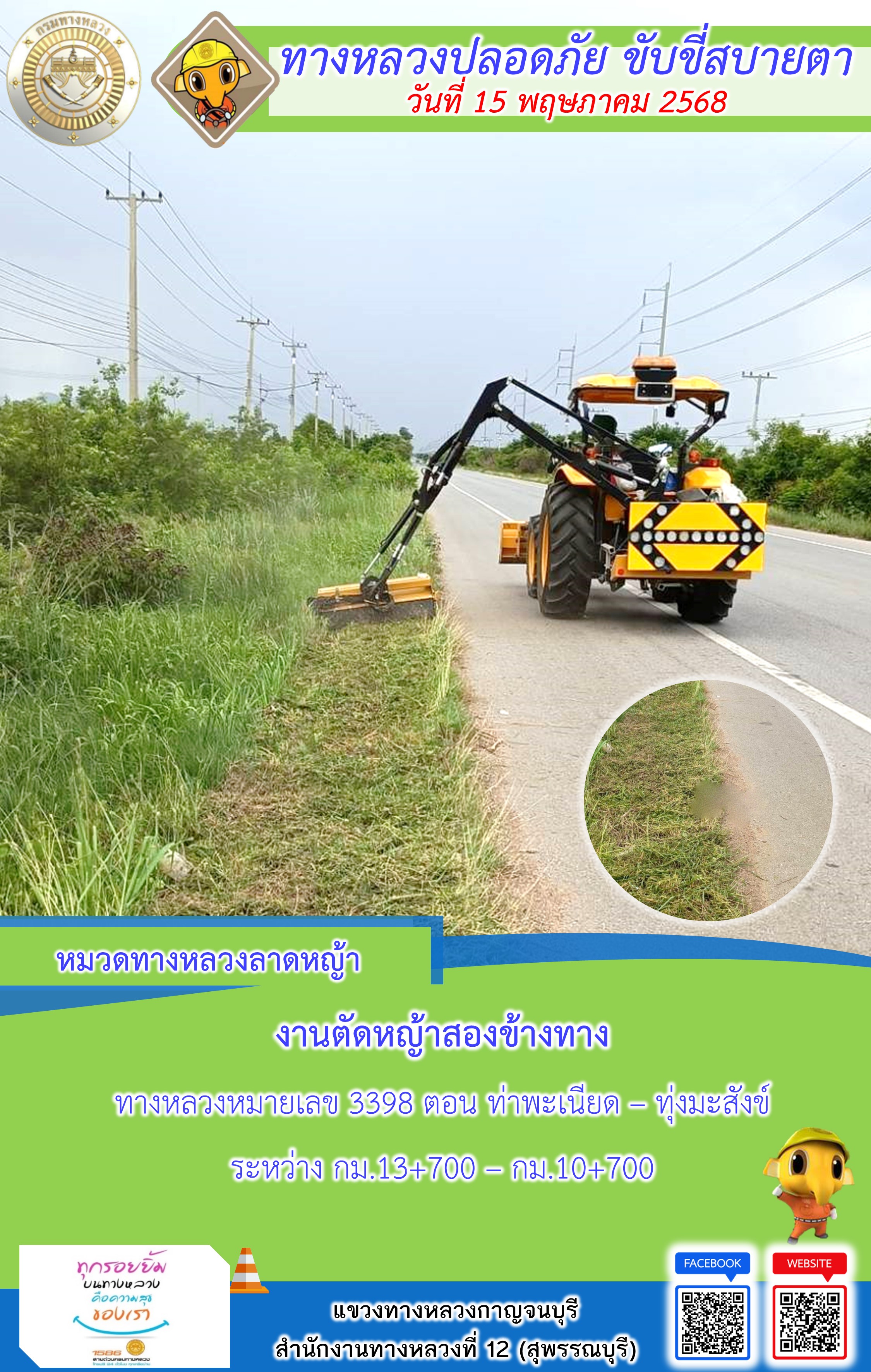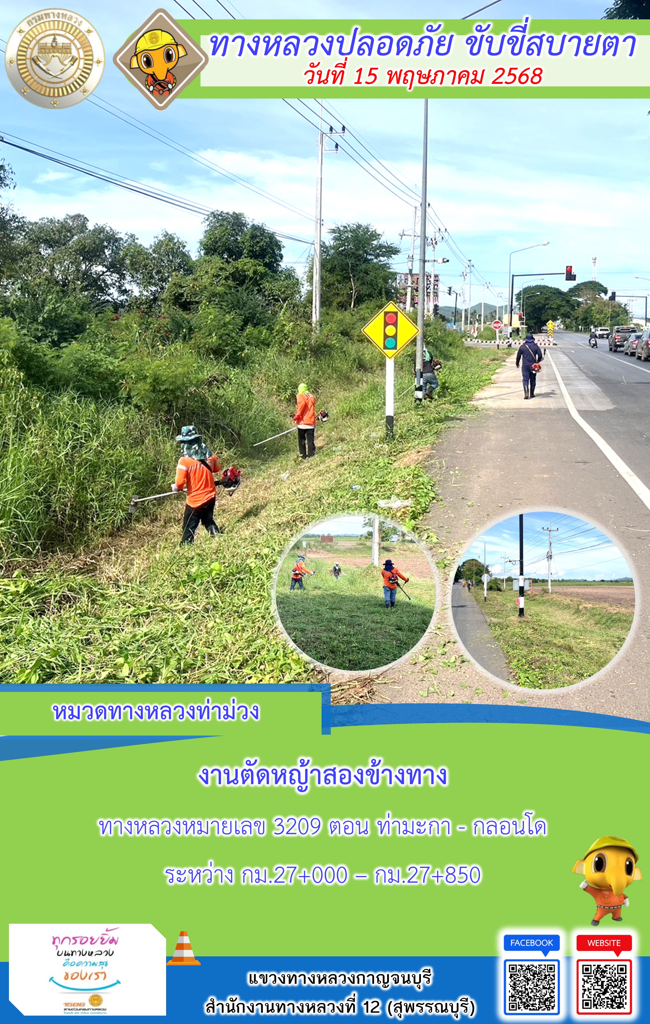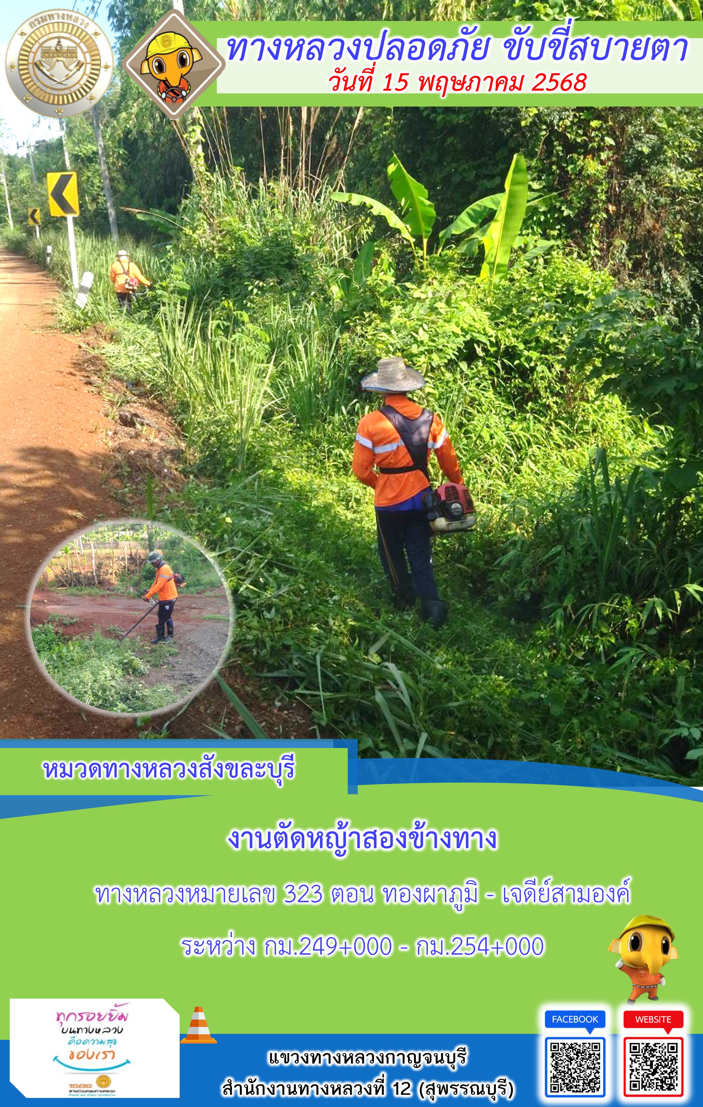 ข้อมูลภาพกิจกรรม : แขวงทางหลวงกาญจนบุรี โดยหมวดทางหลวงในสังกัด และงานอำนวยความปลอดภัยปฏิบัติงาน ประจำวันที่ 15 พ.ค. 68