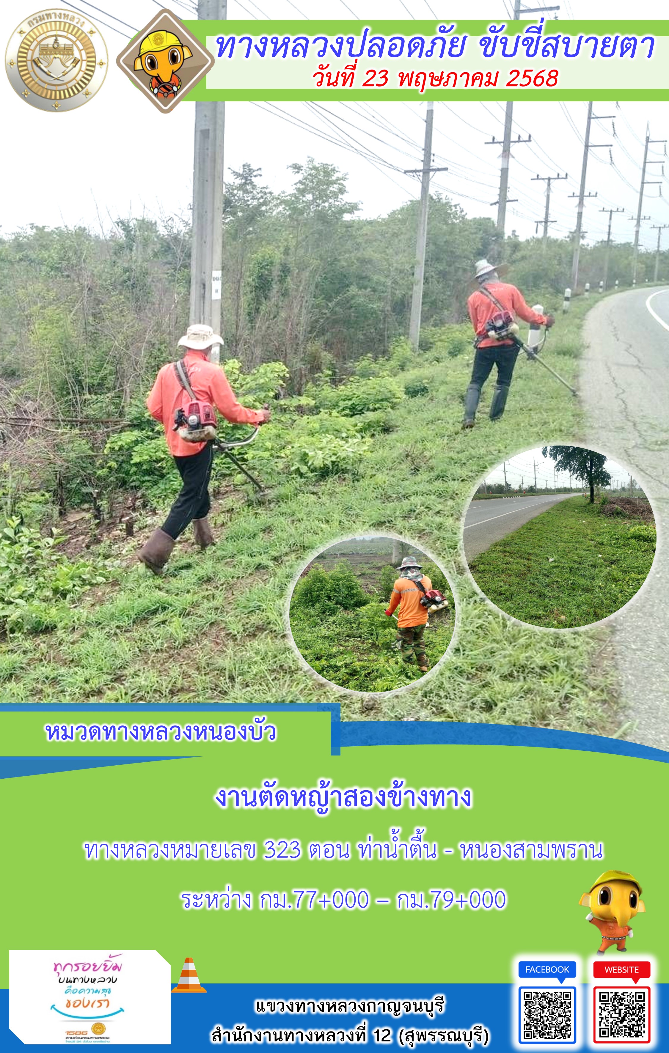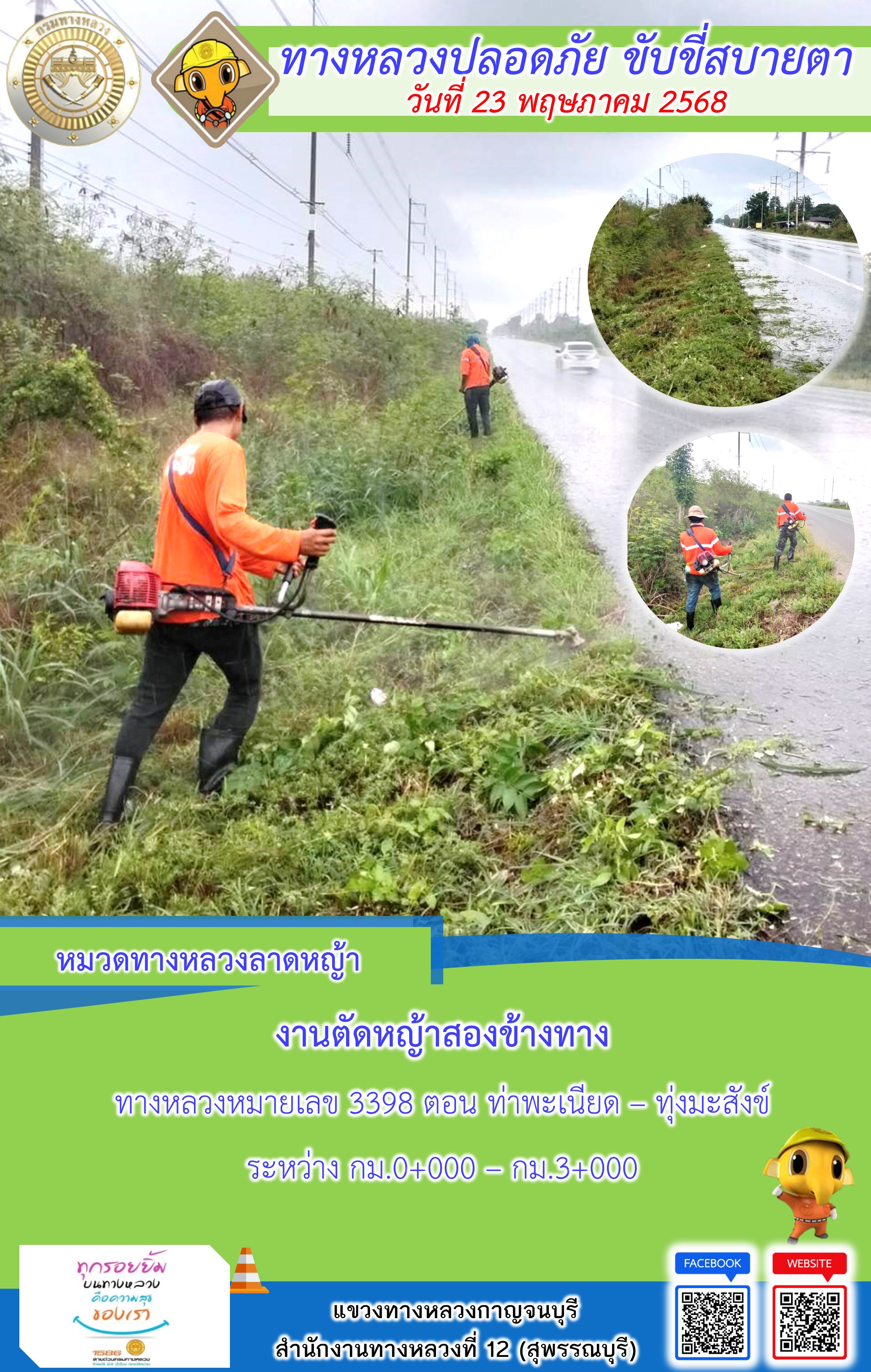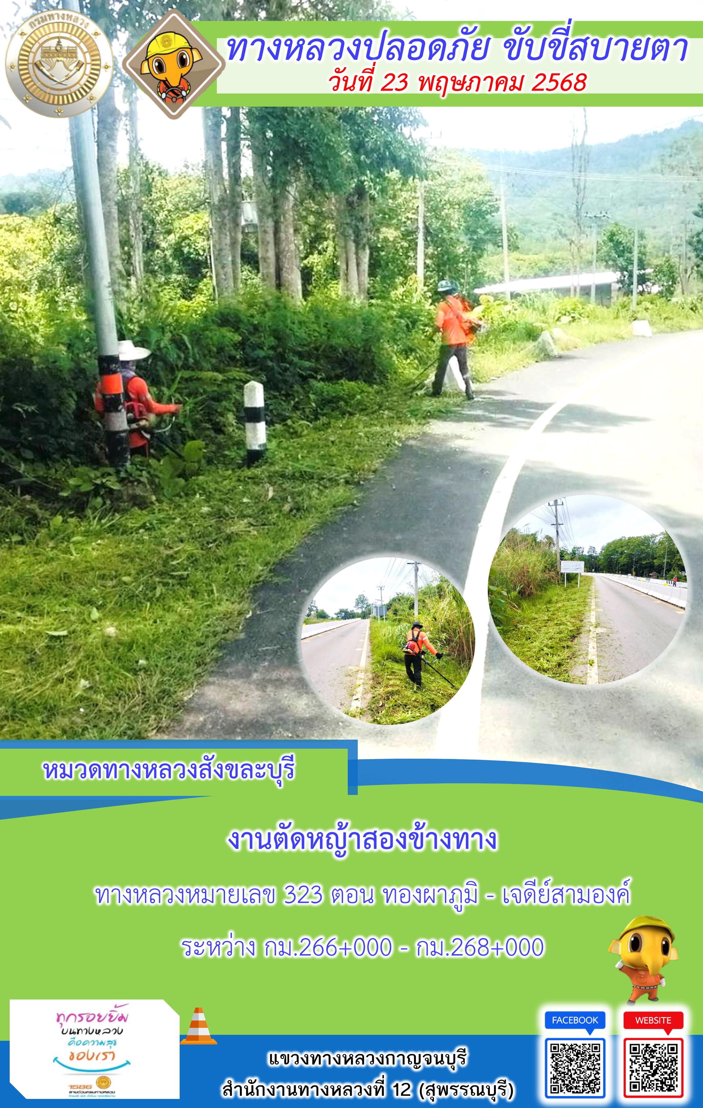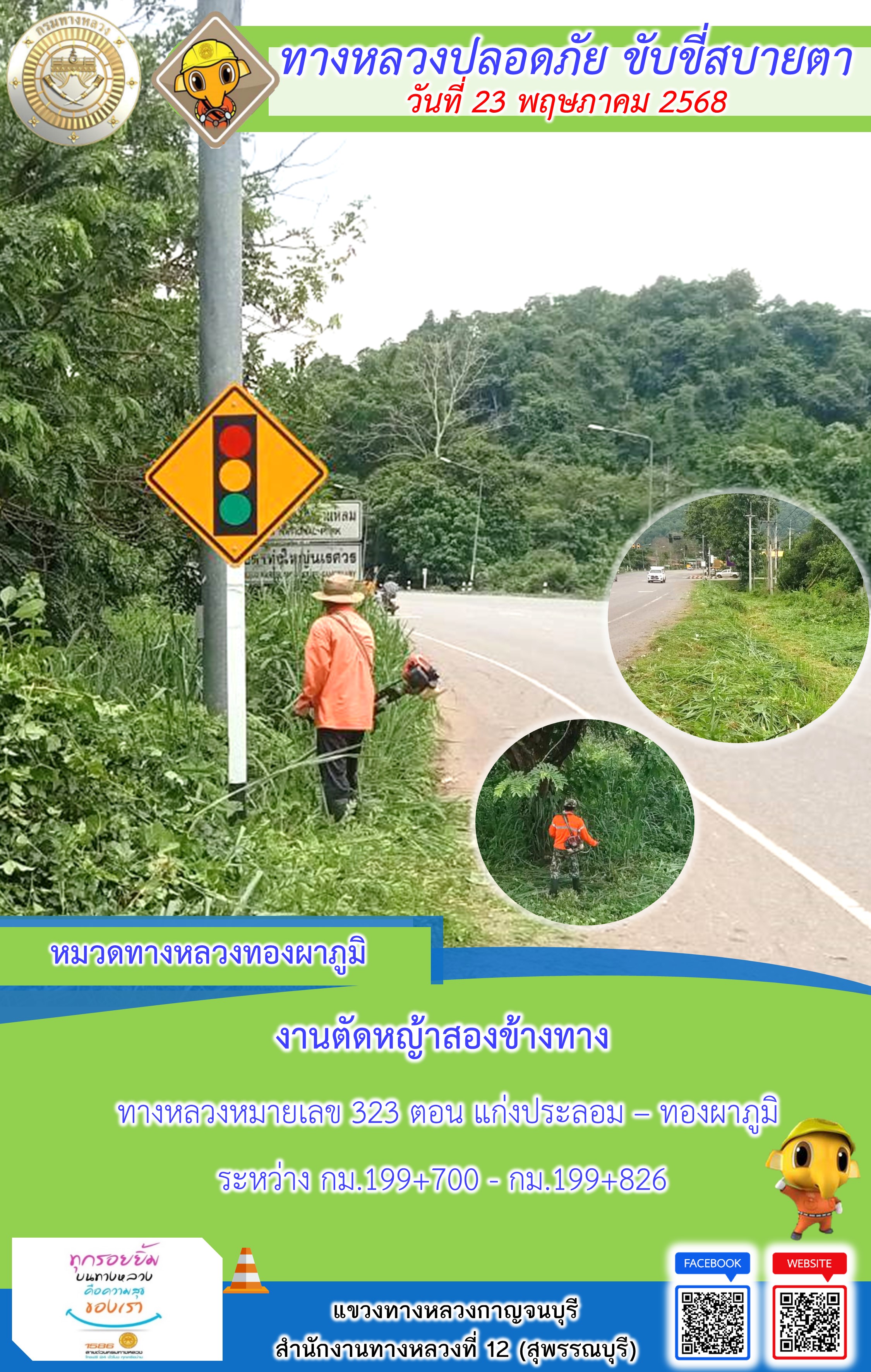 ข้อมูลภาพกิจกรรม : แขวงทางหลวงกาญจนบุรี โดยหมวดทางหลวงในสังกัด และงานอำนวยความปลอดภัยปฏิบัติงาน ประจำวันที่ 23 พ.ค. 68