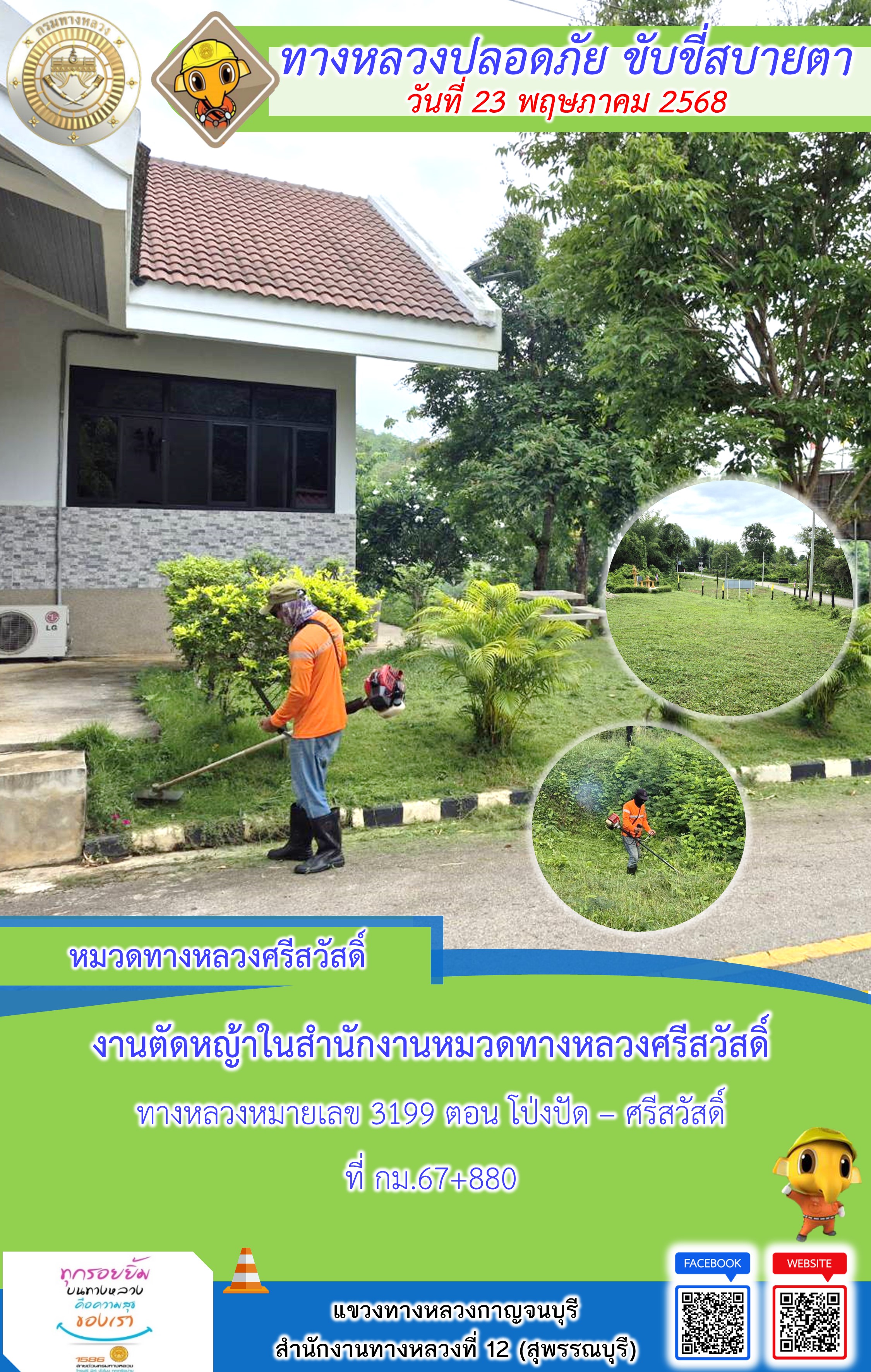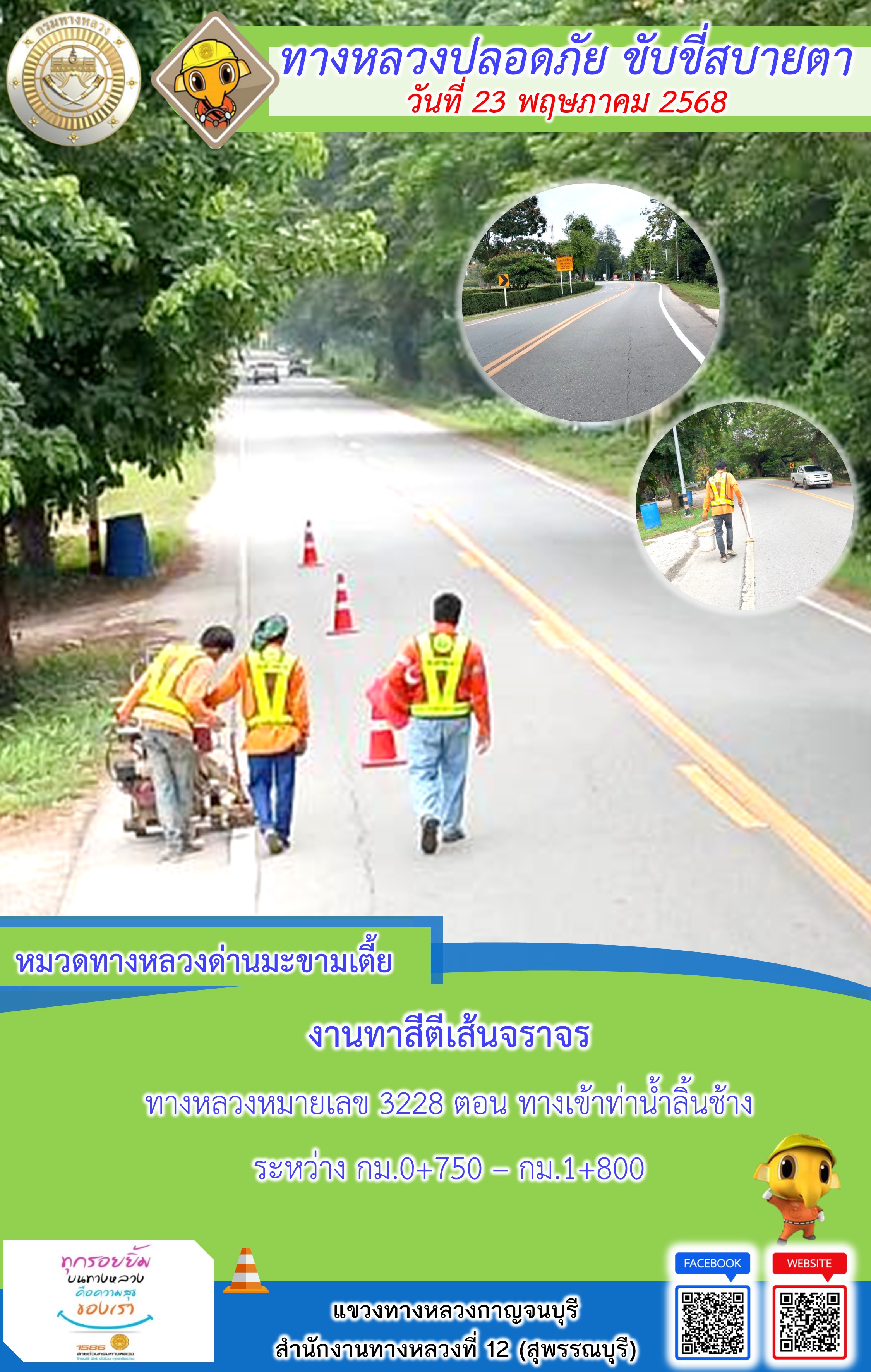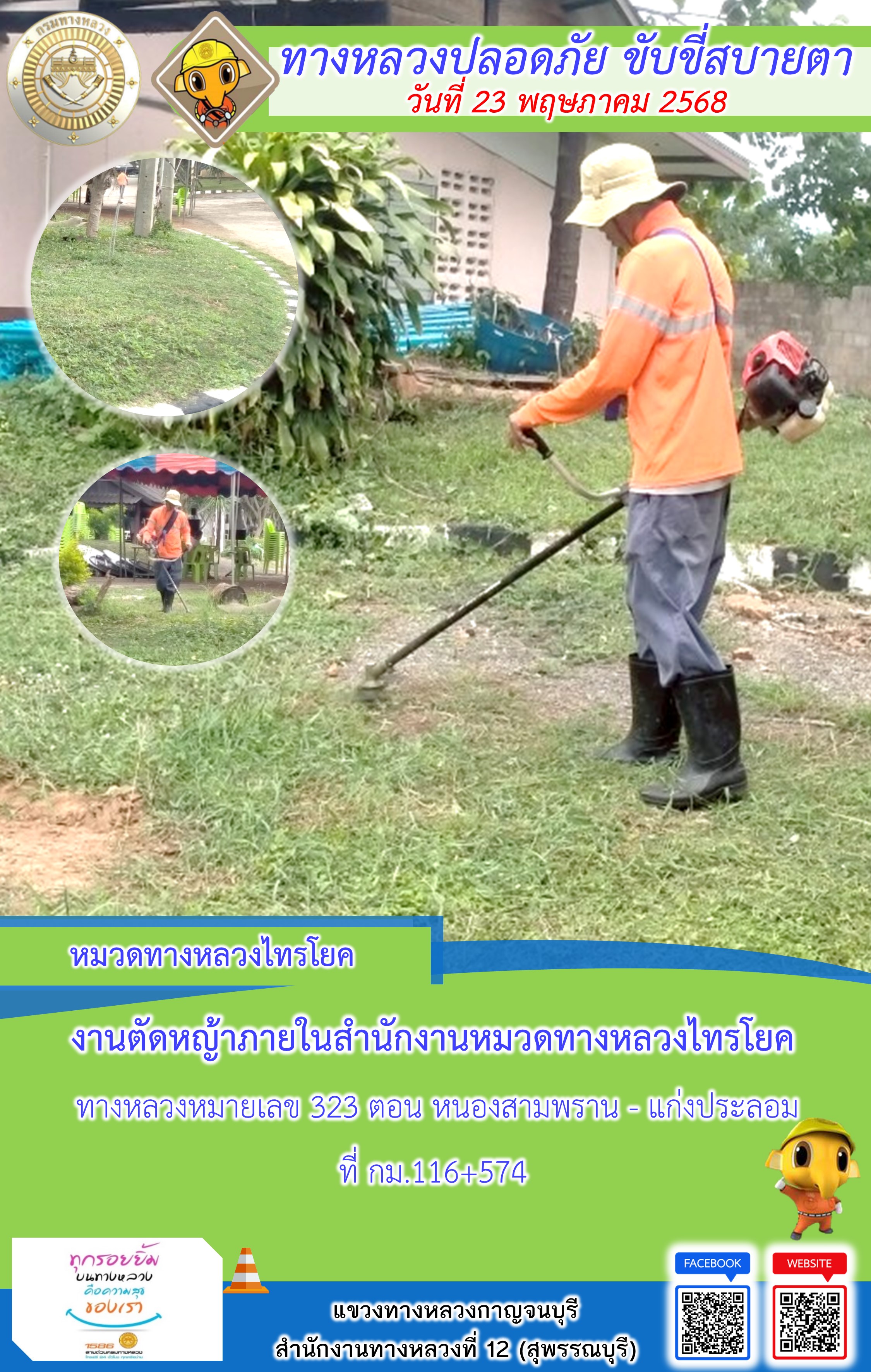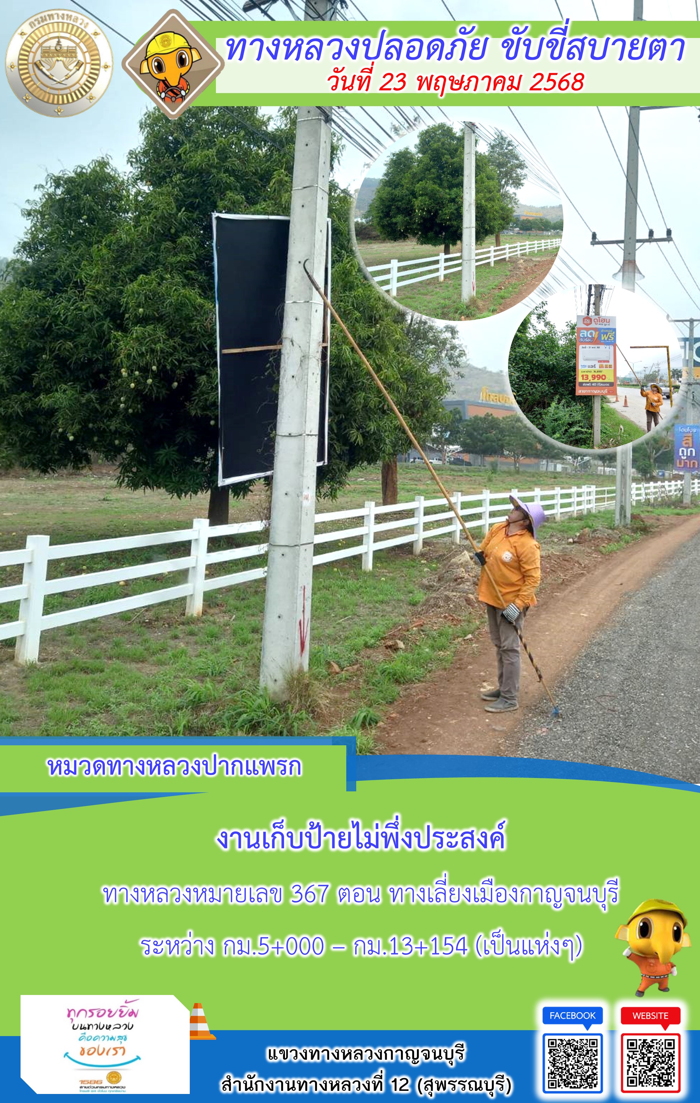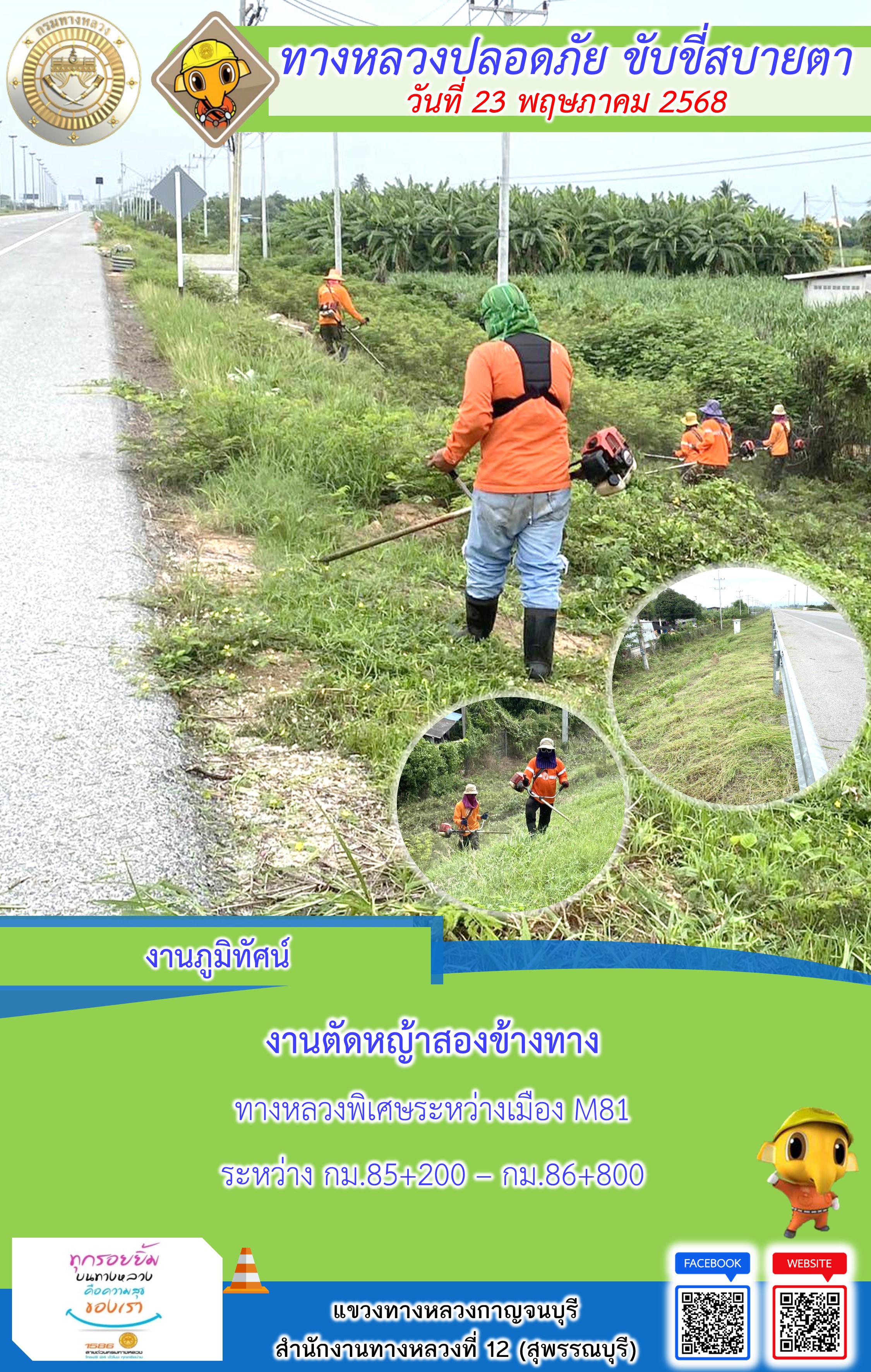 ข้อมูลภาพกิจกรรม : แขวงทางหลวงกาญจนบุรี โดยหมวดทางหลวงในสังกัด และงานอำนวยความปลอดภัยปฏิบัติงาน ประจำวันที่ 23 พ.ค. 68